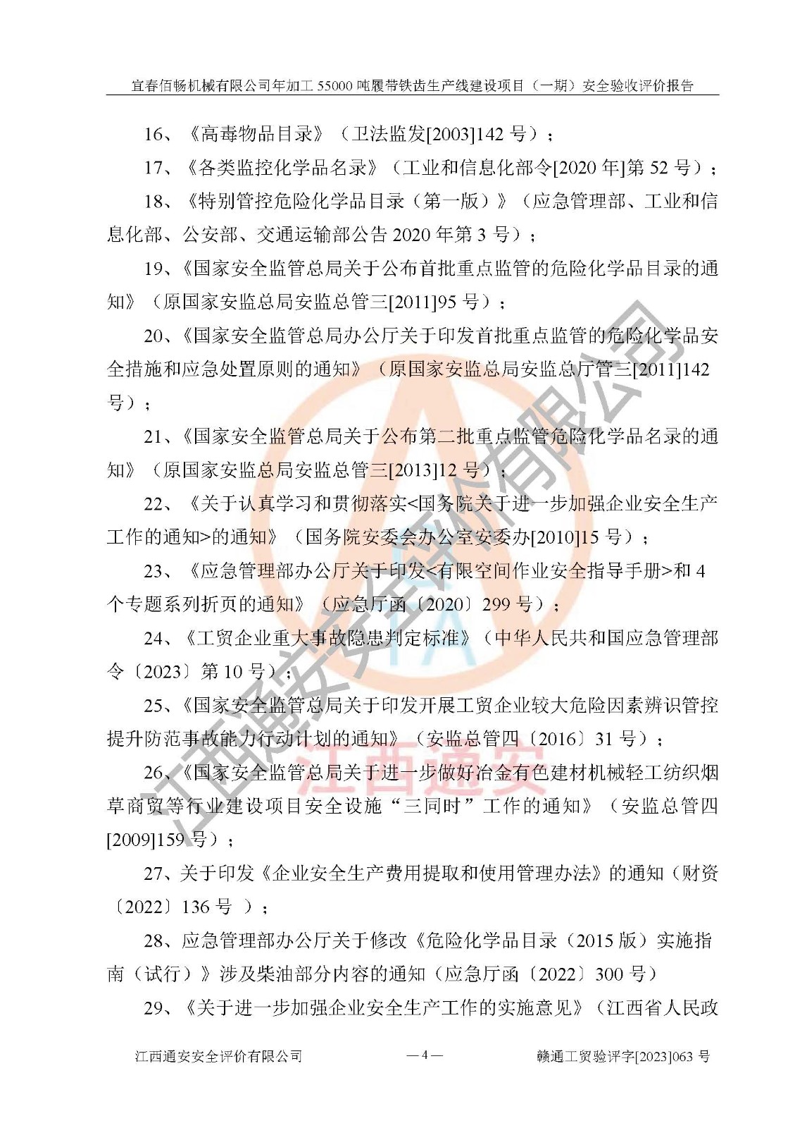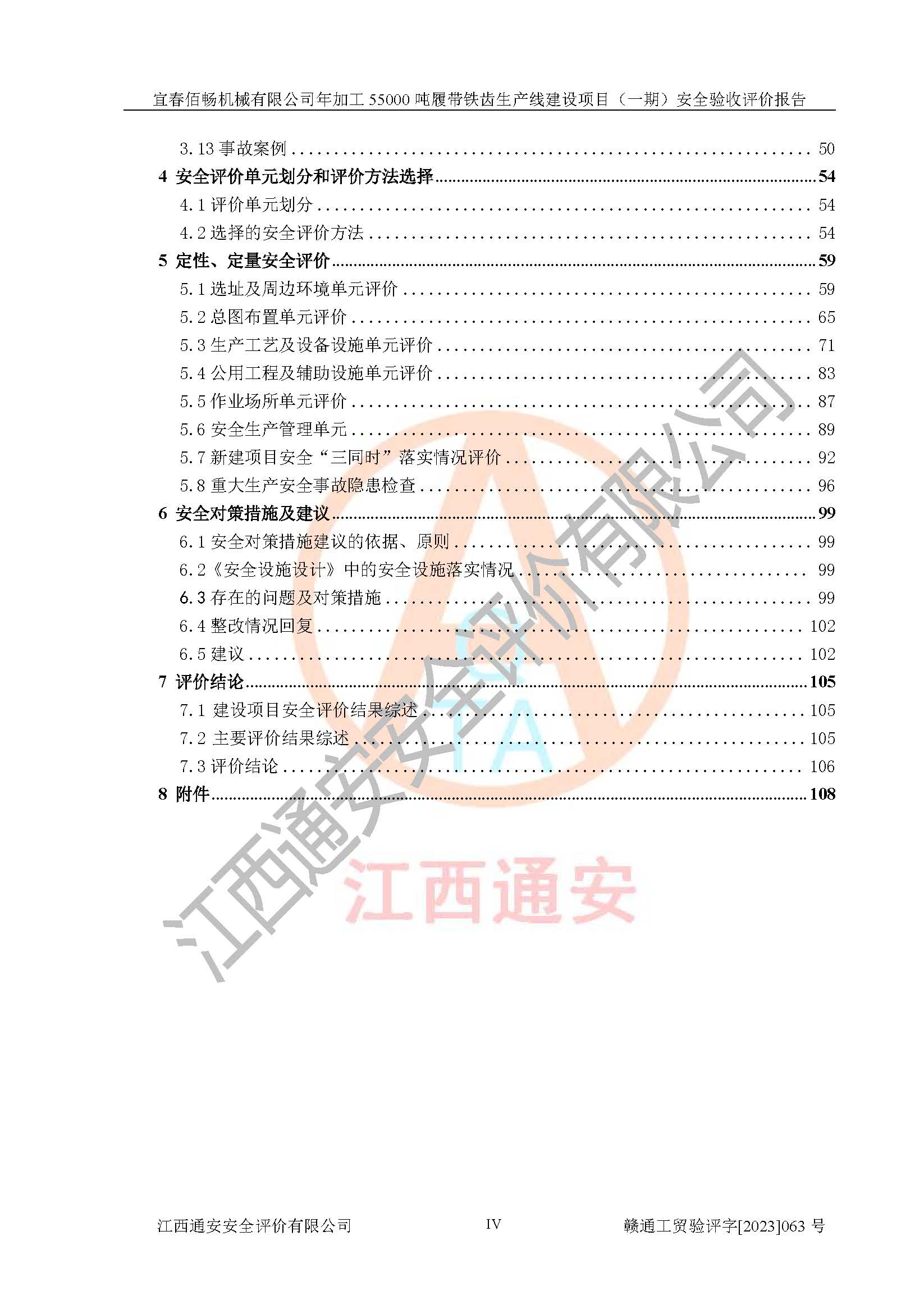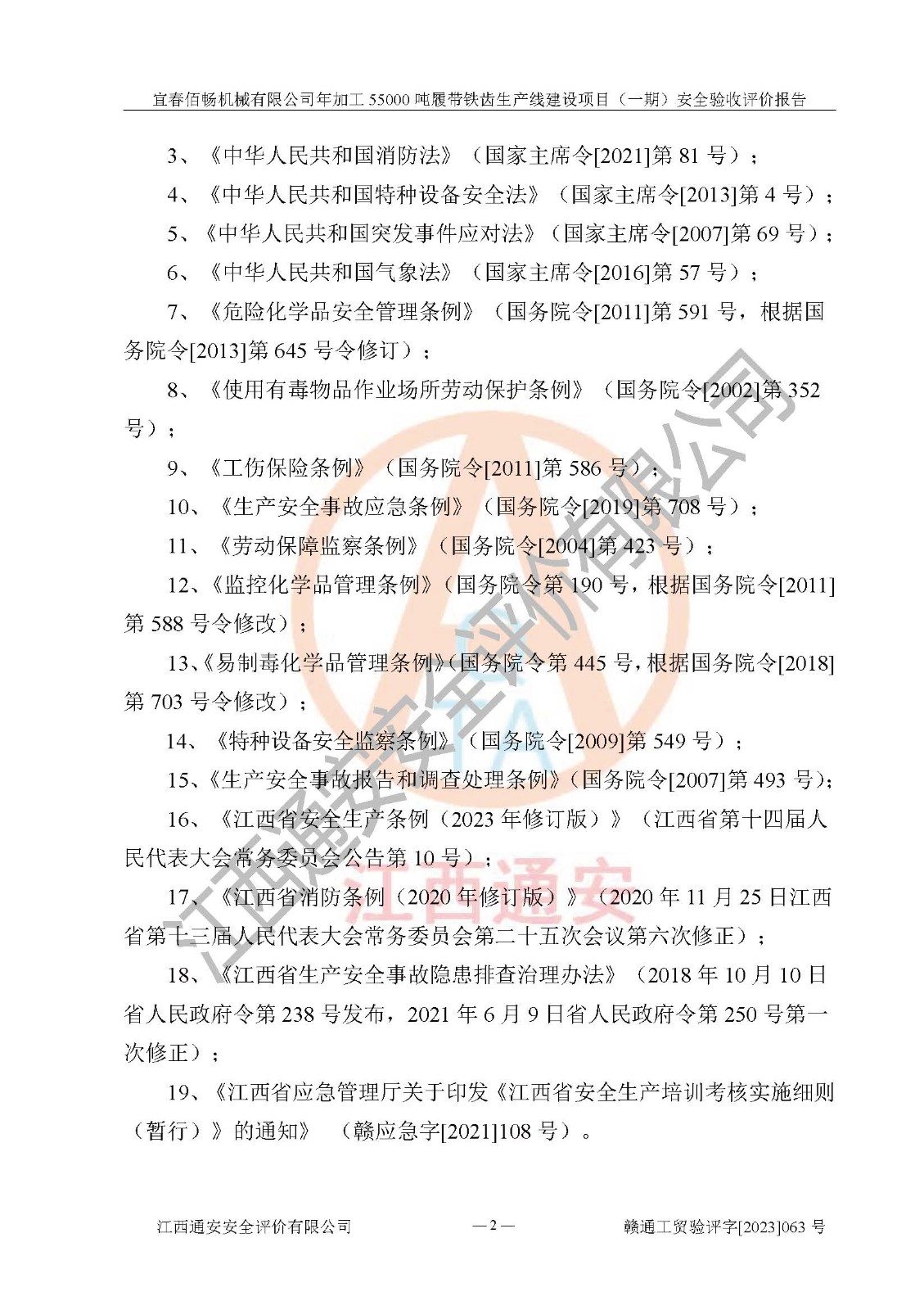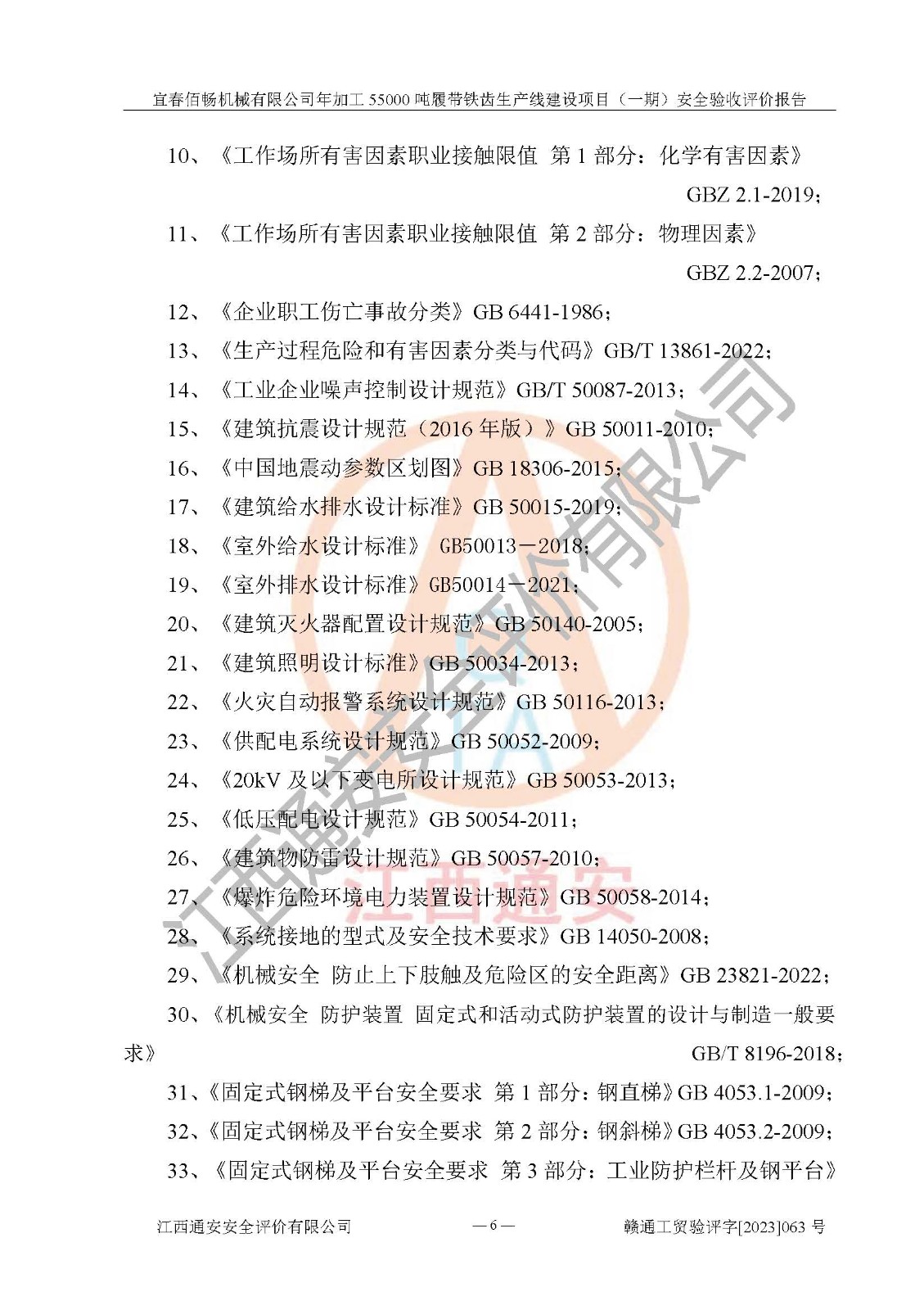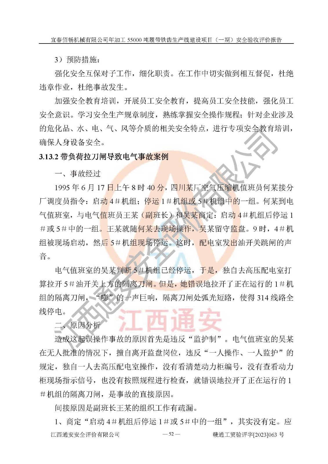 其它 | 根據(jù)《中華人民共和國(guó)安全生產(chǎn)法》、《新建項(xiàng)目安全設(shè)施“三同時(shí)”監(jiān)督管理辦法》(原**安全生產(chǎn)監(jiān)督管理總局令第77號(hào)修訂)等法律法規(guī)的要求,對(duì)宜春佰暢機(jī)械有限公司年加工55000噸履帶鐵齒生產(chǎn)線建設(shè)項(xiàng)目(一期)安全驗(yàn)收的基本條件進(jìn)行分析,結(jié)果如下: 1)本項(xiàng)目在初步設(shè)計(jì)及建設(shè)過程中基本能貫徹執(zhí)行**、地方及有關(guān)部門的安全生產(chǎn)法律法規(guī)、標(biāo)準(zhǔn)要求,取得了**相關(guān)部門的許可、備案。項(xiàng)目的設(shè)計(jì)、施工、監(jiān)理等單位均有相應(yīng)資質(zhì)。 2)本項(xiàng)目址選符合要求;總平面布置合理,主要建筑的防火間距符合符合《建筑設(shè)計(jì)防火規(guī)范(2018版)》(GB50016-2014)、《工業(yè)企業(yè)總平面設(shè)計(jì)規(guī)范》(GB50187-2012)有關(guān)規(guī)范、標(biāo)準(zhǔn)的要求。 3)本項(xiàng)目生產(chǎn)工藝成熟、試運(yùn)行正常,試運(yùn)行中過程中工藝和裝置、設(shè)備(設(shè)施)安全、可靠,未發(fā)生安全事故。 4)本項(xiàng)目的特種設(shè)備由有資質(zhì)單位設(shè)計(jì)、制造、安裝,特種設(shè)備經(jīng)宜春市特種設(shè)備檢驗(yàn)中心檢驗(yàn)合格,符合《中華人民共和國(guó)特種設(shè)備安全法》、《特種設(shè)備安全監(jiān)察條例》(中華人民共和國(guó)***令第549號(hào))的規(guī)定。特種設(shè)備作業(yè)人員、特種作業(yè)人員均持證上崗。 5)公司主要負(fù)責(zé)人及安全管理人員取得了上高縣毅興人力資源有限公司頒發(fā)的培訓(xùn)證書,特種作業(yè)人員操作證在**期內(nèi),其他從業(yè)人員經(jīng)安全培訓(xùn)符合,取得上崗證。符合要求。 6)公司建立有安全管理制度,制定有各類人員的安全生產(chǎn)責(zé)任制、各項(xiàng)安全管理制度和操作規(guī)程。按照**有關(guān)規(guī)定編制了事故應(yīng)急救援預(yù)案并進(jìn)行了備案,并定期進(jìn)行演練等,符合要求。 7)本項(xiàng)目作業(yè)條件危險(xiǎn)性分析結(jié)果:在選定的單元的危險(xiǎn)程度均為“一般危險(xiǎn),需要注意”或“稍有危險(xiǎn),可以接受”,作業(yè)條件相對(duì)安全。 評(píng)價(jià)結(jié)論: 宜春佰暢機(jī)械有限公司年加工55000噸履帶鐵齒生產(chǎn)線建設(shè)項(xiàng)目(一期)的安全設(shè)施及安全管理符合**及有關(guān)部門關(guān)于安全生產(chǎn)法律、法規(guī)、標(biāo)準(zhǔn)的要求,該項(xiàng)目試生產(chǎn)以來,工藝設(shè)備、安全設(shè)施及企業(yè)安全管理機(jī)制等運(yùn)行正常,安全設(shè)施、措施達(dá)到設(shè)計(jì)要求和預(yù)期結(jié)果,可以滿足建設(shè)項(xiàng)目安全生產(chǎn)的要求,安全生產(chǎn)管理**,具備竣工驗(yàn)收條件。 | ||||