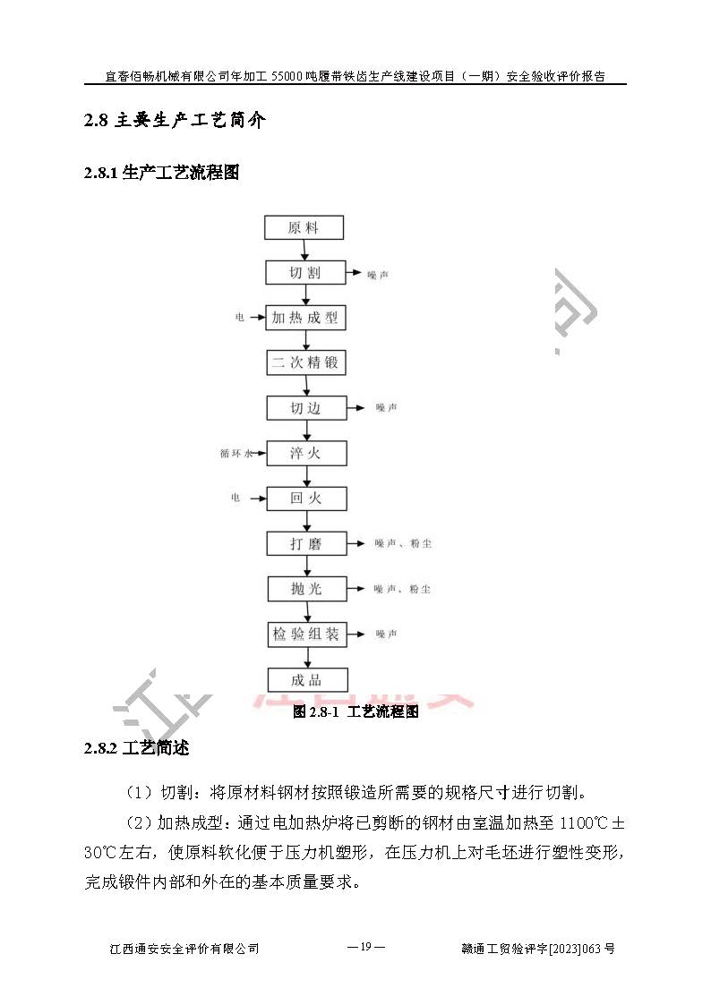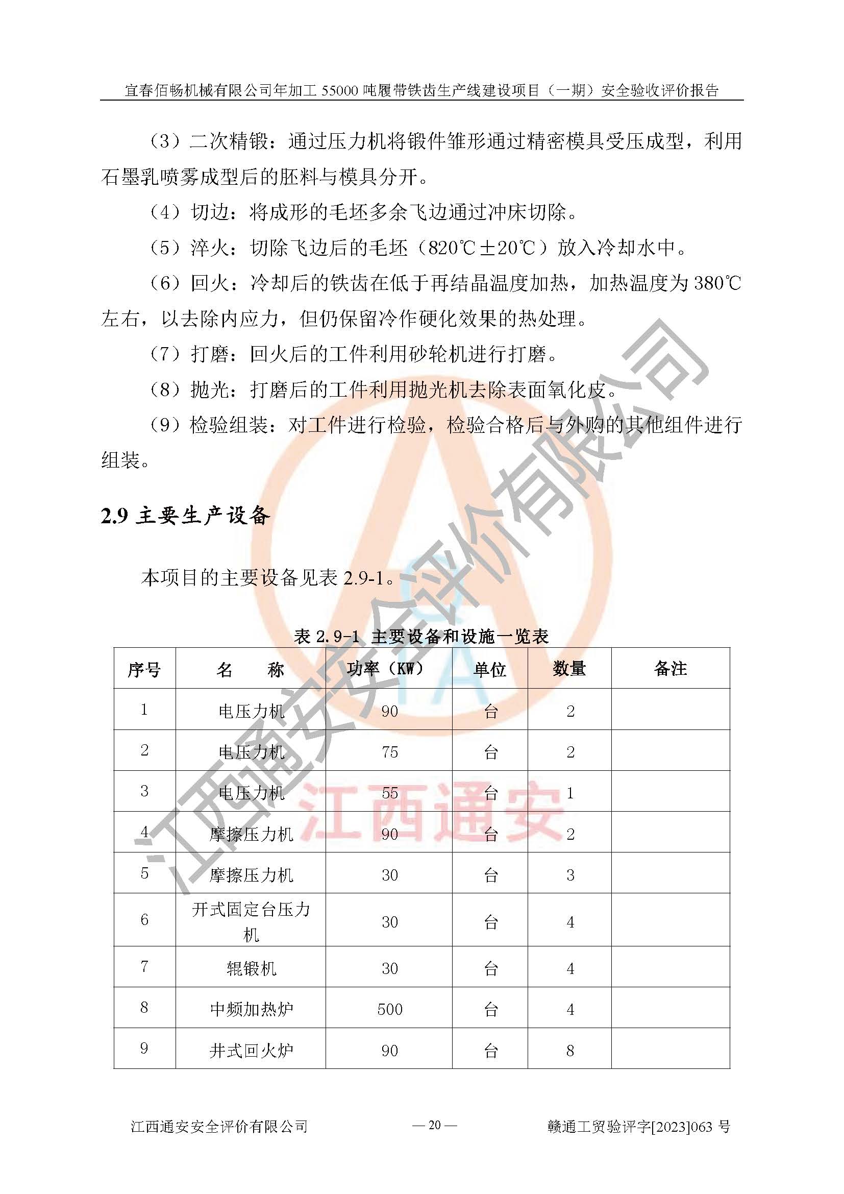 項(xiàng)目簡(jiǎn)介 | 宜春佰暢機(jī)械有限公司成立于2019年04月11日,統(tǒng)一社會(huì)信用代碼:91360923MA38H1TT7J,注冊(cè)地址江西省宜春市上高縣工業(yè)園五里嶺功能區(qū)眾安西側(cè)道路27號(hào),注冊(cè)資金壹仟萬元整,經(jīng)營(yíng)范圍:機(jī)械設(shè)備及配件、機(jī)械零部件、鍛件、機(jī)械模具研發(fā)、制造、加工銷售;鈑金、鋼材、金屬材料、日用品銷售(依法須經(jīng)批準(zhǔn)的項(xiàng)目,經(jīng)相關(guān)部門批準(zhǔn)后方可開展經(jīng)營(yíng)活動(dòng))。本項(xiàng)目為年加工55000噸履帶鐵齒生產(chǎn)線建設(shè)項(xiàng)目,總投資23000萬元。項(xiàng)目分兩期建設(shè),一期產(chǎn)能為30000噸,二期產(chǎn)能為25000噸。 本項(xiàng)目于2019年05月17日在上高縣發(fā)展和改革委員會(huì)備案,取得 《江西省企業(yè)投資項(xiàng)目備案通知書》(上高縣發(fā)展和改革委員會(huì),項(xiàng)目統(tǒng)一代碼為:2019-360923-41-03-009019),2019年6月組織技術(shù)人員編制了《宜春佰暢機(jī)械有限公司年加工55000噸履帶鐵齒生產(chǎn)線建設(shè)項(xiàng)目選址安全條件論證報(bào)告》,2020年1月委托中北工程設(shè)計(jì)咨詢有限公司編制完成了《宜春佰暢機(jī)械有限公司年加工55000噸履帶鐵齒生產(chǎn)線建設(shè)項(xiàng)目安全設(shè)施設(shè)計(jì)》并于2020年01月07日通過了專家審查。本項(xiàng)目以45#鋼材為原料,通過切割、加熱成型、二次精鍛、切邊、淬火、回火、打磨、拋光、檢驗(yàn)組裝等工藝后*終加工成履帶鐵齒成品。其中涉及的危險(xiǎn)化學(xué)品為檢維修用氧氣、乙炔以及叉車燃料柴油。經(jīng)辨識(shí),該項(xiàng)目不構(gòu)成危險(xiǎn)品重大危險(xiǎn)源。根據(jù)生產(chǎn)工藝特點(diǎn)及物料的理化特性可知,該項(xiàng)目生產(chǎn)過程中存在火災(zāi)、爆炸、機(jī)械傷害、起重傷害、觸電、**傷害、高處墜落、物體打擊、坍塌、淹溺、中毒窒息、灼燙等危險(xiǎn)有害因素。 | ||||