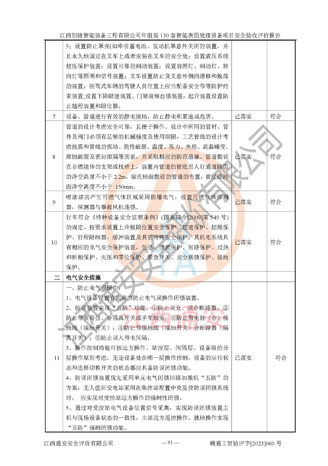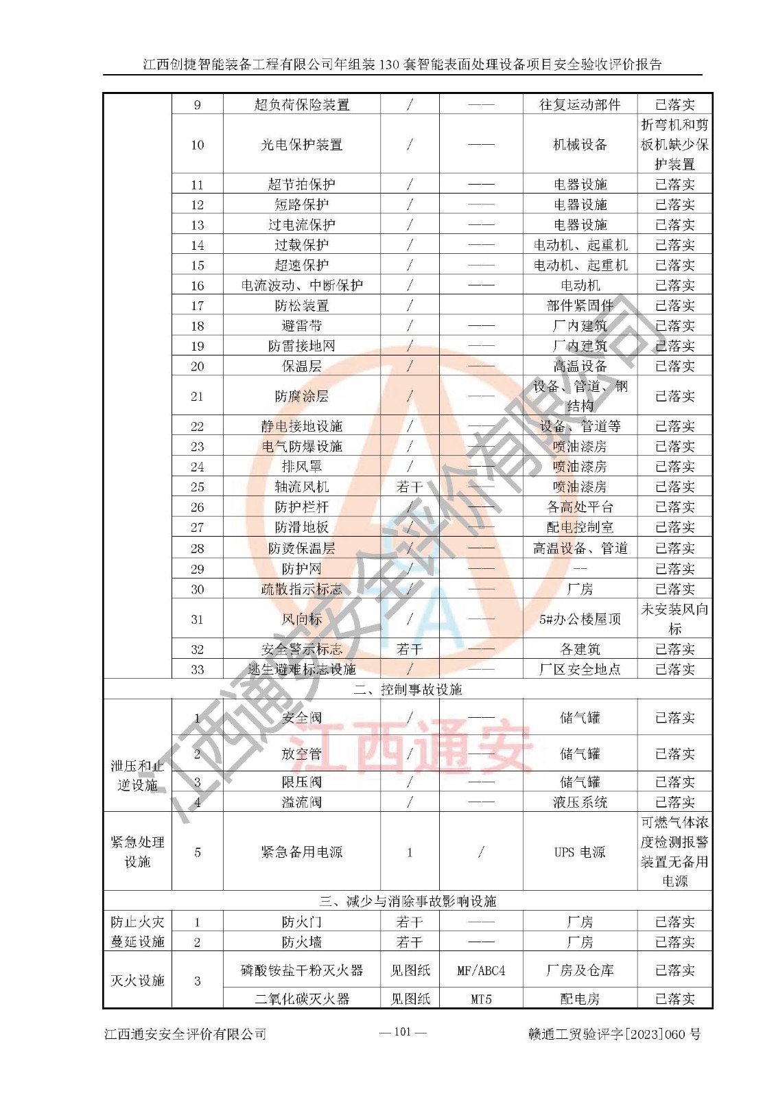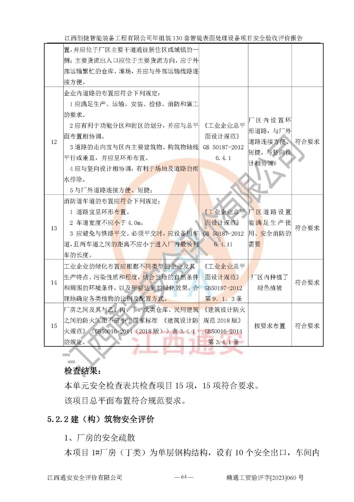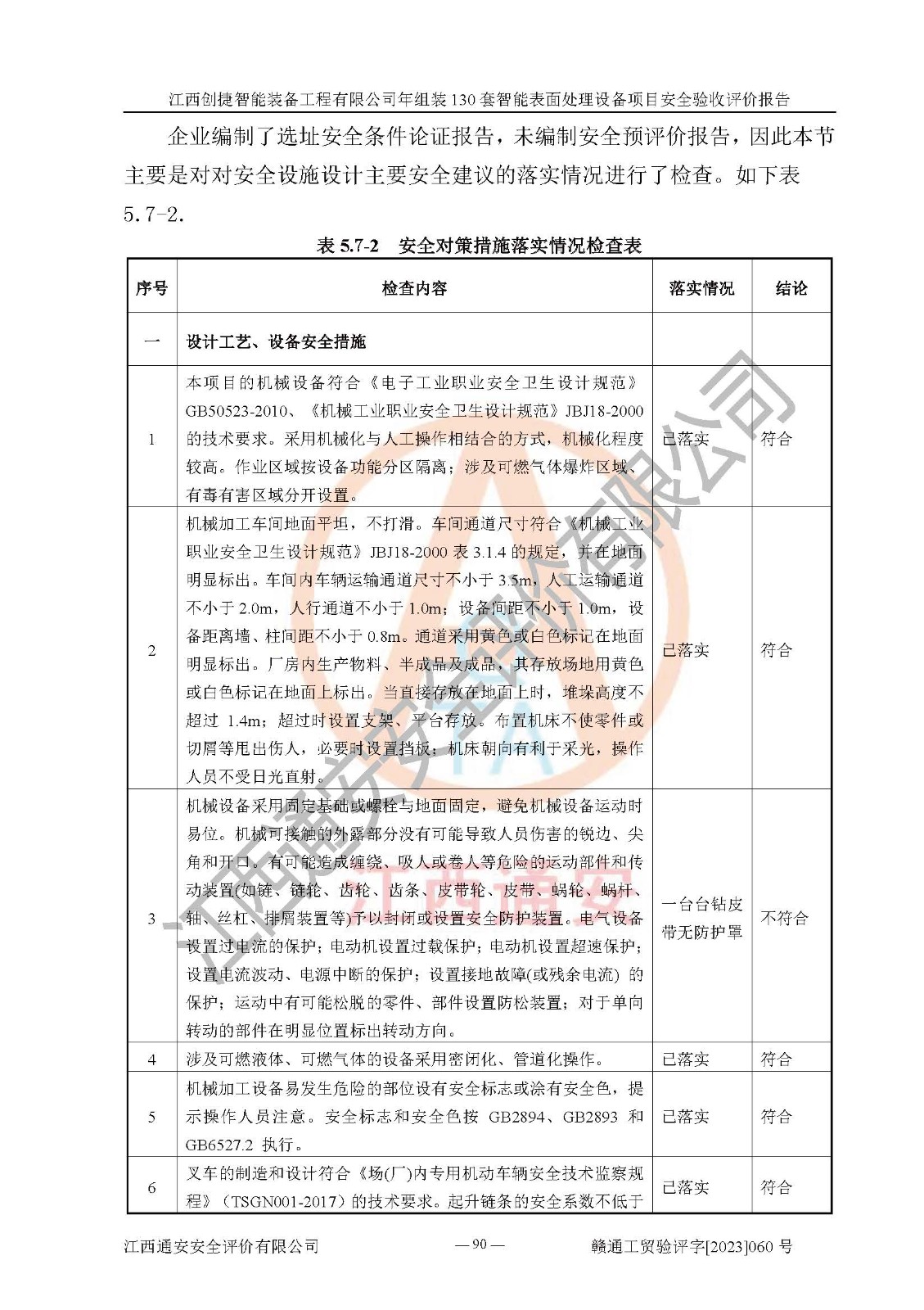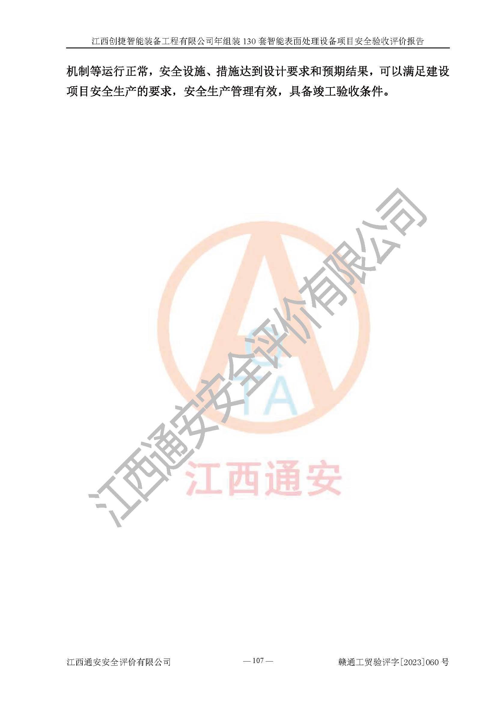 其它 | 根據(jù)《中華人民共和國安全生產(chǎn)法》、《新建項(xiàng)目安全設(shè)施“三同時(shí)”監(jiān)督管理辦法》(原**安全生產(chǎn)監(jiān)督管理總局令第77號修訂)等法律法規(guī)的要求,對江西創(chuàng)捷智能裝備工程有限公司年組裝130套智能表面處理設(shè)備項(xiàng)目安全驗(yàn)收的基本條件進(jìn)行分析,結(jié)果如下: 1)本項(xiàng)目在初步設(shè)計(jì)及建設(shè)過程中基本能貫徹執(zhí)行**、地方及有關(guān)部門的安全生產(chǎn)法律法規(guī)、標(biāo)準(zhǔn)要求,取得了**相關(guān)部門的許可、備案。項(xiàng)目的設(shè)計(jì)、施工、監(jiān)理等單位均有相應(yīng)資質(zhì)。 2)本項(xiàng)目址選符合要求;總平面布置合理,主要建筑的防火間距符合符合《建筑設(shè)計(jì)防火規(guī)范》(GB50016-2014,2018版)、《工業(yè)企業(yè)總平面設(shè)計(jì)規(guī)范》(GB50187-2012)有關(guān)規(guī)范、標(biāo)準(zhǔn)的要求。 3)本項(xiàng)目消防設(shè)施驗(yàn)收文件見建設(shè)工程消防驗(yàn)收備案憑證(2023031400322)。 4)本項(xiàng)目生產(chǎn)工藝成熟、試運(yùn)行正常,試運(yùn)行中過程中工藝和裝置、設(shè)備(設(shè)施)安全、可靠,未發(fā)生安全事故。 5)本項(xiàng)目的特種設(shè)備由有資質(zhì)單位設(shè)計(jì)、制造、安裝,特種設(shè)備經(jīng)宜春市特種設(shè)備檢驗(yàn)中心檢驗(yàn)合格,符合《中華人民共和國特種設(shè)備安全法》、《特種設(shè)備安全監(jiān)察條例》(中華人民共和國***令第549號)的規(guī)定。特種設(shè)備作業(yè)人員、特種作業(yè)人員均持證上崗。 6)公司主要負(fù)責(zé)人及安全管理人員取得了江西省億源企業(yè)咨詢服務(wù)有限公司頒發(fā)的培訓(xùn)證書,特種作業(yè)人員操作證在**期內(nèi),其他從業(yè)人員經(jīng)安全培訓(xùn)符合,取得上崗證。符合要求。 7)公司建立有安全管理制度,制定有各類人員的安全生產(chǎn)責(zé)任制、各項(xiàng)安全管理制度和操作規(guī)程。按照**有關(guān)規(guī)定編制了事故應(yīng)急救援預(yù)案并進(jìn)行了備案,并定期進(jìn)行演練等,符合要求。 8)本項(xiàng)目作業(yè)條件危險(xiǎn)性分析結(jié)果:在選定的8個(gè)單元的危險(xiǎn)程度均為“稍有危險(xiǎn),可以接受”或“一般危險(xiǎn),需要注意”,作業(yè)條件相對安全。 評價(jià)結(jié)論: 江西創(chuàng)捷智能裝備工程有限公司年組裝130套智能表面處理設(shè)備項(xiàng)目的安全設(shè)施及安全管理符合**及有關(guān)部門關(guān)于安全生產(chǎn)法律、法規(guī)、標(biāo)準(zhǔn)的要求,該項(xiàng)目試生產(chǎn)以來,工藝設(shè)備、安全設(shè)施及企業(yè)安全管理機(jī)制等運(yùn)行正常,安全設(shè)施、措施達(dá)到設(shè)計(jì)要求和預(yù)期結(jié)果,可以滿足建設(shè)項(xiàng)目安全生產(chǎn)的要求,安全生產(chǎn)管理**,具備竣工驗(yàn)收條件。 | ||||