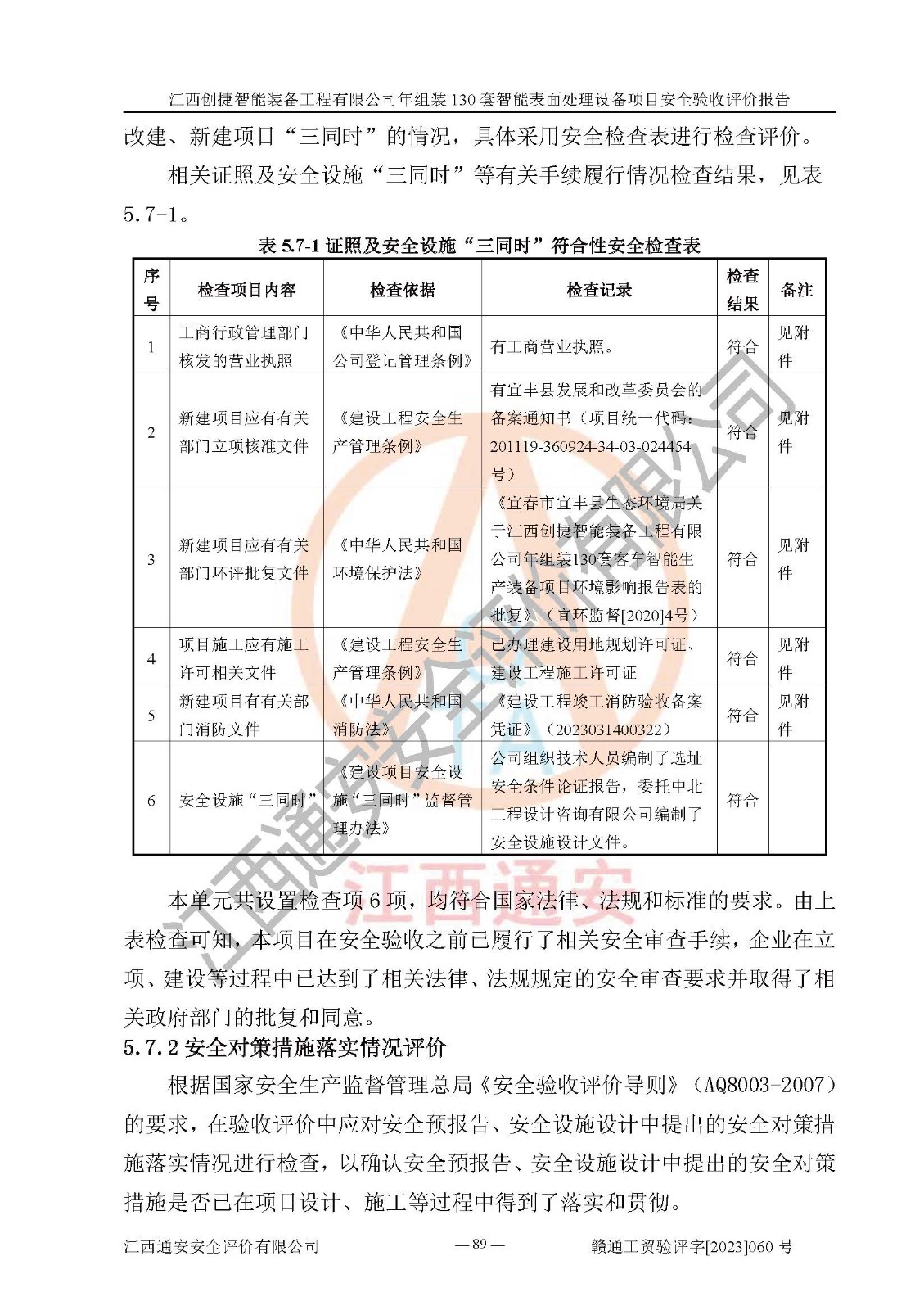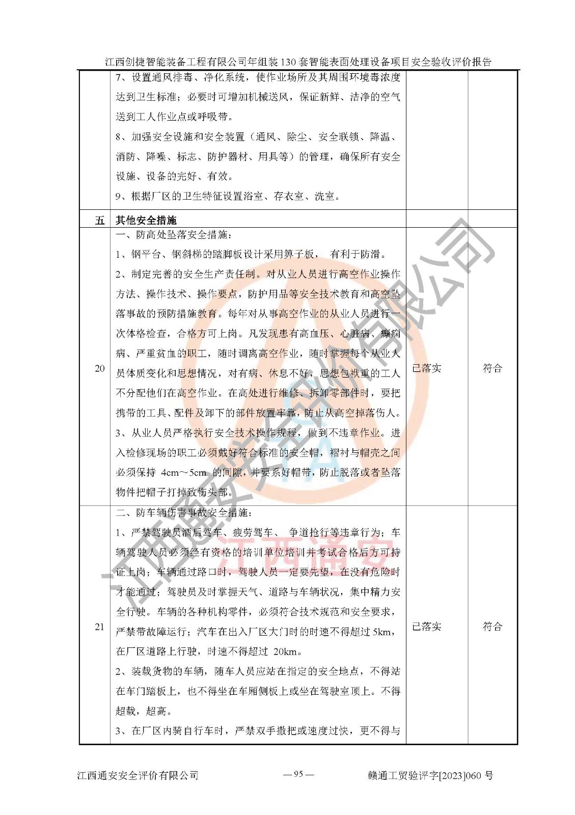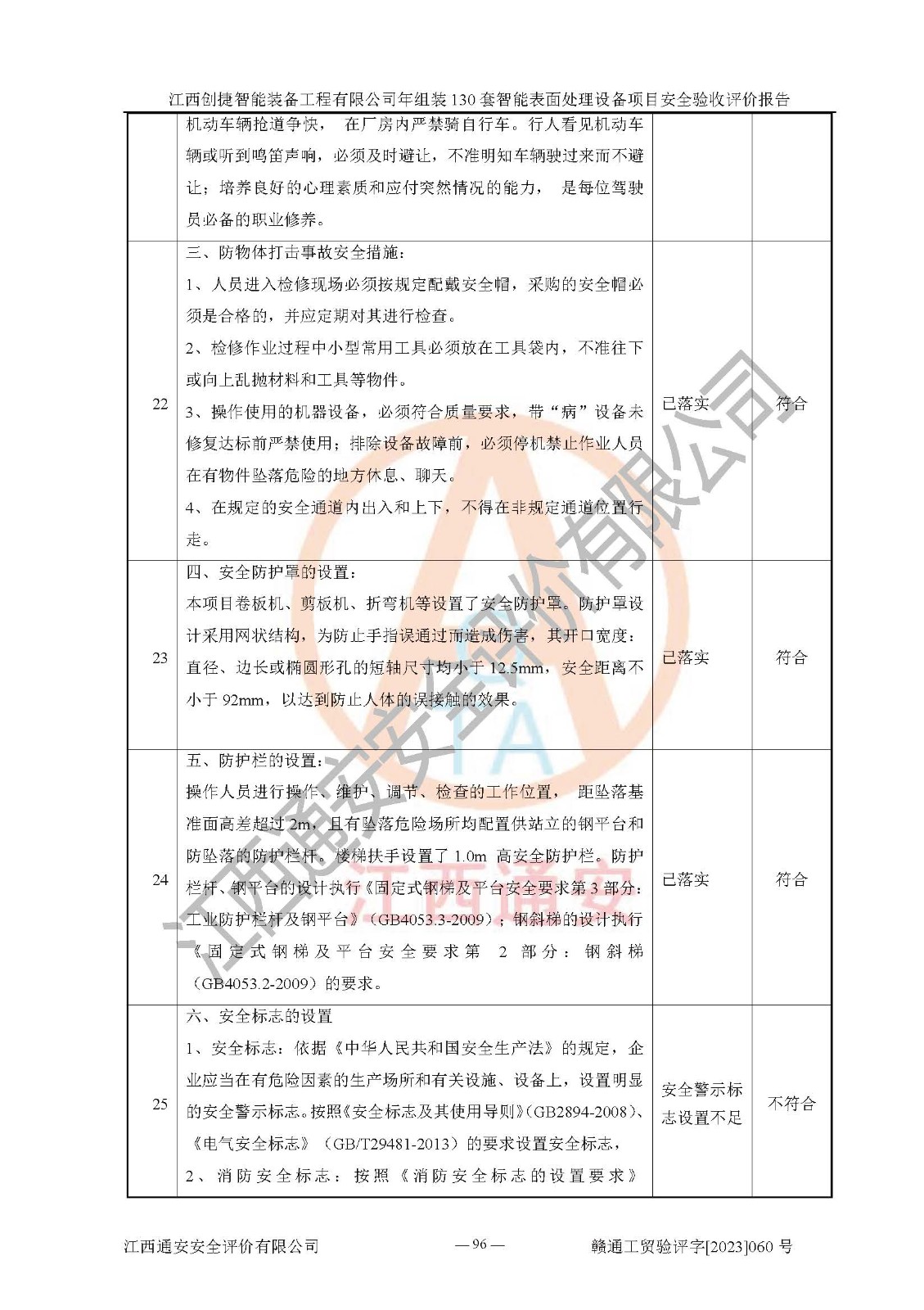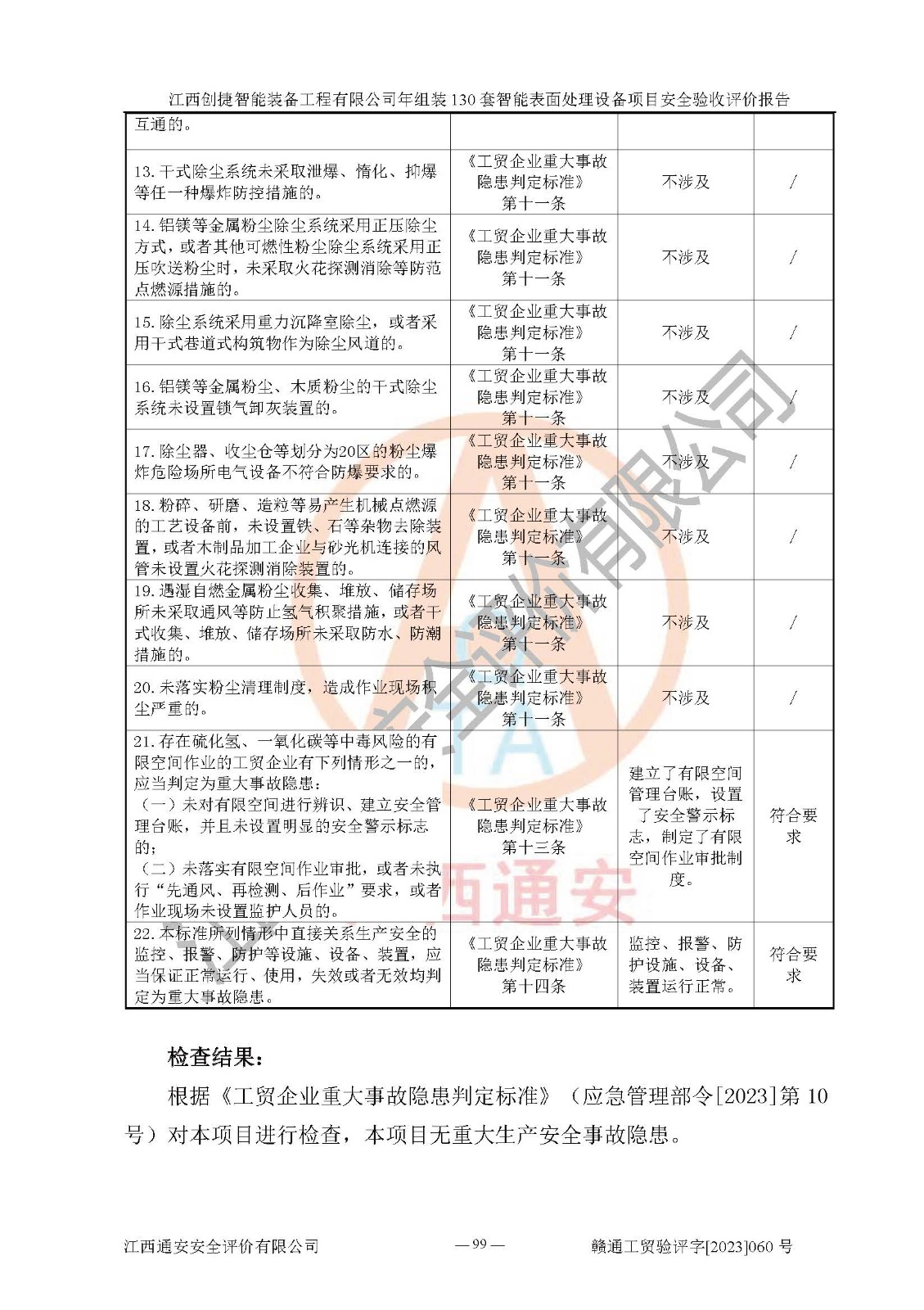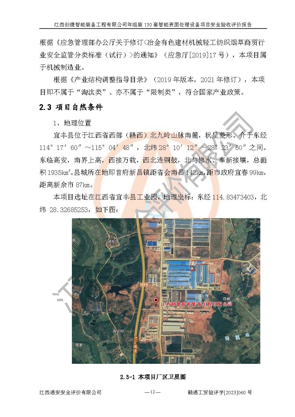 其它 | 根據(jù)《中華人民共和國安全生產(chǎn)法》、《新建項(xiàng)目安全設(shè)施“三同時(shí)”監(jiān)督管理辦法》(原**安全生產(chǎn)監(jiān)督管理總局令第77號修訂)等法律法規(guī)的要求,對江西創(chuàng)捷智能裝備工程有限公司年組裝130套智能表面處理設(shè)備項(xiàng)目安全驗(yàn)收的基本條件進(jìn)行分析,結(jié)果如下: 1)本項(xiàng)目在初步設(shè)計(jì)及建設(shè)過程中基本能貫徹執(zhí)行**、地方及有關(guān)部門的安全生產(chǎn)法律法規(guī)、標(biāo)準(zhǔn)要求,取得了**相關(guān)部門的許可、備案。項(xiàng)目的設(shè)計(jì)、施工、監(jiān)理等單位均有相應(yīng)資質(zhì)。 2)本項(xiàng)目址選符合要求;總平面布置合理,主要建筑的防火間距符合符合《建筑設(shè)計(jì)防火規(guī)范》(GB50016-2014,2018版)、《工業(yè)企業(yè)總平面設(shè)計(jì)規(guī)范》(GB50187-2012)有關(guān)規(guī)范、標(biāo)準(zhǔn)的要求。 3)本項(xiàng)目消防設(shè)施驗(yàn)收文件見建設(shè)工程消防驗(yàn)收備案憑證(2023031400322)。 4)本項(xiàng)目生產(chǎn)工藝成熟、試運(yùn)行正常,試運(yùn)行中過程中工藝和裝置、設(shè)備(設(shè)施)安全、可靠,未發(fā)生安全事故。 5)本項(xiàng)目的特種設(shè)備由有資質(zhì)單位設(shè)計(jì)、制造、安裝,特種設(shè)備經(jīng)宜春市特種設(shè)備檢驗(yàn)中心檢驗(yàn)合格,符合《中華人民共和國特種設(shè)備安全法》、《特種設(shè)備安全監(jiān)察條例》(中華人民共和國***令第549號)的規(guī)定。特種設(shè)備作業(yè)人員、特種作業(yè)人員均持證上崗。 6)公司主要負(fù)責(zé)人及安全管理人員取得了江西省億源企業(yè)咨詢服務(wù)有限公司頒發(fā)的培訓(xùn)證書,特種作業(yè)人員操作證在**期內(nèi),其他從業(yè)人員經(jīng)安全培訓(xùn)符合,取得上崗證。符合要求。 7)公司建立有安全管理制度,制定有各類人員的安全生產(chǎn)責(zé)任制、各項(xiàng)安全管理制度和操作規(guī)程。按照**有關(guān)規(guī)定編制了事故應(yīng)急救援預(yù)案并進(jìn)行了備案,并定期進(jìn)行演練等,符合要求。 8)本項(xiàng)目作業(yè)條件危險(xiǎn)性分析結(jié)果:在選定的8個(gè)單元的危險(xiǎn)程度均為“稍有危險(xiǎn),可以接受”或“一般危險(xiǎn),需要注意”,作業(yè)條件相對安全。 評價(jià)結(jié)論: 江西創(chuàng)捷智能裝備工程有限公司年組裝130套智能表面處理設(shè)備項(xiàng)目的安全設(shè)施及安全管理符合**及有關(guān)部門關(guān)于安全生產(chǎn)法律、法規(guī)、標(biāo)準(zhǔn)的要求,該項(xiàng)目試生產(chǎn)以來,工藝設(shè)備、安全設(shè)施及企業(yè)安全管理機(jī)制等運(yùn)行正常,安全設(shè)施、措施達(dá)到設(shè)計(jì)要求和預(yù)期結(jié)果,可以滿足建設(shè)項(xiàng)目安全生產(chǎn)的要求,安全生產(chǎn)管理**,具備竣工驗(yàn)收條件。 | ||||