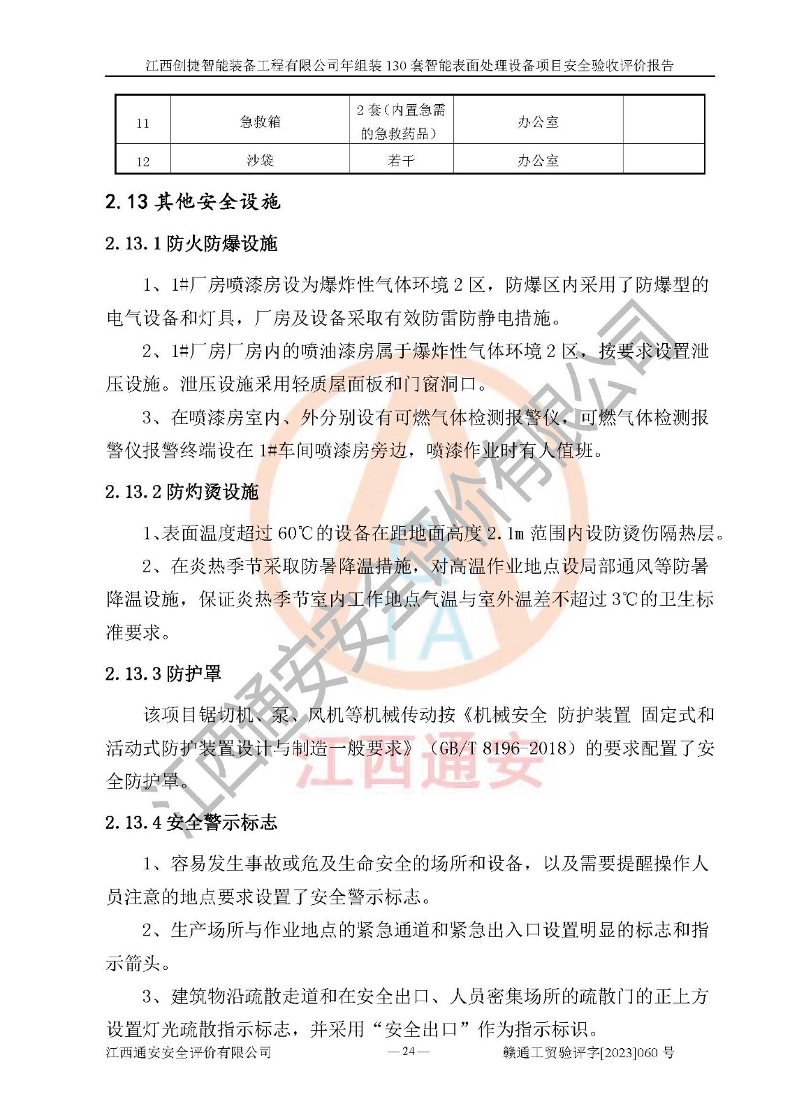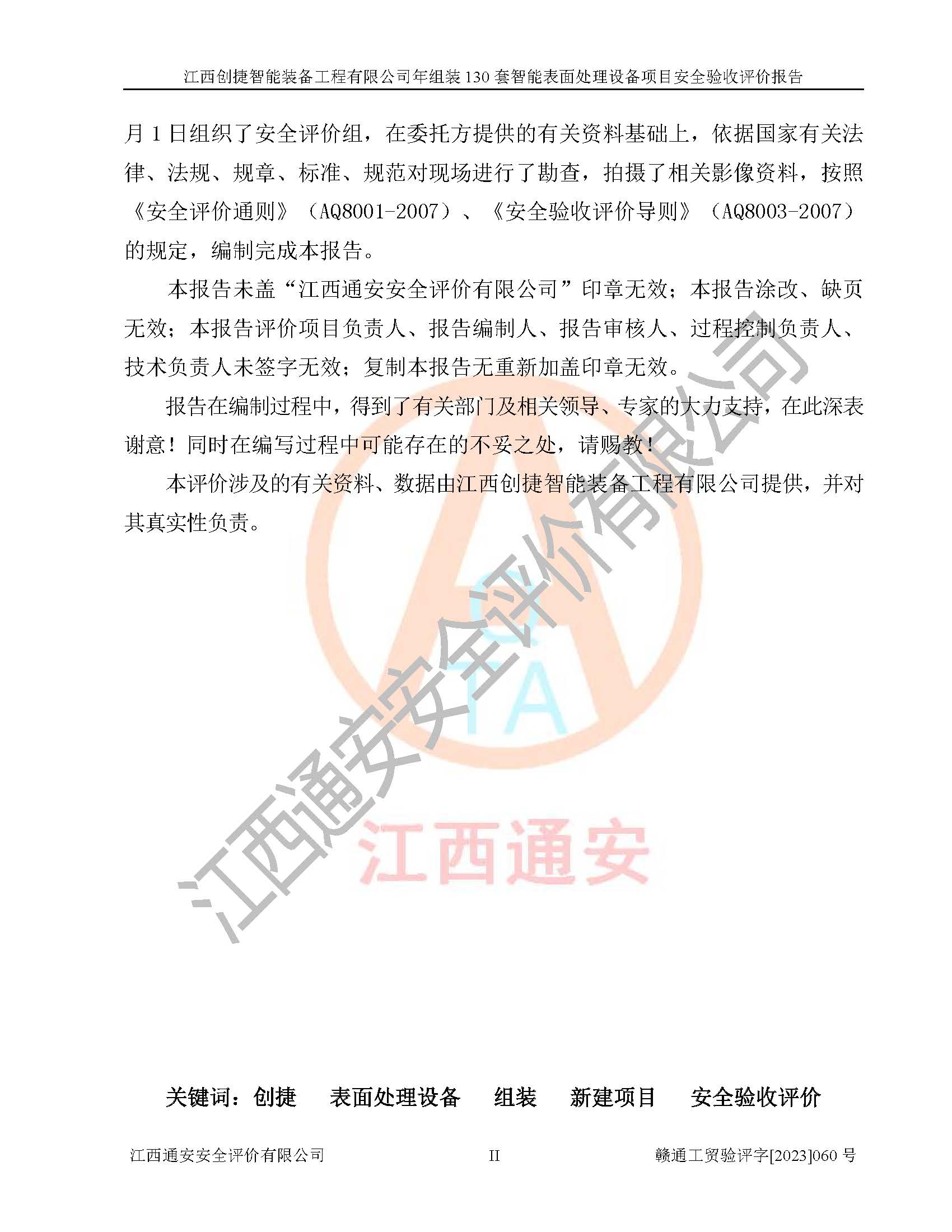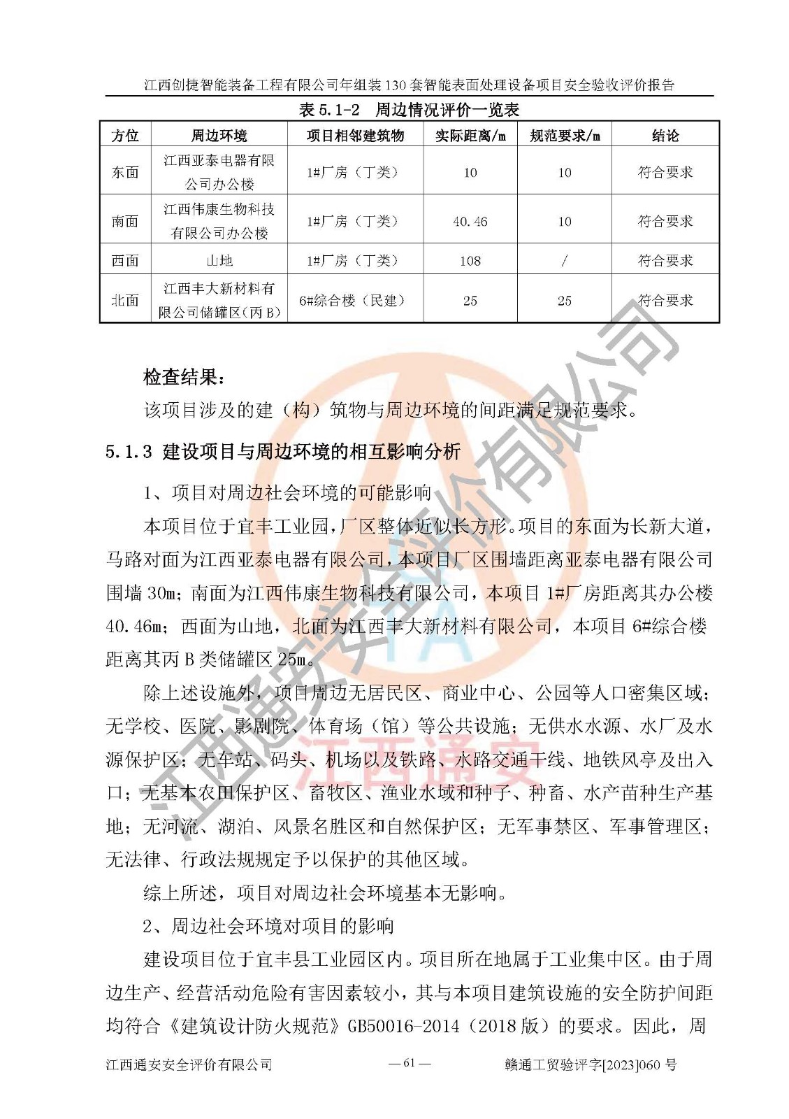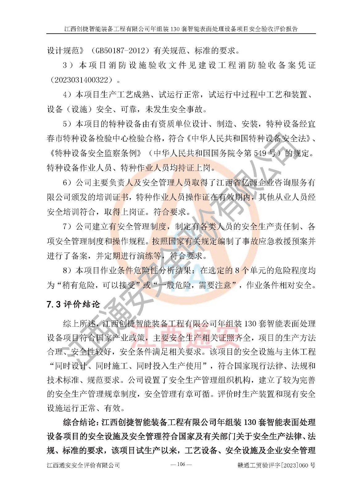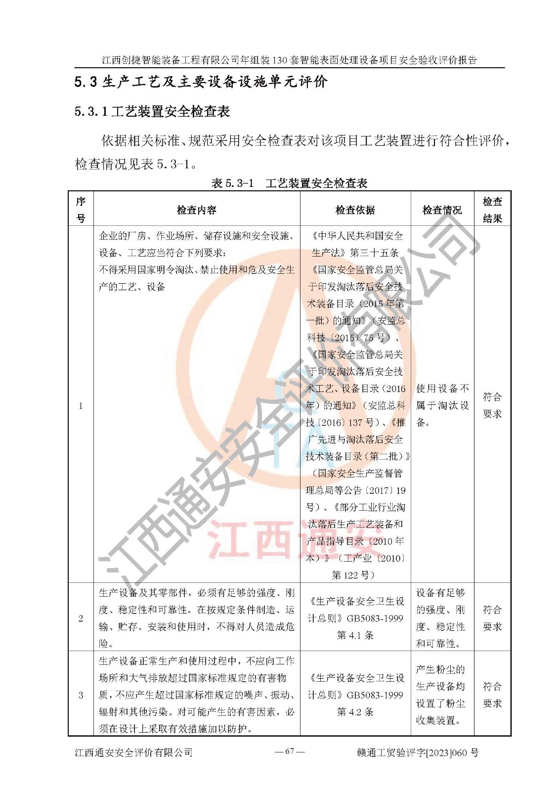 其它 | 根據(jù)《中華人民共和國安全生產(chǎn)法》、《新建項(xiàng)目安全設(shè)施“三同時(shí)”監(jiān)督管理辦法》(原**安全生產(chǎn)監(jiān)督管理總局令第77號修訂)等法律法規(guī)的要求,對江西創(chuàng)捷智能裝備工程有限公司年組裝130套智能表面處理設(shè)備項(xiàng)目安全驗(yàn)收的基本條件進(jìn)行分析,結(jié)果如下: 1)本項(xiàng)目在初步設(shè)計(jì)及建設(shè)過程中基本能貫徹執(zhí)行**、地方及有關(guān)部門的安全生產(chǎn)法律法規(guī)、標(biāo)準(zhǔn)要求,取得了**相關(guān)部門的許可、備案。項(xiàng)目的設(shè)計(jì)、施工、監(jiān)理等單位均有相應(yīng)資質(zhì)。 2)本項(xiàng)目址選符合要求;總平面布置合理,主要建筑的防火間距符合符合《建筑設(shè)計(jì)防火規(guī)范》(GB50016-2014,2018版)、《工業(yè)企業(yè)總平面設(shè)計(jì)規(guī)范》(GB50187-2012)有關(guān)規(guī)范、標(biāo)準(zhǔn)的要求。 3)本項(xiàng)目消防設(shè)施驗(yàn)收文件見建設(shè)工程消防驗(yàn)收備案憑證(2023031400322)。 4)本項(xiàng)目生產(chǎn)工藝成熟、試運(yùn)行正常,試運(yùn)行中過程中工藝和裝置、設(shè)備(設(shè)施)安全、可靠,未發(fā)生安全事故。 5)本項(xiàng)目的特種設(shè)備由有資質(zhì)單位設(shè)計(jì)、制造、安裝,特種設(shè)備經(jīng)宜春市特種設(shè)備檢驗(yàn)中心檢驗(yàn)合格,符合《中華人民共和國特種設(shè)備安全法》、《特種設(shè)備安全監(jiān)察條例》(中華人民共和國***令第549號)的規(guī)定。特種設(shè)備作業(yè)人員、特種作業(yè)人員均持證上崗。 6)公司主要負(fù)責(zé)人及安全管理人員取得了江西省億源企業(yè)咨詢服務(wù)有限公司頒發(fā)的培訓(xùn)證書,特種作業(yè)人員操作證在**期內(nèi),其他從業(yè)人員經(jīng)安全培訓(xùn)符合,取得上崗證。符合要求。 7)公司建立有安全管理制度,制定有各類人員的安全生產(chǎn)責(zé)任制、各項(xiàng)安全管理制度和操作規(guī)程。按照**有關(guān)規(guī)定編制了事故應(yīng)急救援預(yù)案并進(jìn)行了備案,并定期進(jìn)行演練等,符合要求。 8)本項(xiàng)目作業(yè)條件危險(xiǎn)性分析結(jié)果:在選定的8個(gè)單元的危險(xiǎn)程度均為“稍有危險(xiǎn),可以接受”或“一般危險(xiǎn),需要注意”,作業(yè)條件相對安全。 評價(jià)結(jié)論: 江西創(chuàng)捷智能裝備工程有限公司年組裝130套智能表面處理設(shè)備項(xiàng)目的安全設(shè)施及安全管理符合**及有關(guān)部門關(guān)于安全生產(chǎn)法律、法規(guī)、標(biāo)準(zhǔn)的要求,該項(xiàng)目試生產(chǎn)以來,工藝設(shè)備、安全設(shè)施及企業(yè)安全管理機(jī)制等運(yùn)行正常,安全設(shè)施、措施達(dá)到設(shè)計(jì)要求和預(yù)期結(jié)果,可以滿足建設(shè)項(xiàng)目安全生產(chǎn)的要求,安全生產(chǎn)管理**,具備竣工驗(yàn)收條件。 | ||||