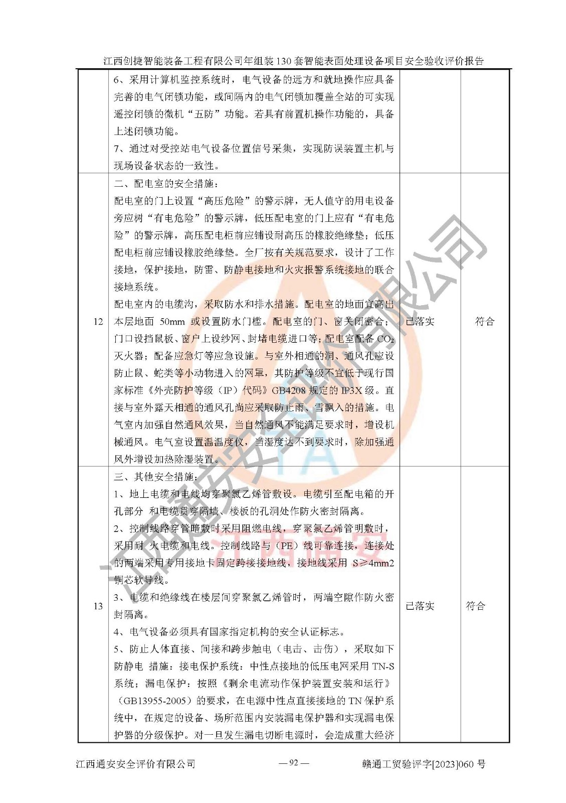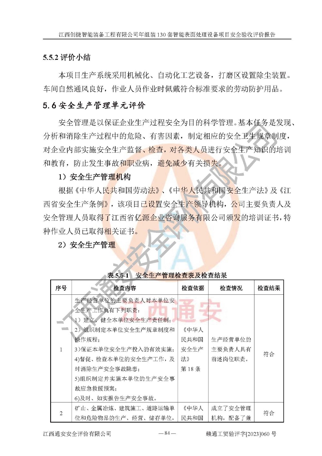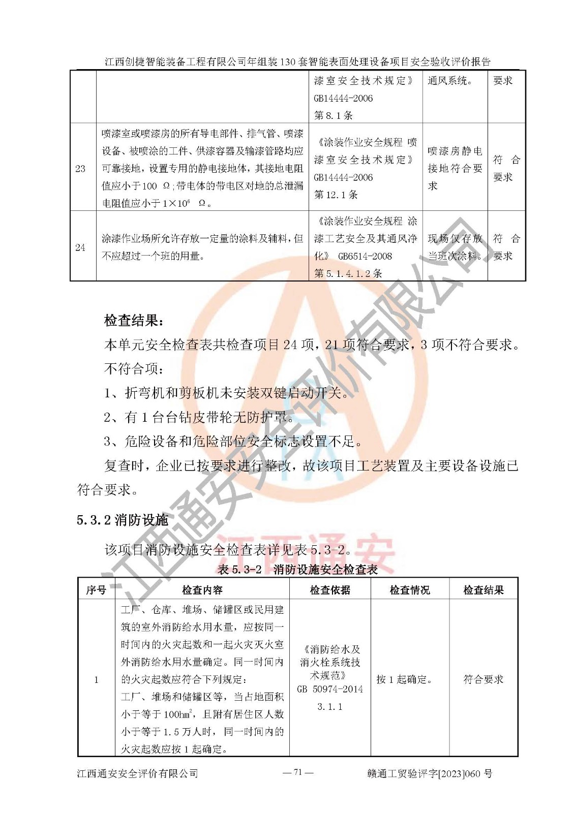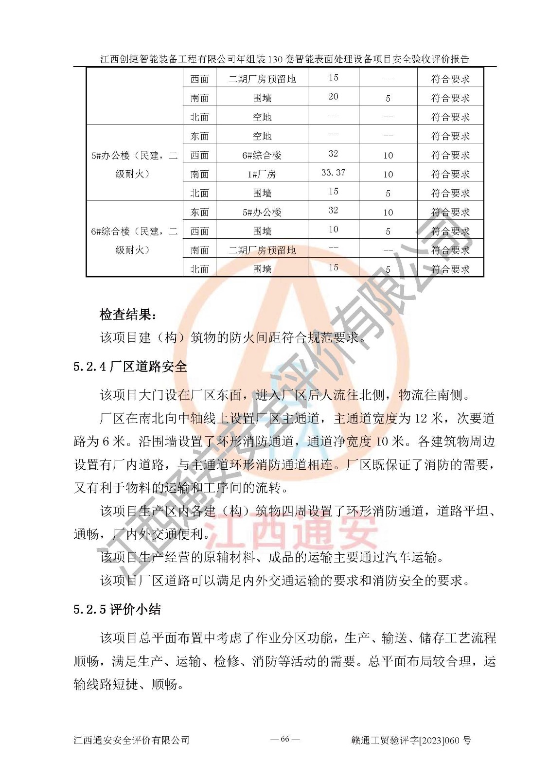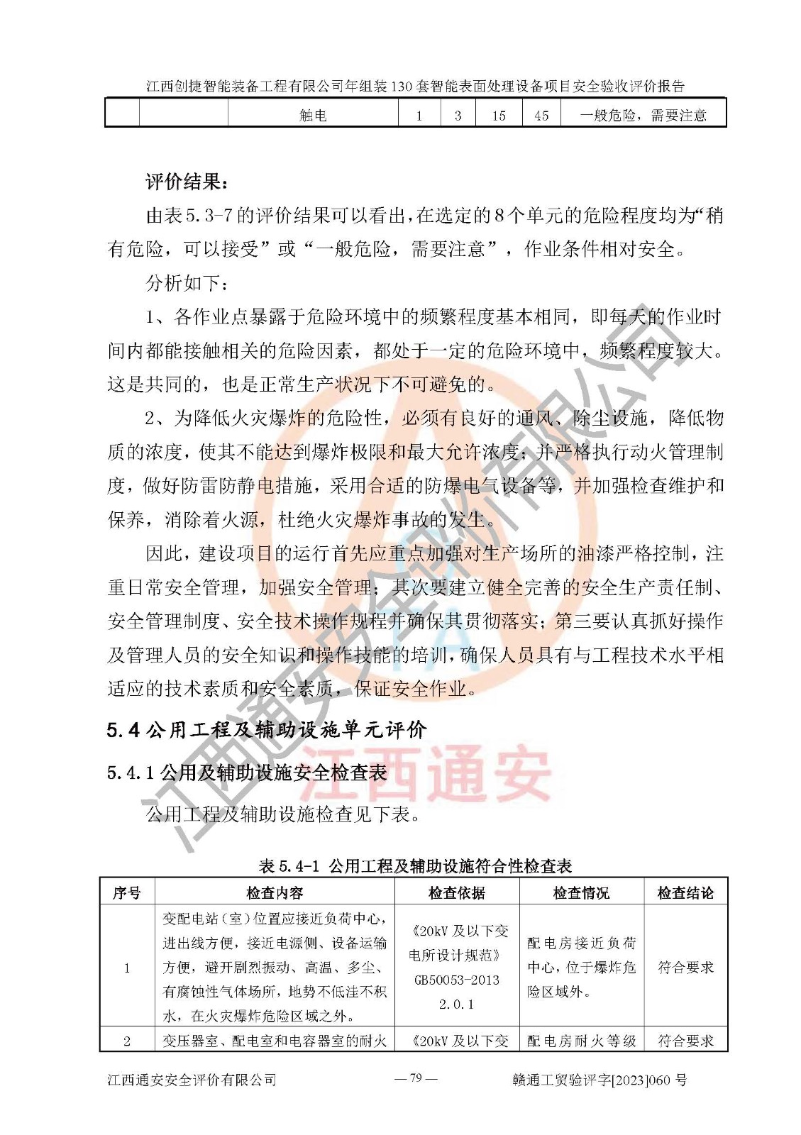 其它 | 根據(jù)《中華人民共和國安全生產(chǎn)法》、《新建項(xiàng)目安全設(shè)施“三同時(shí)”監(jiān)督管理辦法》(原**安全生產(chǎn)監(jiān)督管理總局令第77號修訂)等法律法規(guī)的要求,對江西創(chuàng)捷智能裝備工程有限公司年組裝130套智能表面處理設(shè)備項(xiàng)目安全驗(yàn)收的基本條件進(jìn)行分析,結(jié)果如下: 1)本項(xiàng)目在初步設(shè)計(jì)及建設(shè)過程中基本能貫徹執(zhí)行**、地方及有關(guān)部門的安全生產(chǎn)法律法規(guī)、標(biāo)準(zhǔn)要求,取得了**相關(guān)部門的許可、備案。項(xiàng)目的設(shè)計(jì)、施工、監(jiān)理等單位均有相應(yīng)資質(zhì)。 2)本項(xiàng)目址選符合要求;總平面布置合理,主要建筑的防火間距符合符合《建筑設(shè)計(jì)防火規(guī)范》(GB50016-2014,2018版)、《工業(yè)企業(yè)總平面設(shè)計(jì)規(guī)范》(GB50187-2012)有關(guān)規(guī)范、標(biāo)準(zhǔn)的要求。 3)本項(xiàng)目消防設(shè)施驗(yàn)收文件見建設(shè)工程消防驗(yàn)收備案憑證(2023031400322)。 4)本項(xiàng)目生產(chǎn)工藝成熟、試運(yùn)行正常,試運(yùn)行中過程中工藝和裝置、設(shè)備(設(shè)施)安全、可靠,未發(fā)生安全事故。 5)本項(xiàng)目的特種設(shè)備由有資質(zhì)單位設(shè)計(jì)、制造、安裝,特種設(shè)備經(jīng)宜春市特種設(shè)備檢驗(yàn)中心檢驗(yàn)合格,符合《中華人民共和國特種設(shè)備安全法》、《特種設(shè)備安全監(jiān)察條例》(中華人民共和國***令第549號)的規(guī)定。特種設(shè)備作業(yè)人員、特種作業(yè)人員均持證上崗。 6)公司主要負(fù)責(zé)人及安全管理人員取得了江西省億源企業(yè)咨詢服務(wù)有限公司頒發(fā)的培訓(xùn)證書,特種作業(yè)人員操作證在**期內(nèi),其他從業(yè)人員經(jīng)安全培訓(xùn)符合,取得上崗證。符合要求。 7)公司建立有安全管理制度,制定有各類人員的安全生產(chǎn)責(zé)任制、各項(xiàng)安全管理制度和操作規(guī)程。按照**有關(guān)規(guī)定編制了事故應(yīng)急救援預(yù)案并進(jìn)行了備案,并定期進(jìn)行演練等,符合要求。 8)本項(xiàng)目作業(yè)條件危險(xiǎn)性分析結(jié)果:在選定的8個(gè)單元的危險(xiǎn)程度均為“稍有危險(xiǎn),可以接受”或“一般危險(xiǎn),需要注意”,作業(yè)條件相對安全。 評價(jià)結(jié)論: 江西創(chuàng)捷智能裝備工程有限公司年組裝130套智能表面處理設(shè)備項(xiàng)目的安全設(shè)施及安全管理符合**及有關(guān)部門關(guān)于安全生產(chǎn)法律、法規(guī)、標(biāo)準(zhǔn)的要求,該項(xiàng)目試生產(chǎn)以來,工藝設(shè)備、安全設(shè)施及企業(yè)安全管理機(jī)制等運(yùn)行正常,安全設(shè)施、措施達(dá)到設(shè)計(jì)要求和預(yù)期結(jié)果,可以滿足建設(shè)項(xiàng)目安全生產(chǎn)的要求,安全生產(chǎn)管理**,具備竣工驗(yàn)收條件。 | ||||
