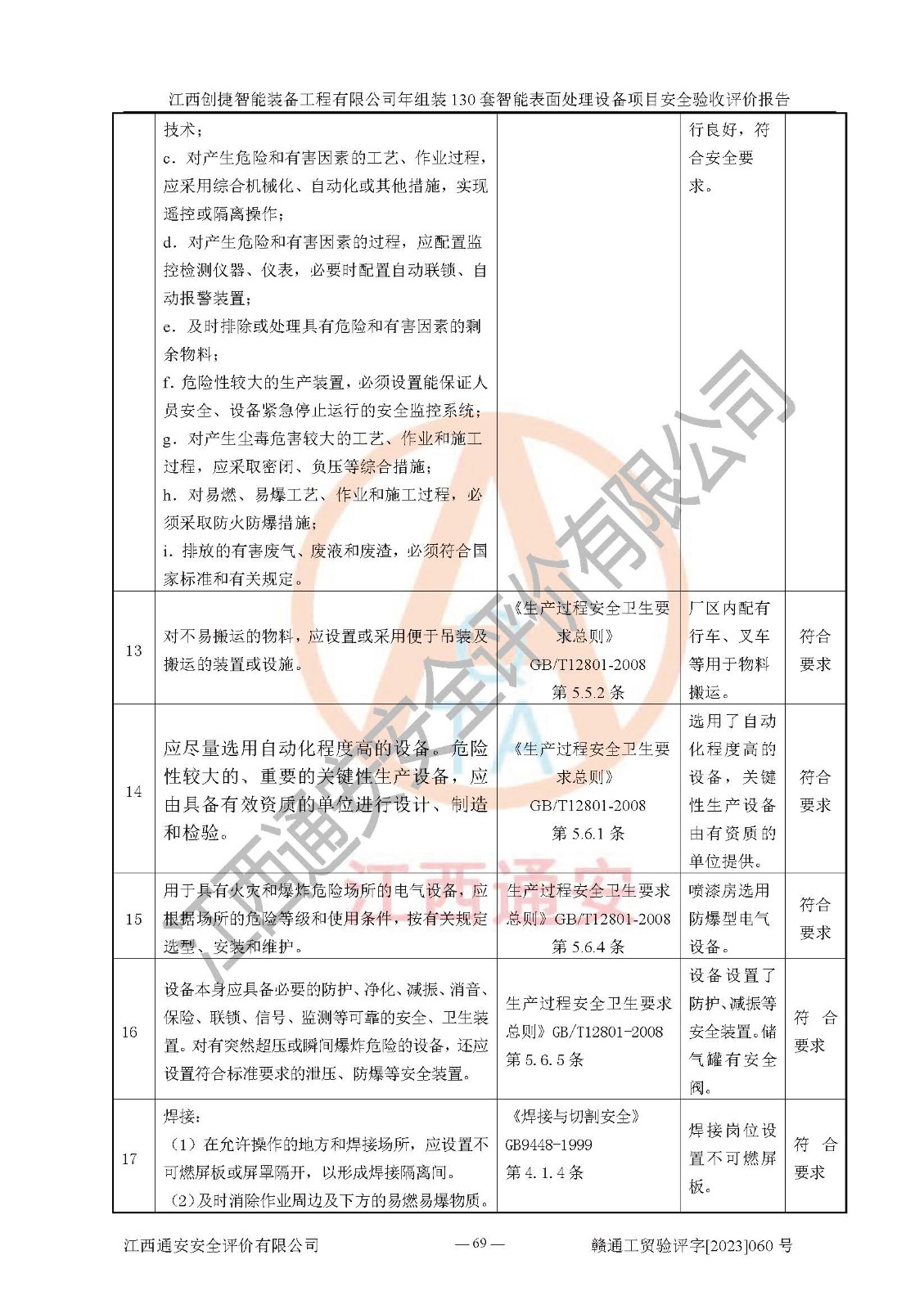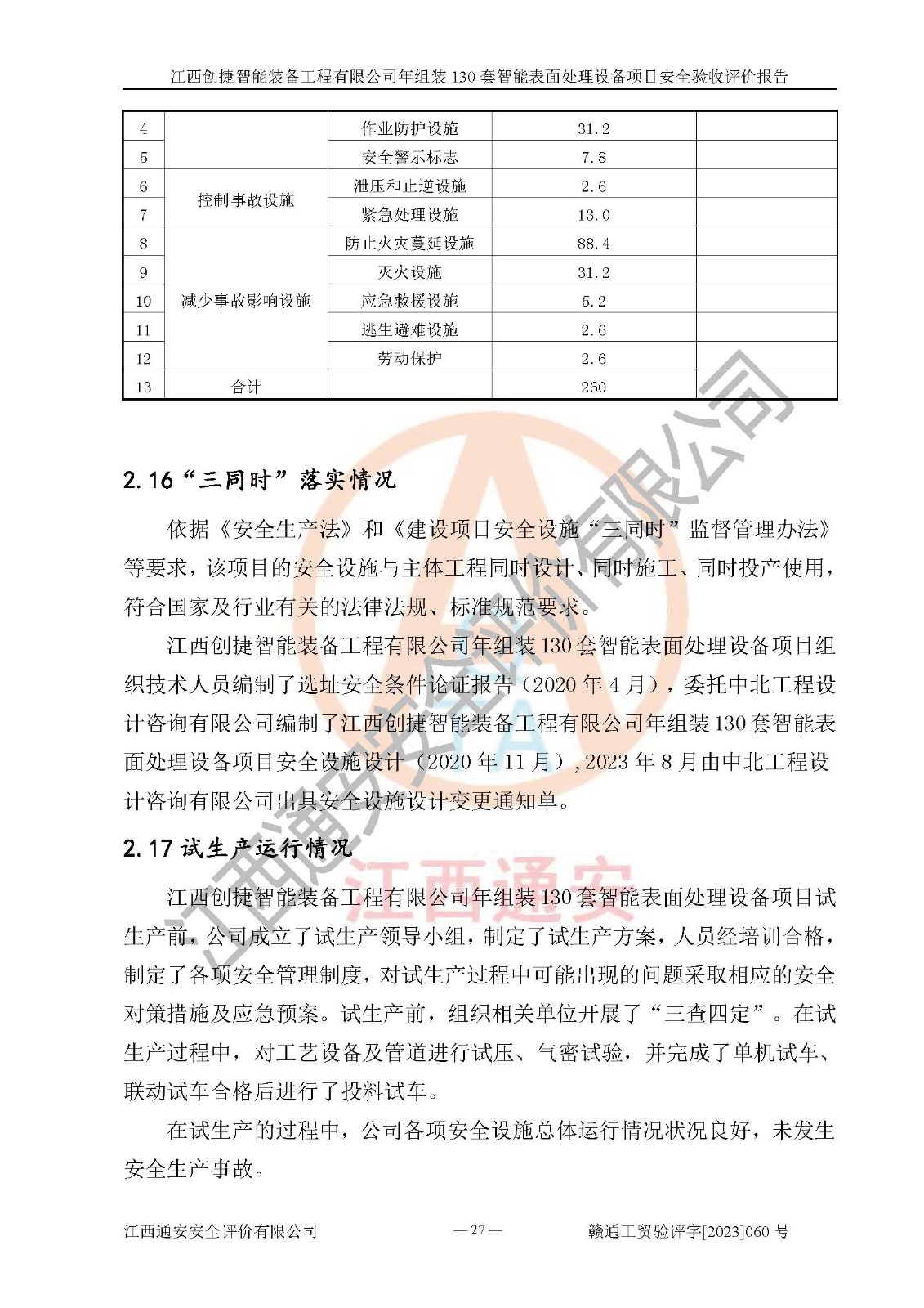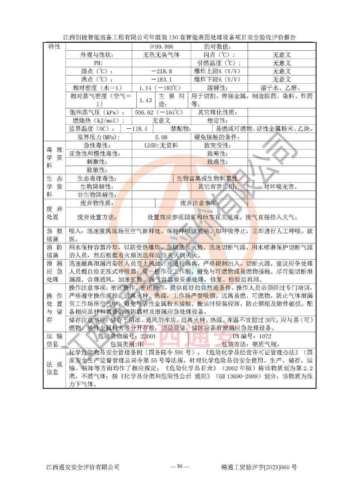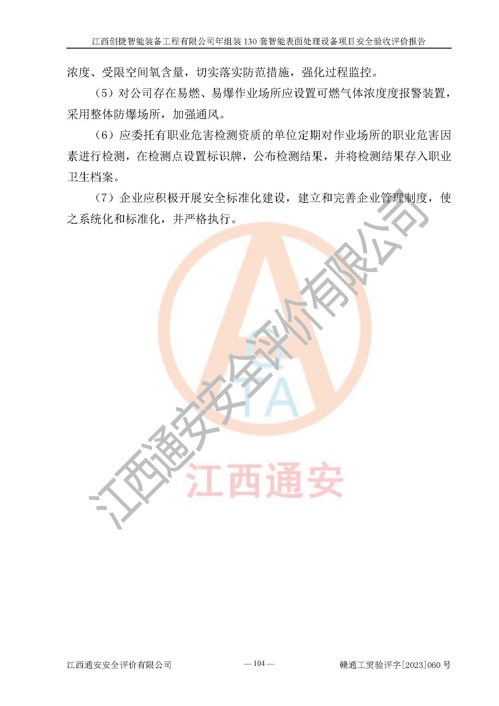 其它 | 根據(jù)《中華人民共和國安全生產(chǎn)法》、《新建項(xiàng)目安全設(shè)施“三同時(shí)”監(jiān)督管理辦法》(原**安全生產(chǎn)監(jiān)督管理總局令第77號修訂)等法律法規(guī)的要求,對江西創(chuàng)捷智能裝備工程有限公司年組裝130套智能表面處理設(shè)備項(xiàng)目安全驗(yàn)收的基本條件進(jìn)行分析,結(jié)果如下: 1)本項(xiàng)目在初步設(shè)計(jì)及建設(shè)過程中基本能貫徹執(zhí)行**、地方及有關(guān)部門的安全生產(chǎn)法律法規(guī)、標(biāo)準(zhǔn)要求,取得了**相關(guān)部門的許可、備案。項(xiàng)目的設(shè)計(jì)、施工、監(jiān)理等單位均有相應(yīng)資質(zhì)。 2)本項(xiàng)目址選符合要求;總平面布置合理,主要建筑的防火間距符合符合《建筑設(shè)計(jì)防火規(guī)范》(GB50016-2014,2018版)、《工業(yè)企業(yè)總平面設(shè)計(jì)規(guī)范》(GB50187-2012)有關(guān)規(guī)范、標(biāo)準(zhǔn)的要求。 3)本項(xiàng)目消防設(shè)施驗(yàn)收文件見建設(shè)工程消防驗(yàn)收備案憑證(2023031400322)。 4)本項(xiàng)目生產(chǎn)工藝成熟、試運(yùn)行正常,試運(yùn)行中過程中工藝和裝置、設(shè)備(設(shè)施)安全、可靠,未發(fā)生安全事故。 5)本項(xiàng)目的特種設(shè)備由有資質(zhì)單位設(shè)計(jì)、制造、安裝,特種設(shè)備經(jīng)宜春市特種設(shè)備檢驗(yàn)中心檢驗(yàn)合格,符合《中華人民共和國特種設(shè)備安全法》、《特種設(shè)備安全監(jiān)察條例》(中華人民共和國***令第549號)的規(guī)定。特種設(shè)備作業(yè)人員、特種作業(yè)人員均持證上崗。 6)公司主要負(fù)責(zé)人及安全管理人員取得了江西省億源企業(yè)咨詢服務(wù)有限公司頒發(fā)的培訓(xùn)證書,特種作業(yè)人員操作證在**期內(nèi),其他從業(yè)人員經(jīng)安全培訓(xùn)符合,取得上崗證。符合要求。 7)公司建立有安全管理制度,制定有各類人員的安全生產(chǎn)責(zé)任制、各項(xiàng)安全管理制度和操作規(guī)程。按照**有關(guān)規(guī)定編制了事故應(yīng)急救援預(yù)案并進(jìn)行了備案,并定期進(jìn)行演練等,符合要求。 8)本項(xiàng)目作業(yè)條件危險(xiǎn)性分析結(jié)果:在選定的8個(gè)單元的危險(xiǎn)程度均為“稍有危險(xiǎn),可以接受”或“一般危險(xiǎn),需要注意”,作業(yè)條件相對安全。 評價(jià)結(jié)論: 江西創(chuàng)捷智能裝備工程有限公司年組裝130套智能表面處理設(shè)備項(xiàng)目的安全設(shè)施及安全管理符合**及有關(guān)部門關(guān)于安全生產(chǎn)法律、法規(guī)、標(biāo)準(zhǔn)的要求,該項(xiàng)目試生產(chǎn)以來,工藝設(shè)備、安全設(shè)施及企業(yè)安全管理機(jī)制等運(yùn)行正常,安全設(shè)施、措施達(dá)到設(shè)計(jì)要求和預(yù)期結(jié)果,可以滿足建設(shè)項(xiàng)目安全生產(chǎn)的要求,安全生產(chǎn)管理**,具備竣工驗(yàn)收條件。 | ||||