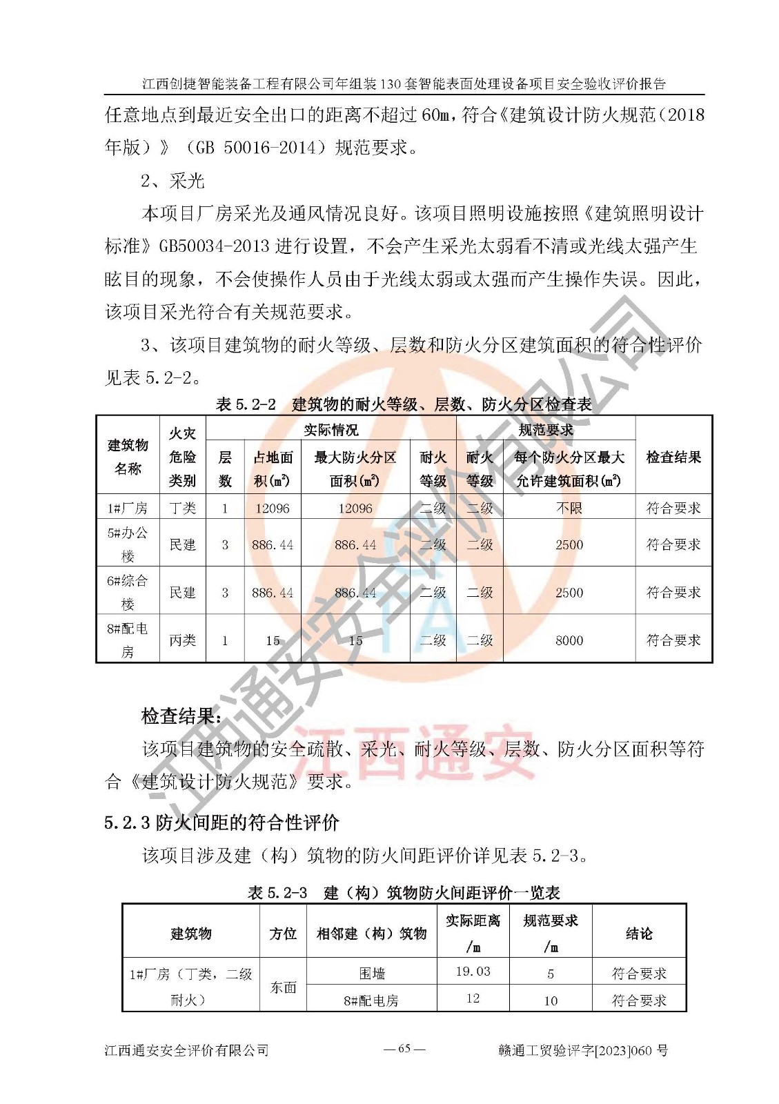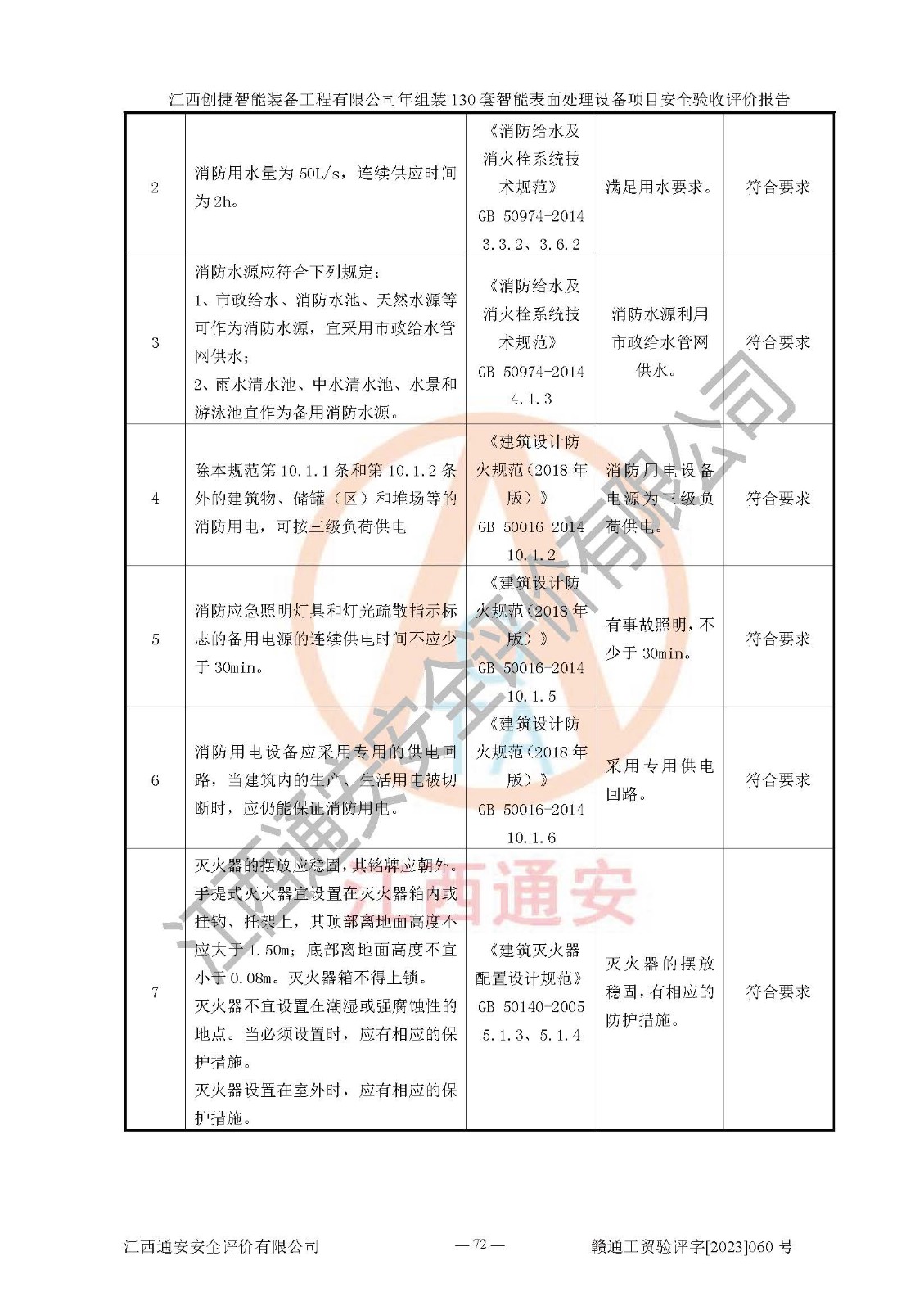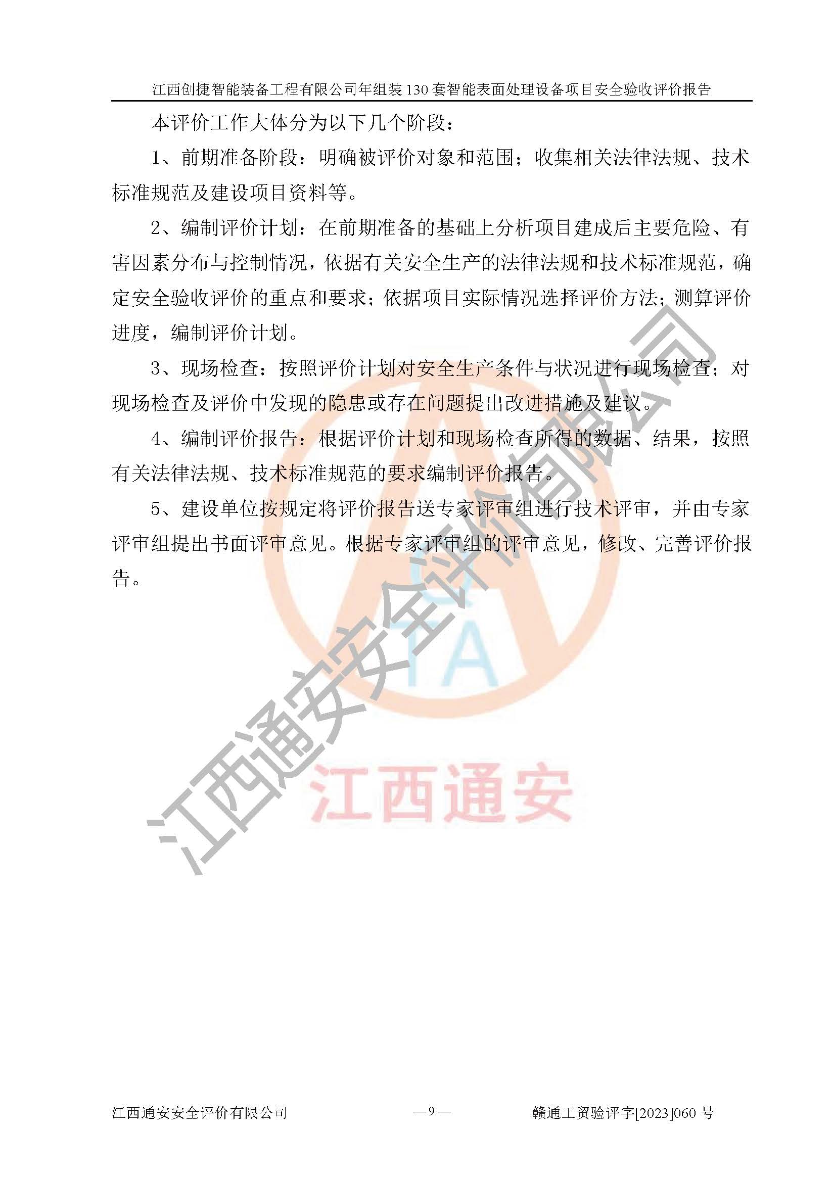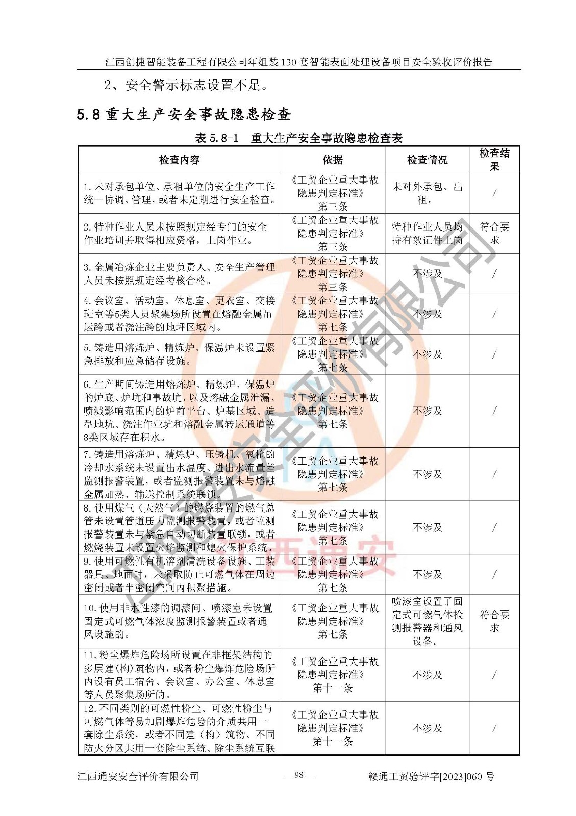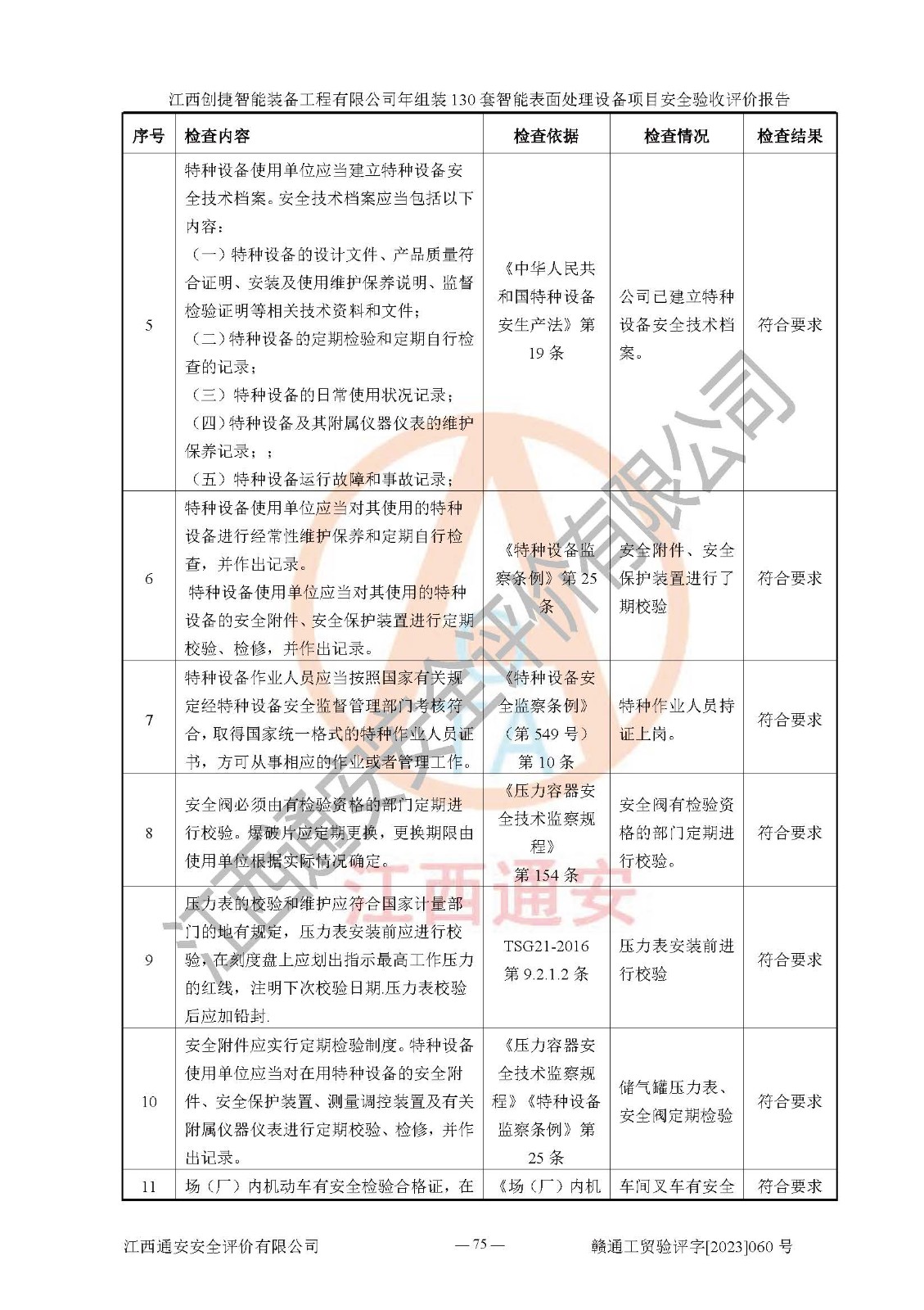 其它 | 根據(jù)《中華人民共和國安全生產(chǎn)法》、《新建項(xiàng)目安全設(shè)施“三同時(shí)”監(jiān)督管理辦法》(原**安全生產(chǎn)監(jiān)督管理總局令第77號修訂)等法律法規(guī)的要求,對江西創(chuàng)捷智能裝備工程有限公司年組裝130套智能表面處理設(shè)備項(xiàng)目安全驗(yàn)收的基本條件進(jìn)行分析,結(jié)果如下: 1)本項(xiàng)目在初步設(shè)計(jì)及建設(shè)過程中基本能貫徹執(zhí)行**、地方及有關(guān)部門的安全生產(chǎn)法律法規(guī)、標(biāo)準(zhǔn)要求,取得了**相關(guān)部門的許可、備案。項(xiàng)目的設(shè)計(jì)、施工、監(jiān)理等單位均有相應(yīng)資質(zhì)。 2)本項(xiàng)目址選符合要求;總平面布置合理,主要建筑的防火間距符合符合《建筑設(shè)計(jì)防火規(guī)范》(GB50016-2014,2018版)、《工業(yè)企業(yè)總平面設(shè)計(jì)規(guī)范》(GB50187-2012)有關(guān)規(guī)范、標(biāo)準(zhǔn)的要求。 3)本項(xiàng)目消防設(shè)施驗(yàn)收文件見建設(shè)工程消防驗(yàn)收備案憑證(2023031400322)。 4)本項(xiàng)目生產(chǎn)工藝成熟、試運(yùn)行正常,試運(yùn)行中過程中工藝和裝置、設(shè)備(設(shè)施)安全、可靠,未發(fā)生安全事故。 5)本項(xiàng)目的特種設(shè)備由有資質(zhì)單位設(shè)計(jì)、制造、安裝,特種設(shè)備經(jīng)宜春市特種設(shè)備檢驗(yàn)中心檢驗(yàn)合格,符合《中華人民共和國特種設(shè)備安全法》、《特種設(shè)備安全監(jiān)察條例》(中華人民共和國***令第549號)的規(guī)定。特種設(shè)備作業(yè)人員、特種作業(yè)人員均持證上崗。 6)公司主要負(fù)責(zé)人及安全管理人員取得了江西省億源企業(yè)咨詢服務(wù)有限公司頒發(fā)的培訓(xùn)證書,特種作業(yè)人員操作證在**期內(nèi),其他從業(yè)人員經(jīng)安全培訓(xùn)符合,取得上崗證。符合要求。 7)公司建立有安全管理制度,制定有各類人員的安全生產(chǎn)責(zé)任制、各項(xiàng)安全管理制度和操作規(guī)程。按照**有關(guān)規(guī)定編制了事故應(yīng)急救援預(yù)案并進(jìn)行了備案,并定期進(jìn)行演練等,符合要求。 8)本項(xiàng)目作業(yè)條件危險(xiǎn)性分析結(jié)果:在選定的8個(gè)單元的危險(xiǎn)程度均為“稍有危險(xiǎn),可以接受”或“一般危險(xiǎn),需要注意”,作業(yè)條件相對安全。 評價(jià)結(jié)論: 江西創(chuàng)捷智能裝備工程有限公司年組裝130套智能表面處理設(shè)備項(xiàng)目的安全設(shè)施及安全管理符合**及有關(guān)部門關(guān)于安全生產(chǎn)法律、法規(guī)、標(biāo)準(zhǔn)的要求,該項(xiàng)目試生產(chǎn)以來,工藝設(shè)備、安全設(shè)施及企業(yè)安全管理機(jī)制等運(yùn)行正常,安全設(shè)施、措施達(dá)到設(shè)計(jì)要求和預(yù)期結(jié)果,可以滿足建設(shè)項(xiàng)目安全生產(chǎn)的要求,安全生產(chǎn)管理**,具備竣工驗(yàn)收條件。 | ||||