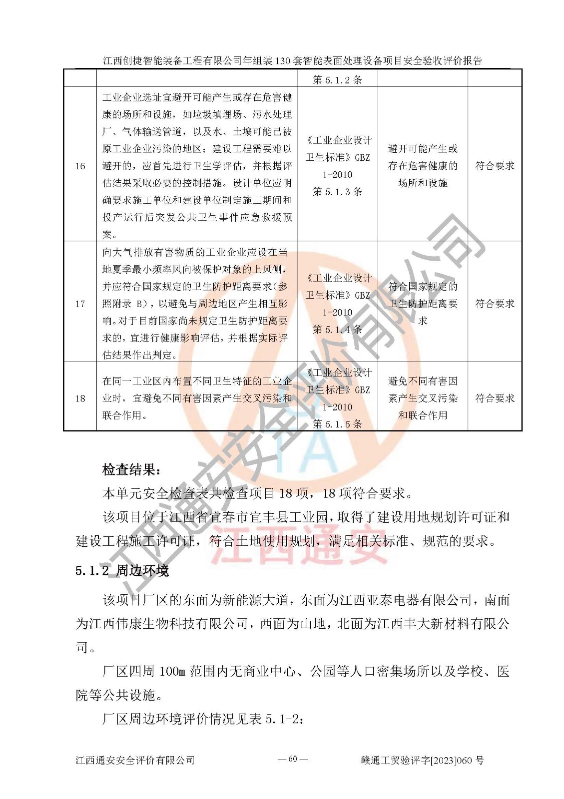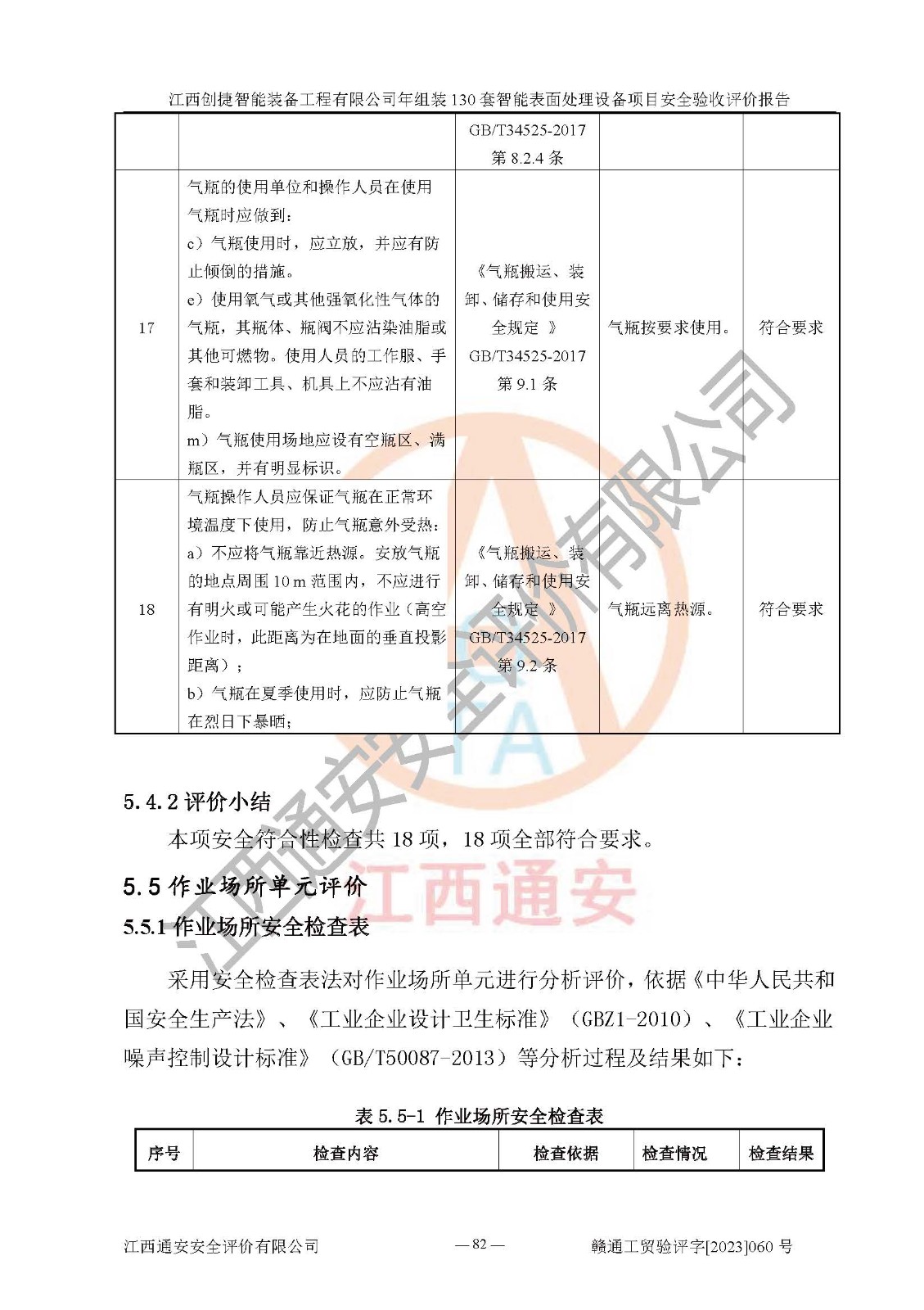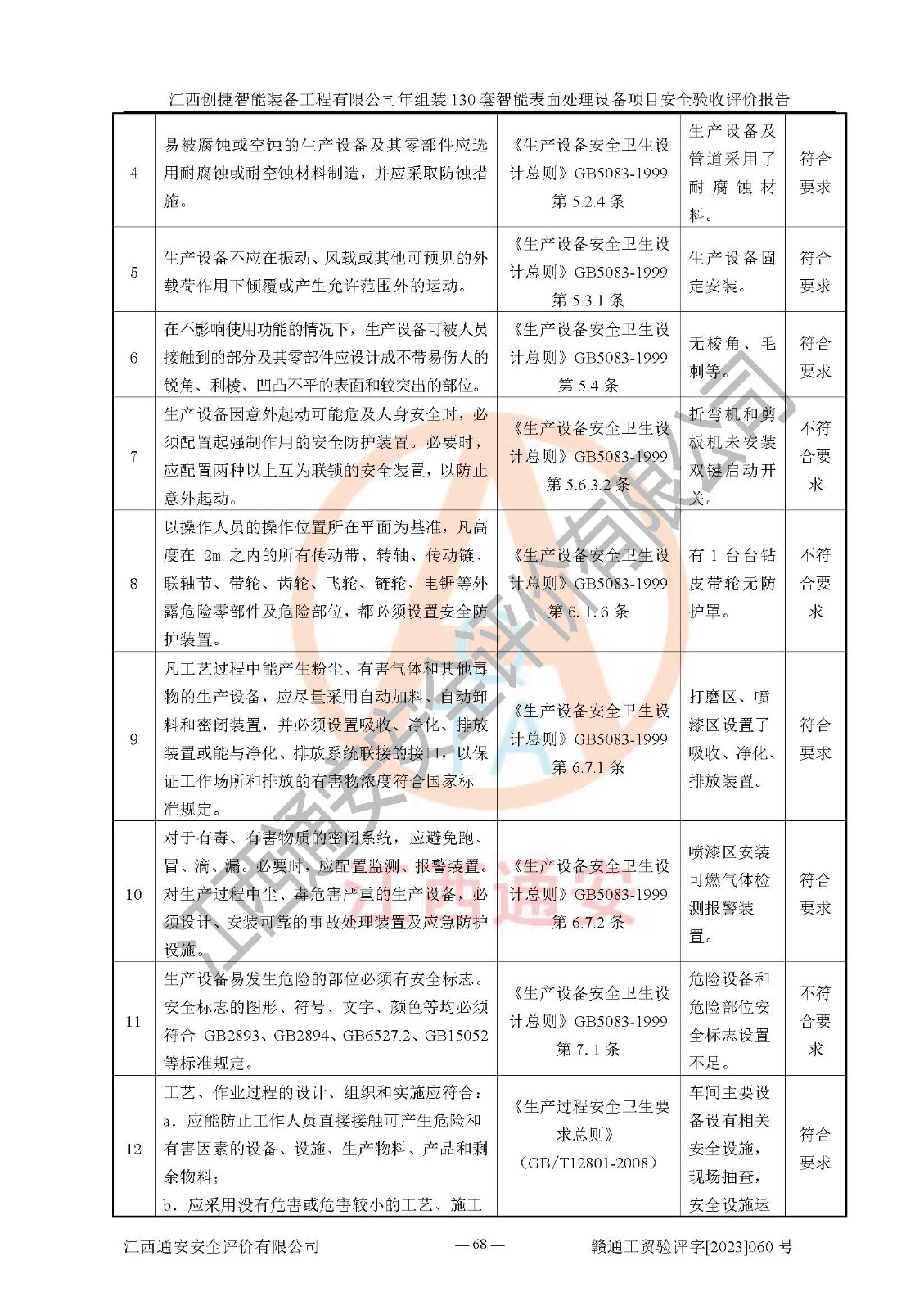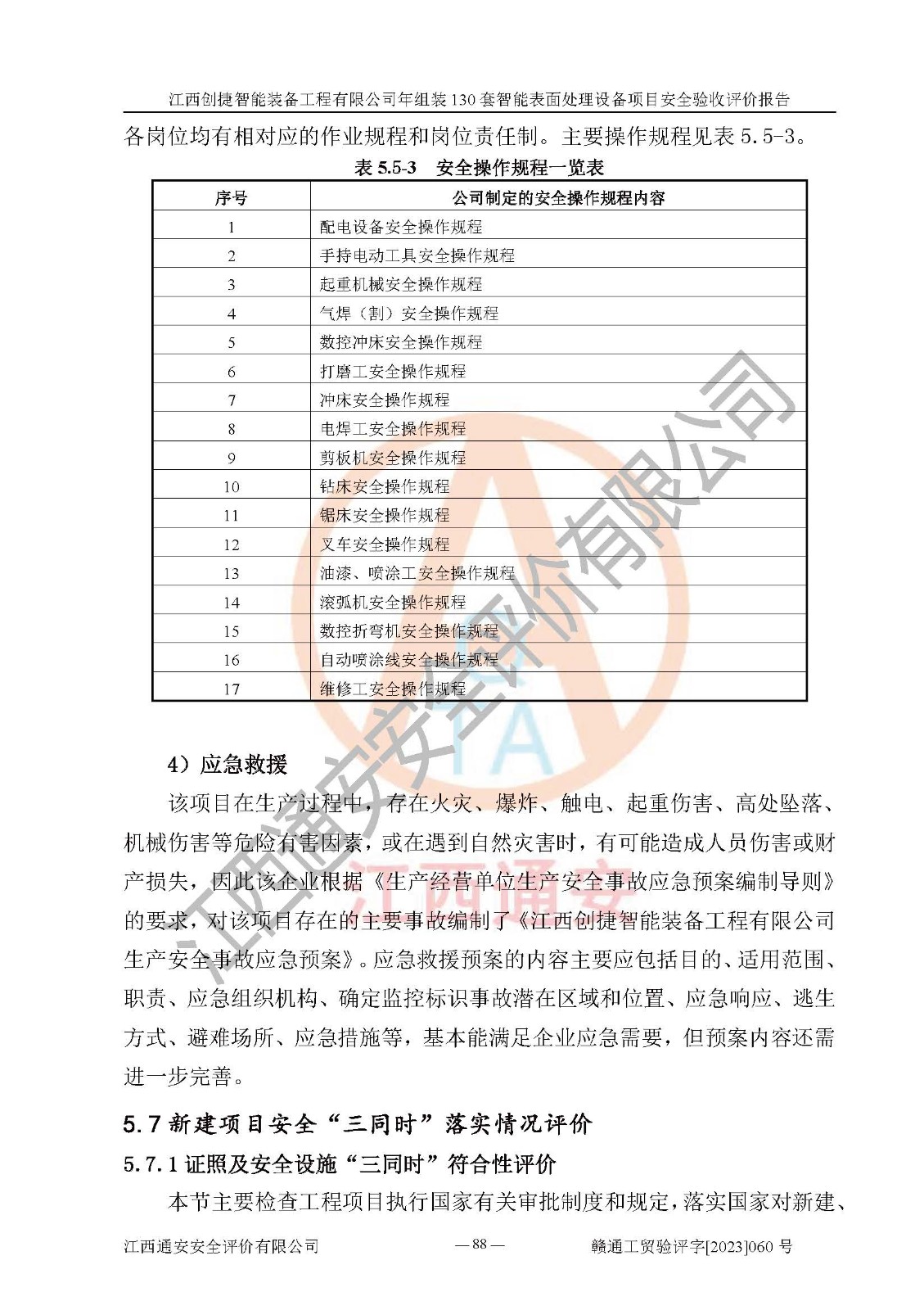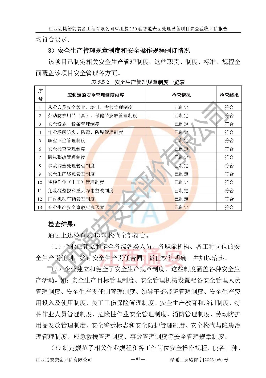 其它 | 根據(jù)《中華人民共和國安全生產(chǎn)法》、《新建項(xiàng)目安全設(shè)施“三同時(shí)”監(jiān)督管理辦法》(原**安全生產(chǎn)監(jiān)督管理總局令第77號修訂)等法律法規(guī)的要求,對江西創(chuàng)捷智能裝備工程有限公司年組裝130套智能表面處理設(shè)備項(xiàng)目安全驗(yàn)收的基本條件進(jìn)行分析,結(jié)果如下: 1)本項(xiàng)目在初步設(shè)計(jì)及建設(shè)過程中基本能貫徹執(zhí)行**、地方及有關(guān)部門的安全生產(chǎn)法律法規(guī)、標(biāo)準(zhǔn)要求,取得了**相關(guān)部門的許可、備案。項(xiàng)目的設(shè)計(jì)、施工、監(jiān)理等單位均有相應(yīng)資質(zhì)。 2)本項(xiàng)目址選符合要求;總平面布置合理,主要建筑的防火間距符合符合《建筑設(shè)計(jì)防火規(guī)范》(GB50016-2014,2018版)、《工業(yè)企業(yè)總平面設(shè)計(jì)規(guī)范》(GB50187-2012)有關(guān)規(guī)范、標(biāo)準(zhǔn)的要求。 3)本項(xiàng)目消防設(shè)施驗(yàn)收文件見建設(shè)工程消防驗(yàn)收備案憑證(2023031400322)。 4)本項(xiàng)目生產(chǎn)工藝成熟、試運(yùn)行正常,試運(yùn)行中過程中工藝和裝置、設(shè)備(設(shè)施)安全、可靠,未發(fā)生安全事故。 5)本項(xiàng)目的特種設(shè)備由有資質(zhì)單位設(shè)計(jì)、制造、安裝,特種設(shè)備經(jīng)宜春市特種設(shè)備檢驗(yàn)中心檢驗(yàn)合格,符合《中華人民共和國特種設(shè)備安全法》、《特種設(shè)備安全監(jiān)察條例》(中華人民共和國***令第549號)的規(guī)定。特種設(shè)備作業(yè)人員、特種作業(yè)人員均持證上崗。 6)公司主要負(fù)責(zé)人及安全管理人員取得了江西省億源企業(yè)咨詢服務(wù)有限公司頒發(fā)的培訓(xùn)證書,特種作業(yè)人員操作證在**期內(nèi),其他從業(yè)人員經(jīng)安全培訓(xùn)符合,取得上崗證。符合要求。 7)公司建立有安全管理制度,制定有各類人員的安全生產(chǎn)責(zé)任制、各項(xiàng)安全管理制度和操作規(guī)程。按照**有關(guān)規(guī)定編制了事故應(yīng)急救援預(yù)案并進(jìn)行了備案,并定期進(jìn)行演練等,符合要求。 8)本項(xiàng)目作業(yè)條件危險(xiǎn)性分析結(jié)果:在選定的8個(gè)單元的危險(xiǎn)程度均為“稍有危險(xiǎn),可以接受”或“一般危險(xiǎn),需要注意”,作業(yè)條件相對安全。 評價(jià)結(jié)論: 江西創(chuàng)捷智能裝備工程有限公司年組裝130套智能表面處理設(shè)備項(xiàng)目的安全設(shè)施及安全管理符合**及有關(guān)部門關(guān)于安全生產(chǎn)法律、法規(guī)、標(biāo)準(zhǔn)的要求,該項(xiàng)目試生產(chǎn)以來,工藝設(shè)備、安全設(shè)施及企業(yè)安全管理機(jī)制等運(yùn)行正常,安全設(shè)施、措施達(dá)到設(shè)計(jì)要求和預(yù)期結(jié)果,可以滿足建設(shè)項(xiàng)目安全生產(chǎn)的要求,安全生產(chǎn)管理**,具備竣工驗(yàn)收條件。 | ||||