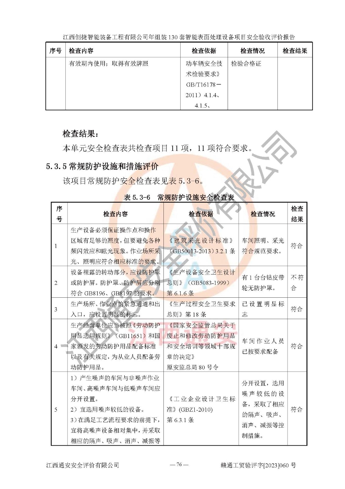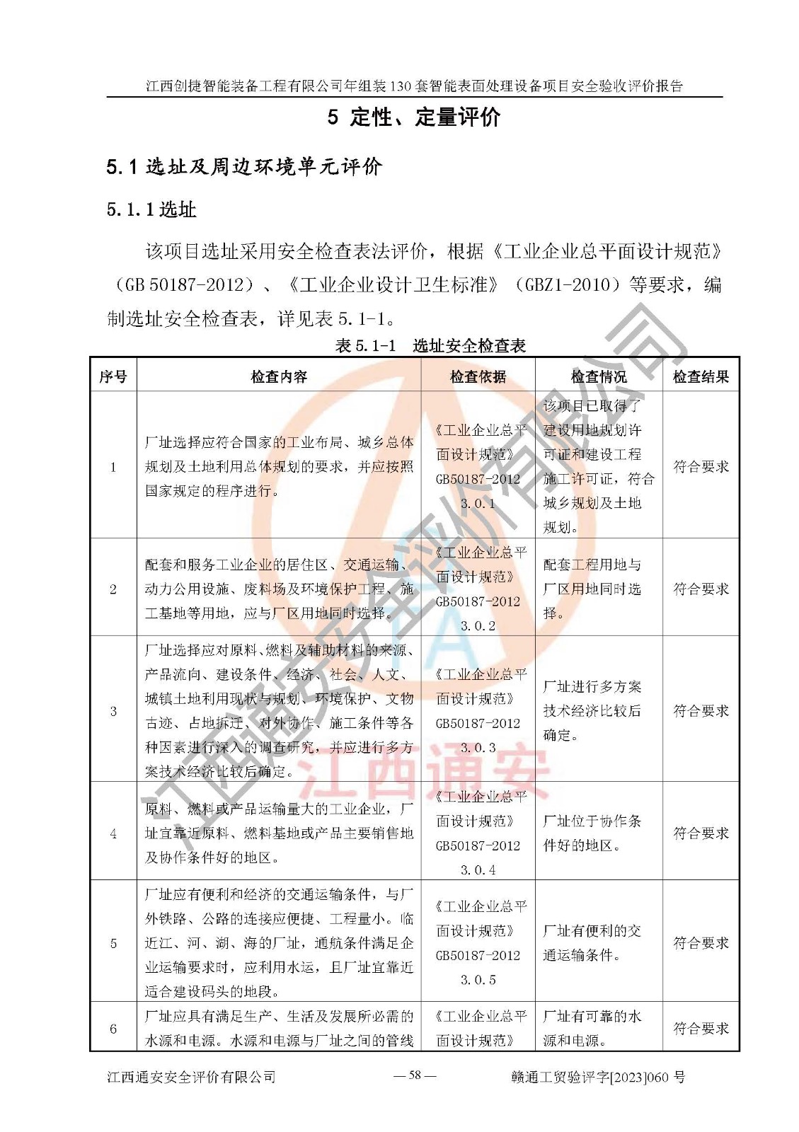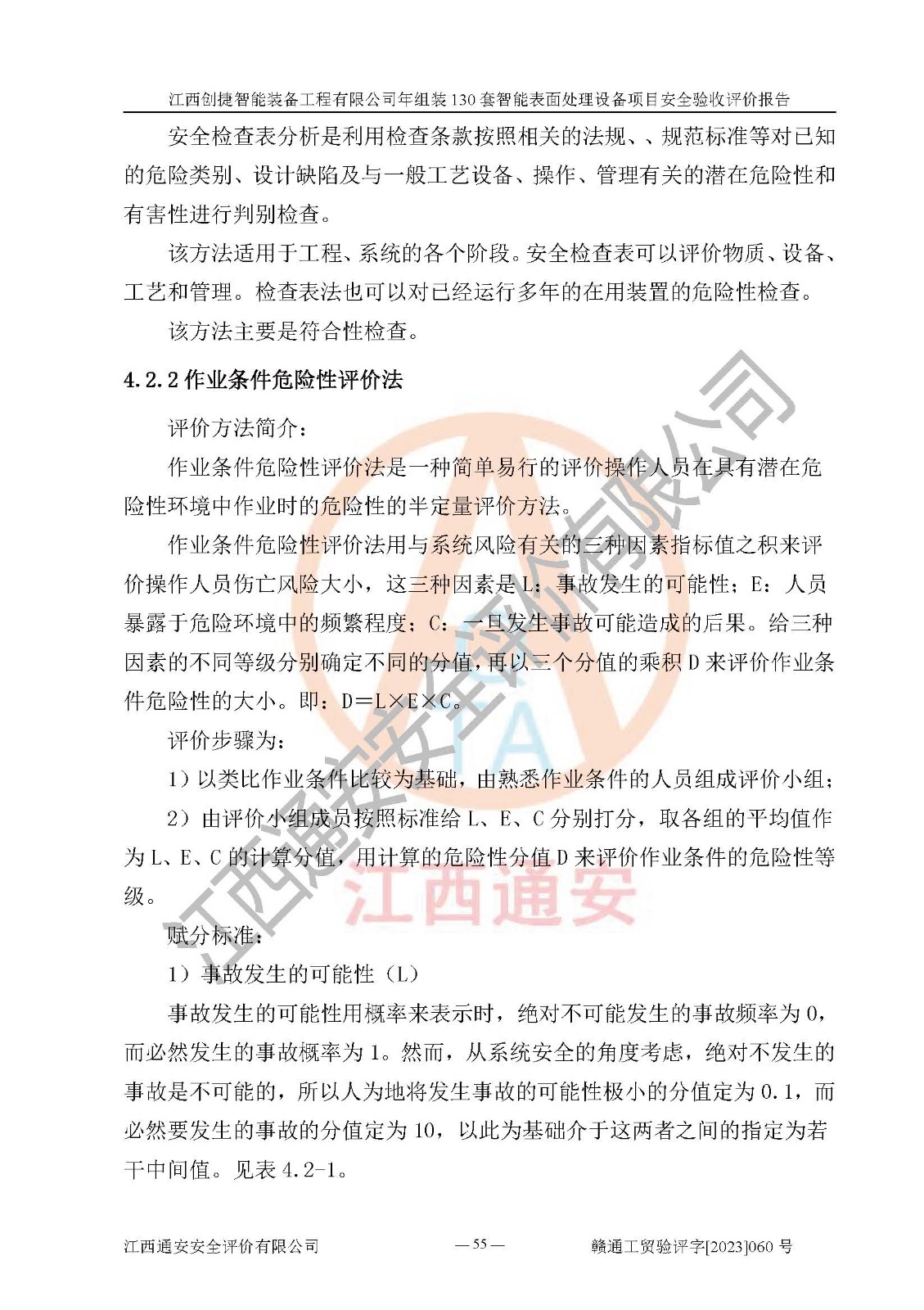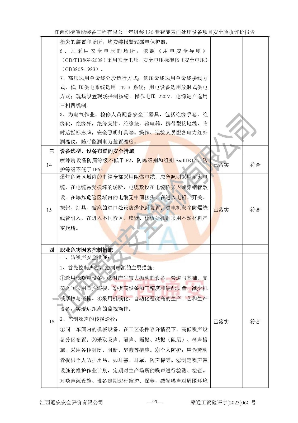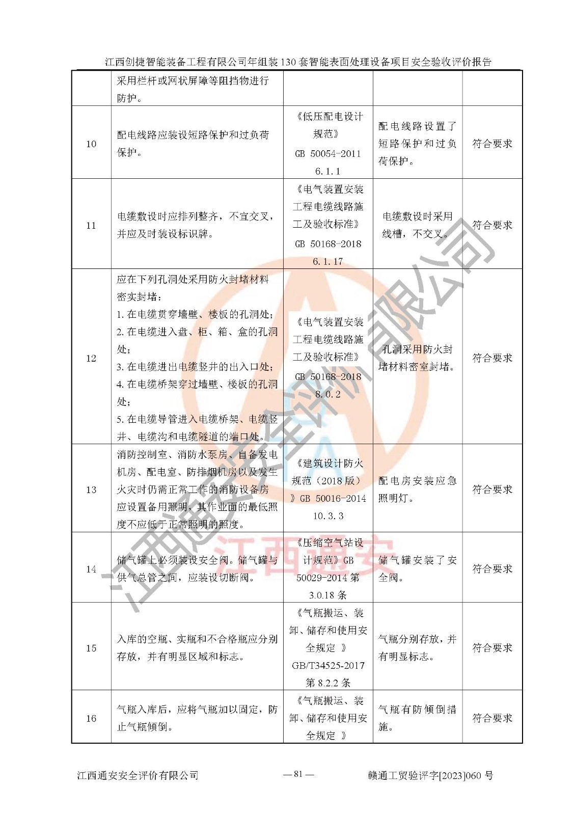 其它 | 根據(jù)《中華人民共和國安全生產(chǎn)法》、《新建項(xiàng)目安全設(shè)施“三同時(shí)”監(jiān)督管理辦法》(原**安全生產(chǎn)監(jiān)督管理總局令第77號修訂)等法律法規(guī)的要求,對江西創(chuàng)捷智能裝備工程有限公司年組裝130套智能表面處理設(shè)備項(xiàng)目安全驗(yàn)收的基本條件進(jìn)行分析,結(jié)果如下: 1)本項(xiàng)目在初步設(shè)計(jì)及建設(shè)過程中基本能貫徹執(zhí)行**、地方及有關(guān)部門的安全生產(chǎn)法律法規(guī)、標(biāo)準(zhǔn)要求,取得了**相關(guān)部門的許可、備案。項(xiàng)目的設(shè)計(jì)、施工、監(jiān)理等單位均有相應(yīng)資質(zhì)。 2)本項(xiàng)目址選符合要求;總平面布置合理,主要建筑的防火間距符合符合《建筑設(shè)計(jì)防火規(guī)范》(GB50016-2014,2018版)、《工業(yè)企業(yè)總平面設(shè)計(jì)規(guī)范》(GB50187-2012)有關(guān)規(guī)范、標(biāo)準(zhǔn)的要求。 3)本項(xiàng)目消防設(shè)施驗(yàn)收文件見建設(shè)工程消防驗(yàn)收備案憑證(2023031400322)。 4)本項(xiàng)目生產(chǎn)工藝成熟、試運(yùn)行正常,試運(yùn)行中過程中工藝和裝置、設(shè)備(設(shè)施)安全、可靠,未發(fā)生安全事故。 5)本項(xiàng)目的特種設(shè)備由有資質(zhì)單位設(shè)計(jì)、制造、安裝,特種設(shè)備經(jīng)宜春市特種設(shè)備檢驗(yàn)中心檢驗(yàn)合格,符合《中華人民共和國特種設(shè)備安全法》、《特種設(shè)備安全監(jiān)察條例》(中華人民共和國***令第549號)的規(guī)定。特種設(shè)備作業(yè)人員、特種作業(yè)人員均持證上崗。 6)公司主要負(fù)責(zé)人及安全管理人員取得了江西省億源企業(yè)咨詢服務(wù)有限公司頒發(fā)的培訓(xùn)證書,特種作業(yè)人員操作證在**期內(nèi),其他從業(yè)人員經(jīng)安全培訓(xùn)符合,取得上崗證。符合要求。 7)公司建立有安全管理制度,制定有各類人員的安全生產(chǎn)責(zé)任制、各項(xiàng)安全管理制度和操作規(guī)程。按照**有關(guān)規(guī)定編制了事故應(yīng)急救援預(yù)案并進(jìn)行了備案,并定期進(jìn)行演練等,符合要求。 8)本項(xiàng)目作業(yè)條件危險(xiǎn)性分析結(jié)果:在選定的8個(gè)單元的危險(xiǎn)程度均為“稍有危險(xiǎn),可以接受”或“一般危險(xiǎn),需要注意”,作業(yè)條件相對安全。 評價(jià)結(jié)論: 江西創(chuàng)捷智能裝備工程有限公司年組裝130套智能表面處理設(shè)備項(xiàng)目的安全設(shè)施及安全管理符合**及有關(guān)部門關(guān)于安全生產(chǎn)法律、法規(guī)、標(biāo)準(zhǔn)的要求,該項(xiàng)目試生產(chǎn)以來,工藝設(shè)備、安全設(shè)施及企業(yè)安全管理機(jī)制等運(yùn)行正常,安全設(shè)施、措施達(dá)到設(shè)計(jì)要求和預(yù)期結(jié)果,可以滿足建設(shè)項(xiàng)目安全生產(chǎn)的要求,安全生產(chǎn)管理**,具備竣工驗(yàn)收條件。 | ||||