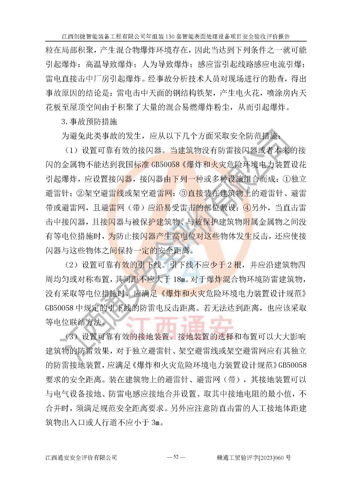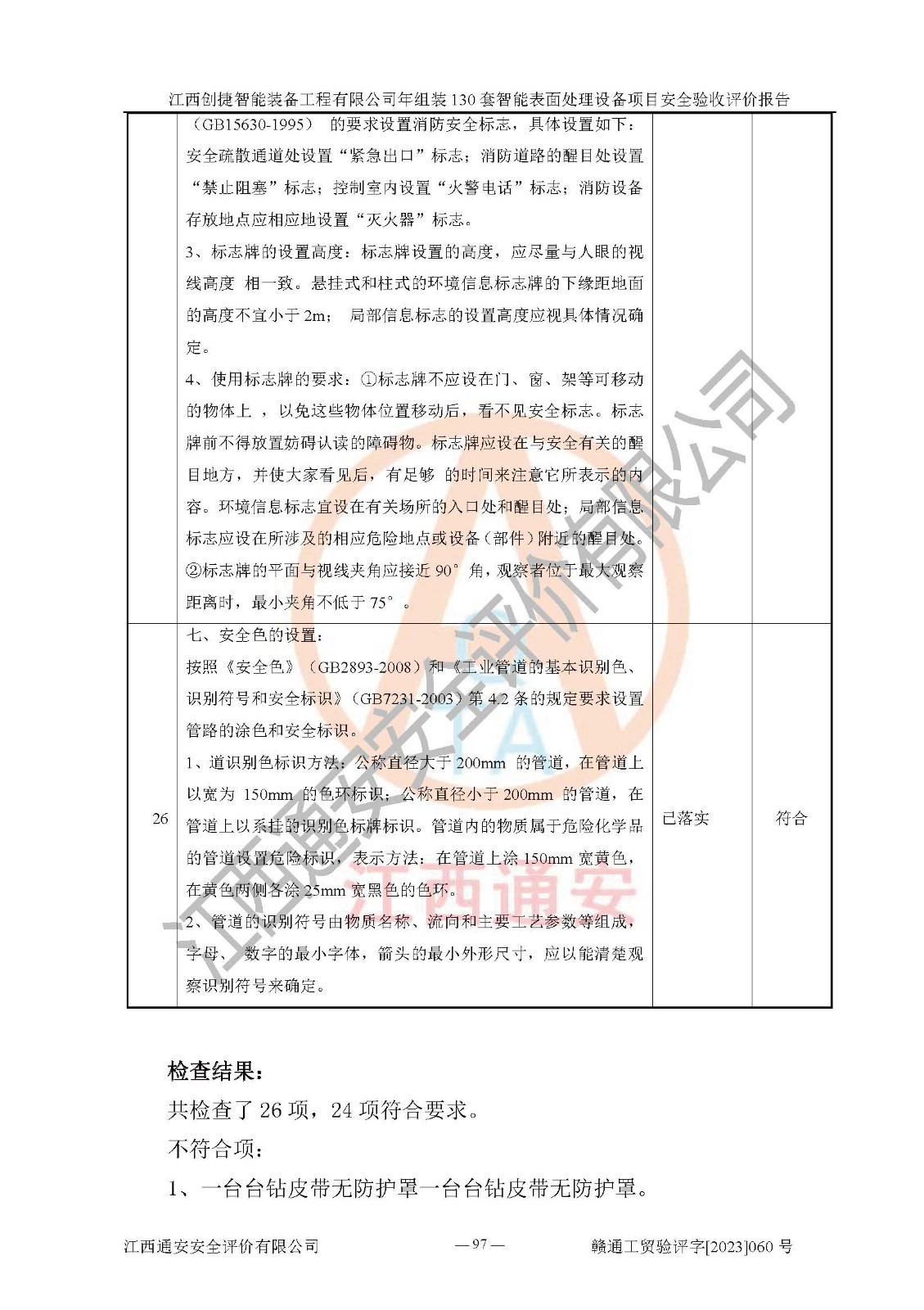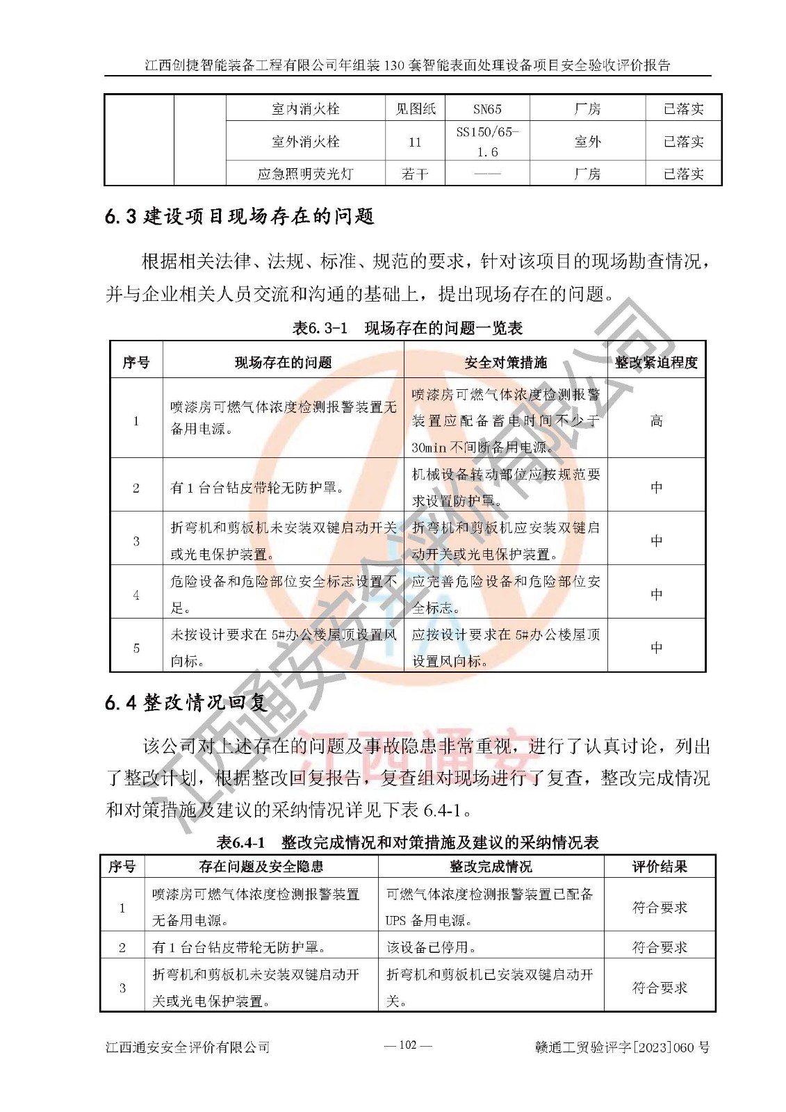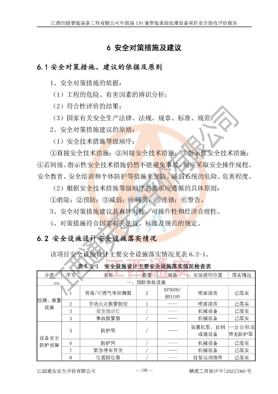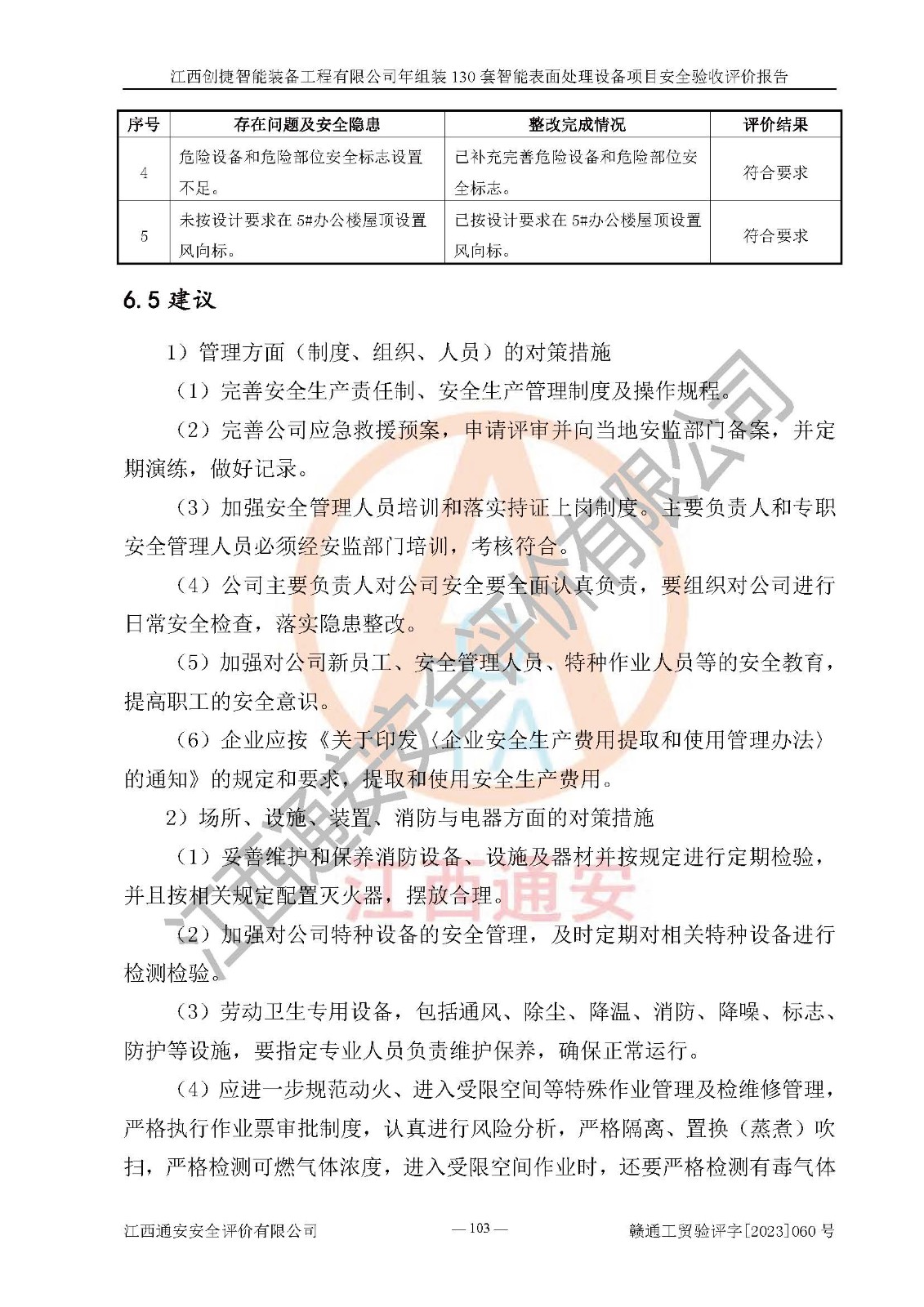 其它 | 根據(jù)《中華人民共和國安全生產(chǎn)法》、《新建項(xiàng)目安全設(shè)施“三同時(shí)”監(jiān)督管理辦法》(原**安全生產(chǎn)監(jiān)督管理總局令第77號修訂)等法律法規(guī)的要求,對江西創(chuàng)捷智能裝備工程有限公司年組裝130套智能表面處理設(shè)備項(xiàng)目安全驗(yàn)收的基本條件進(jìn)行分析,結(jié)果如下: 1)本項(xiàng)目在初步設(shè)計(jì)及建設(shè)過程中基本能貫徹執(zhí)行**、地方及有關(guān)部門的安全生產(chǎn)法律法規(guī)、標(biāo)準(zhǔn)要求,取得了**相關(guān)部門的許可、備案。項(xiàng)目的設(shè)計(jì)、施工、監(jiān)理等單位均有相應(yīng)資質(zhì)。 2)本項(xiàng)目址選符合要求;總平面布置合理,主要建筑的防火間距符合符合《建筑設(shè)計(jì)防火規(guī)范》(GB50016-2014,2018版)、《工業(yè)企業(yè)總平面設(shè)計(jì)規(guī)范》(GB50187-2012)有關(guān)規(guī)范、標(biāo)準(zhǔn)的要求。 3)本項(xiàng)目消防設(shè)施驗(yàn)收文件見建設(shè)工程消防驗(yàn)收備案憑證(2023031400322)。 4)本項(xiàng)目生產(chǎn)工藝成熟、試運(yùn)行正常,試運(yùn)行中過程中工藝和裝置、設(shè)備(設(shè)施)安全、可靠,未發(fā)生安全事故。 5)本項(xiàng)目的特種設(shè)備由有資質(zhì)單位設(shè)計(jì)、制造、安裝,特種設(shè)備經(jīng)宜春市特種設(shè)備檢驗(yàn)中心檢驗(yàn)合格,符合《中華人民共和國特種設(shè)備安全法》、《特種設(shè)備安全監(jiān)察條例》(中華人民共和國***令第549號)的規(guī)定。特種設(shè)備作業(yè)人員、特種作業(yè)人員均持證上崗。 6)公司主要負(fù)責(zé)人及安全管理人員取得了江西省億源企業(yè)咨詢服務(wù)有限公司頒發(fā)的培訓(xùn)證書,特種作業(yè)人員操作證在**期內(nèi),其他從業(yè)人員經(jīng)安全培訓(xùn)符合,取得上崗證。符合要求。 7)公司建立有安全管理制度,制定有各類人員的安全生產(chǎn)責(zé)任制、各項(xiàng)安全管理制度和操作規(guī)程。按照**有關(guān)規(guī)定編制了事故應(yīng)急救援預(yù)案并進(jìn)行了備案,并定期進(jìn)行演練等,符合要求。 8)本項(xiàng)目作業(yè)條件危險(xiǎn)性分析結(jié)果:在選定的8個(gè)單元的危險(xiǎn)程度均為“稍有危險(xiǎn),可以接受”或“一般危險(xiǎn),需要注意”,作業(yè)條件相對安全。 評價(jià)結(jié)論: 江西創(chuàng)捷智能裝備工程有限公司年組裝130套智能表面處理設(shè)備項(xiàng)目的安全設(shè)施及安全管理符合**及有關(guān)部門關(guān)于安全生產(chǎn)法律、法規(guī)、標(biāo)準(zhǔn)的要求,該項(xiàng)目試生產(chǎn)以來,工藝設(shè)備、安全設(shè)施及企業(yè)安全管理機(jī)制等運(yùn)行正常,安全設(shè)施、措施達(dá)到設(shè)計(jì)要求和預(yù)期結(jié)果,可以滿足建設(shè)項(xiàng)目安全生產(chǎn)的要求,安全生產(chǎn)管理**,具備竣工驗(yàn)收條件。 | ||||