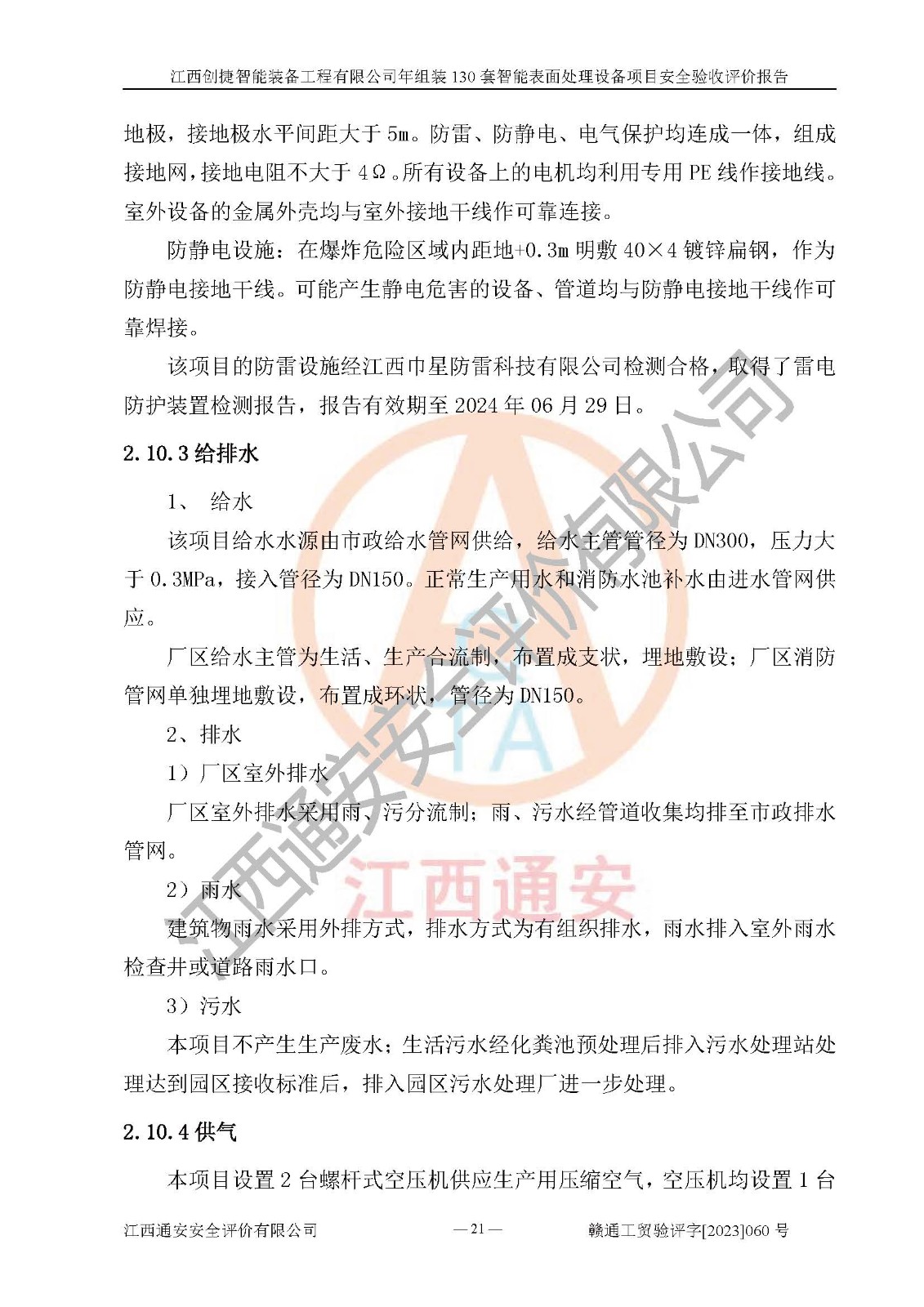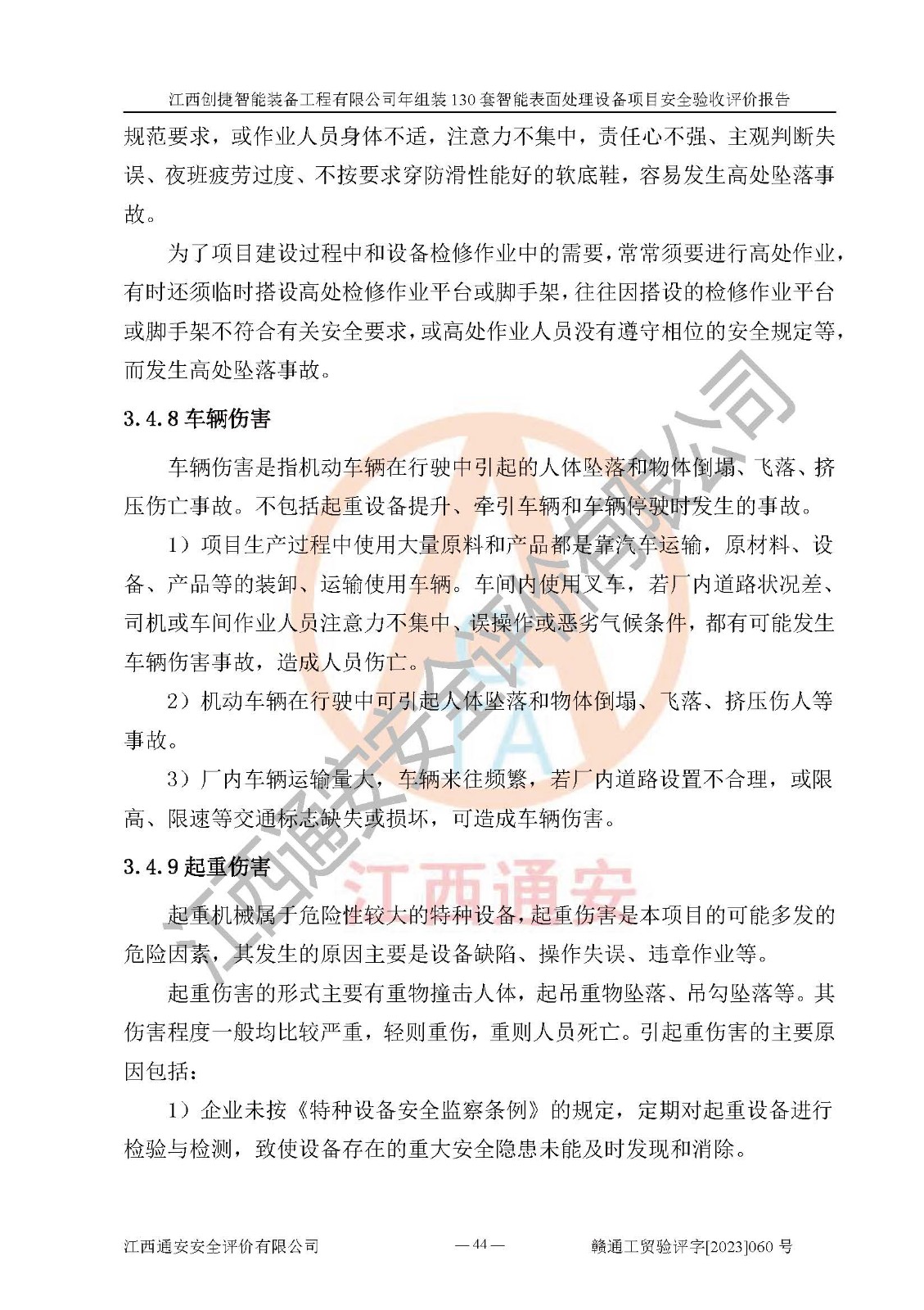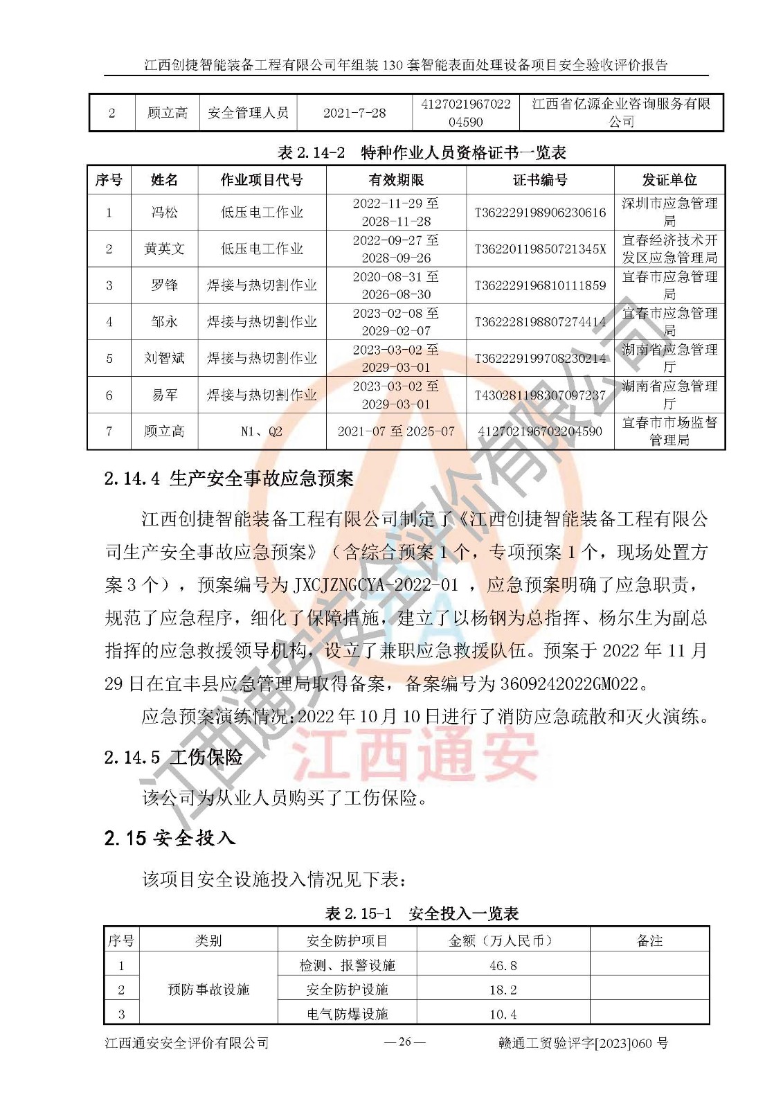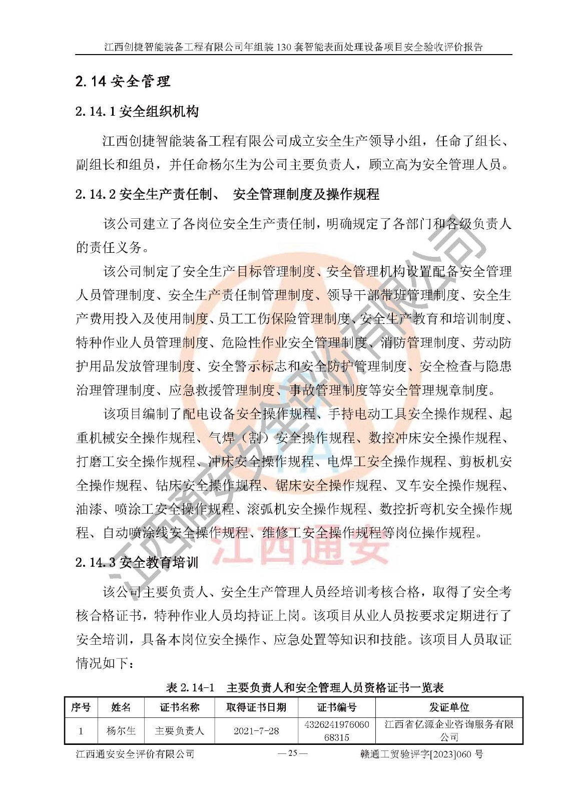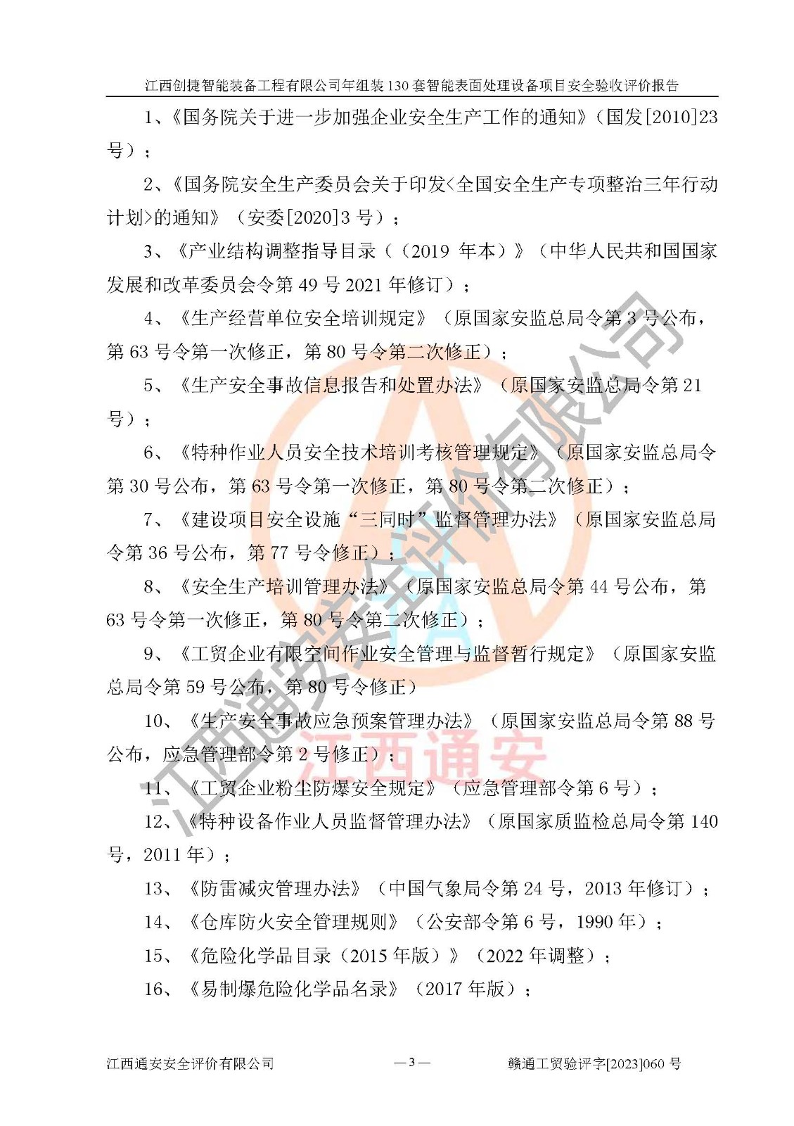 其它 | 根據(jù)《中華人民共和國安全生產(chǎn)法》、《新建項(xiàng)目安全設(shè)施“三同時(shí)”監(jiān)督管理辦法》(原**安全生產(chǎn)監(jiān)督管理總局令第77號修訂)等法律法規(guī)的要求,對江西創(chuàng)捷智能裝備工程有限公司年組裝130套智能表面處理設(shè)備項(xiàng)目安全驗(yàn)收的基本條件進(jìn)行分析,結(jié)果如下: 1)本項(xiàng)目在初步設(shè)計(jì)及建設(shè)過程中基本能貫徹執(zhí)行**、地方及有關(guān)部門的安全生產(chǎn)法律法規(guī)、標(biāo)準(zhǔn)要求,取得了**相關(guān)部門的許可、備案。項(xiàng)目的設(shè)計(jì)、施工、監(jiān)理等單位均有相應(yīng)資質(zhì)。 2)本項(xiàng)目址選符合要求;總平面布置合理,主要建筑的防火間距符合符合《建筑設(shè)計(jì)防火規(guī)范》(GB50016-2014,2018版)、《工業(yè)企業(yè)總平面設(shè)計(jì)規(guī)范》(GB50187-2012)有關(guān)規(guī)范、標(biāo)準(zhǔn)的要求。 3)本項(xiàng)目消防設(shè)施驗(yàn)收文件見建設(shè)工程消防驗(yàn)收備案憑證(2023031400322)。 4)本項(xiàng)目生產(chǎn)工藝成熟、試運(yùn)行正常,試運(yùn)行中過程中工藝和裝置、設(shè)備(設(shè)施)安全、可靠,未發(fā)生安全事故。 5)本項(xiàng)目的特種設(shè)備由有資質(zhì)單位設(shè)計(jì)、制造、安裝,特種設(shè)備經(jīng)宜春市特種設(shè)備檢驗(yàn)中心檢驗(yàn)合格,符合《中華人民共和國特種設(shè)備安全法》、《特種設(shè)備安全監(jiān)察條例》(中華人民共和國***令第549號)的規(guī)定。特種設(shè)備作業(yè)人員、特種作業(yè)人員均持證上崗。 6)公司主要負(fù)責(zé)人及安全管理人員取得了江西省億源企業(yè)咨詢服務(wù)有限公司頒發(fā)的培訓(xùn)證書,特種作業(yè)人員操作證在**期內(nèi),其他從業(yè)人員經(jīng)安全培訓(xùn)符合,取得上崗證。符合要求。 7)公司建立有安全管理制度,制定有各類人員的安全生產(chǎn)責(zé)任制、各項(xiàng)安全管理制度和操作規(guī)程。按照**有關(guān)規(guī)定編制了事故應(yīng)急救援預(yù)案并進(jìn)行了備案,并定期進(jìn)行演練等,符合要求。 8)本項(xiàng)目作業(yè)條件危險(xiǎn)性分析結(jié)果:在選定的8個(gè)單元的危險(xiǎn)程度均為“稍有危險(xiǎn),可以接受”或“一般危險(xiǎn),需要注意”,作業(yè)條件相對安全。 評價(jià)結(jié)論: 江西創(chuàng)捷智能裝備工程有限公司年組裝130套智能表面處理設(shè)備項(xiàng)目的安全設(shè)施及安全管理符合**及有關(guān)部門關(guān)于安全生產(chǎn)法律、法規(guī)、標(biāo)準(zhǔn)的要求,該項(xiàng)目試生產(chǎn)以來,工藝設(shè)備、安全設(shè)施及企業(yè)安全管理機(jī)制等運(yùn)行正常,安全設(shè)施、措施達(dá)到設(shè)計(jì)要求和預(yù)期結(jié)果,可以滿足建設(shè)項(xiàng)目安全生產(chǎn)的要求,安全生產(chǎn)管理**,具備竣工驗(yàn)收條件。 | ||||