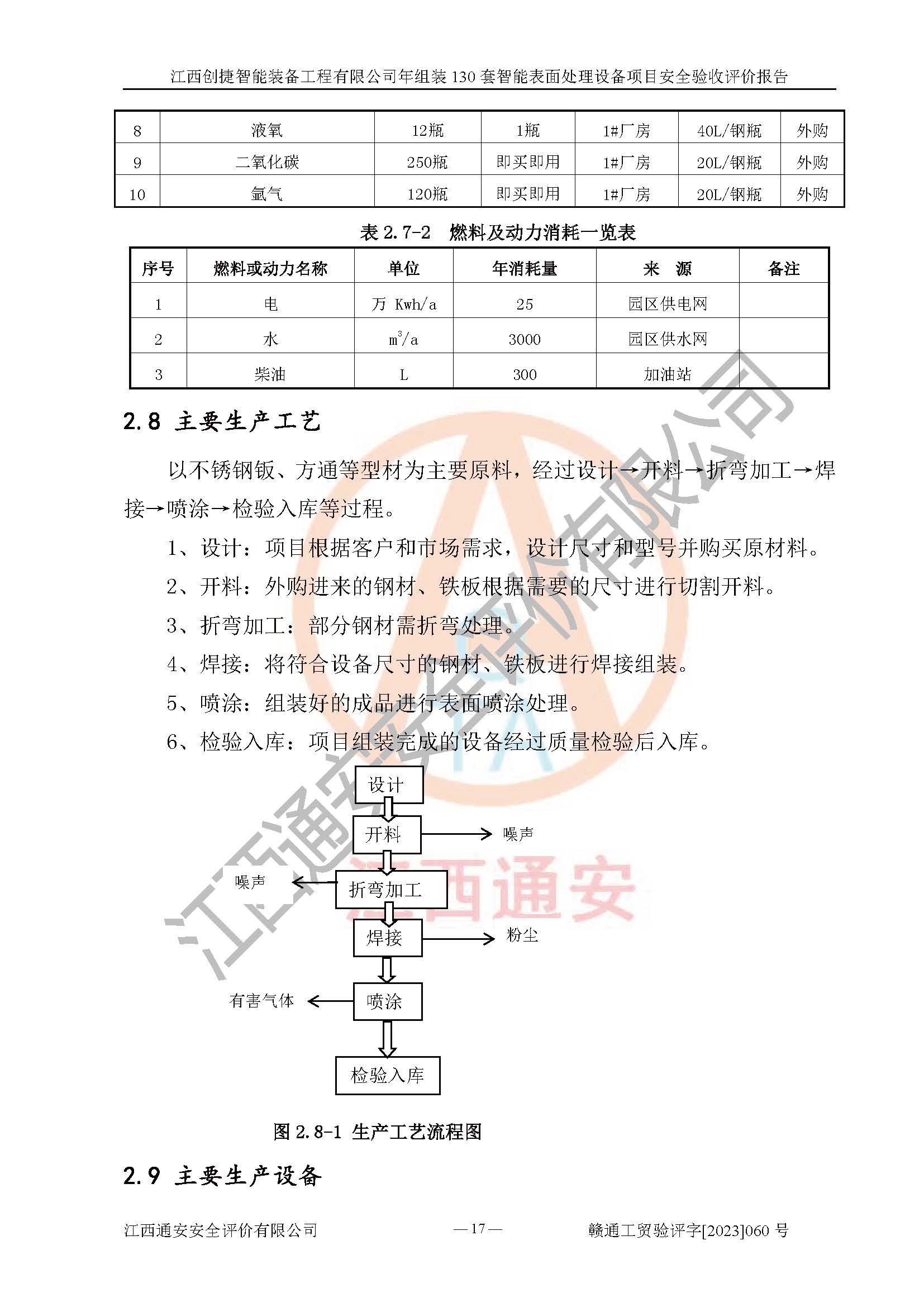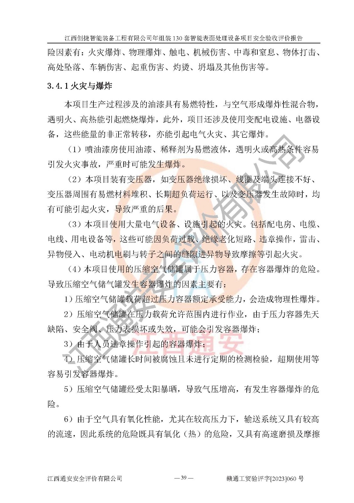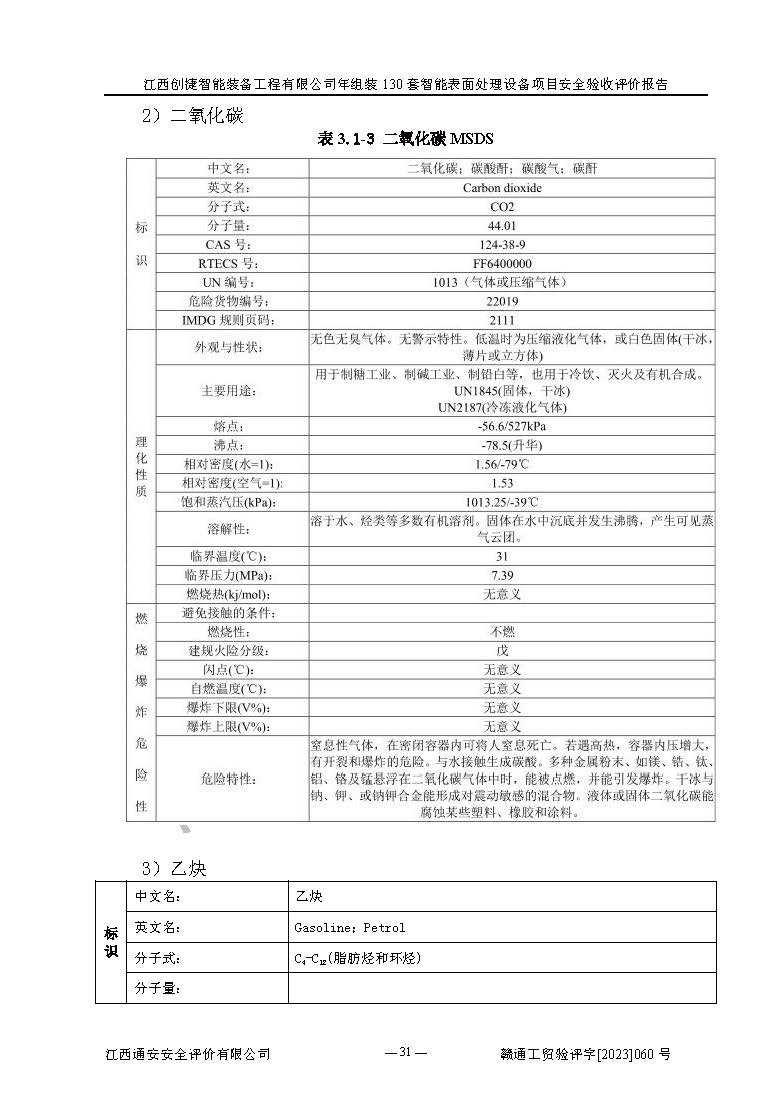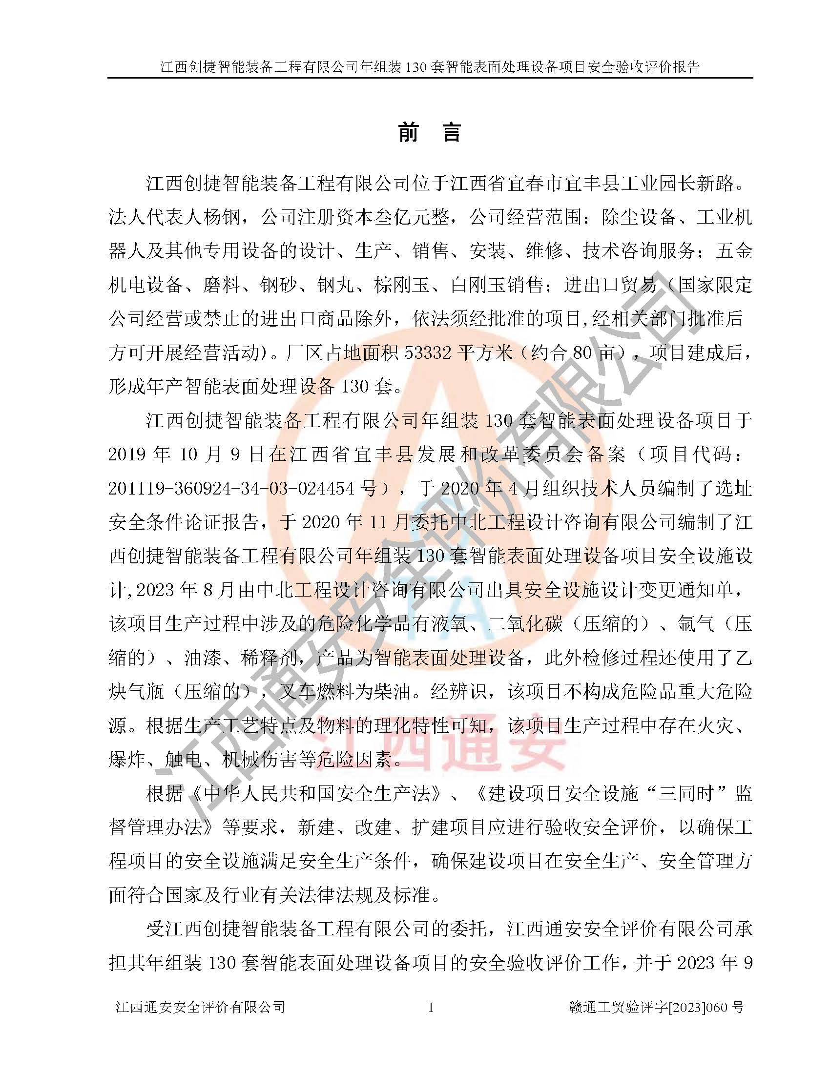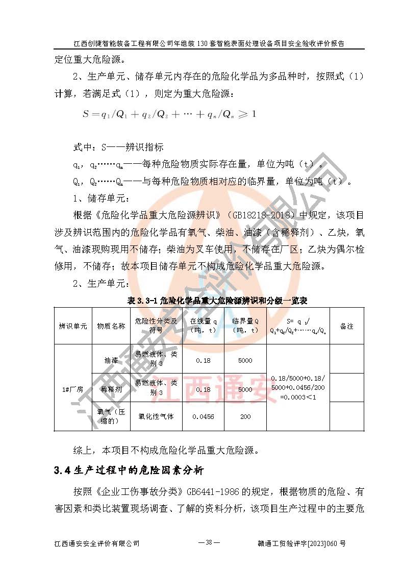 項(xiàng)目簡介 | 江西創(chuàng)捷智能裝備工程有限公司位于江西省宜春市宜豐縣工業(yè)園長新路。法人**人楊鋼,公司注冊資本叁億元整,公司經(jīng)營范圍:除塵設(shè)備、工業(yè)機(jī)器人及其他**設(shè)備的設(shè)計(jì)、生產(chǎn)、銷售、安裝、維修、技術(shù)咨詢服務(wù);五金機(jī)電設(shè)備、磨料、鋼砂、鋼丸、棕剛玉、白剛玉銷售;進(jìn)出口貿(mào)易(**限定公司經(jīng)營或禁止的進(jìn)出口商品除外,依法須經(jīng)批準(zhǔn)的項(xiàng)目,經(jīng)相關(guān)部門批準(zhǔn)后方可開展經(jīng)營活動)。廠區(qū)占地面積53332***(約合80畝),項(xiàng)目建成后,形成年產(chǎn)智能表面處理設(shè)備130套。 江西創(chuàng)捷智能裝備工程有限公司年組裝130套智能表面處理設(shè)備項(xiàng)目于2019年10月9日在江西省宜豐縣發(fā)展和改革委員會備案(項(xiàng)目代碼:201119-360924-34-03-024454號),于2020年4月組織技術(shù)人員編制了選址安全條件論證報(bào)告,于2020年11月委托中北工程設(shè)計(jì)咨詢有限公司編制了江西創(chuàng)捷智能裝備工程有限公司年組裝130套智能表面處理設(shè)備項(xiàng)目安全設(shè)施設(shè)計(jì),2023年8月由中北工程設(shè)計(jì)咨詢有限公司出具安全設(shè)施設(shè)計(jì)變更通知單,該項(xiàng)目生產(chǎn)過程中涉及的危險(xiǎn)化學(xué)品有液氧、二氧化碳(壓縮的)、氬氣(壓縮的)、固化劑、稀釋劑、聚氨酯漆,產(chǎn)品為智能表面處理設(shè)備。經(jīng)辨識,該項(xiàng)目不構(gòu)成危險(xiǎn)品重大危險(xiǎn)源。根據(jù)生產(chǎn)工藝特點(diǎn)及物料的理化特性可知,該項(xiàng)目生產(chǎn)過程中存在火災(zāi)、爆炸、觸電、機(jī)械傷害等危險(xiǎn)因素。 | ||||