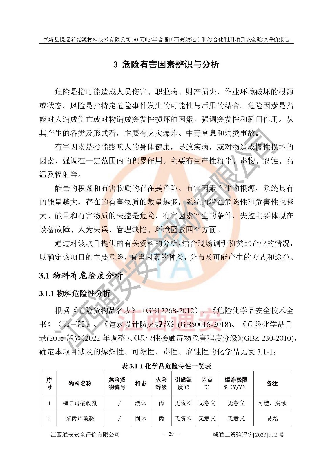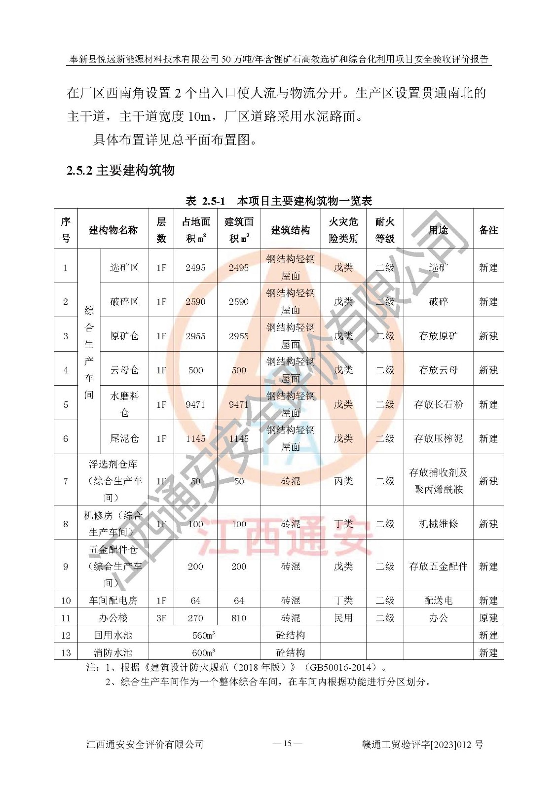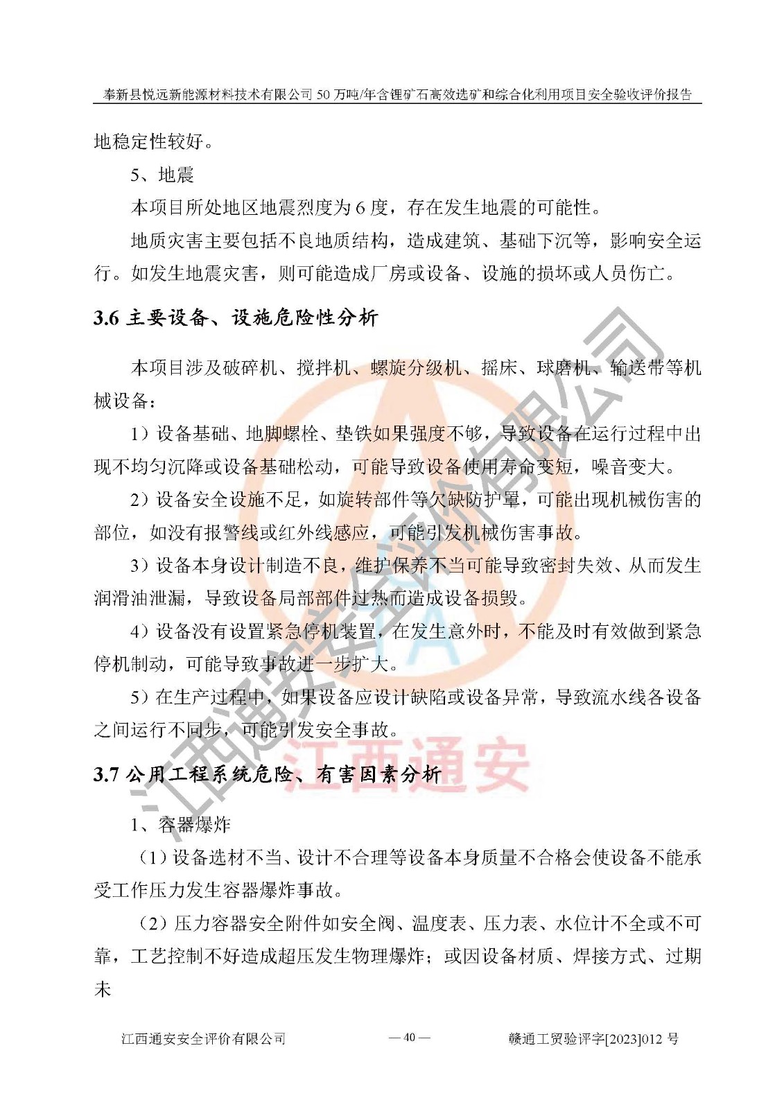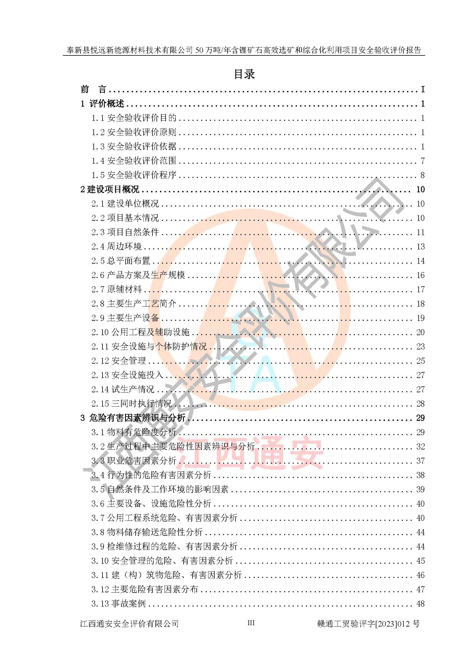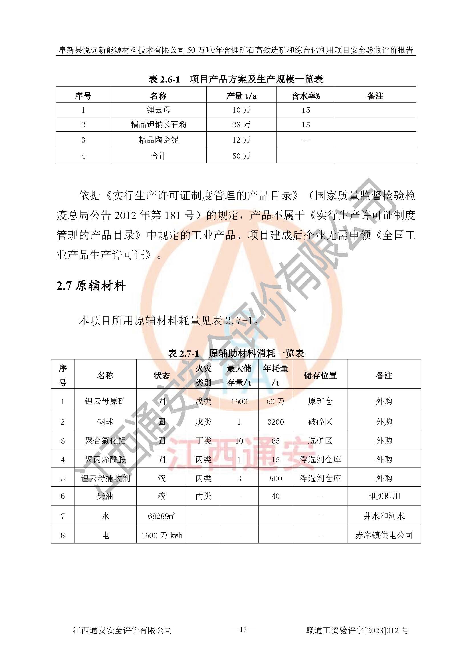項(xiàng)目簡(jiǎn)介 | 奉新縣悅遠(yuǎn)新能源材料技術(shù)有限公司成立于2017年12月08日,統(tǒng)一社會(huì)信用代碼:91360921MA7M04EXX5,注冊(cè)地址江西省宜春市奉新縣赤岸鎮(zhèn)城下村白塔組,注冊(cè)資金伍佰萬(wàn)元整,經(jīng)營(yíng)范圍:一般項(xiàng)目:新材料技術(shù)研發(fā),選礦,礦物洗選加工,非金屬礦及制品銷售,非金屬礦物制品制造,金屬礦石銷售(除許可業(yè)務(wù)外,可自主依法經(jīng)營(yíng)法律法規(guī)非禁止或限制的項(xiàng)目)。本項(xiàng)目為50萬(wàn)噸/年含鋰礦石**選礦和綜合化利用項(xiàng)目,總投資12000萬(wàn)元。 本項(xiàng)目于2022年04月03日在奉新縣發(fā)展和改革委員會(huì)備案(項(xiàng)目統(tǒng)一代碼為:2204-360921-04-01-990773)(奉發(fā)改發(fā)[2022]112號(hào)),2022年6月組織技術(shù)人員編制了《奉新縣悅遠(yuǎn)新能源材料技術(shù)有限公司年選 40萬(wàn)噸含鋰長(zhǎng)石礦項(xiàng)目選址安全條件論證報(bào)告》,2022年11月委托中裕工程集團(tuán)有限公司編制了《奉新縣悅遠(yuǎn)新能源材料技術(shù)有限公司50萬(wàn)噸/年含鋰礦石**選礦和綜合化利用項(xiàng)目安全設(shè)施設(shè)計(jì)》并于2022年12月18日通過了專家審查。本項(xiàng)目外購(gòu)含鋰長(zhǎng)石礦,通過破碎、球磨、磁選、浮選、濃密、脫水等工藝后*終產(chǎn)出鋰云母、精品鉀鈉長(zhǎng)石粉及精品陶瓷泥。其中在生產(chǎn)工藝中主要涉及的化學(xué)品為聚丙烯酸酰胺、鋰云母捕收劑,檢維修工序使用到的氧氣、乙炔以及裝載車使用到的燃料柴油。經(jīng)辨識(shí),該項(xiàng)目不構(gòu)成危險(xiǎn)品重大危險(xiǎn)源。根據(jù)生產(chǎn)工藝特點(diǎn)及物料的理化特性可知,該項(xiàng)目生產(chǎn)過程中存在火災(zāi)、爆炸、機(jī)械傷害、灼燙、觸電、**傷害、高處墜落、坍塌、物體打擊、淹溺、中毒窒息、其他傷害等危險(xiǎn)有害因素。 | ||||