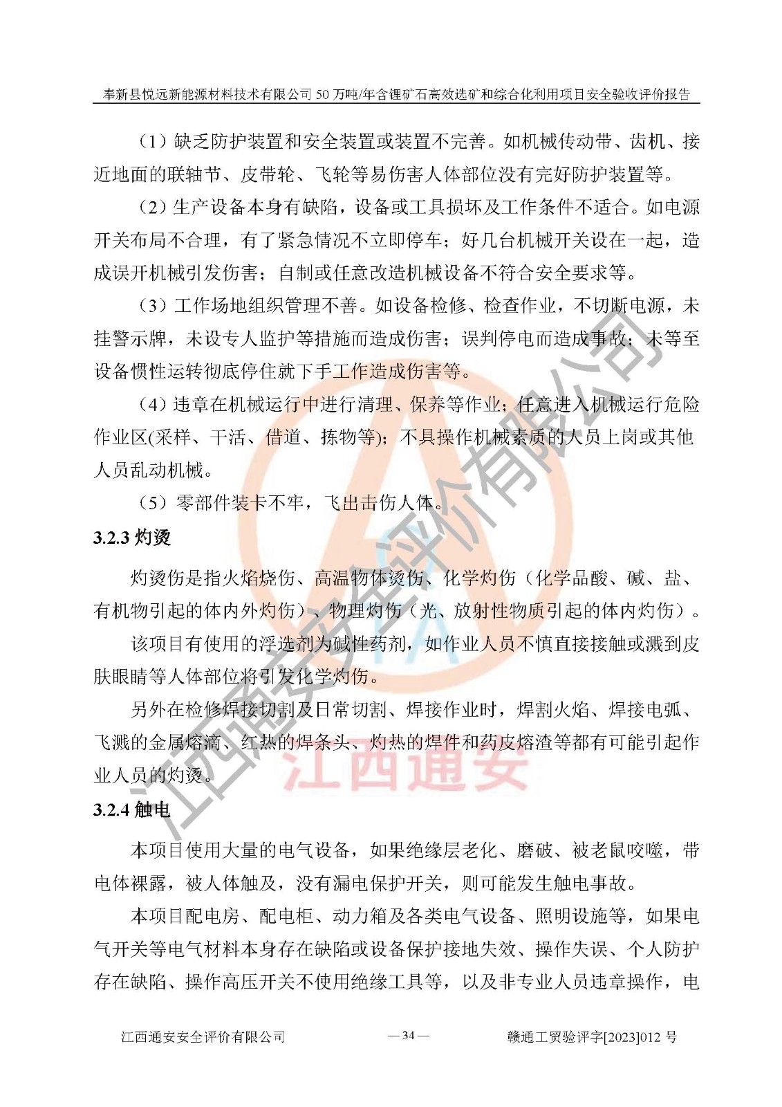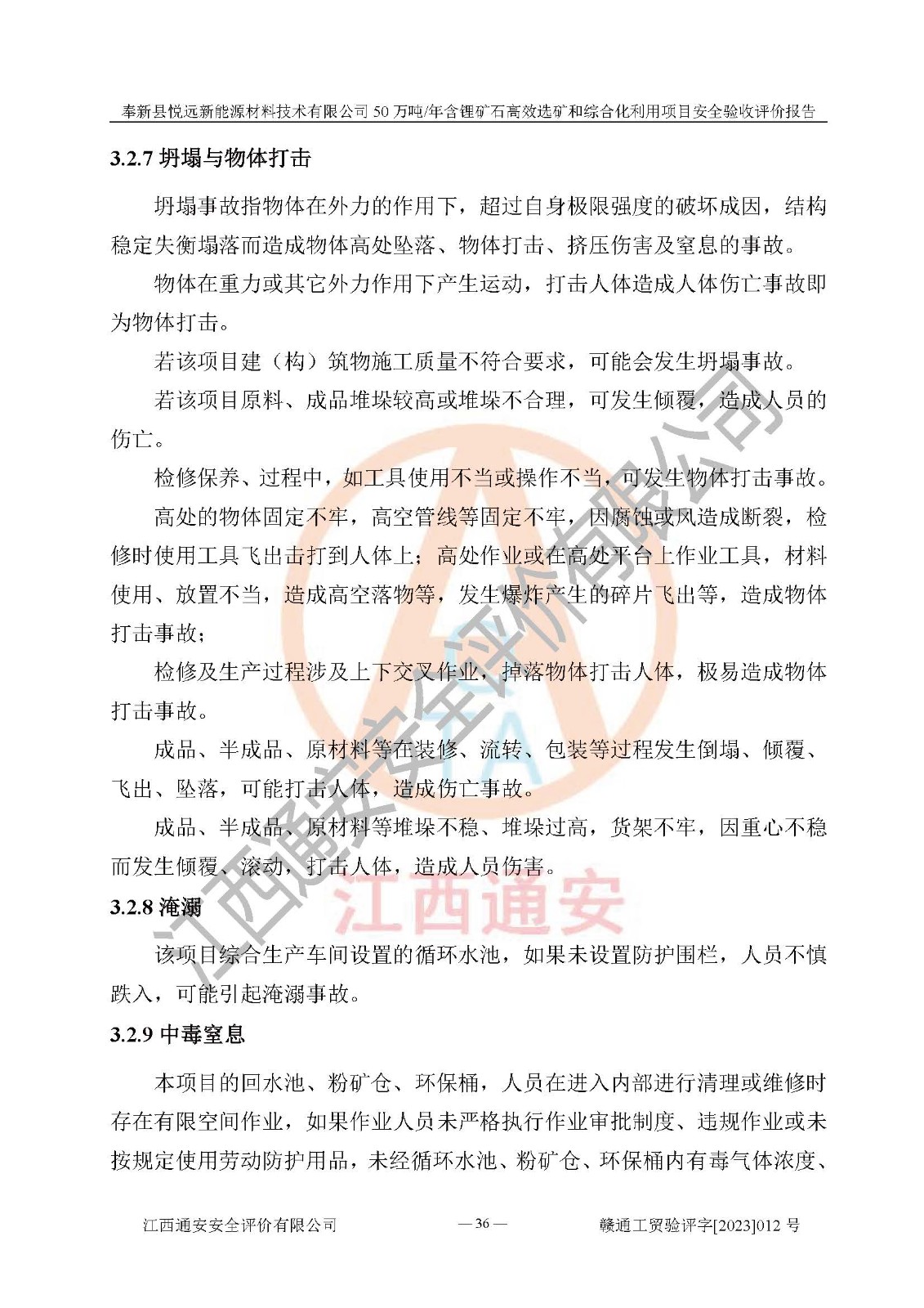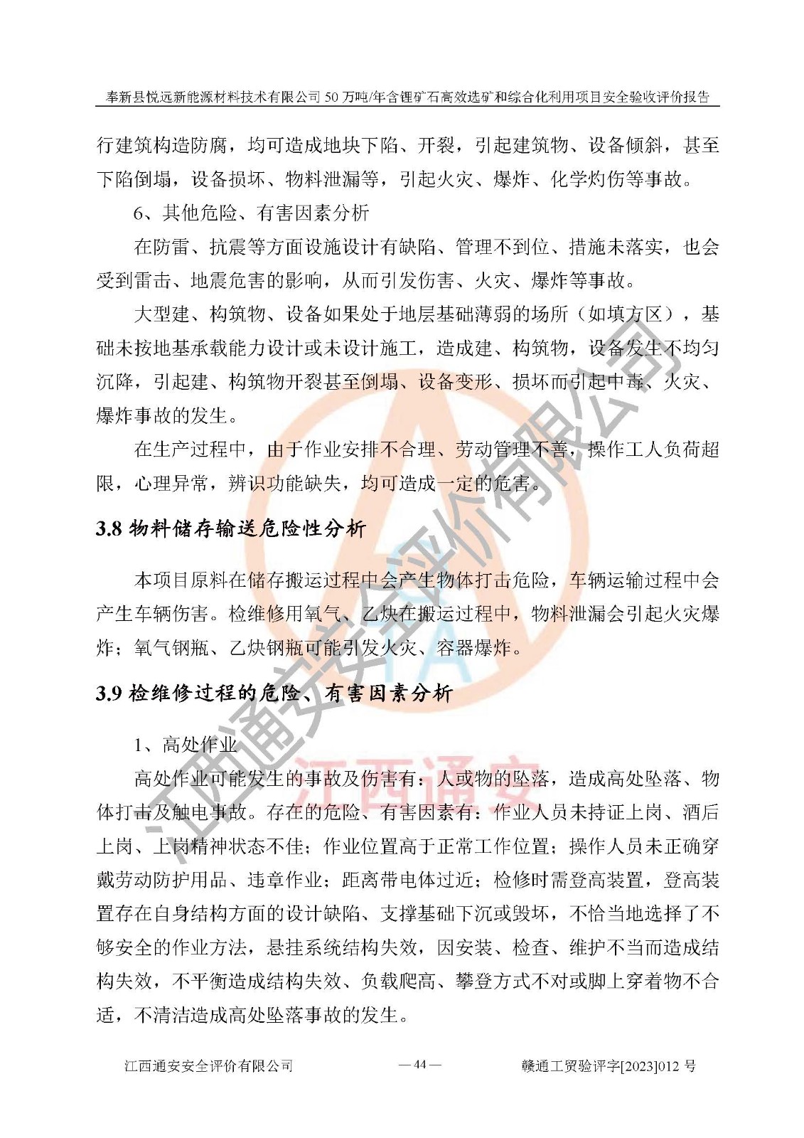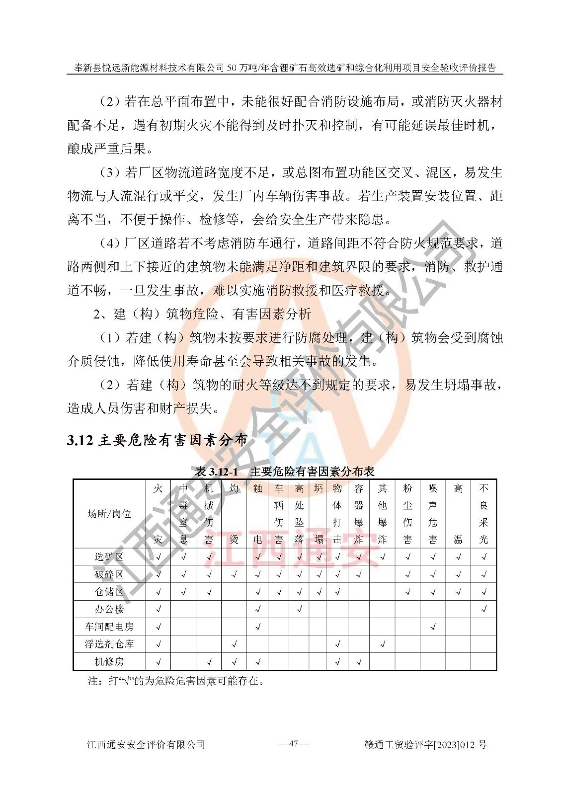 項(xiàng)目簡(jiǎn)介 | 奉新縣悅遠(yuǎn)新能源材料技術(shù)有限公司成立于2017年12月08日,統(tǒng)一社會(huì)信用代碼:91360921MA7M04EXX5,注冊(cè)地址江西省宜春市奉新縣赤岸鎮(zhèn)城下村白塔組,注冊(cè)資金伍佰萬(wàn)元整,經(jīng)營(yíng)范圍:一般項(xiàng)目:新材料技術(shù)研發(fā),選礦,礦物洗選加工,非金屬礦及制品銷售,非金屬礦物制品制造,金屬礦石銷售(除許可業(yè)務(wù)外,可自主依法經(jīng)營(yíng)法律法規(guī)非禁止或限制的項(xiàng)目)。本項(xiàng)目為50萬(wàn)噸/年含鋰礦石**選礦和綜合化利用項(xiàng)目,總投資12000萬(wàn)元。 本項(xiàng)目于2022年04月03日在奉新縣發(fā)展和改革委員會(huì)備案(項(xiàng)目統(tǒng)一代碼為:2204-360921-04-01-990773)(奉發(fā)改發(fā)[2022]112號(hào)),2022年6月組織技術(shù)人員編制了《奉新縣悅遠(yuǎn)新能源材料技術(shù)有限公司年選 40萬(wàn)噸含鋰長(zhǎng)石礦項(xiàng)目選址安全條件論證報(bào)告》,2022年11月委托中裕工程集團(tuán)有限公司編制了《奉新縣悅遠(yuǎn)新能源材料技術(shù)有限公司50萬(wàn)噸/年含鋰礦石**選礦和綜合化利用項(xiàng)目安全設(shè)施設(shè)計(jì)》并于2022年12月18日通過了專家審查。本項(xiàng)目外購(gòu)含鋰長(zhǎng)石礦,通過破碎、球磨、磁選、浮選、濃密、脫水等工藝后*終產(chǎn)出鋰云母、精品鉀鈉長(zhǎng)石粉及精品陶瓷泥。其中在生產(chǎn)工藝中主要涉及的化學(xué)品為聚丙烯酸酰胺、鋰云母捕收劑,檢維修工序使用到的氧氣、乙炔以及裝載車使用到的燃料柴油。經(jīng)辨識(shí),該項(xiàng)目不構(gòu)成危險(xiǎn)品重大危險(xiǎn)源。根據(jù)生產(chǎn)工藝特點(diǎn)及物料的理化特性可知,該項(xiàng)目生產(chǎn)過程中存在火災(zāi)、爆炸、機(jī)械傷害、灼燙、觸電、**傷害、高處墜落、坍塌、物體打擊、淹溺、中毒窒息、其他傷害等危險(xiǎn)有害因素。 | ||||