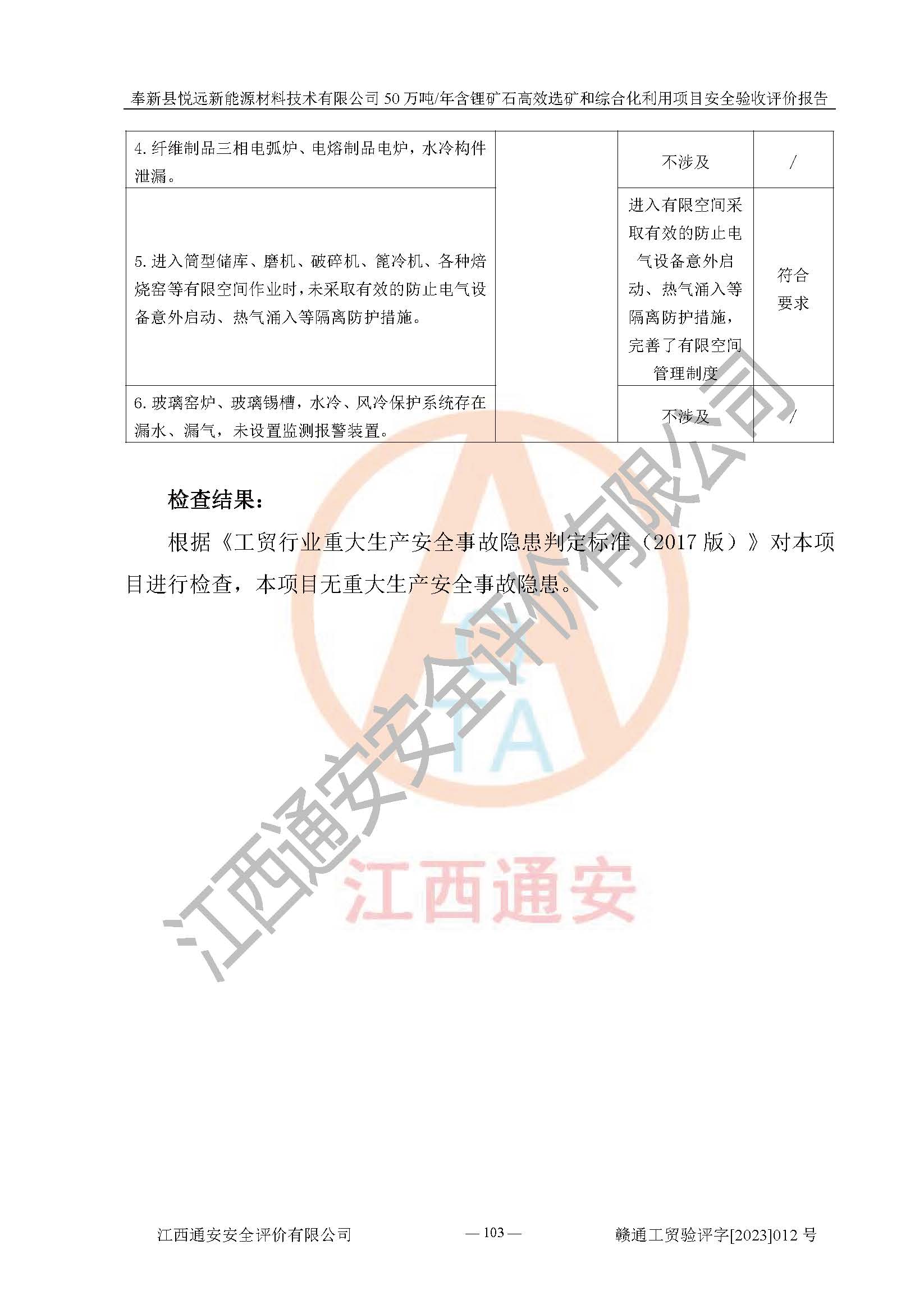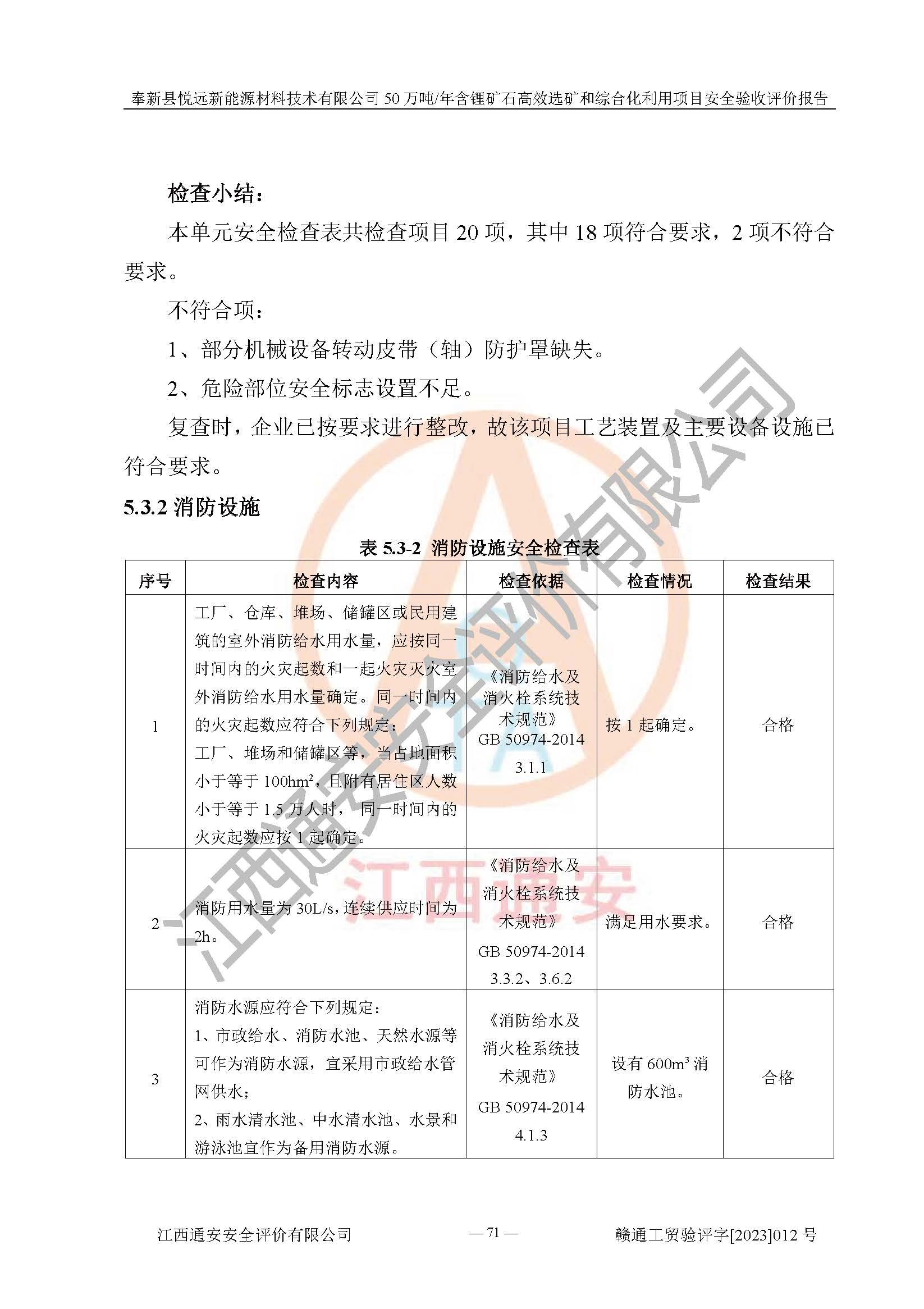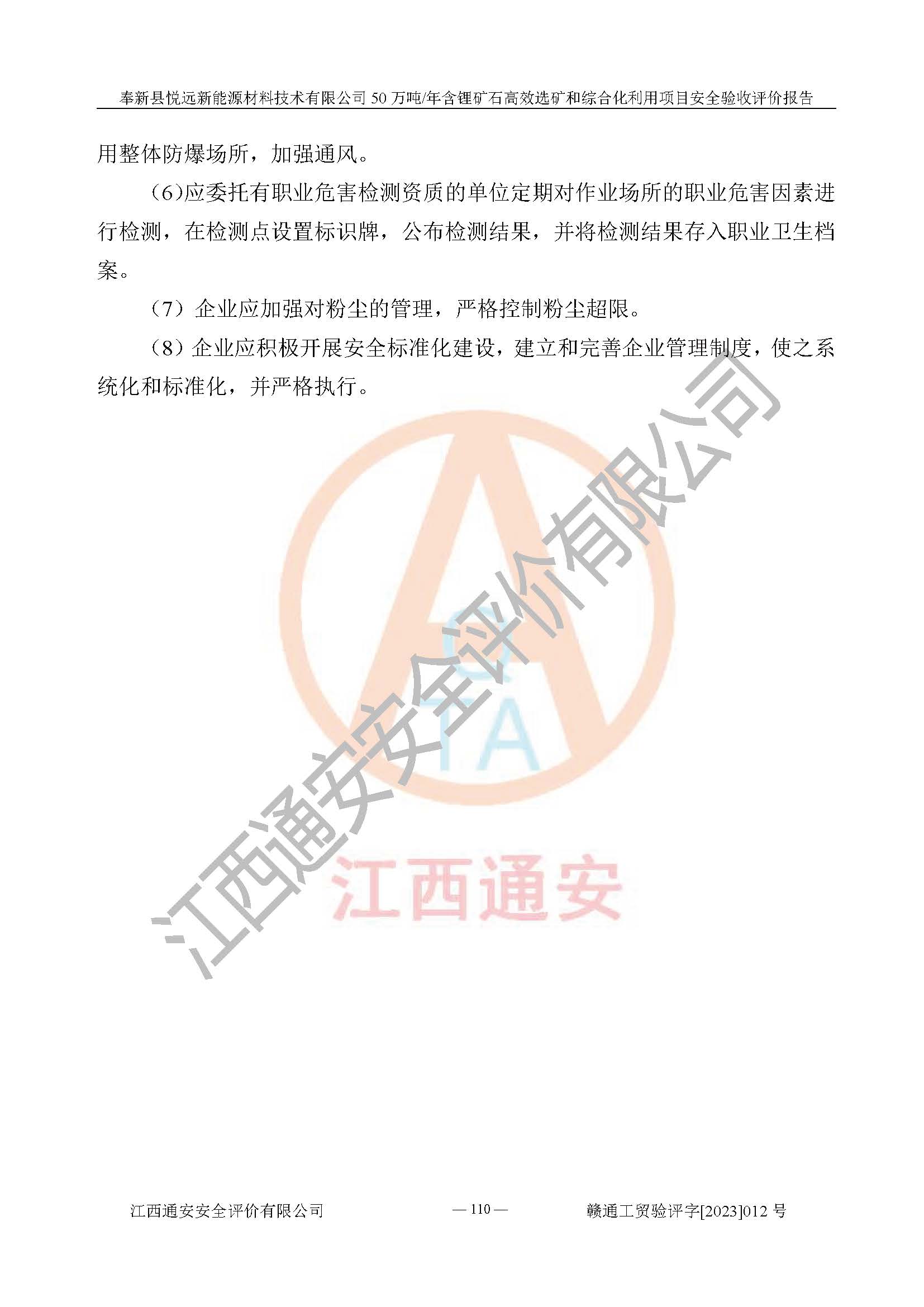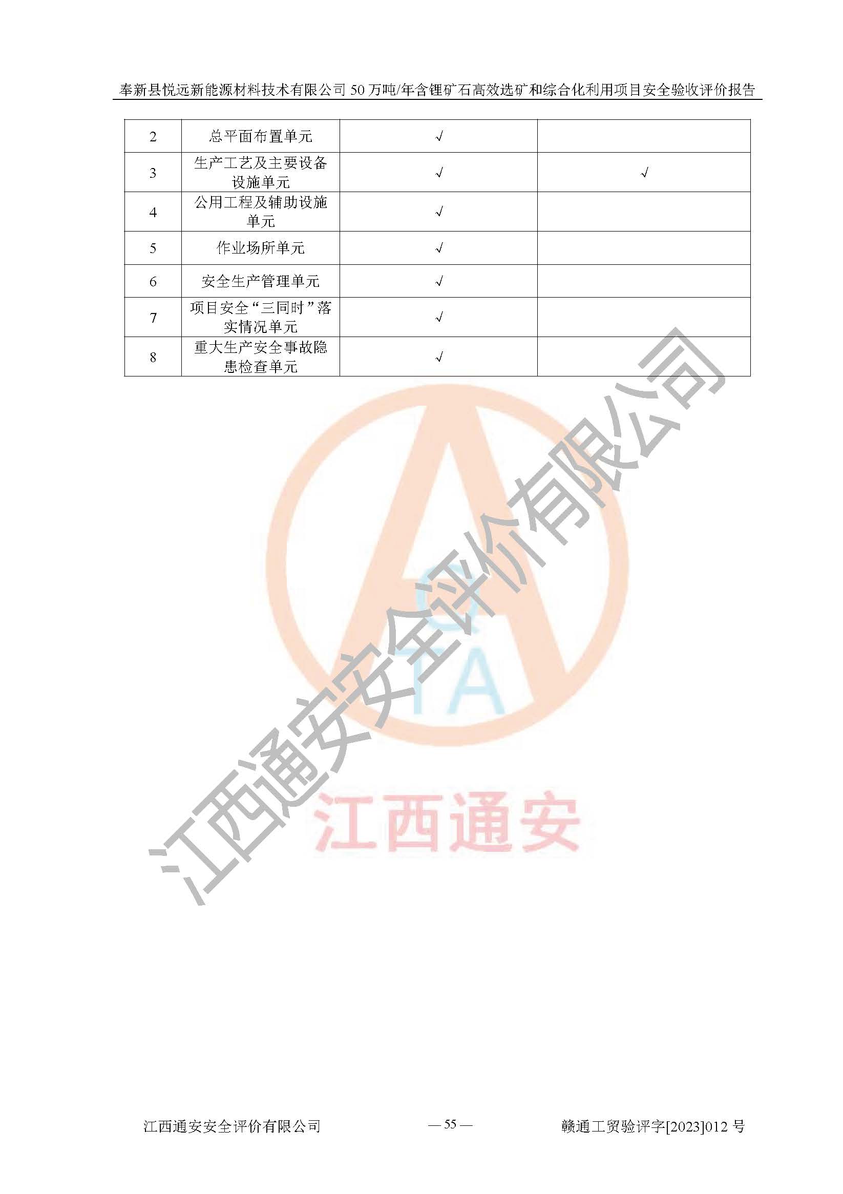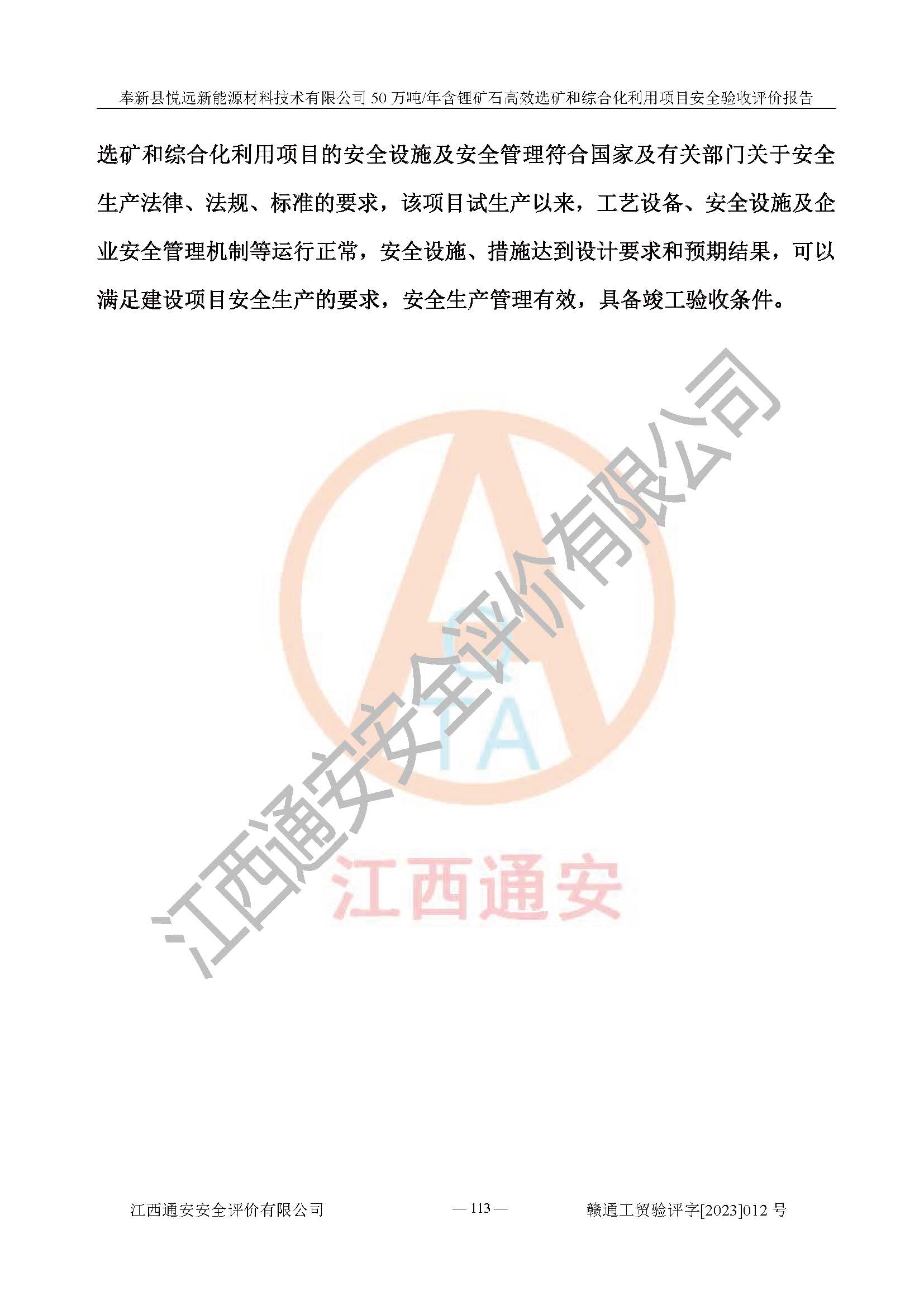 其它 | 根據(jù)《中華人民共和國(guó)安全生產(chǎn)法》、《新建項(xiàng)目安全設(shè)施“三同時(shí)”監(jiān)督管理辦法》(原**安全生產(chǎn)監(jiān)督管理總局令第77號(hào)修訂)等法律法規(guī)的要求,對(duì)奉新縣悅遠(yuǎn)新能源材料技術(shù)有限公司50萬(wàn)噸/年含鋰礦石**選礦和綜合化利用項(xiàng)目安全驗(yàn)收的基本條件進(jìn)行分析,結(jié)果如下: 1)本項(xiàng)目在初步設(shè)計(jì)及建設(shè)過程中基本能貫徹執(zhí)行**、地方及有關(guān)部門的安全生產(chǎn)法律法規(guī)、標(biāo)準(zhǔn)要求,取得了**相關(guān)部門的許可、備案。項(xiàng)目的設(shè)計(jì)、施工、監(jiān)理等單位均有相應(yīng)資質(zhì)。 2)本項(xiàng)目址選符合要求;總平面布置合理,主要建筑的防火間距符合符合《建筑設(shè)計(jì)防火規(guī)范(2018版)》(GB50016-2014)、《工業(yè)企業(yè)總平面設(shè)計(jì)規(guī)范》(GB50187-2012)有關(guān)規(guī)范、標(biāo)準(zhǔn)的要求。 3)本項(xiàng)目生產(chǎn)工藝成熟、試運(yùn)行正常,試運(yùn)行中過程中工藝和裝置、設(shè)備(設(shè)施)安全、可靠,未發(fā)生安全事故。 4)本項(xiàng)目的特種設(shè)備由有資質(zhì)單位設(shè)計(jì)、制造、安裝,未涉及監(jiān)管特種設(shè)備,符合《中華人民共和國(guó)特種設(shè)備安全法》、《特種設(shè)備安全監(jiān)察條例》(中華人民共和國(guó)***令第549號(hào))的規(guī)定。特種設(shè)備作業(yè)人員、特種作業(yè)人員均持證上崗。 5)公司主要負(fù)責(zé)人及安全管理人員已報(bào)名培訓(xùn),特種作業(yè)人員操作證在**期內(nèi),其他從業(yè)人員經(jīng)安全培訓(xùn)符合,取得上崗證。基本符合要求。 6)公司建立有安全管理制度,制定有各類人員的安全生產(chǎn)責(zé)任制、各項(xiàng)安全管理制度和操作規(guī)程。按照**有關(guān)規(guī)定編制了事故應(yīng)急救援預(yù)案并進(jìn)行了備案,并定期進(jìn)行演練等,符合要求。 7)本項(xiàng)目作業(yè)條件危險(xiǎn)性分析結(jié)果:在選定的單元的危險(xiǎn)程度均為“可能危險(xiǎn),需要注意”或“稍有危險(xiǎn),可以接受”,作業(yè)條件相對(duì)安全。 評(píng)價(jià)結(jié)論: 奉新縣悅遠(yuǎn)新能源材料技術(shù)有限公司50萬(wàn)噸/年含鋰礦石**選礦和綜合化利用項(xiàng)目的安全設(shè)施及安全管理符合**及有關(guān)部門關(guān)于安全生產(chǎn)法律、法規(guī)、標(biāo)準(zhǔn)的要求,該項(xiàng)目試生產(chǎn)以來,工藝設(shè)備、安全設(shè)施及企業(yè)安全管理機(jī)制等運(yùn)行正常,安全設(shè)施、措施達(dá)到設(shè)計(jì)要求和預(yù)期結(jié)果,可以滿足建設(shè)項(xiàng)目安全生產(chǎn)的要求,安全生產(chǎn)管理**,具備竣工驗(yàn)收條件。 | ||||