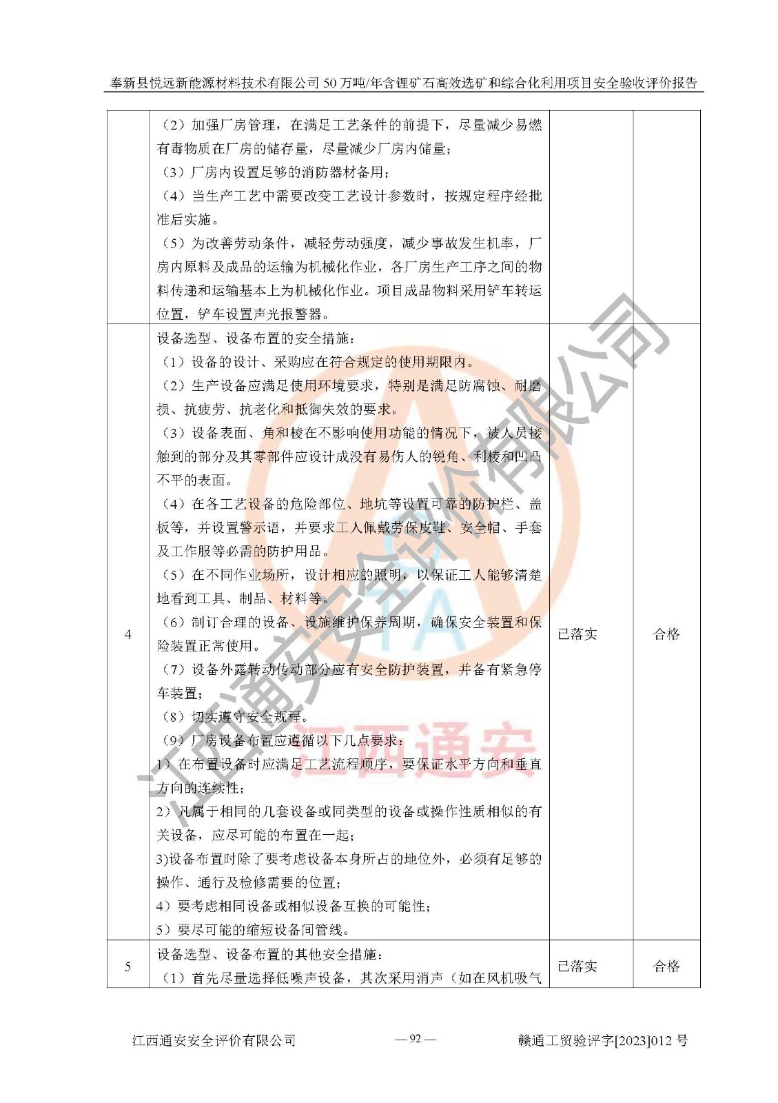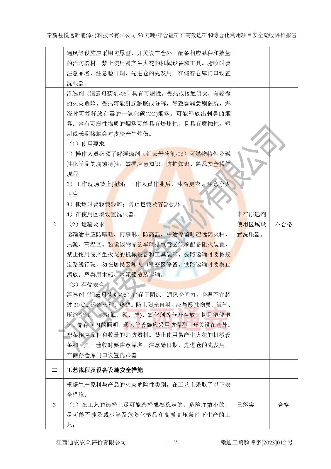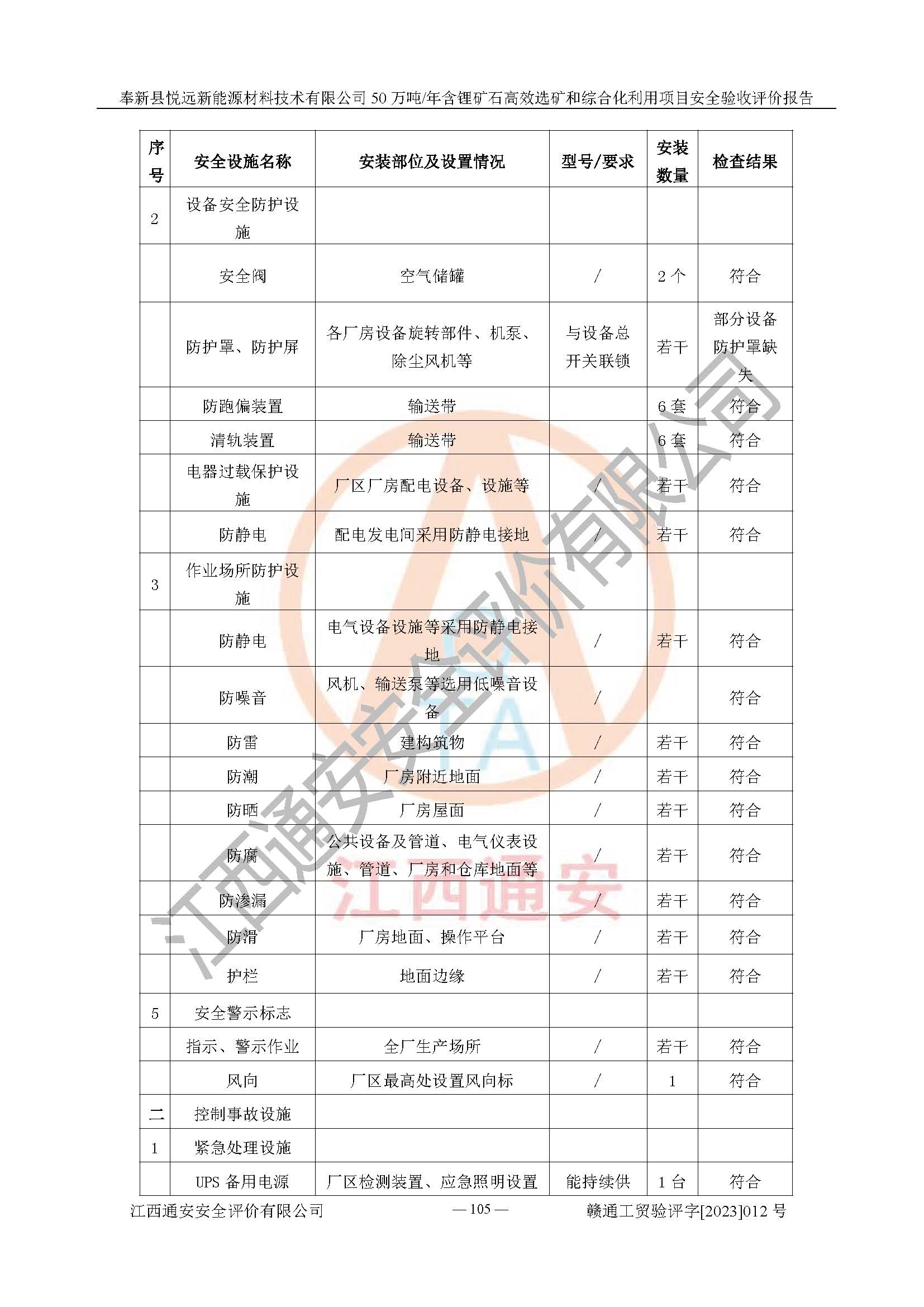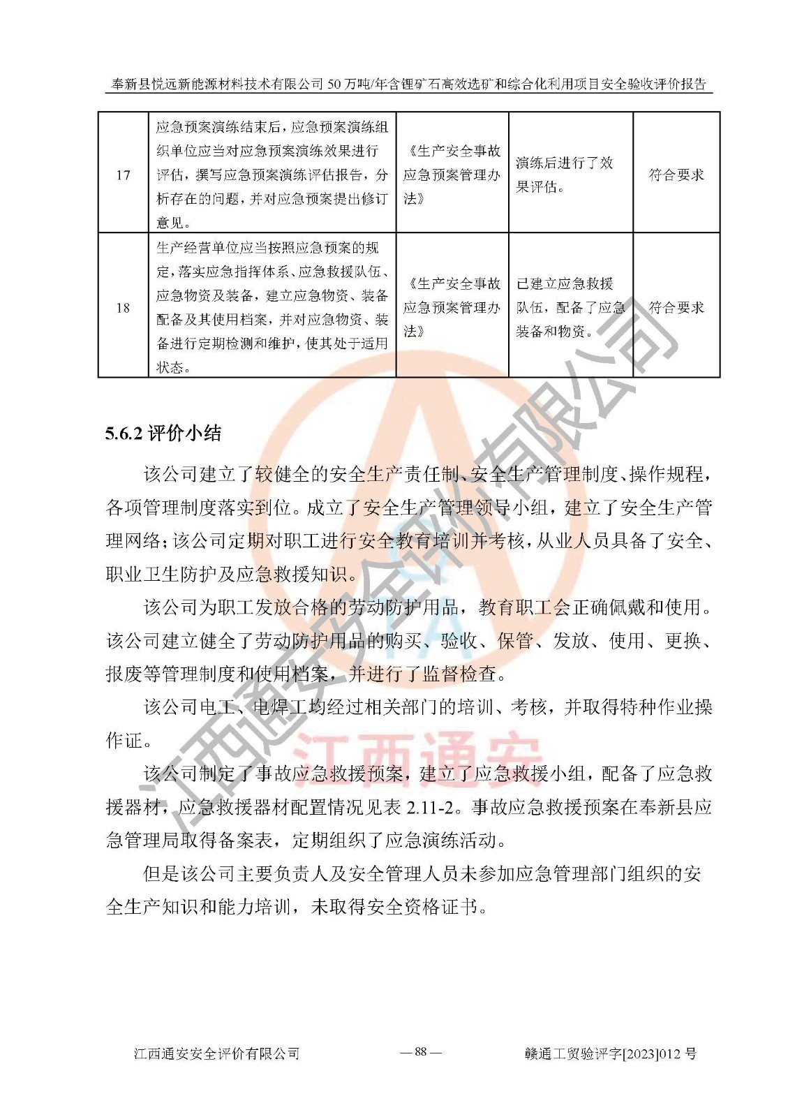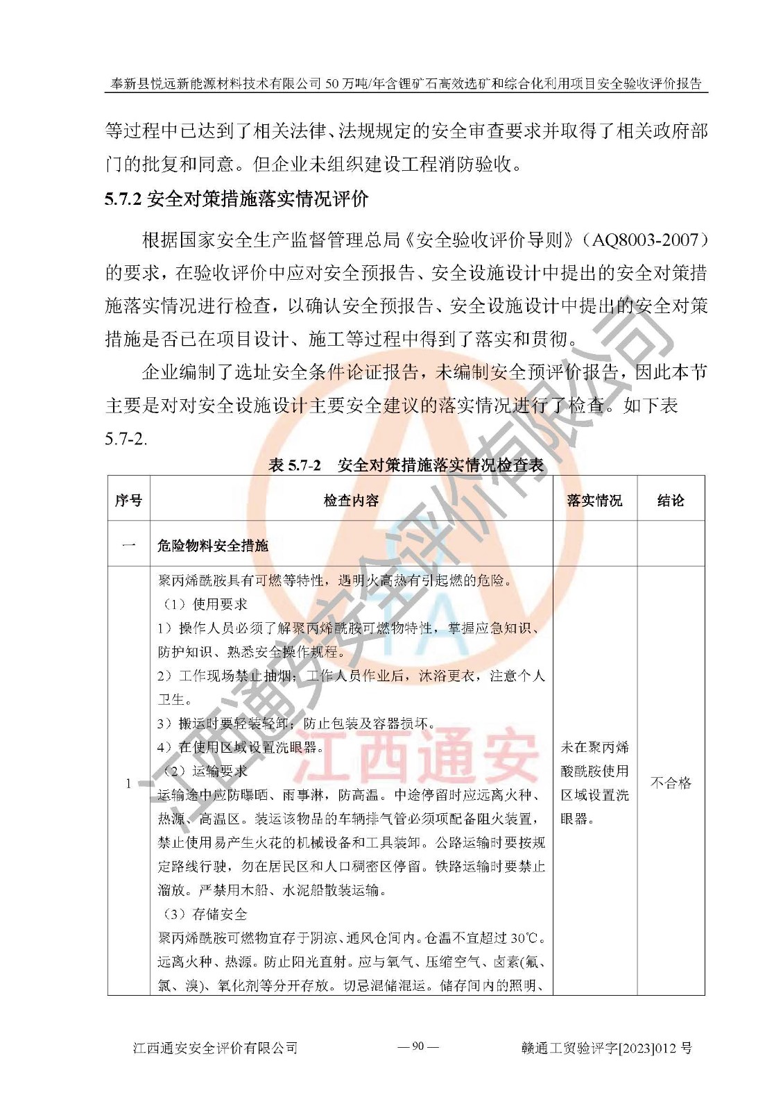 其它 | 根據(jù)《中華人民共和國(guó)安全生產(chǎn)法》、《新建項(xiàng)目安全設(shè)施“三同時(shí)”監(jiān)督管理辦法》(原**安全生產(chǎn)監(jiān)督管理總局令第77號(hào)修訂)等法律法規(guī)的要求,對(duì)奉新縣悅遠(yuǎn)新能源材料技術(shù)有限公司50萬(wàn)噸/年含鋰礦石**選礦和綜合化利用項(xiàng)目安全驗(yàn)收的基本條件進(jìn)行分析,結(jié)果如下: 1)本項(xiàng)目在初步設(shè)計(jì)及建設(shè)過程中基本能貫徹執(zhí)行**、地方及有關(guān)部門的安全生產(chǎn)法律法規(guī)、標(biāo)準(zhǔn)要求,取得了**相關(guān)部門的許可、備案。項(xiàng)目的設(shè)計(jì)、施工、監(jiān)理等單位均有相應(yīng)資質(zhì)。 2)本項(xiàng)目址選符合要求;總平面布置合理,主要建筑的防火間距符合符合《建筑設(shè)計(jì)防火規(guī)范(2018版)》(GB50016-2014)、《工業(yè)企業(yè)總平面設(shè)計(jì)規(guī)范》(GB50187-2012)有關(guān)規(guī)范、標(biāo)準(zhǔn)的要求。 3)本項(xiàng)目生產(chǎn)工藝成熟、試運(yùn)行正常,試運(yùn)行中過程中工藝和裝置、設(shè)備(設(shè)施)安全、可靠,未發(fā)生安全事故。 4)本項(xiàng)目的特種設(shè)備由有資質(zhì)單位設(shè)計(jì)、制造、安裝,未涉及監(jiān)管特種設(shè)備,符合《中華人民共和國(guó)特種設(shè)備安全法》、《特種設(shè)備安全監(jiān)察條例》(中華人民共和國(guó)***令第549號(hào))的規(guī)定。特種設(shè)備作業(yè)人員、特種作業(yè)人員均持證上崗。 5)公司主要負(fù)責(zé)人及安全管理人員已報(bào)名培訓(xùn),特種作業(yè)人員操作證在**期內(nèi),其他從業(yè)人員經(jīng)安全培訓(xùn)符合,取得上崗證。基本符合要求。 6)公司建立有安全管理制度,制定有各類人員的安全生產(chǎn)責(zé)任制、各項(xiàng)安全管理制度和操作規(guī)程。按照**有關(guān)規(guī)定編制了事故應(yīng)急救援預(yù)案并進(jìn)行了備案,并定期進(jìn)行演練等,符合要求。 7)本項(xiàng)目作業(yè)條件危險(xiǎn)性分析結(jié)果:在選定的單元的危險(xiǎn)程度均為“可能危險(xiǎn),需要注意”或“稍有危險(xiǎn),可以接受”,作業(yè)條件相對(duì)安全。 評(píng)價(jià)結(jié)論: 奉新縣悅遠(yuǎn)新能源材料技術(shù)有限公司50萬(wàn)噸/年含鋰礦石**選礦和綜合化利用項(xiàng)目的安全設(shè)施及安全管理符合**及有關(guān)部門關(guān)于安全生產(chǎn)法律、法規(guī)、標(biāo)準(zhǔn)的要求,該項(xiàng)目試生產(chǎn)以來,工藝設(shè)備、安全設(shè)施及企業(yè)安全管理機(jī)制等運(yùn)行正常,安全設(shè)施、措施達(dá)到設(shè)計(jì)要求和預(yù)期結(jié)果,可以滿足建設(shè)項(xiàng)目安全生產(chǎn)的要求,安全生產(chǎn)管理**,具備竣工驗(yàn)收條件。 | ||||