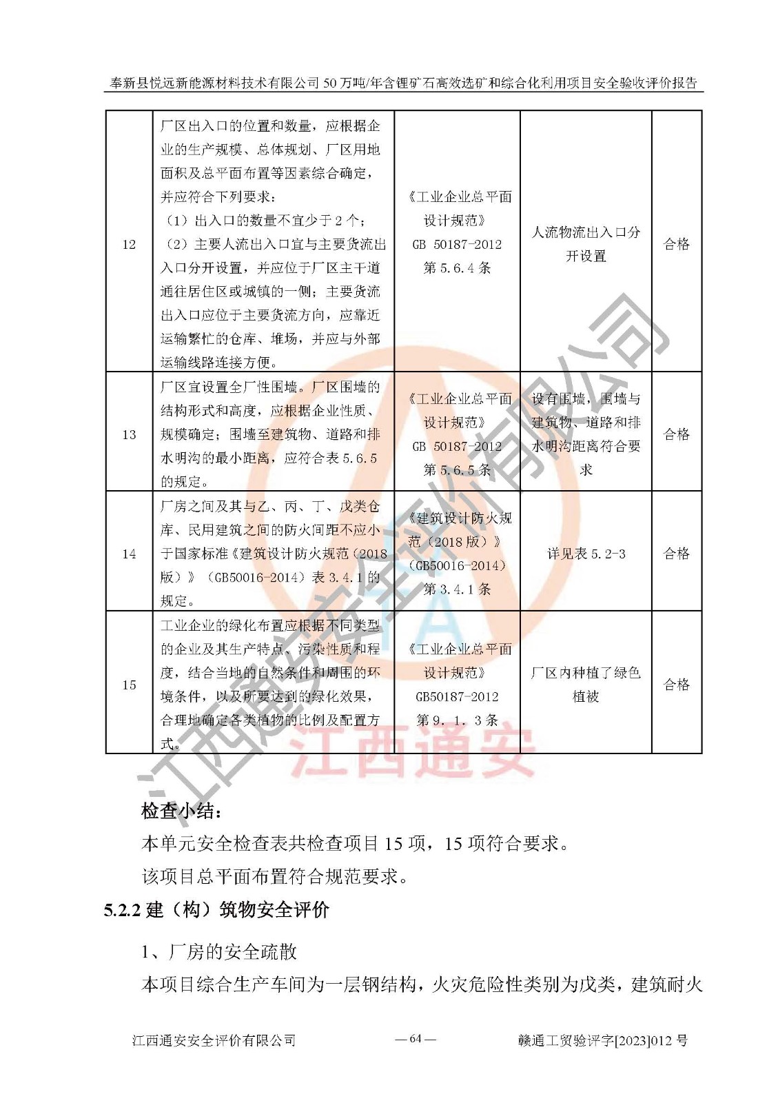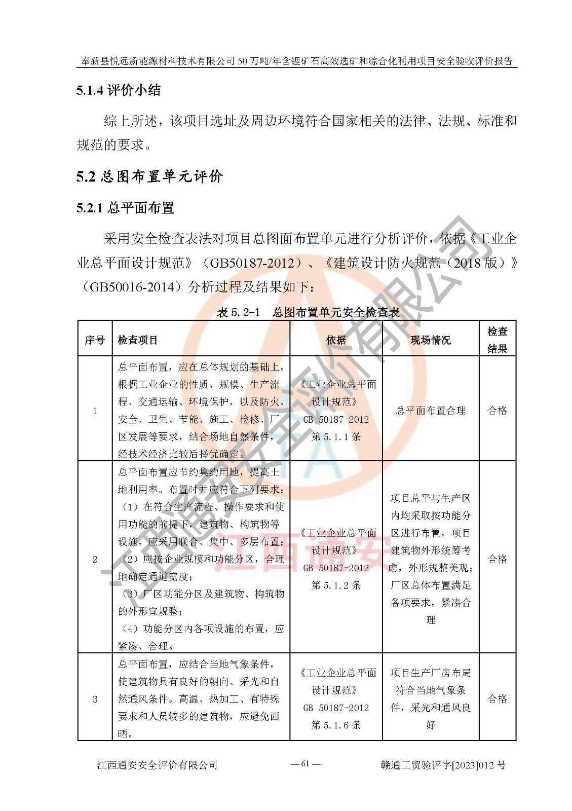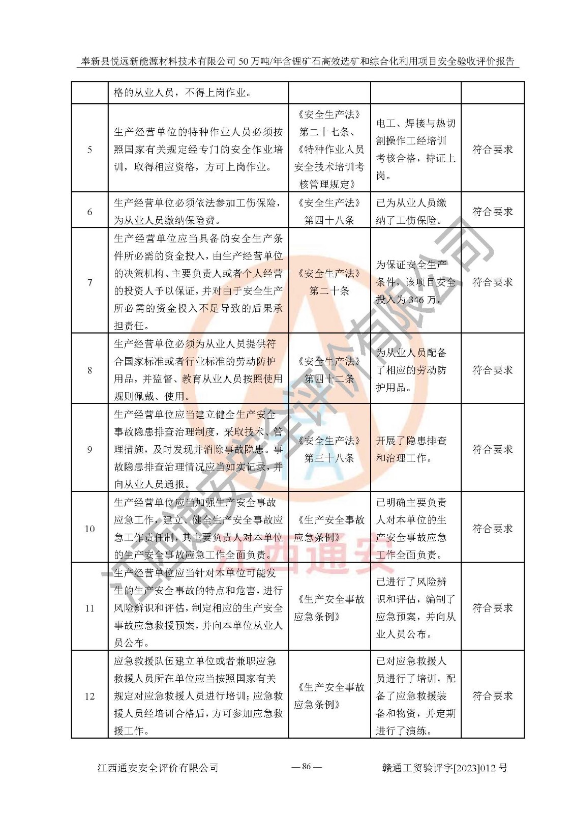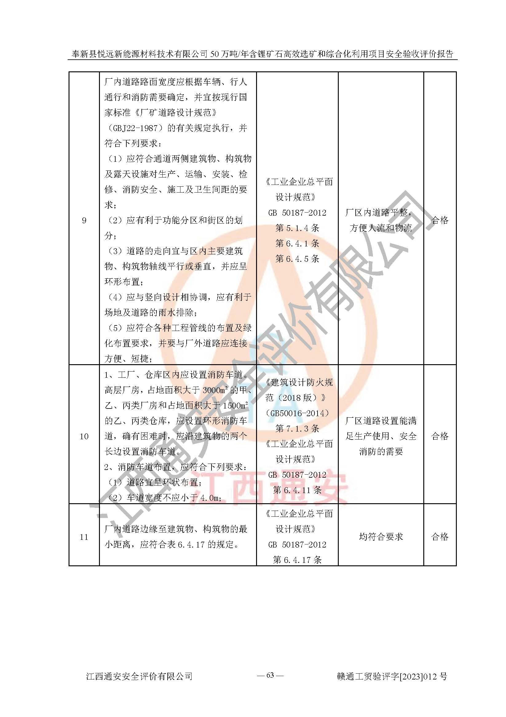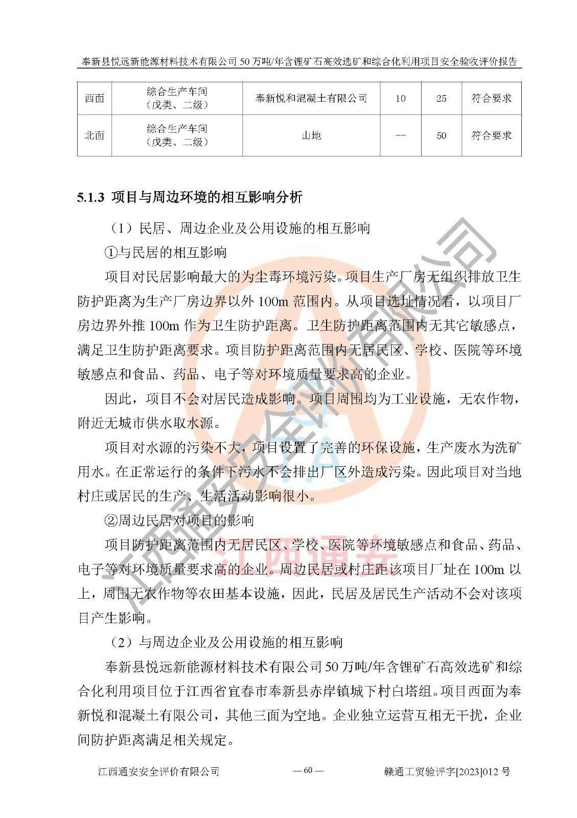 其它 | 根據(jù)《中華人民共和國(guó)安全生產(chǎn)法》、《新建項(xiàng)目安全設(shè)施“三同時(shí)”監(jiān)督管理辦法》(原**安全生產(chǎn)監(jiān)督管理總局令第77號(hào)修訂)等法律法規(guī)的要求,對(duì)奉新縣悅遠(yuǎn)新能源材料技術(shù)有限公司50萬(wàn)噸/年含鋰礦石**選礦和綜合化利用項(xiàng)目安全驗(yàn)收的基本條件進(jìn)行分析,結(jié)果如下: 1)本項(xiàng)目在初步設(shè)計(jì)及建設(shè)過程中基本能貫徹執(zhí)行**、地方及有關(guān)部門的安全生產(chǎn)法律法規(guī)、標(biāo)準(zhǔn)要求,取得了**相關(guān)部門的許可、備案。項(xiàng)目的設(shè)計(jì)、施工、監(jiān)理等單位均有相應(yīng)資質(zhì)。 2)本項(xiàng)目址選符合要求;總平面布置合理,主要建筑的防火間距符合符合《建筑設(shè)計(jì)防火規(guī)范(2018版)》(GB50016-2014)、《工業(yè)企業(yè)總平面設(shè)計(jì)規(guī)范》(GB50187-2012)有關(guān)規(guī)范、標(biāo)準(zhǔn)的要求。 3)本項(xiàng)目生產(chǎn)工藝成熟、試運(yùn)行正常,試運(yùn)行中過程中工藝和裝置、設(shè)備(設(shè)施)安全、可靠,未發(fā)生安全事故。 4)本項(xiàng)目的特種設(shè)備由有資質(zhì)單位設(shè)計(jì)、制造、安裝,未涉及監(jiān)管特種設(shè)備,符合《中華人民共和國(guó)特種設(shè)備安全法》、《特種設(shè)備安全監(jiān)察條例》(中華人民共和國(guó)***令第549號(hào))的規(guī)定。特種設(shè)備作業(yè)人員、特種作業(yè)人員均持證上崗。 5)公司主要負(fù)責(zé)人及安全管理人員已報(bào)名培訓(xùn),特種作業(yè)人員操作證在**期內(nèi),其他從業(yè)人員經(jīng)安全培訓(xùn)符合,取得上崗證。基本符合要求。 6)公司建立有安全管理制度,制定有各類人員的安全生產(chǎn)責(zé)任制、各項(xiàng)安全管理制度和操作規(guī)程。按照**有關(guān)規(guī)定編制了事故應(yīng)急救援預(yù)案并進(jìn)行了備案,并定期進(jìn)行演練等,符合要求。 7)本項(xiàng)目作業(yè)條件危險(xiǎn)性分析結(jié)果:在選定的單元的危險(xiǎn)程度均為“可能危險(xiǎn),需要注意”或“稍有危險(xiǎn),可以接受”,作業(yè)條件相對(duì)安全。 評(píng)價(jià)結(jié)論: 奉新縣悅遠(yuǎn)新能源材料技術(shù)有限公司50萬(wàn)噸/年含鋰礦石**選礦和綜合化利用項(xiàng)目的安全設(shè)施及安全管理符合**及有關(guān)部門關(guān)于安全生產(chǎn)法律、法規(guī)、標(biāo)準(zhǔn)的要求,該項(xiàng)目試生產(chǎn)以來,工藝設(shè)備、安全設(shè)施及企業(yè)安全管理機(jī)制等運(yùn)行正常,安全設(shè)施、措施達(dá)到設(shè)計(jì)要求和預(yù)期結(jié)果,可以滿足建設(shè)項(xiàng)目安全生產(chǎn)的要求,安全生產(chǎn)管理**,具備竣工驗(yàn)收條件。 | ||||