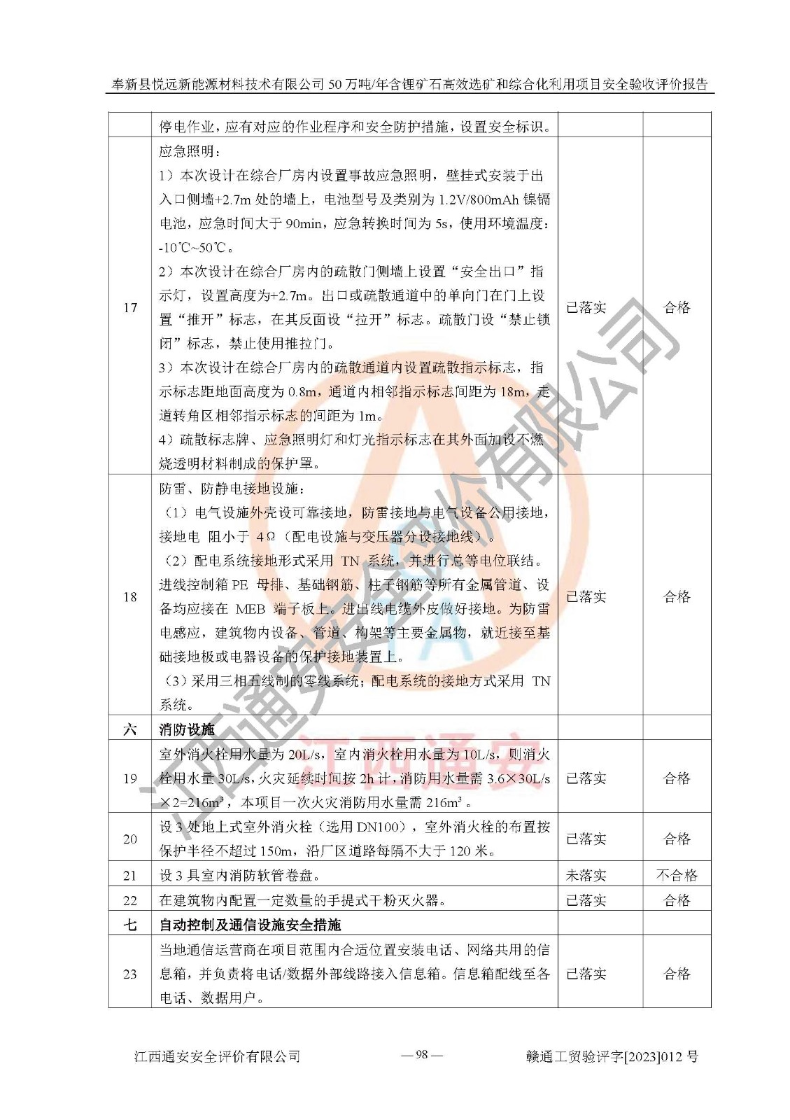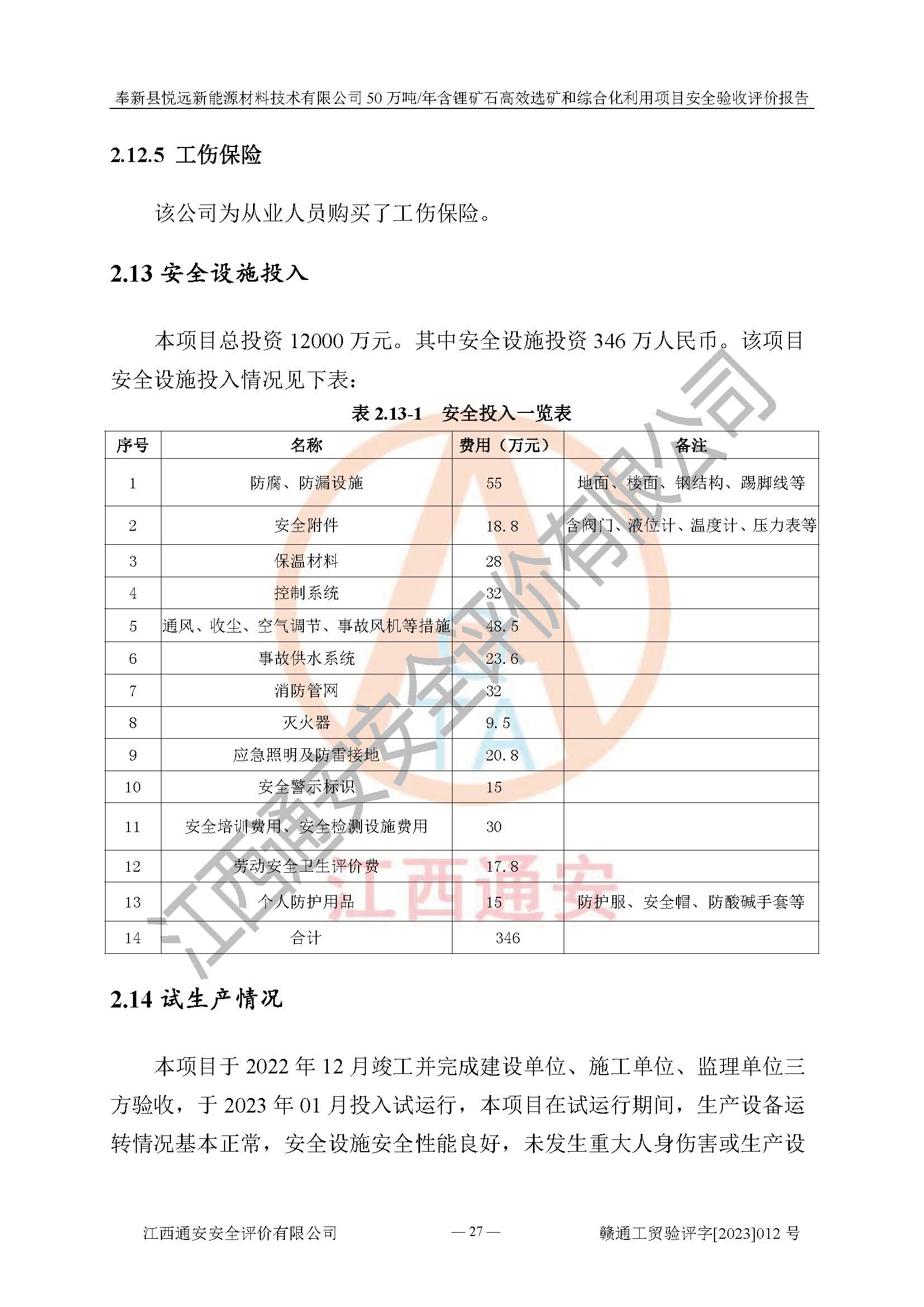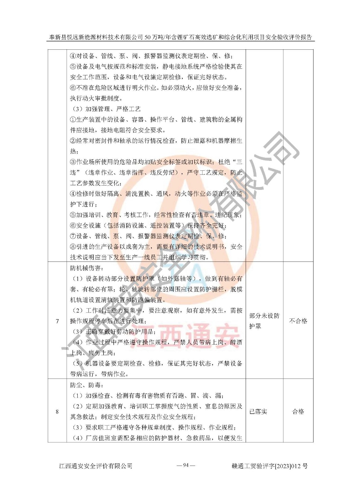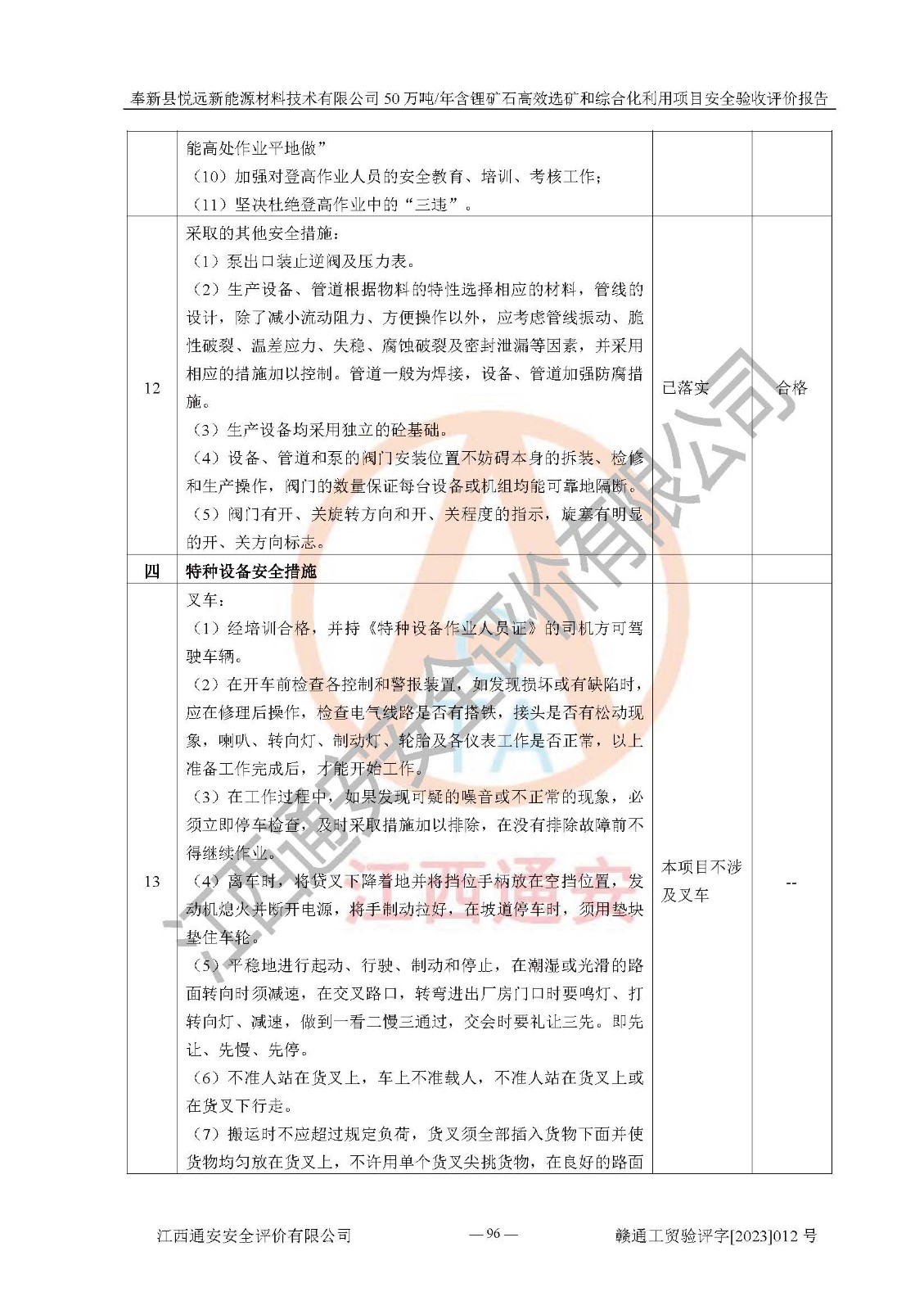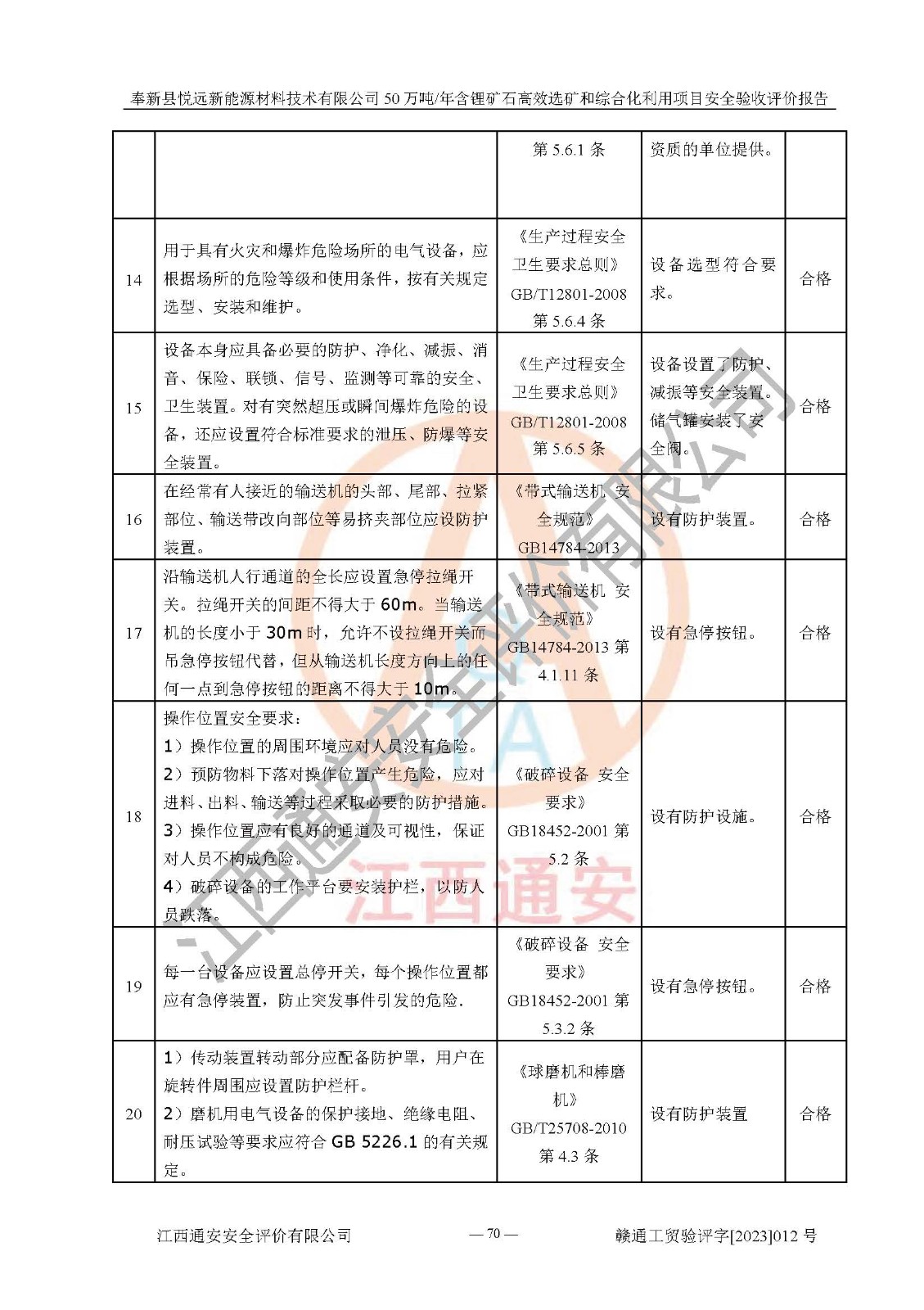 其它 | 根據(jù)《中華人民共和國(guó)安全生產(chǎn)法》、《新建項(xiàng)目安全設(shè)施“三同時(shí)”監(jiān)督管理辦法》(原**安全生產(chǎn)監(jiān)督管理總局令第77號(hào)修訂)等法律法規(guī)的要求,對(duì)奉新縣悅遠(yuǎn)新能源材料技術(shù)有限公司50萬(wàn)噸/年含鋰礦石**選礦和綜合化利用項(xiàng)目安全驗(yàn)收的基本條件進(jìn)行分析,結(jié)果如下: 1)本項(xiàng)目在初步設(shè)計(jì)及建設(shè)過程中基本能貫徹執(zhí)行**、地方及有關(guān)部門的安全生產(chǎn)法律法規(guī)、標(biāo)準(zhǔn)要求,取得了**相關(guān)部門的許可、備案。項(xiàng)目的設(shè)計(jì)、施工、監(jiān)理等單位均有相應(yīng)資質(zhì)。 2)本項(xiàng)目址選符合要求;總平面布置合理,主要建筑的防火間距符合符合《建筑設(shè)計(jì)防火規(guī)范(2018版)》(GB50016-2014)、《工業(yè)企業(yè)總平面設(shè)計(jì)規(guī)范》(GB50187-2012)有關(guān)規(guī)范、標(biāo)準(zhǔn)的要求。 3)本項(xiàng)目生產(chǎn)工藝成熟、試運(yùn)行正常,試運(yùn)行中過程中工藝和裝置、設(shè)備(設(shè)施)安全、可靠,未發(fā)生安全事故。 4)本項(xiàng)目的特種設(shè)備由有資質(zhì)單位設(shè)計(jì)、制造、安裝,未涉及監(jiān)管特種設(shè)備,符合《中華人民共和國(guó)特種設(shè)備安全法》、《特種設(shè)備安全監(jiān)察條例》(中華人民共和國(guó)***令第549號(hào))的規(guī)定。特種設(shè)備作業(yè)人員、特種作業(yè)人員均持證上崗。 5)公司主要負(fù)責(zé)人及安全管理人員已報(bào)名培訓(xùn),特種作業(yè)人員操作證在**期內(nèi),其他從業(yè)人員經(jīng)安全培訓(xùn)符合,取得上崗證。基本符合要求。 6)公司建立有安全管理制度,制定有各類人員的安全生產(chǎn)責(zé)任制、各項(xiàng)安全管理制度和操作規(guī)程。按照**有關(guān)規(guī)定編制了事故應(yīng)急救援預(yù)案并進(jìn)行了備案,并定期進(jìn)行演練等,符合要求。 7)本項(xiàng)目作業(yè)條件危險(xiǎn)性分析結(jié)果:在選定的單元的危險(xiǎn)程度均為“可能危險(xiǎn),需要注意”或“稍有危險(xiǎn),可以接受”,作業(yè)條件相對(duì)安全。 評(píng)價(jià)結(jié)論: 奉新縣悅遠(yuǎn)新能源材料技術(shù)有限公司50萬(wàn)噸/年含鋰礦石**選礦和綜合化利用項(xiàng)目的安全設(shè)施及安全管理符合**及有關(guān)部門關(guān)于安全生產(chǎn)法律、法規(guī)、標(biāo)準(zhǔn)的要求,該項(xiàng)目試生產(chǎn)以來,工藝設(shè)備、安全設(shè)施及企業(yè)安全管理機(jī)制等運(yùn)行正常,安全設(shè)施、措施達(dá)到設(shè)計(jì)要求和預(yù)期結(jié)果,可以滿足建設(shè)項(xiàng)目安全生產(chǎn)的要求,安全生產(chǎn)管理**,具備竣工驗(yàn)收條件。 | ||||