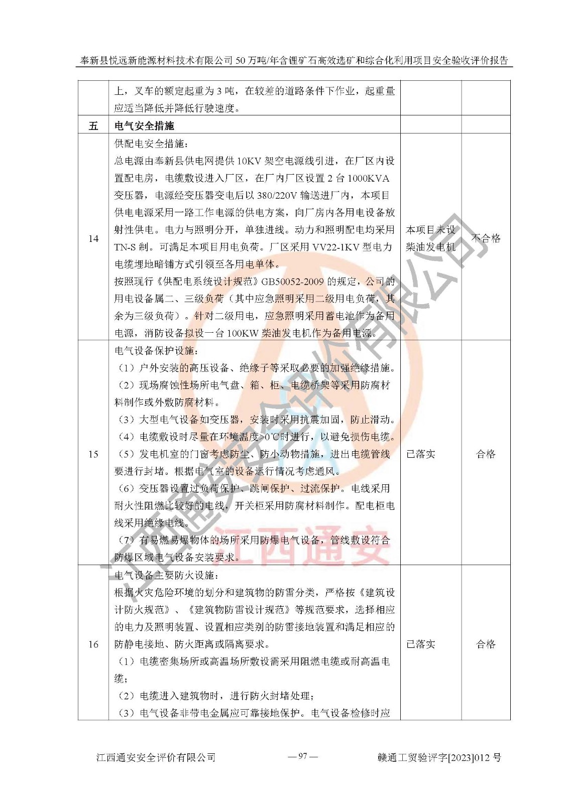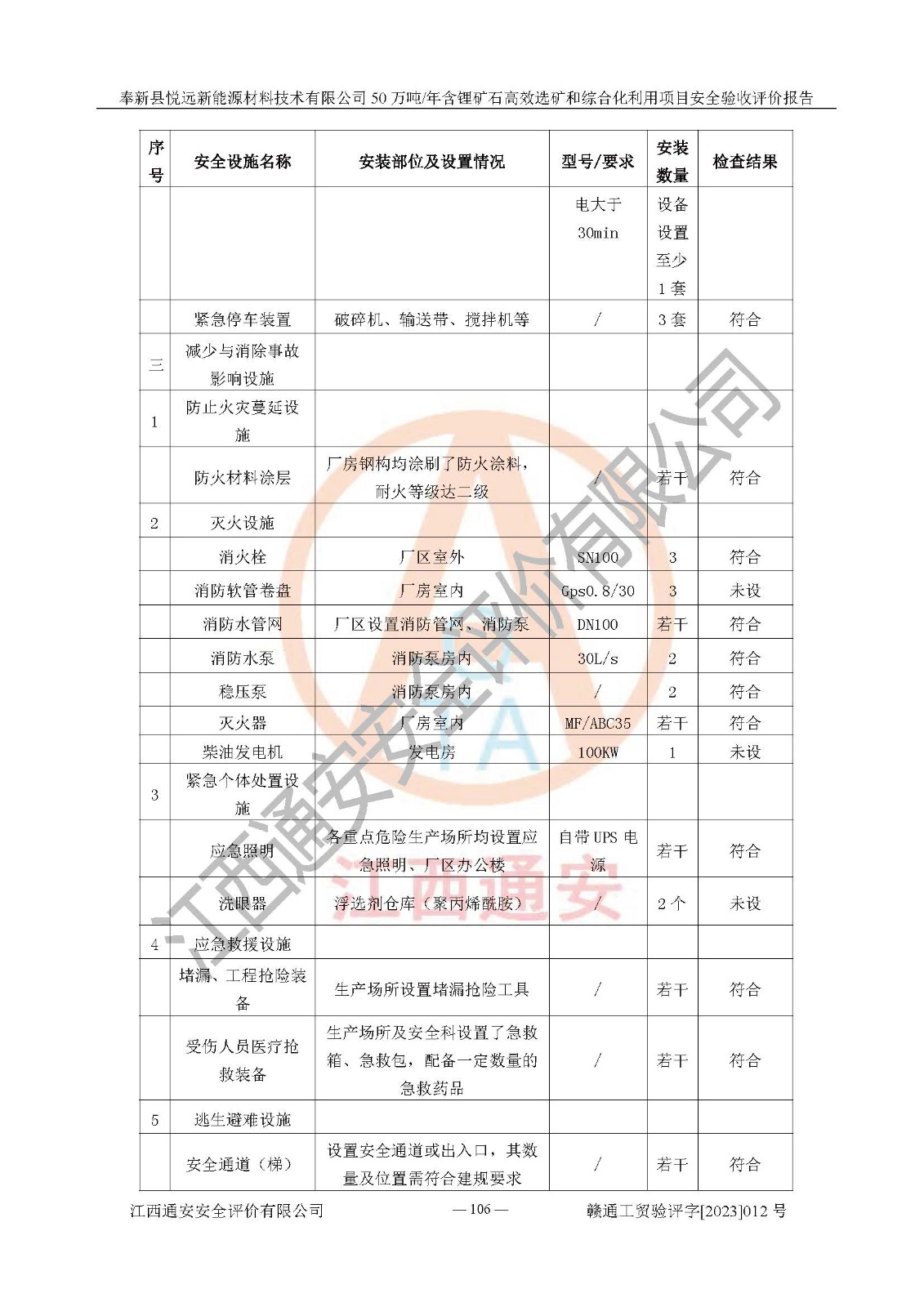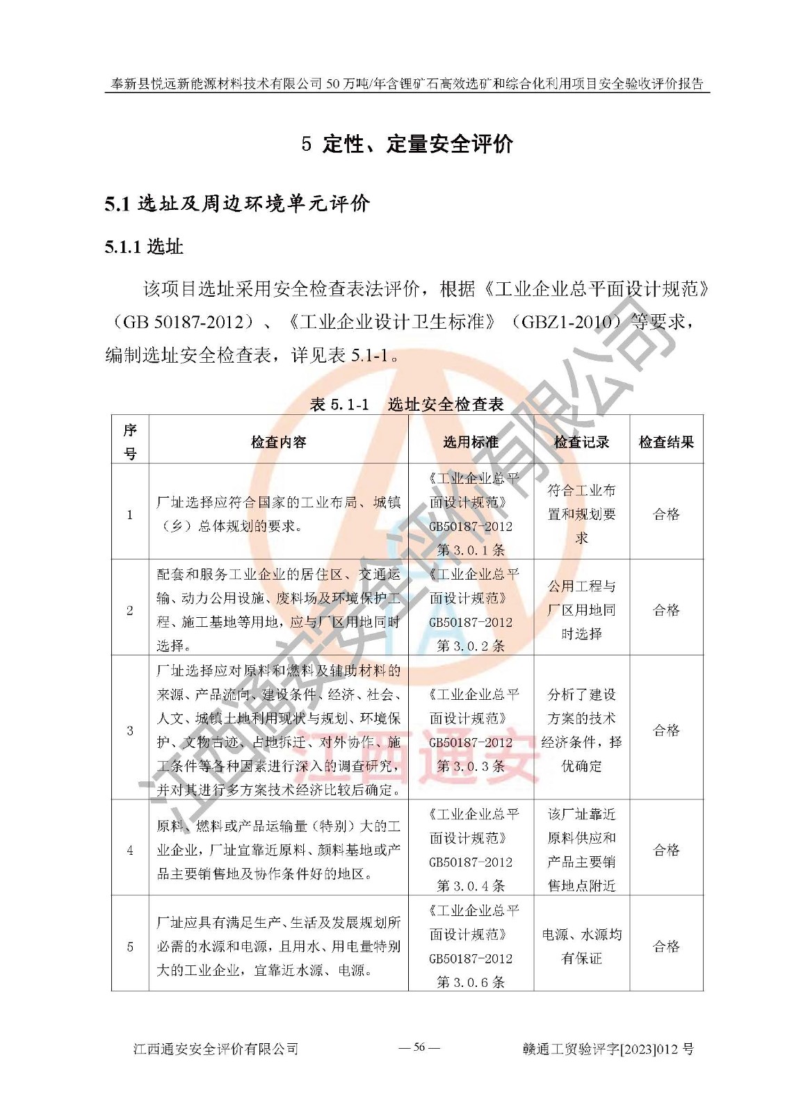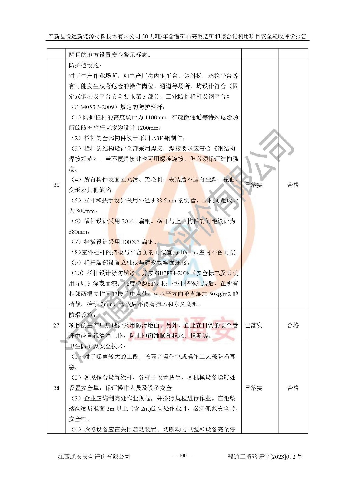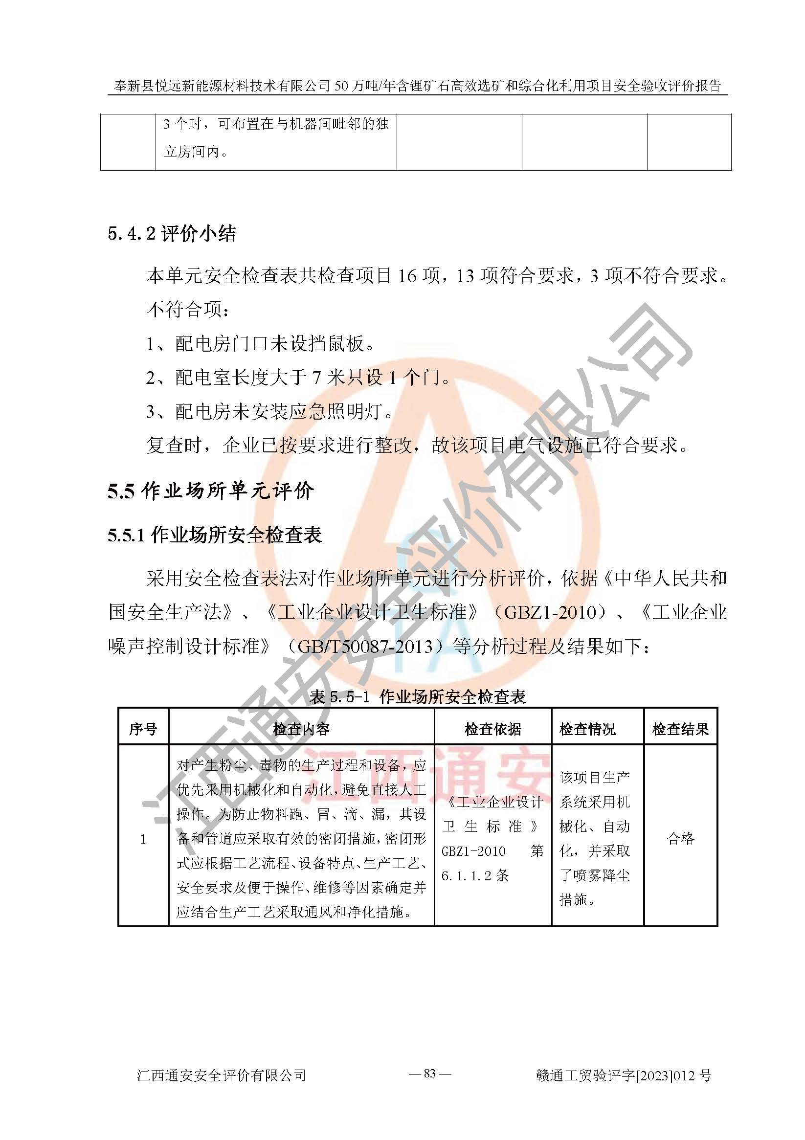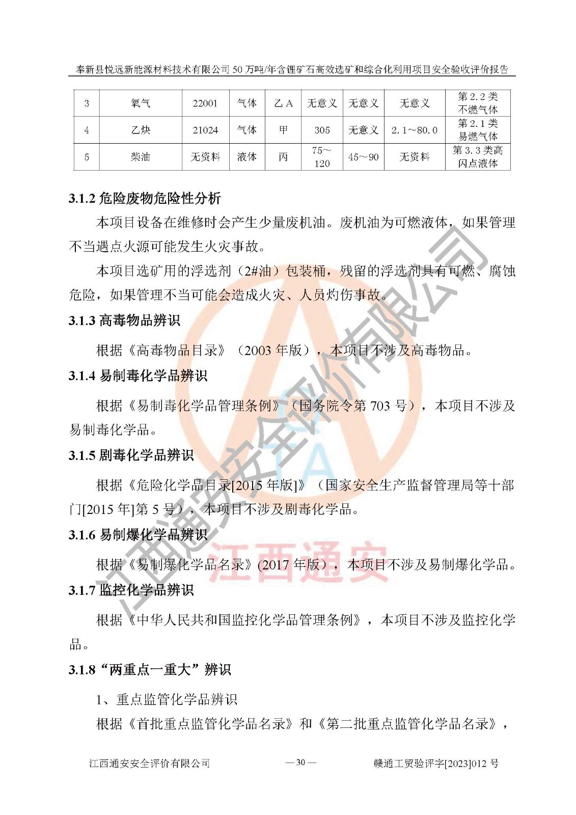 其它 | 根據(jù)《中華人民共和國(guó)安全生產(chǎn)法》、《新建項(xiàng)目安全設(shè)施“三同時(shí)”監(jiān)督管理辦法》(原**安全生產(chǎn)監(jiān)督管理總局令第77號(hào)修訂)等法律法規(guī)的要求,對(duì)奉新縣悅遠(yuǎn)新能源材料技術(shù)有限公司50萬(wàn)噸/年含鋰礦石**選礦和綜合化利用項(xiàng)目安全驗(yàn)收的基本條件進(jìn)行分析,結(jié)果如下: 1)本項(xiàng)目在初步設(shè)計(jì)及建設(shè)過程中基本能貫徹執(zhí)行**、地方及有關(guān)部門的安全生產(chǎn)法律法規(guī)、標(biāo)準(zhǔn)要求,取得了**相關(guān)部門的許可、備案。項(xiàng)目的設(shè)計(jì)、施工、監(jiān)理等單位均有相應(yīng)資質(zhì)。 2)本項(xiàng)目址選符合要求;總平面布置合理,主要建筑的防火間距符合符合《建筑設(shè)計(jì)防火規(guī)范(2018版)》(GB50016-2014)、《工業(yè)企業(yè)總平面設(shè)計(jì)規(guī)范》(GB50187-2012)有關(guān)規(guī)范、標(biāo)準(zhǔn)的要求。 3)本項(xiàng)目生產(chǎn)工藝成熟、試運(yùn)行正常,試運(yùn)行中過程中工藝和裝置、設(shè)備(設(shè)施)安全、可靠,未發(fā)生安全事故。 4)本項(xiàng)目的特種設(shè)備由有資質(zhì)單位設(shè)計(jì)、制造、安裝,未涉及監(jiān)管特種設(shè)備,符合《中華人民共和國(guó)特種設(shè)備安全法》、《特種設(shè)備安全監(jiān)察條例》(中華人民共和國(guó)***令第549號(hào))的規(guī)定。特種設(shè)備作業(yè)人員、特種作業(yè)人員均持證上崗。 5)公司主要負(fù)責(zé)人及安全管理人員已報(bào)名培訓(xùn),特種作業(yè)人員操作證在**期內(nèi),其他從業(yè)人員經(jīng)安全培訓(xùn)符合,取得上崗證。基本符合要求。 6)公司建立有安全管理制度,制定有各類人員的安全生產(chǎn)責(zé)任制、各項(xiàng)安全管理制度和操作規(guī)程。按照**有關(guān)規(guī)定編制了事故應(yīng)急救援預(yù)案并進(jìn)行了備案,并定期進(jìn)行演練等,符合要求。 7)本項(xiàng)目作業(yè)條件危險(xiǎn)性分析結(jié)果:在選定的單元的危險(xiǎn)程度均為“可能危險(xiǎn),需要注意”或“稍有危險(xiǎn),可以接受”,作業(yè)條件相對(duì)安全。 評(píng)價(jià)結(jié)論: 奉新縣悅遠(yuǎn)新能源材料技術(shù)有限公司50萬(wàn)噸/年含鋰礦石**選礦和綜合化利用項(xiàng)目的安全設(shè)施及安全管理符合**及有關(guān)部門關(guān)于安全生產(chǎn)法律、法規(guī)、標(biāo)準(zhǔn)的要求,該項(xiàng)目試生產(chǎn)以來,工藝設(shè)備、安全設(shè)施及企業(yè)安全管理機(jī)制等運(yùn)行正常,安全設(shè)施、措施達(dá)到設(shè)計(jì)要求和預(yù)期結(jié)果,可以滿足建設(shè)項(xiàng)目安全生產(chǎn)的要求,安全生產(chǎn)管理**,具備竣工驗(yàn)收條件。 | ||||