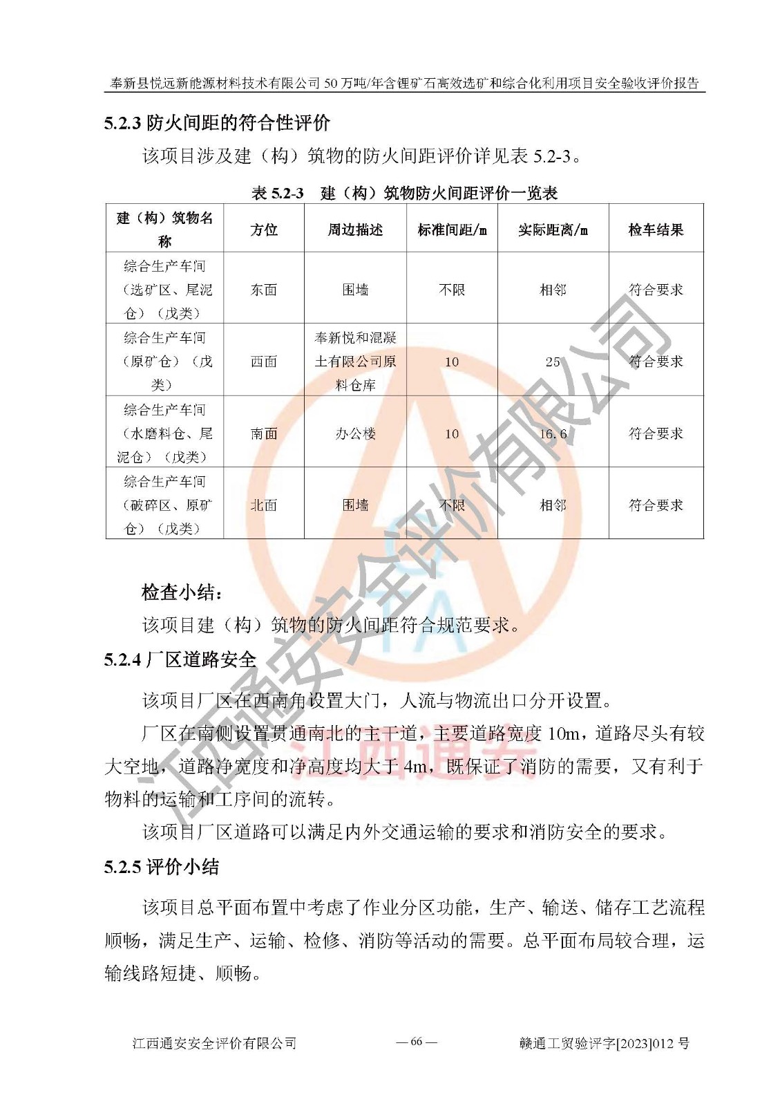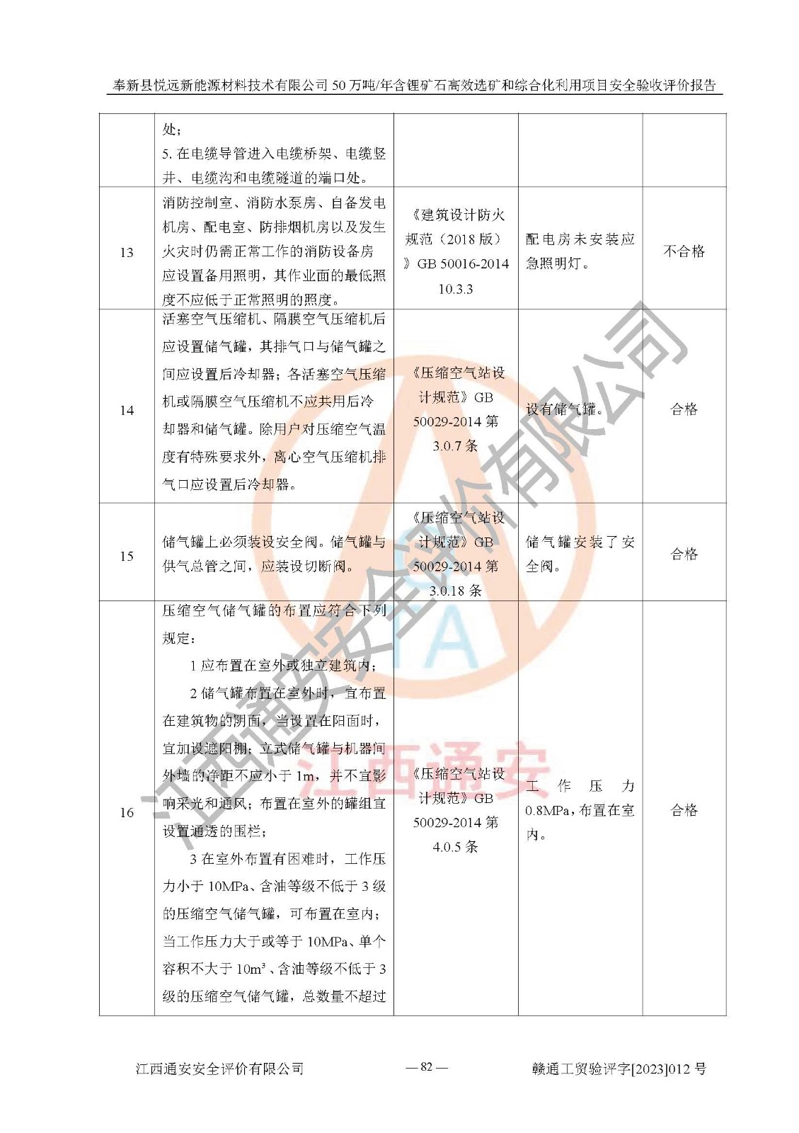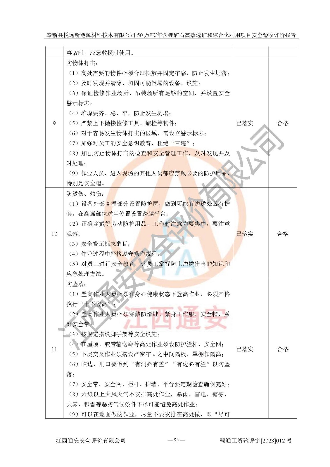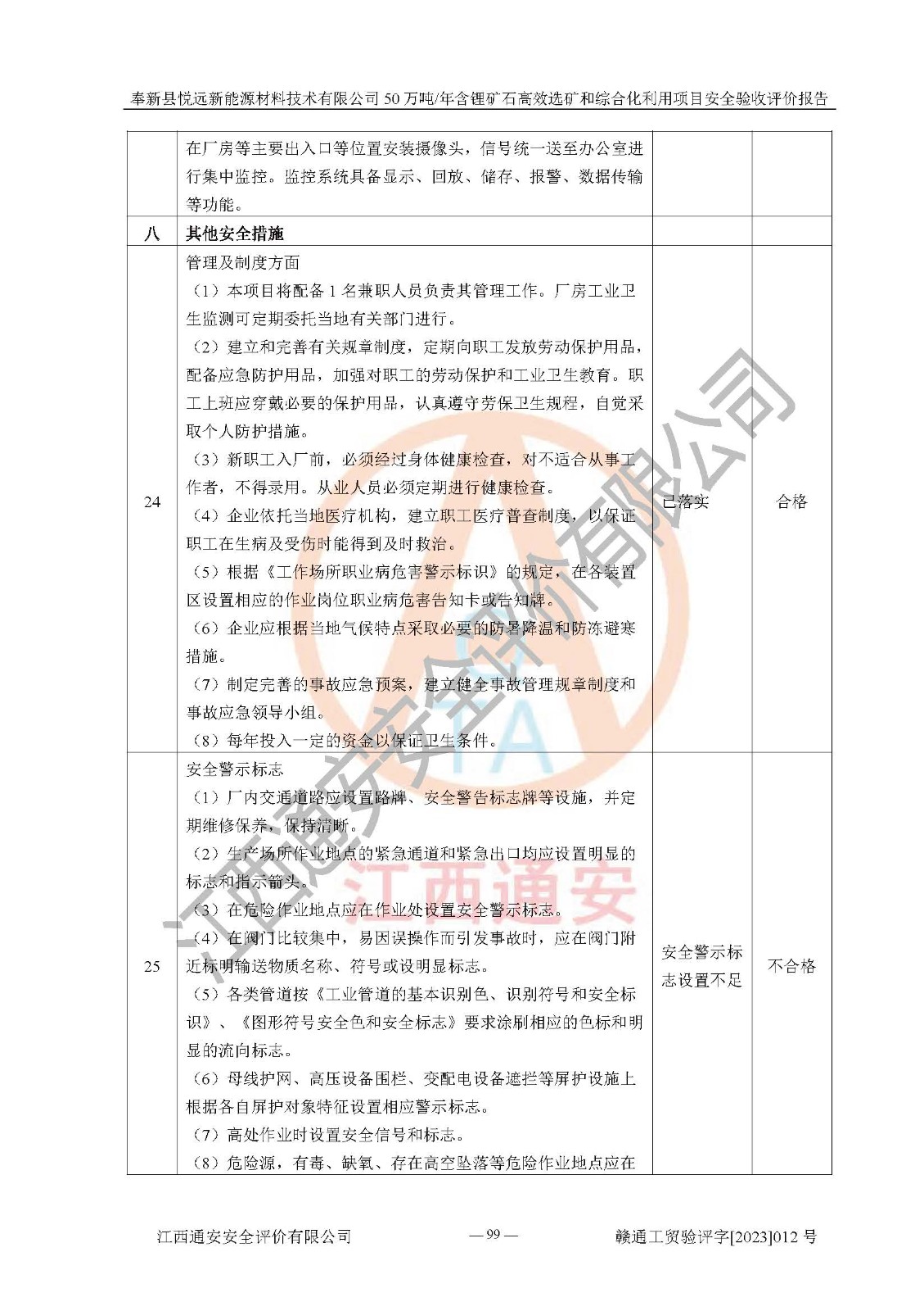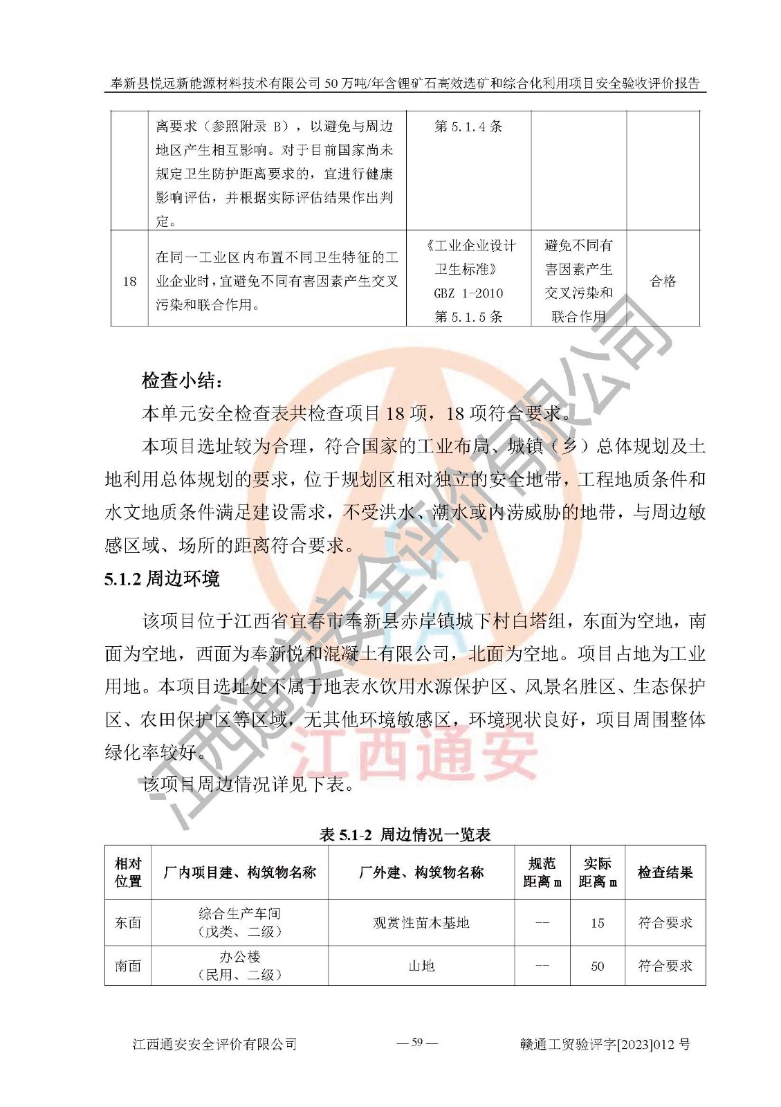 其它 | 根據(jù)《中華人民共和國(guó)安全生產(chǎn)法》、《新建項(xiàng)目安全設(shè)施“三同時(shí)”監(jiān)督管理辦法》(原**安全生產(chǎn)監(jiān)督管理總局令第77號(hào)修訂)等法律法規(guī)的要求,對(duì)奉新縣悅遠(yuǎn)新能源材料技術(shù)有限公司50萬(wàn)噸/年含鋰礦石**選礦和綜合化利用項(xiàng)目安全驗(yàn)收的基本條件進(jìn)行分析,結(jié)果如下: 1)本項(xiàng)目在初步設(shè)計(jì)及建設(shè)過程中基本能貫徹執(zhí)行**、地方及有關(guān)部門的安全生產(chǎn)法律法規(guī)、標(biāo)準(zhǔn)要求,取得了**相關(guān)部門的許可、備案。項(xiàng)目的設(shè)計(jì)、施工、監(jiān)理等單位均有相應(yīng)資質(zhì)。 2)本項(xiàng)目址選符合要求;總平面布置合理,主要建筑的防火間距符合符合《建筑設(shè)計(jì)防火規(guī)范(2018版)》(GB50016-2014)、《工業(yè)企業(yè)總平面設(shè)計(jì)規(guī)范》(GB50187-2012)有關(guān)規(guī)范、標(biāo)準(zhǔn)的要求。 3)本項(xiàng)目生產(chǎn)工藝成熟、試運(yùn)行正常,試運(yùn)行中過程中工藝和裝置、設(shè)備(設(shè)施)安全、可靠,未發(fā)生安全事故。 4)本項(xiàng)目的特種設(shè)備由有資質(zhì)單位設(shè)計(jì)、制造、安裝,未涉及監(jiān)管特種設(shè)備,符合《中華人民共和國(guó)特種設(shè)備安全法》、《特種設(shè)備安全監(jiān)察條例》(中華人民共和國(guó)***令第549號(hào))的規(guī)定。特種設(shè)備作業(yè)人員、特種作業(yè)人員均持證上崗。 5)公司主要負(fù)責(zé)人及安全管理人員已報(bào)名培訓(xùn),特種作業(yè)人員操作證在**期內(nèi),其他從業(yè)人員經(jīng)安全培訓(xùn)符合,取得上崗證。基本符合要求。 6)公司建立有安全管理制度,制定有各類人員的安全生產(chǎn)責(zé)任制、各項(xiàng)安全管理制度和操作規(guī)程。按照**有關(guān)規(guī)定編制了事故應(yīng)急救援預(yù)案并進(jìn)行了備案,并定期進(jìn)行演練等,符合要求。 7)本項(xiàng)目作業(yè)條件危險(xiǎn)性分析結(jié)果:在選定的單元的危險(xiǎn)程度均為“可能危險(xiǎn),需要注意”或“稍有危險(xiǎn),可以接受”,作業(yè)條件相對(duì)安全。 評(píng)價(jià)結(jié)論: 奉新縣悅遠(yuǎn)新能源材料技術(shù)有限公司50萬(wàn)噸/年含鋰礦石**選礦和綜合化利用項(xiàng)目的安全設(shè)施及安全管理符合**及有關(guān)部門關(guān)于安全生產(chǎn)法律、法規(guī)、標(biāo)準(zhǔn)的要求,該項(xiàng)目試生產(chǎn)以來,工藝設(shè)備、安全設(shè)施及企業(yè)安全管理機(jī)制等運(yùn)行正常,安全設(shè)施、措施達(dá)到設(shè)計(jì)要求和預(yù)期結(jié)果,可以滿足建設(shè)項(xiàng)目安全生產(chǎn)的要求,安全生產(chǎn)管理**,具備竣工驗(yàn)收條件。 | ||||