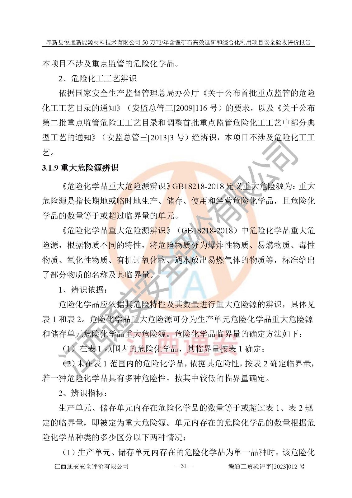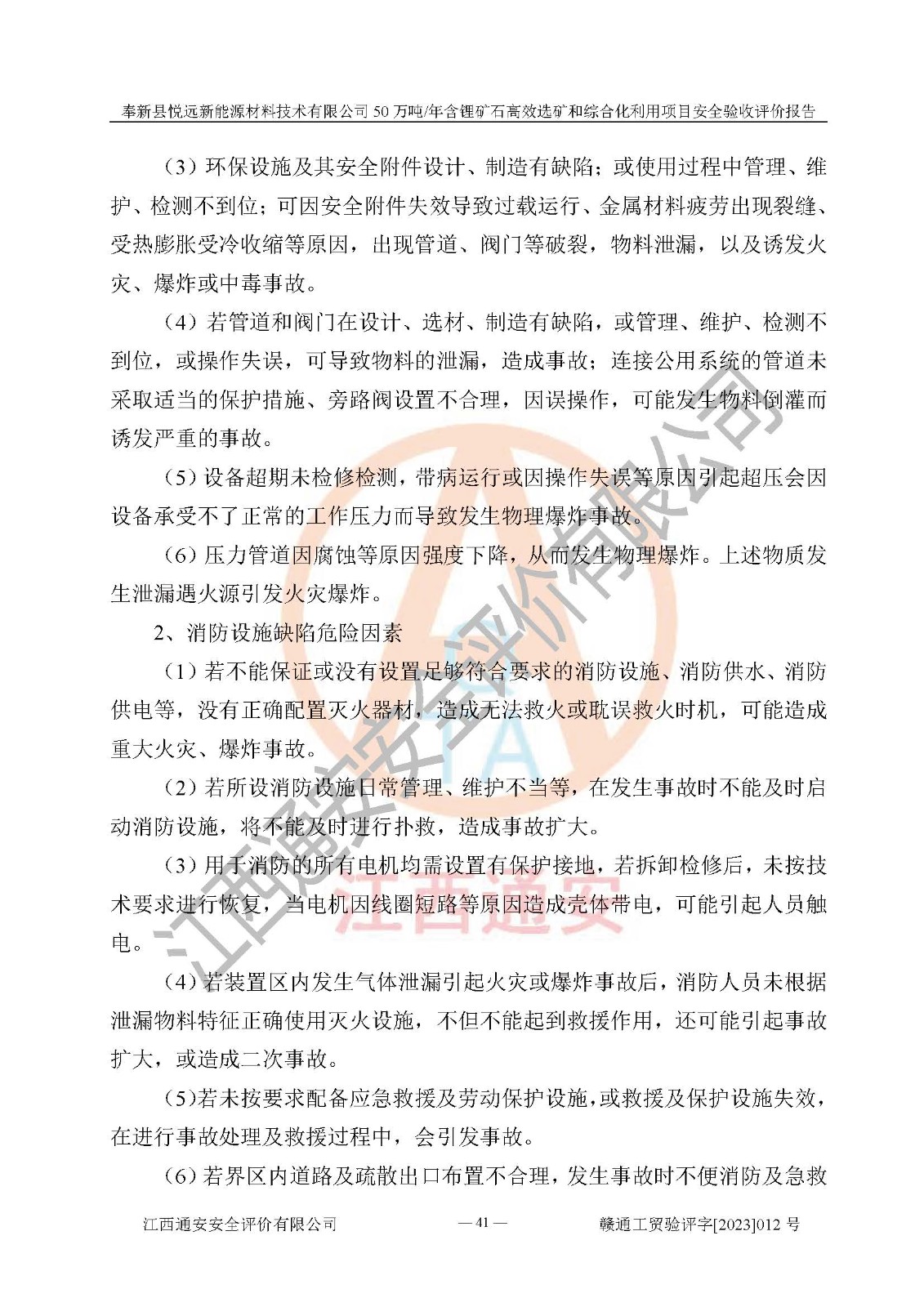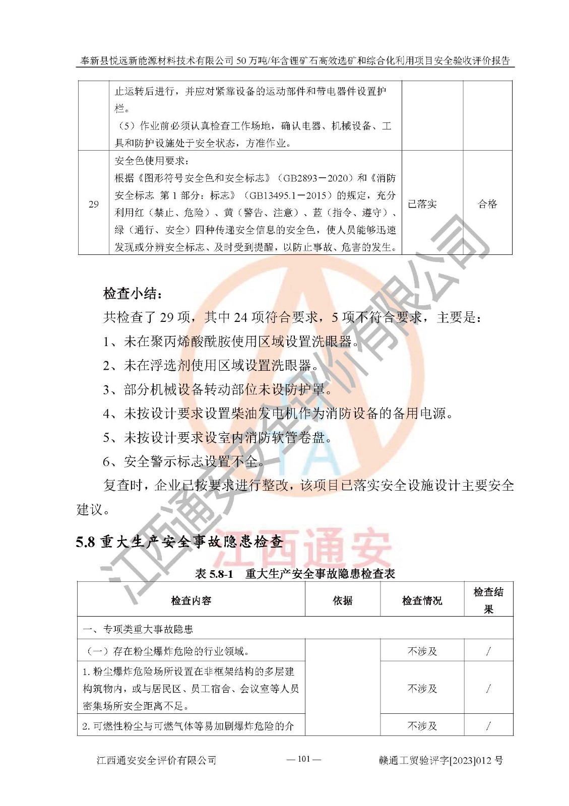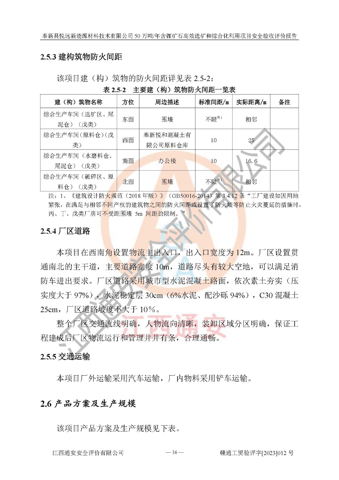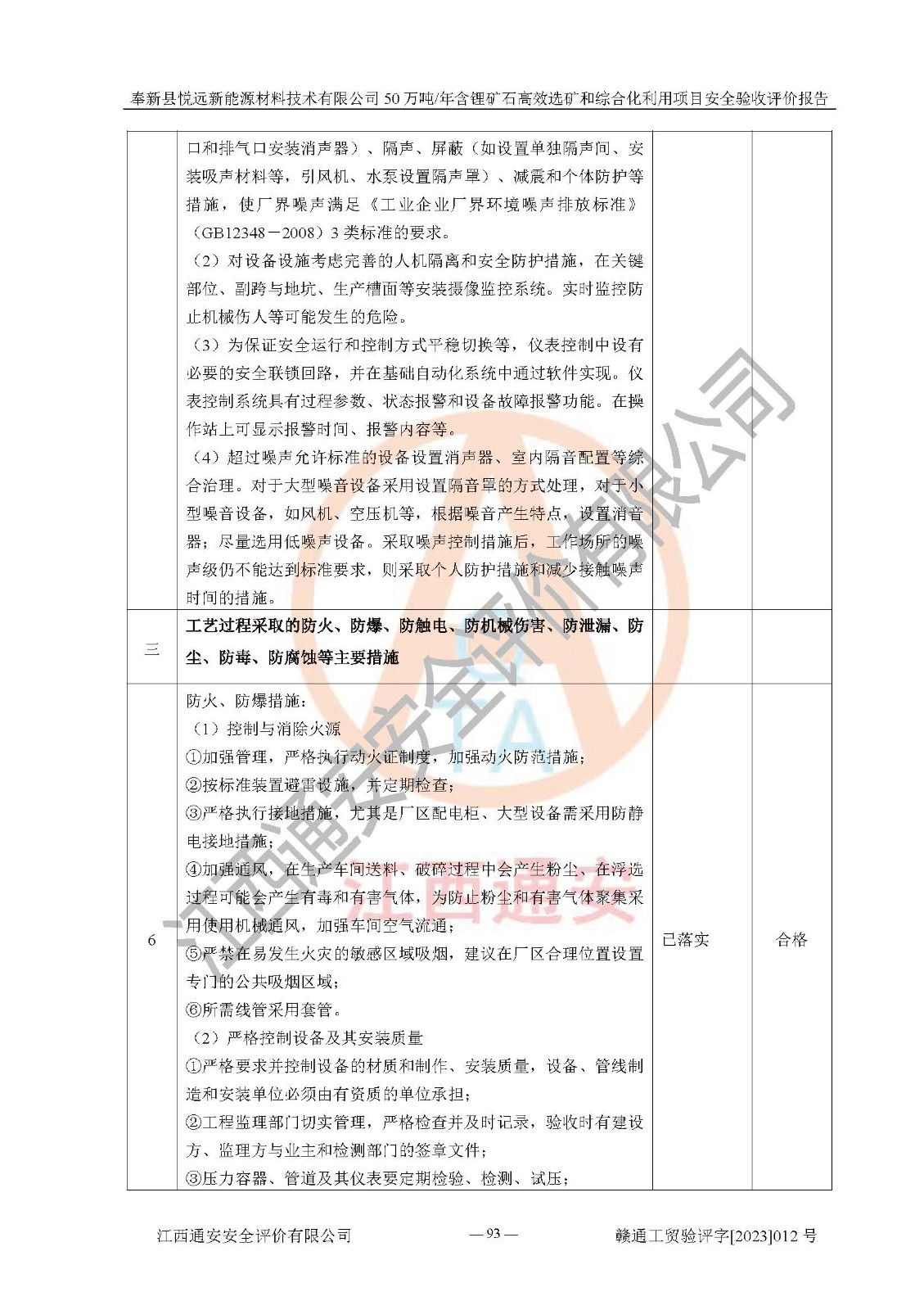 其它 | 根據(jù)《中華人民共和國(guó)安全生產(chǎn)法》、《新建項(xiàng)目安全設(shè)施“三同時(shí)”監(jiān)督管理辦法》(原**安全生產(chǎn)監(jiān)督管理總局令第77號(hào)修訂)等法律法規(guī)的要求,對(duì)奉新縣悅遠(yuǎn)新能源材料技術(shù)有限公司50萬(wàn)噸/年含鋰礦石**選礦和綜合化利用項(xiàng)目安全驗(yàn)收的基本條件進(jìn)行分析,結(jié)果如下: 1)本項(xiàng)目在初步設(shè)計(jì)及建設(shè)過程中基本能貫徹執(zhí)行**、地方及有關(guān)部門的安全生產(chǎn)法律法規(guī)、標(biāo)準(zhǔn)要求,取得了**相關(guān)部門的許可、備案。項(xiàng)目的設(shè)計(jì)、施工、監(jiān)理等單位均有相應(yīng)資質(zhì)。 2)本項(xiàng)目址選符合要求;總平面布置合理,主要建筑的防火間距符合符合《建筑設(shè)計(jì)防火規(guī)范(2018版)》(GB50016-2014)、《工業(yè)企業(yè)總平面設(shè)計(jì)規(guī)范》(GB50187-2012)有關(guān)規(guī)范、標(biāo)準(zhǔn)的要求。 3)本項(xiàng)目生產(chǎn)工藝成熟、試運(yùn)行正常,試運(yùn)行中過程中工藝和裝置、設(shè)備(設(shè)施)安全、可靠,未發(fā)生安全事故。 4)本項(xiàng)目的特種設(shè)備由有資質(zhì)單位設(shè)計(jì)、制造、安裝,未涉及監(jiān)管特種設(shè)備,符合《中華人民共和國(guó)特種設(shè)備安全法》、《特種設(shè)備安全監(jiān)察條例》(中華人民共和國(guó)***令第549號(hào))的規(guī)定。特種設(shè)備作業(yè)人員、特種作業(yè)人員均持證上崗。 5)公司主要負(fù)責(zé)人及安全管理人員已報(bào)名培訓(xùn),特種作業(yè)人員操作證在**期內(nèi),其他從業(yè)人員經(jīng)安全培訓(xùn)符合,取得上崗證。基本符合要求。 6)公司建立有安全管理制度,制定有各類人員的安全生產(chǎn)責(zé)任制、各項(xiàng)安全管理制度和操作規(guī)程。按照**有關(guān)規(guī)定編制了事故應(yīng)急救援預(yù)案并進(jìn)行了備案,并定期進(jìn)行演練等,符合要求。 7)本項(xiàng)目作業(yè)條件危險(xiǎn)性分析結(jié)果:在選定的單元的危險(xiǎn)程度均為“可能危險(xiǎn),需要注意”或“稍有危險(xiǎn),可以接受”,作業(yè)條件相對(duì)安全。 評(píng)價(jià)結(jié)論: 奉新縣悅遠(yuǎn)新能源材料技術(shù)有限公司50萬(wàn)噸/年含鋰礦石**選礦和綜合化利用項(xiàng)目的安全設(shè)施及安全管理符合**及有關(guān)部門關(guān)于安全生產(chǎn)法律、法規(guī)、標(biāo)準(zhǔn)的要求,該項(xiàng)目試生產(chǎn)以來,工藝設(shè)備、安全設(shè)施及企業(yè)安全管理機(jī)制等運(yùn)行正常,安全設(shè)施、措施達(dá)到設(shè)計(jì)要求和預(yù)期結(jié)果,可以滿足建設(shè)項(xiàng)目安全生產(chǎn)的要求,安全生產(chǎn)管理**,具備竣工驗(yàn)收條件。 | ||||