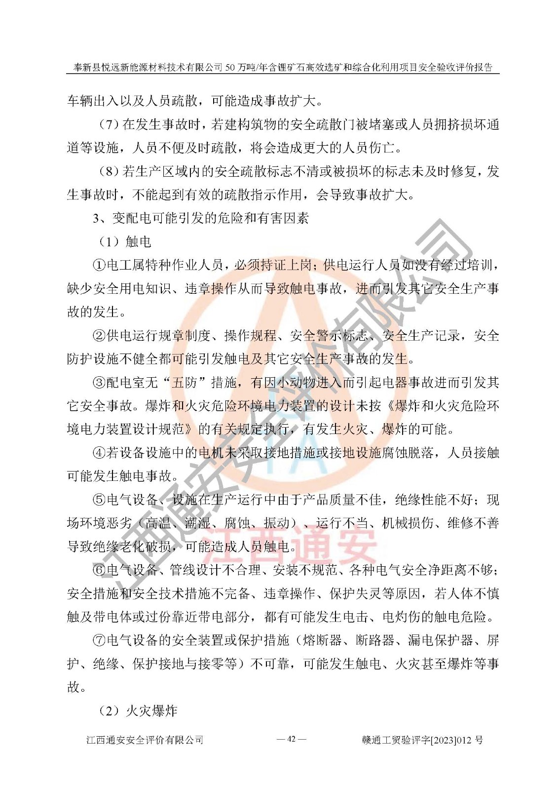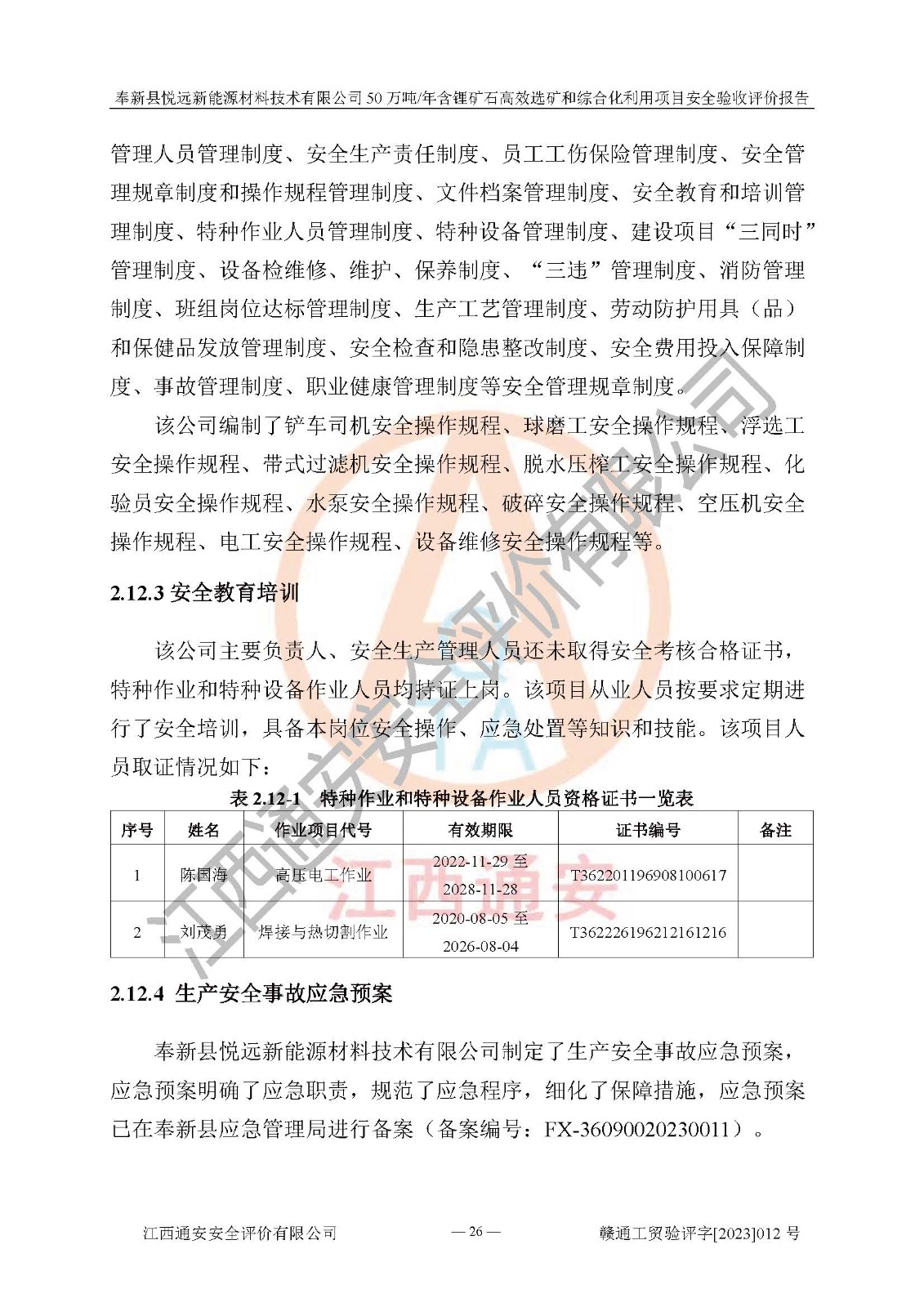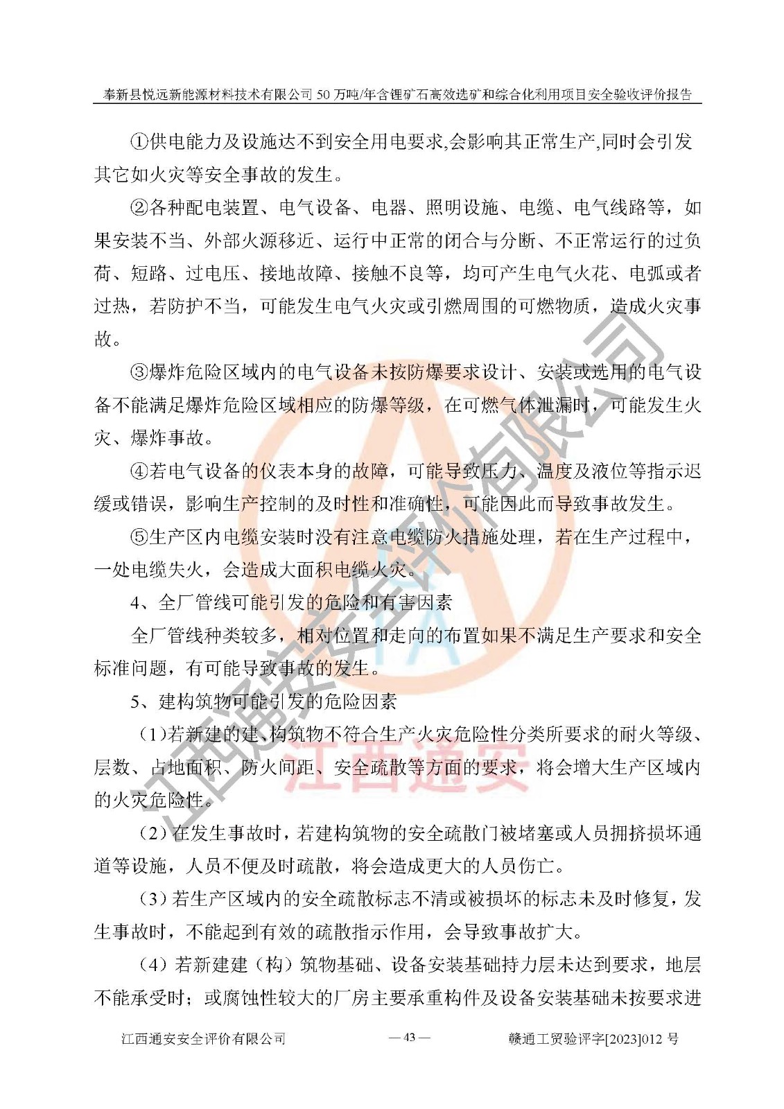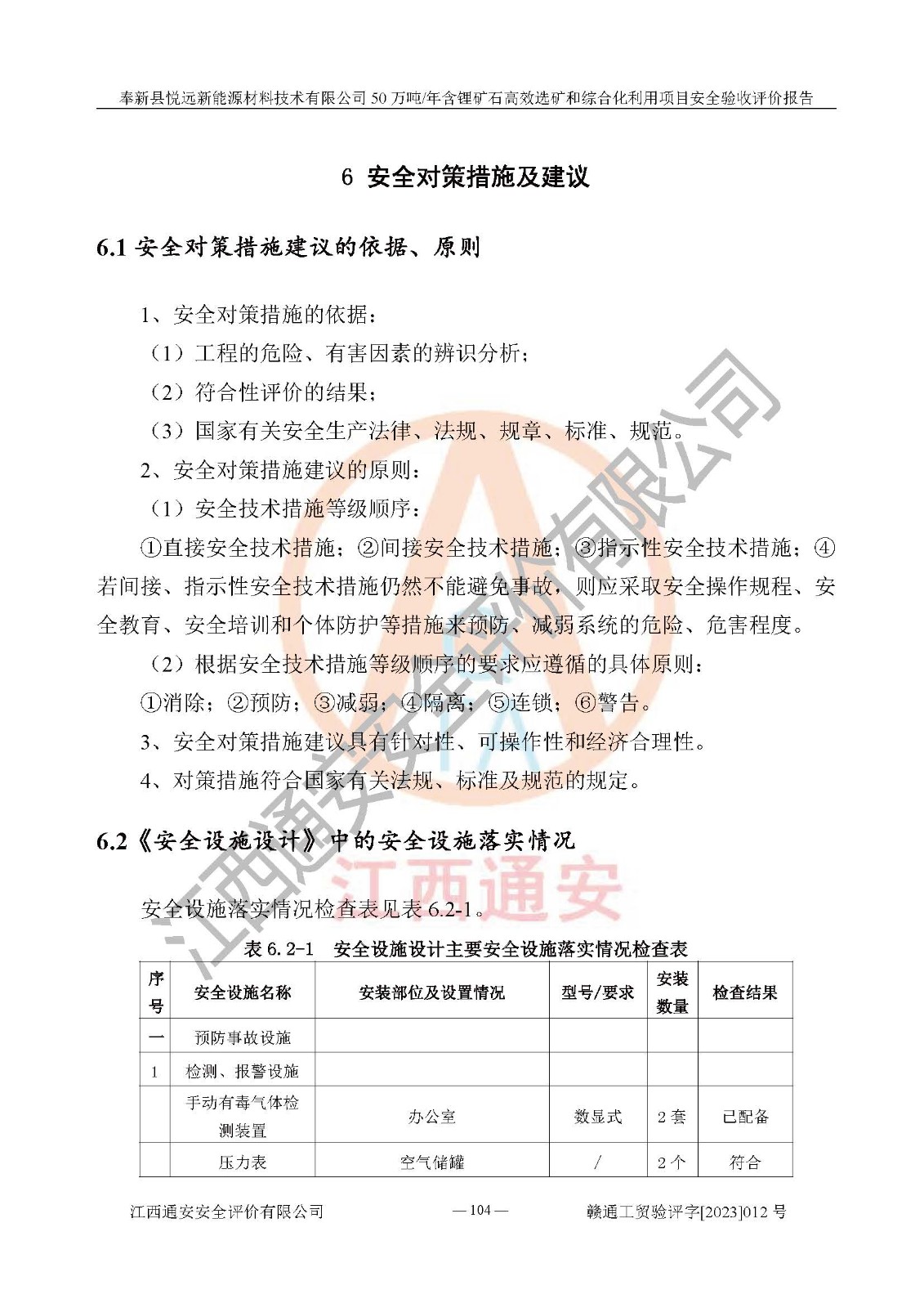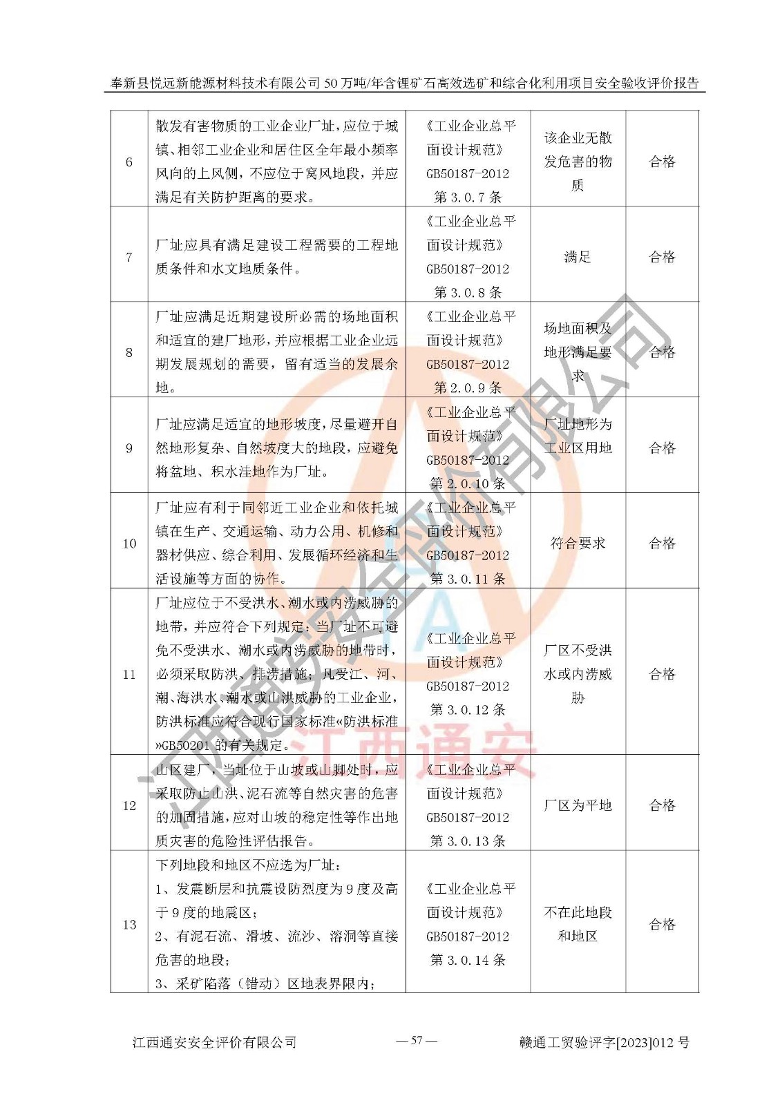 其它 | 根據(jù)《中華人民共和國(guó)安全生產(chǎn)法》、《新建項(xiàng)目安全設(shè)施“三同時(shí)”監(jiān)督管理辦法》(原**安全生產(chǎn)監(jiān)督管理總局令第77號(hào)修訂)等法律法規(guī)的要求,對(duì)奉新縣悅遠(yuǎn)新能源材料技術(shù)有限公司50萬(wàn)噸/年含鋰礦石**選礦和綜合化利用項(xiàng)目安全驗(yàn)收的基本條件進(jìn)行分析,結(jié)果如下: 1)本項(xiàng)目在初步設(shè)計(jì)及建設(shè)過程中基本能貫徹執(zhí)行**、地方及有關(guān)部門的安全生產(chǎn)法律法規(guī)、標(biāo)準(zhǔn)要求,取得了**相關(guān)部門的許可、備案。項(xiàng)目的設(shè)計(jì)、施工、監(jiān)理等單位均有相應(yīng)資質(zhì)。 2)本項(xiàng)目址選符合要求;總平面布置合理,主要建筑的防火間距符合符合《建筑設(shè)計(jì)防火規(guī)范(2018版)》(GB50016-2014)、《工業(yè)企業(yè)總平面設(shè)計(jì)規(guī)范》(GB50187-2012)有關(guān)規(guī)范、標(biāo)準(zhǔn)的要求。 3)本項(xiàng)目生產(chǎn)工藝成熟、試運(yùn)行正常,試運(yùn)行中過程中工藝和裝置、設(shè)備(設(shè)施)安全、可靠,未發(fā)生安全事故。 4)本項(xiàng)目的特種設(shè)備由有資質(zhì)單位設(shè)計(jì)、制造、安裝,未涉及監(jiān)管特種設(shè)備,符合《中華人民共和國(guó)特種設(shè)備安全法》、《特種設(shè)備安全監(jiān)察條例》(中華人民共和國(guó)***令第549號(hào))的規(guī)定。特種設(shè)備作業(yè)人員、特種作業(yè)人員均持證上崗。 5)公司主要負(fù)責(zé)人及安全管理人員已報(bào)名培訓(xùn),特種作業(yè)人員操作證在**期內(nèi),其他從業(yè)人員經(jīng)安全培訓(xùn)符合,取得上崗證。基本符合要求。 6)公司建立有安全管理制度,制定有各類人員的安全生產(chǎn)責(zé)任制、各項(xiàng)安全管理制度和操作規(guī)程。按照**有關(guān)規(guī)定編制了事故應(yīng)急救援預(yù)案并進(jìn)行了備案,并定期進(jìn)行演練等,符合要求。 7)本項(xiàng)目作業(yè)條件危險(xiǎn)性分析結(jié)果:在選定的單元的危險(xiǎn)程度均為“可能危險(xiǎn),需要注意”或“稍有危險(xiǎn),可以接受”,作業(yè)條件相對(duì)安全。 評(píng)價(jià)結(jié)論: 奉新縣悅遠(yuǎn)新能源材料技術(shù)有限公司50萬(wàn)噸/年含鋰礦石**選礦和綜合化利用項(xiàng)目的安全設(shè)施及安全管理符合**及有關(guān)部門關(guān)于安全生產(chǎn)法律、法規(guī)、標(biāo)準(zhǔn)的要求,該項(xiàng)目試生產(chǎn)以來,工藝設(shè)備、安全設(shè)施及企業(yè)安全管理機(jī)制等運(yùn)行正常,安全設(shè)施、措施達(dá)到設(shè)計(jì)要求和預(yù)期結(jié)果,可以滿足建設(shè)項(xiàng)目安全生產(chǎn)的要求,安全生產(chǎn)管理**,具備竣工驗(yàn)收條件。 | ||||