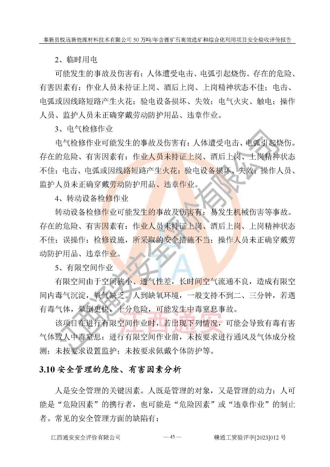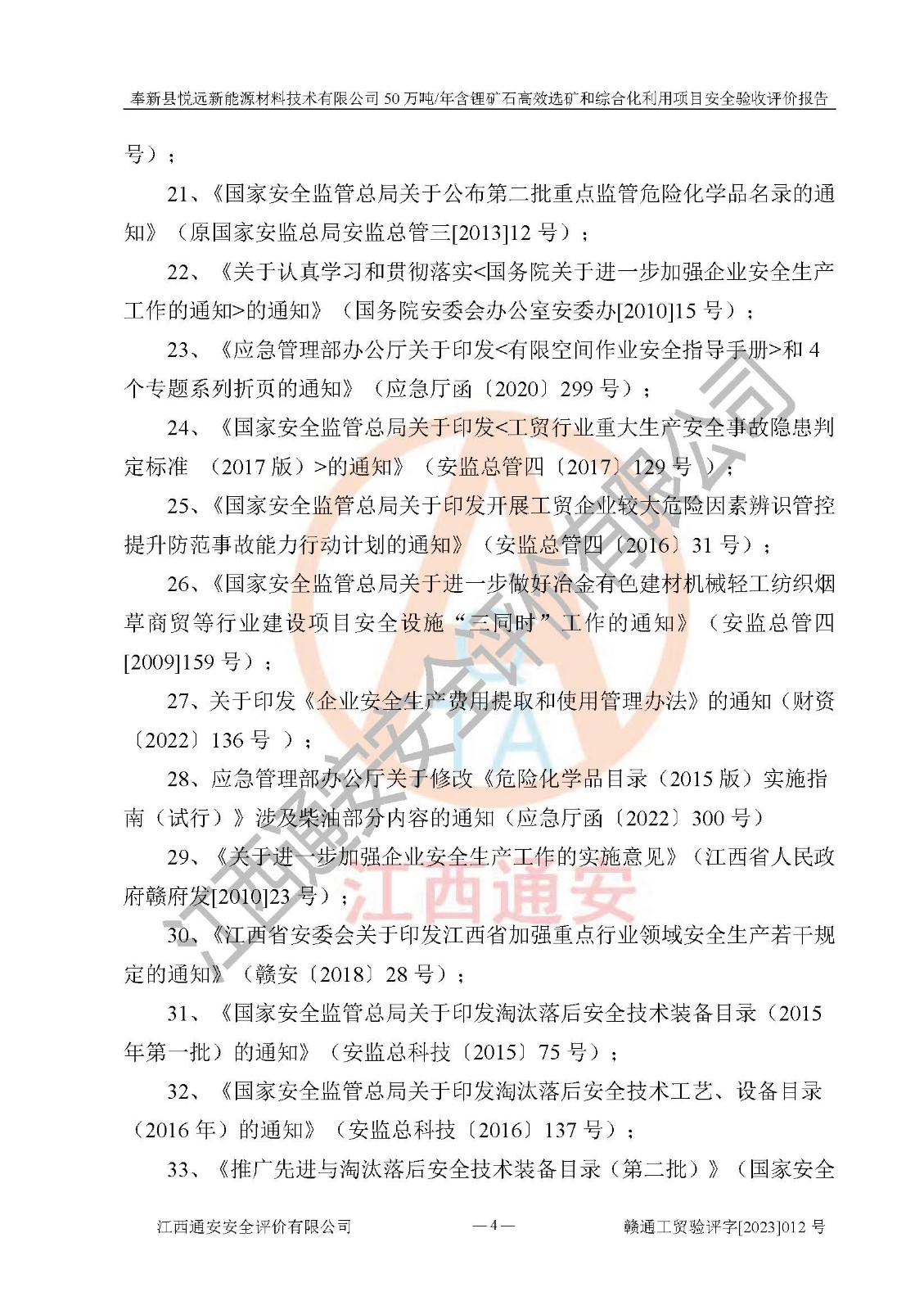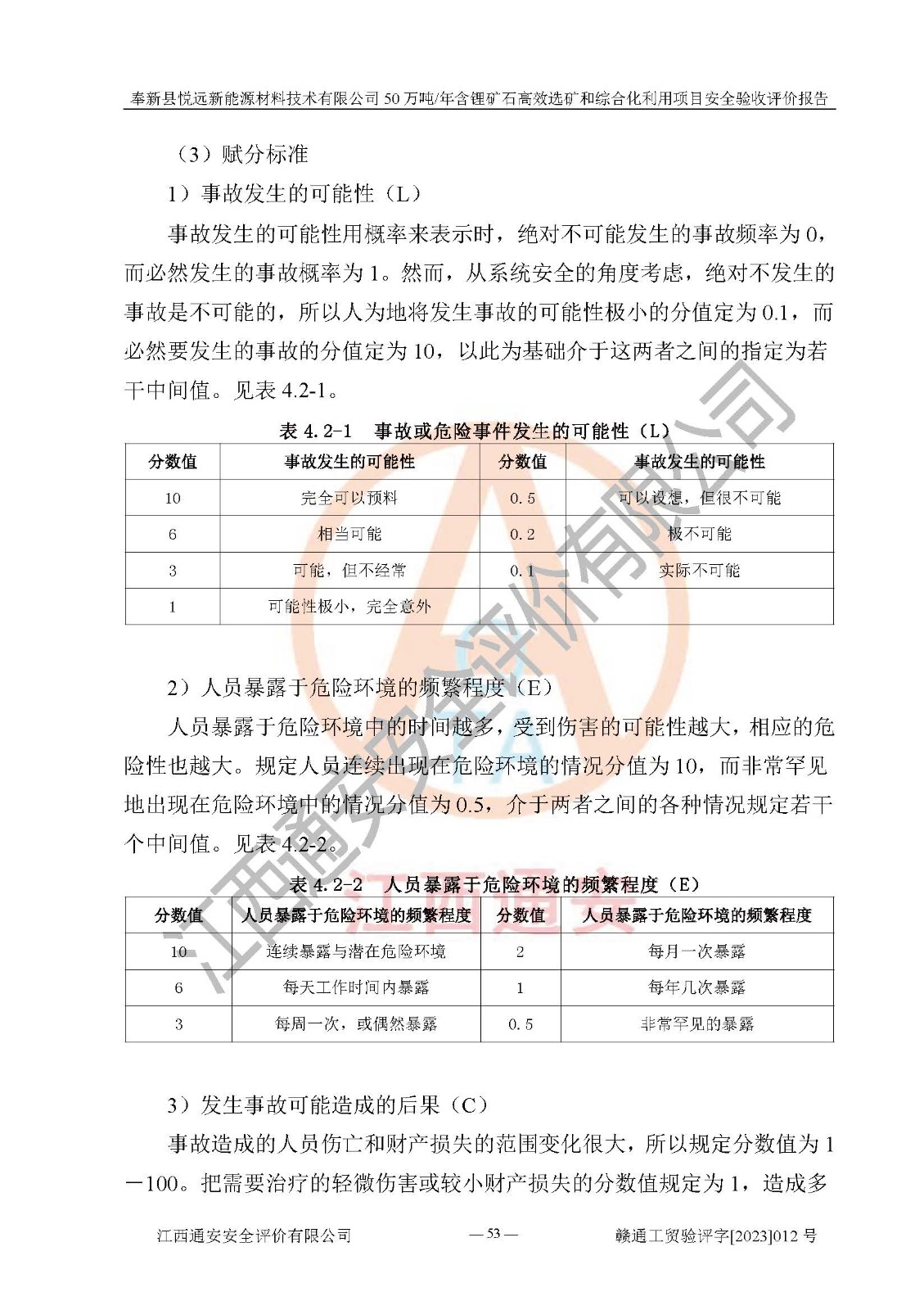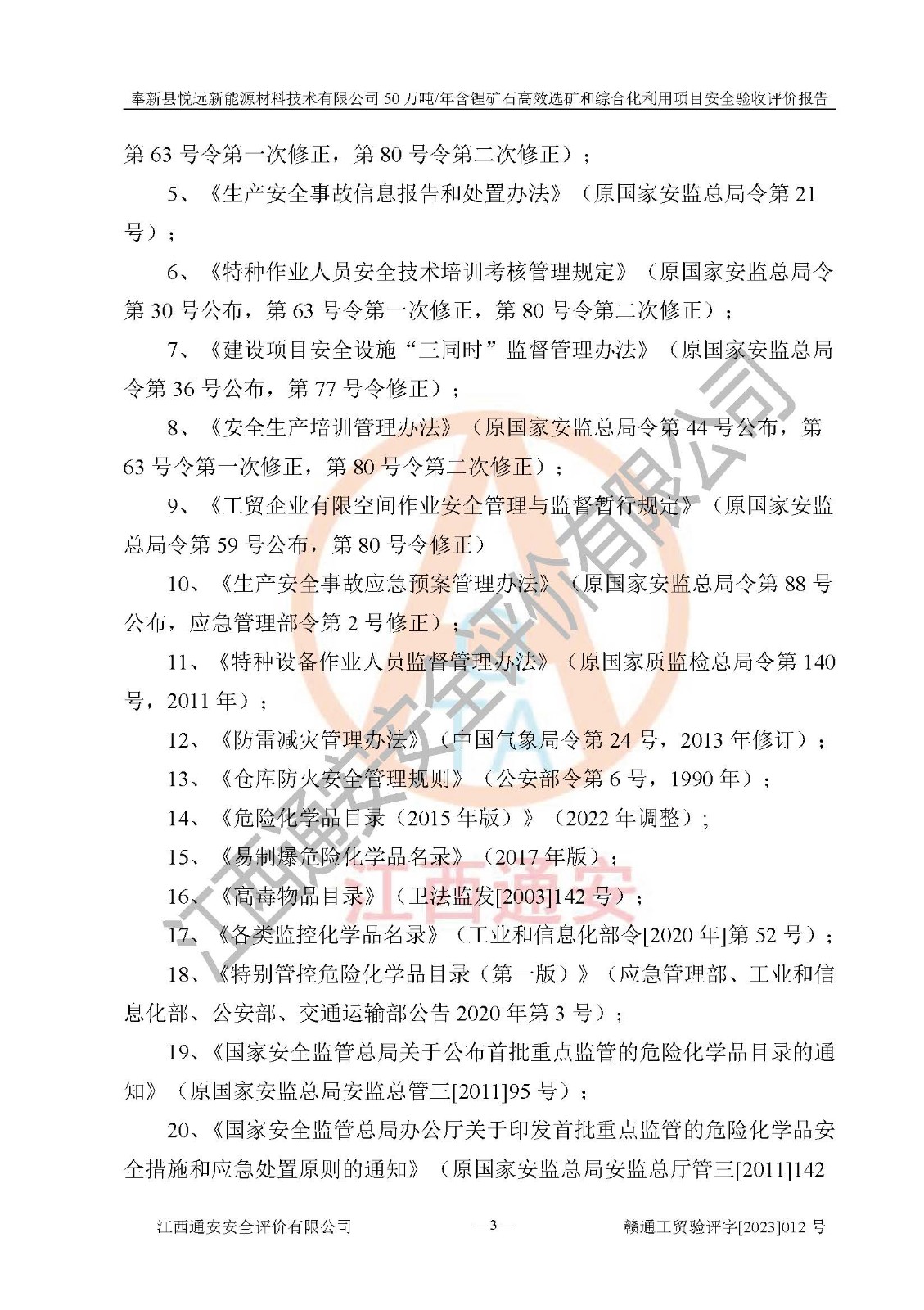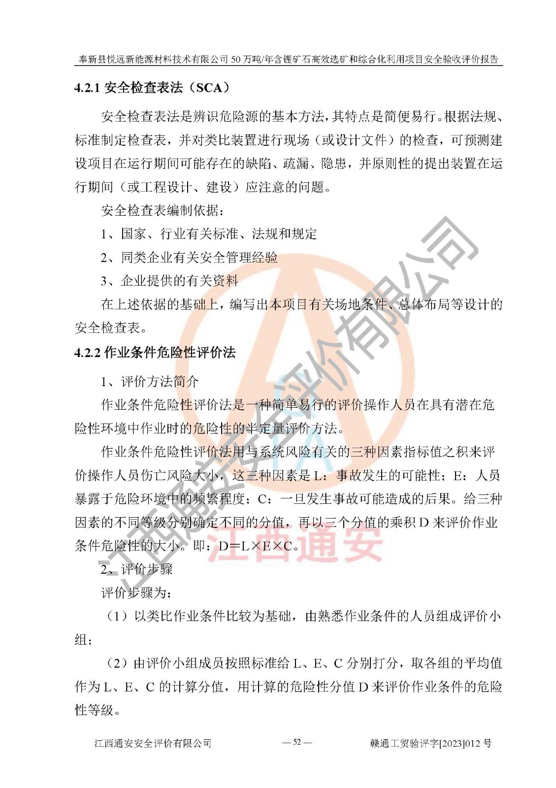 其它 | 根據(jù)《中華人民共和國(guó)安全生產(chǎn)法》、《新建項(xiàng)目安全設(shè)施“三同時(shí)”監(jiān)督管理辦法》(原**安全生產(chǎn)監(jiān)督管理總局令第77號(hào)修訂)等法律法規(guī)的要求,對(duì)奉新縣悅遠(yuǎn)新能源材料技術(shù)有限公司50萬(wàn)噸/年含鋰礦石**選礦和綜合化利用項(xiàng)目安全驗(yàn)收的基本條件進(jìn)行分析,結(jié)果如下: 1)本項(xiàng)目在初步設(shè)計(jì)及建設(shè)過程中基本能貫徹執(zhí)行**、地方及有關(guān)部門的安全生產(chǎn)法律法規(guī)、標(biāo)準(zhǔn)要求,取得了**相關(guān)部門的許可、備案。項(xiàng)目的設(shè)計(jì)、施工、監(jiān)理等單位均有相應(yīng)資質(zhì)。 2)本項(xiàng)目址選符合要求;總平面布置合理,主要建筑的防火間距符合符合《建筑設(shè)計(jì)防火規(guī)范(2018版)》(GB50016-2014)、《工業(yè)企業(yè)總平面設(shè)計(jì)規(guī)范》(GB50187-2012)有關(guān)規(guī)范、標(biāo)準(zhǔn)的要求。 3)本項(xiàng)目生產(chǎn)工藝成熟、試運(yùn)行正常,試運(yùn)行中過程中工藝和裝置、設(shè)備(設(shè)施)安全、可靠,未發(fā)生安全事故。 4)本項(xiàng)目的特種設(shè)備由有資質(zhì)單位設(shè)計(jì)、制造、安裝,未涉及監(jiān)管特種設(shè)備,符合《中華人民共和國(guó)特種設(shè)備安全法》、《特種設(shè)備安全監(jiān)察條例》(中華人民共和國(guó)***令第549號(hào))的規(guī)定。特種設(shè)備作業(yè)人員、特種作業(yè)人員均持證上崗。 5)公司主要負(fù)責(zé)人及安全管理人員已報(bào)名培訓(xùn),特種作業(yè)人員操作證在**期內(nèi),其他從業(yè)人員經(jīng)安全培訓(xùn)符合,取得上崗證。基本符合要求。 6)公司建立有安全管理制度,制定有各類人員的安全生產(chǎn)責(zé)任制、各項(xiàng)安全管理制度和操作規(guī)程。按照**有關(guān)規(guī)定編制了事故應(yīng)急救援預(yù)案并進(jìn)行了備案,并定期進(jìn)行演練等,符合要求。 7)本項(xiàng)目作業(yè)條件危險(xiǎn)性分析結(jié)果:在選定的單元的危險(xiǎn)程度均為“可能危險(xiǎn),需要注意”或“稍有危險(xiǎn),可以接受”,作業(yè)條件相對(duì)安全。 評(píng)價(jià)結(jié)論: 奉新縣悅遠(yuǎn)新能源材料技術(shù)有限公司50萬(wàn)噸/年含鋰礦石**選礦和綜合化利用項(xiàng)目的安全設(shè)施及安全管理符合**及有關(guān)部門關(guān)于安全生產(chǎn)法律、法規(guī)、標(biāo)準(zhǔn)的要求,該項(xiàng)目試生產(chǎn)以來,工藝設(shè)備、安全設(shè)施及企業(yè)安全管理機(jī)制等運(yùn)行正常,安全設(shè)施、措施達(dá)到設(shè)計(jì)要求和預(yù)期結(jié)果,可以滿足建設(shè)項(xiàng)目安全生產(chǎn)的要求,安全生產(chǎn)管理**,具備竣工驗(yàn)收條件。 | ||||