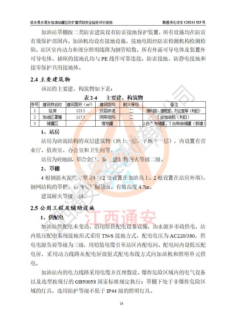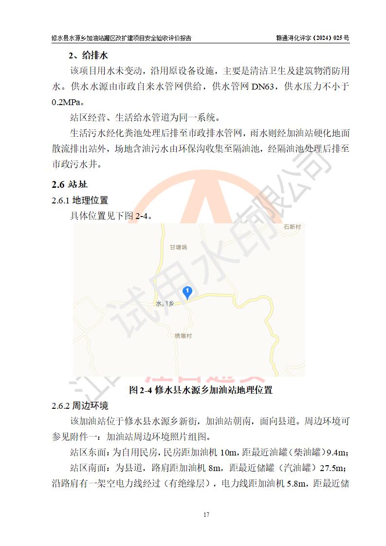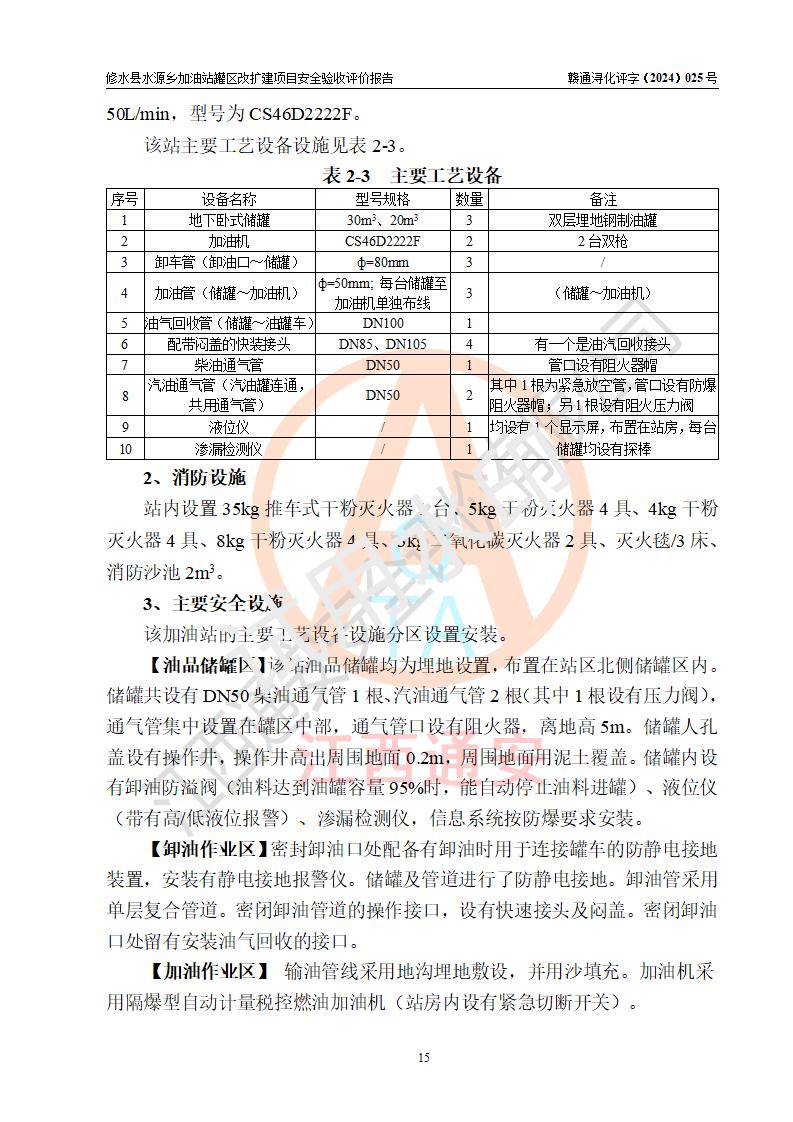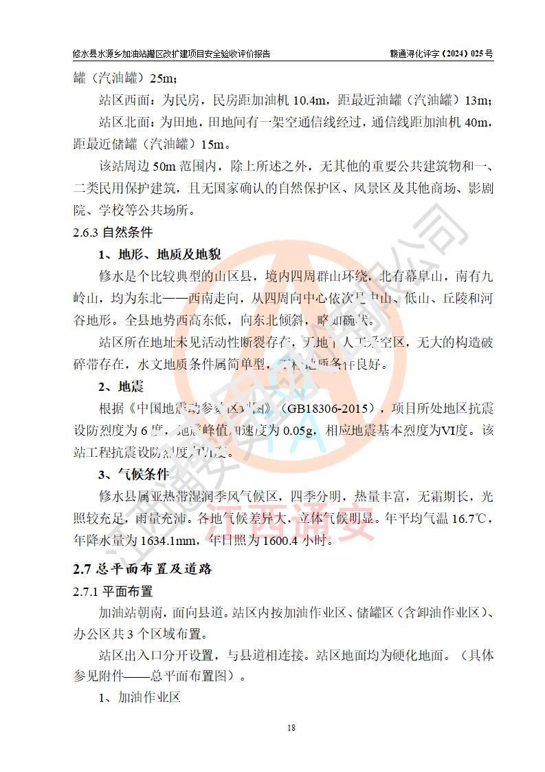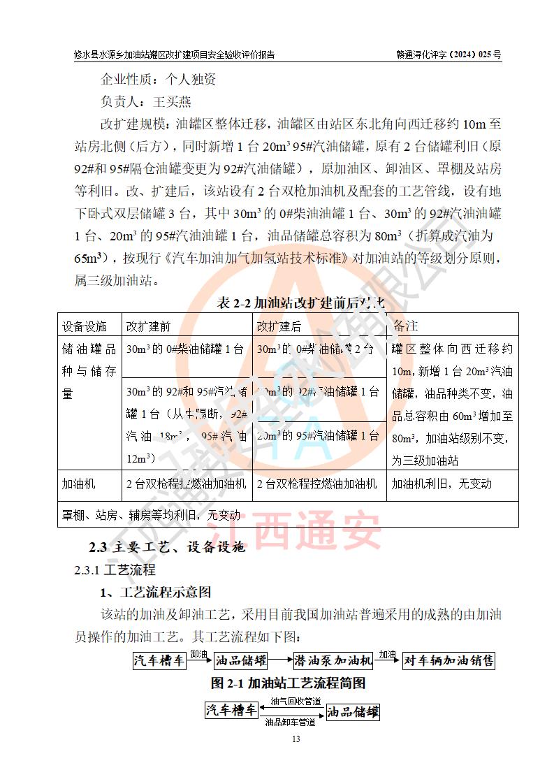 項(xiàng)目簡(jiǎn)介 | 修水縣水源鄉(xiāng)加油站是一家專(zhuān)門(mén)從事成品油(汽油、柴油)零售經(jīng)營(yíng)的個(gè)體工商戶(hù),注冊(cè)日期2014年07月09日,法定**人:王參華,經(jīng)營(yíng)場(chǎng)所位于九江市修水縣水源鄉(xiāng)新街。 因加油站已運(yùn)行多年,加油站油罐區(qū)周邊設(shè)施部分存在老化,為滿(mǎn)足周邊群眾用油需求、完善加油站設(shè)施設(shè)備的安全運(yùn)行能力,水源鄉(xiāng)加油站對(duì)油罐區(qū)進(jìn)行改建,同時(shí)新增1臺(tái)20m3汽油儲(chǔ)罐。 水源鄉(xiāng)加油站油罐區(qū)改、擴(kuò)建項(xiàng)目主要內(nèi)容為油罐區(qū)整體遷移,油罐區(qū)由站區(qū)東北角向西遷移約10m至站房北側(cè)(后方),同時(shí)新增1臺(tái)20m395#汽油儲(chǔ)罐,原有2臺(tái)儲(chǔ)罐利舊(原92#和95#隔倉(cāng)油罐變更為92#汽油儲(chǔ)罐),原加油區(qū)、卸油區(qū)、罩棚及站房等利舊。改、擴(kuò)建后,該站設(shè)有2臺(tái)雙槍加油機(jī)及配套的工藝管線,設(shè)有地下臥式雙層儲(chǔ)罐3臺(tái),其中30m3的0#柴油油罐1臺(tái)、30m3的92#汽油油罐1臺(tái)、20m3的95#汽油油罐1臺(tái),油品儲(chǔ)罐總?cè)莘e為80m3(折算成汽油為65m3),按現(xiàn)行《汽車(chē)加油加氣加氫站技術(shù)標(biāo)準(zhǔn)》對(duì)加油站的等級(jí)劃分原則,屬三級(jí)加油站。 | |||