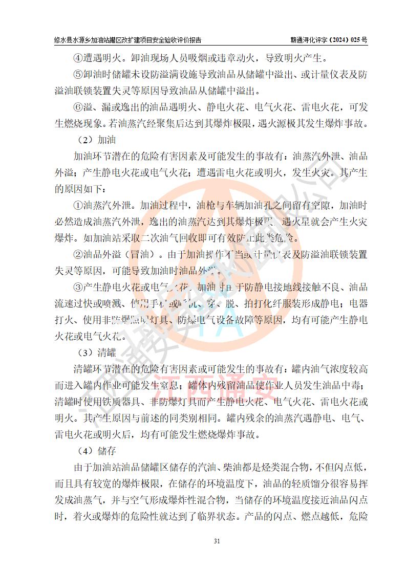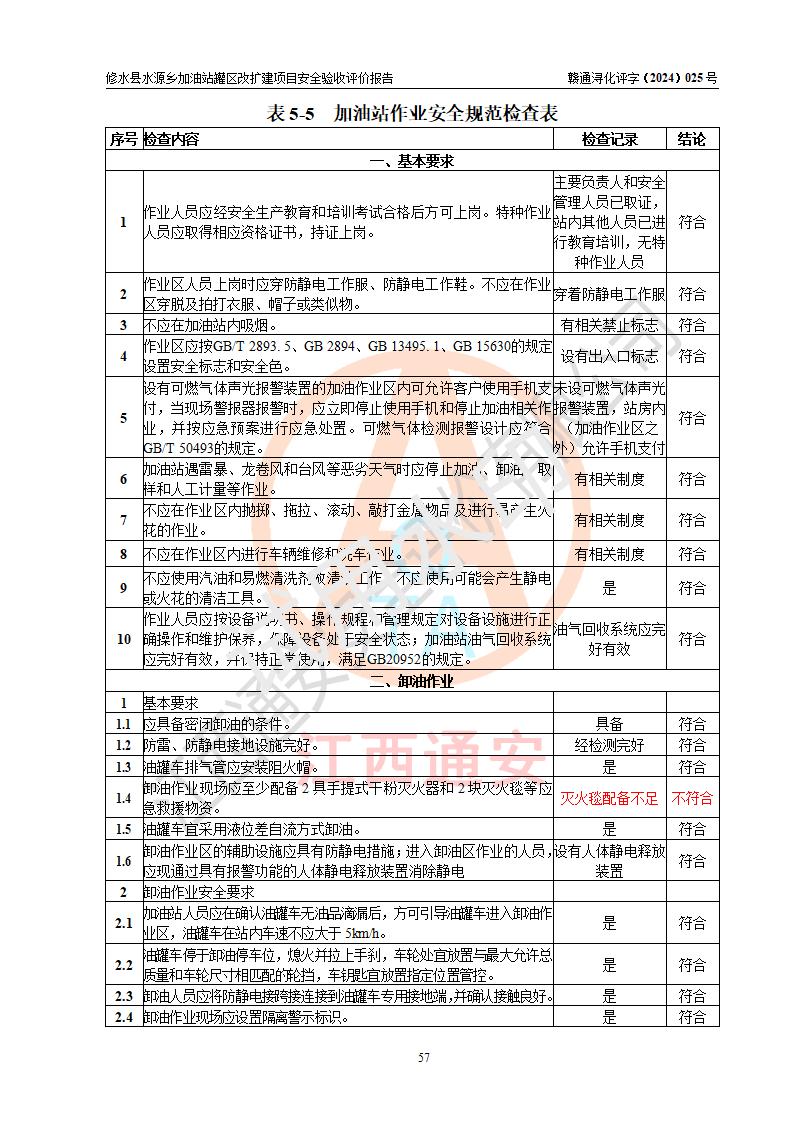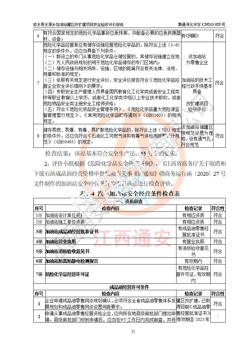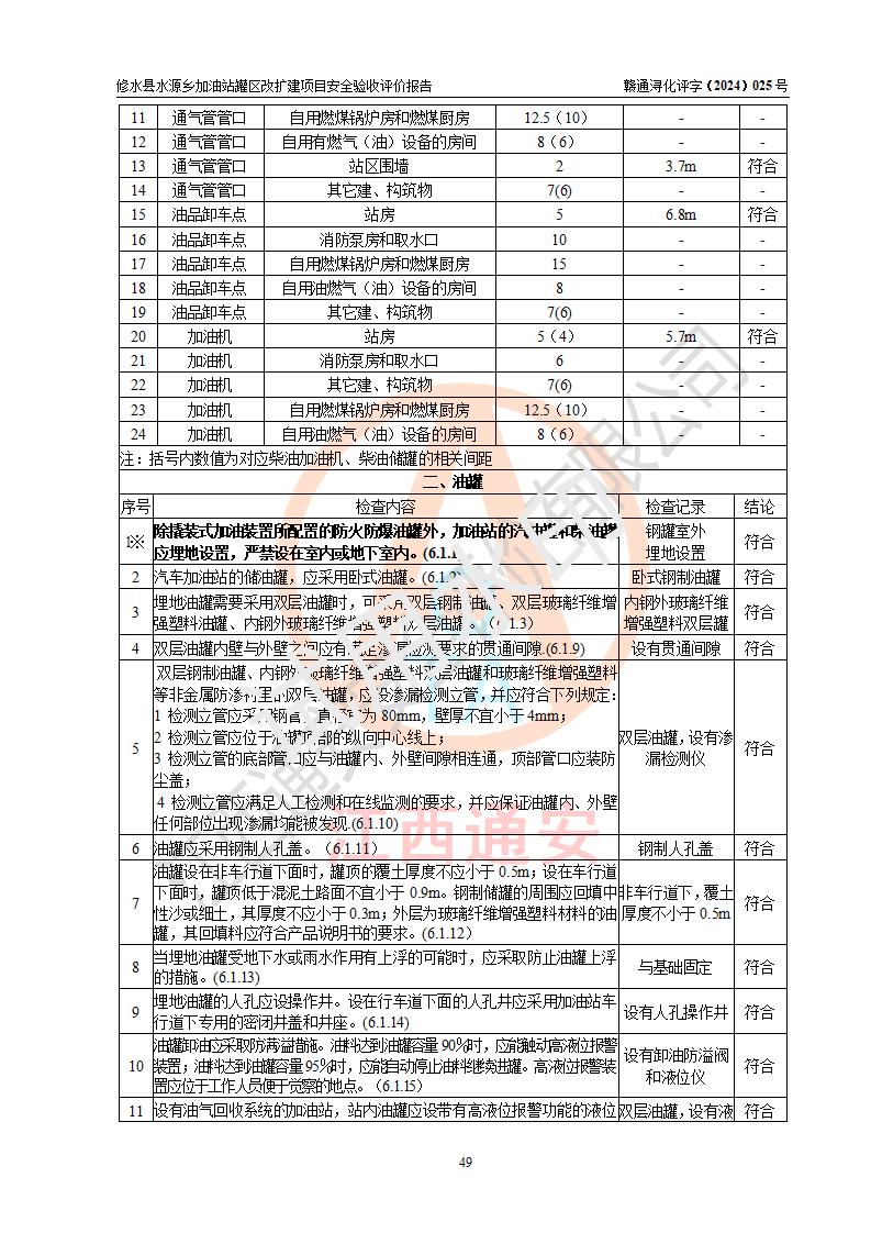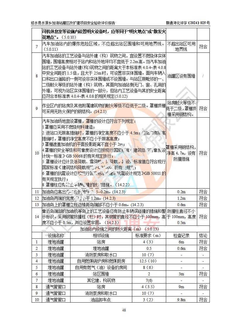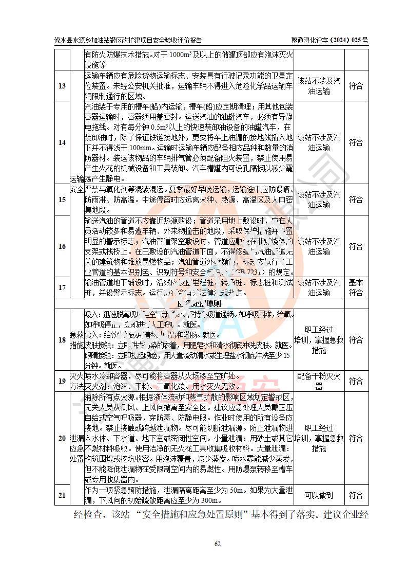 評(píng)價(jià)結(jié)論 | 修水縣水源鄉(xiāng)加油站罐區(qū)改擴(kuò)建項(xiàng)目涉及的安全條件、安全生產(chǎn)條件、安全生產(chǎn)管理符合《危險(xiǎn)化學(xué)品經(jīng)營(yíng)許可證管理辦法》、《汽車(chē)加油加氣加氫站技術(shù)標(biāo)準(zhǔn)》等**有關(guān)法規(guī)、標(biāo)準(zhǔn)、規(guī)范要求,能滿(mǎn)足成品油零售經(jīng)營(yíng)單位的安全條件,具備項(xiàng)目竣工驗(yàn)收的條件。 | |||