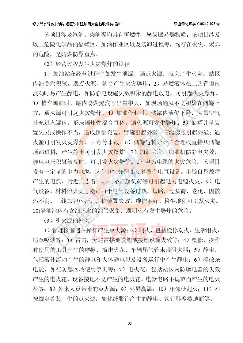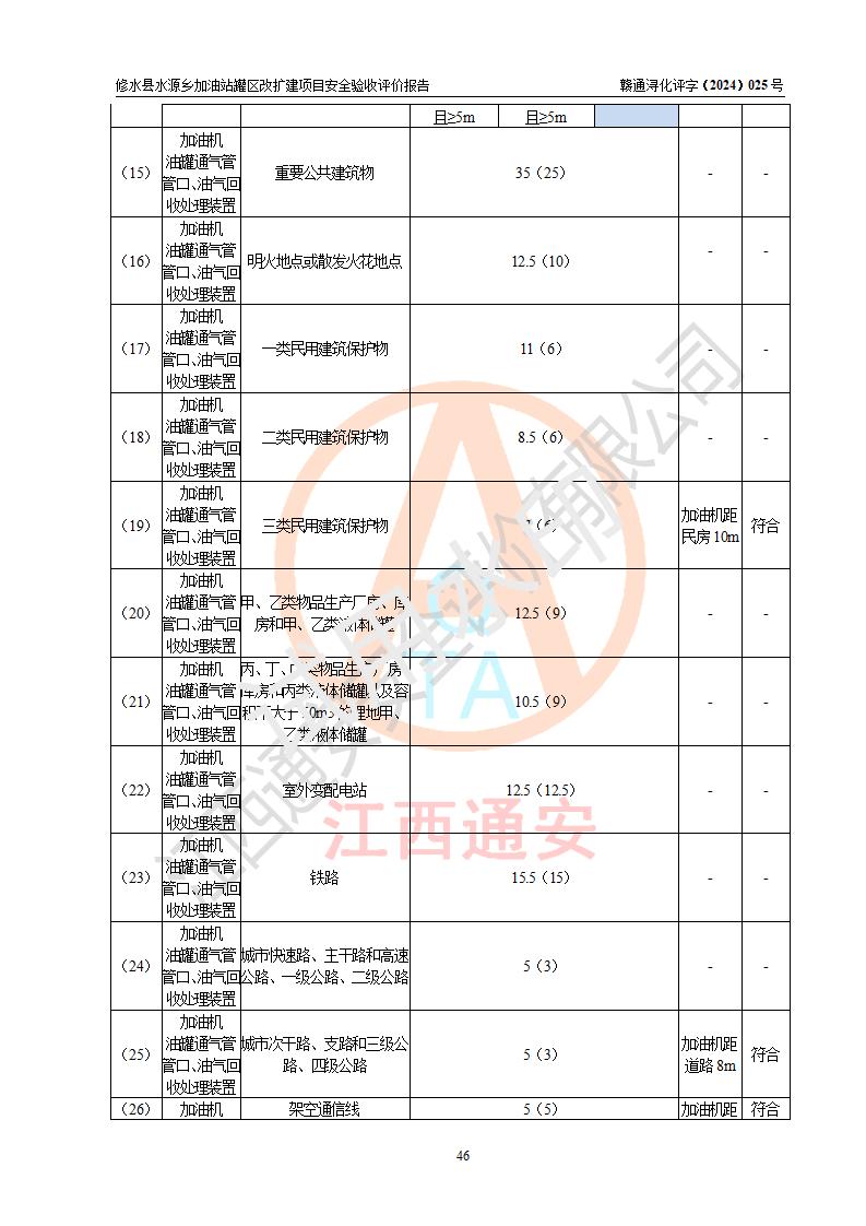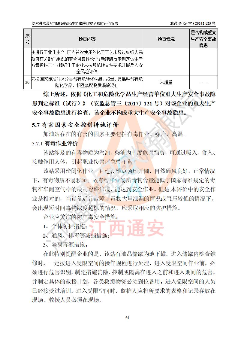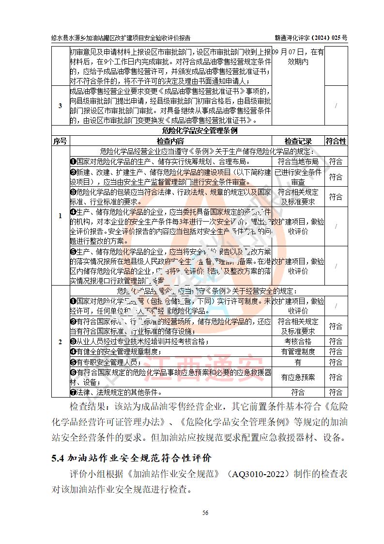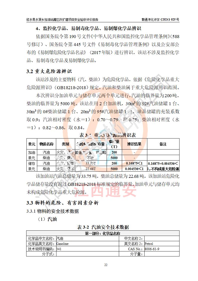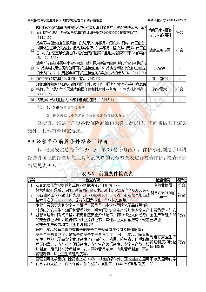 評(píng)價(jià)結(jié)論 | 修水縣水源鄉(xiāng)加油站罐區(qū)改擴(kuò)建項(xiàng)目涉及的安全條件、安全生產(chǎn)條件、安全生產(chǎn)管理符合《危險(xiǎn)化學(xué)品經(jīng)營(yíng)許可證管理辦法》、《汽車(chē)加油加氣加氫站技術(shù)標(biāo)準(zhǔn)》等**有關(guān)法規(guī)、標(biāo)準(zhǔn)、規(guī)范要求,能滿(mǎn)足成品油零售經(jīng)營(yíng)單位的安全條件,具備項(xiàng)目竣工驗(yàn)收的條件。 | |||