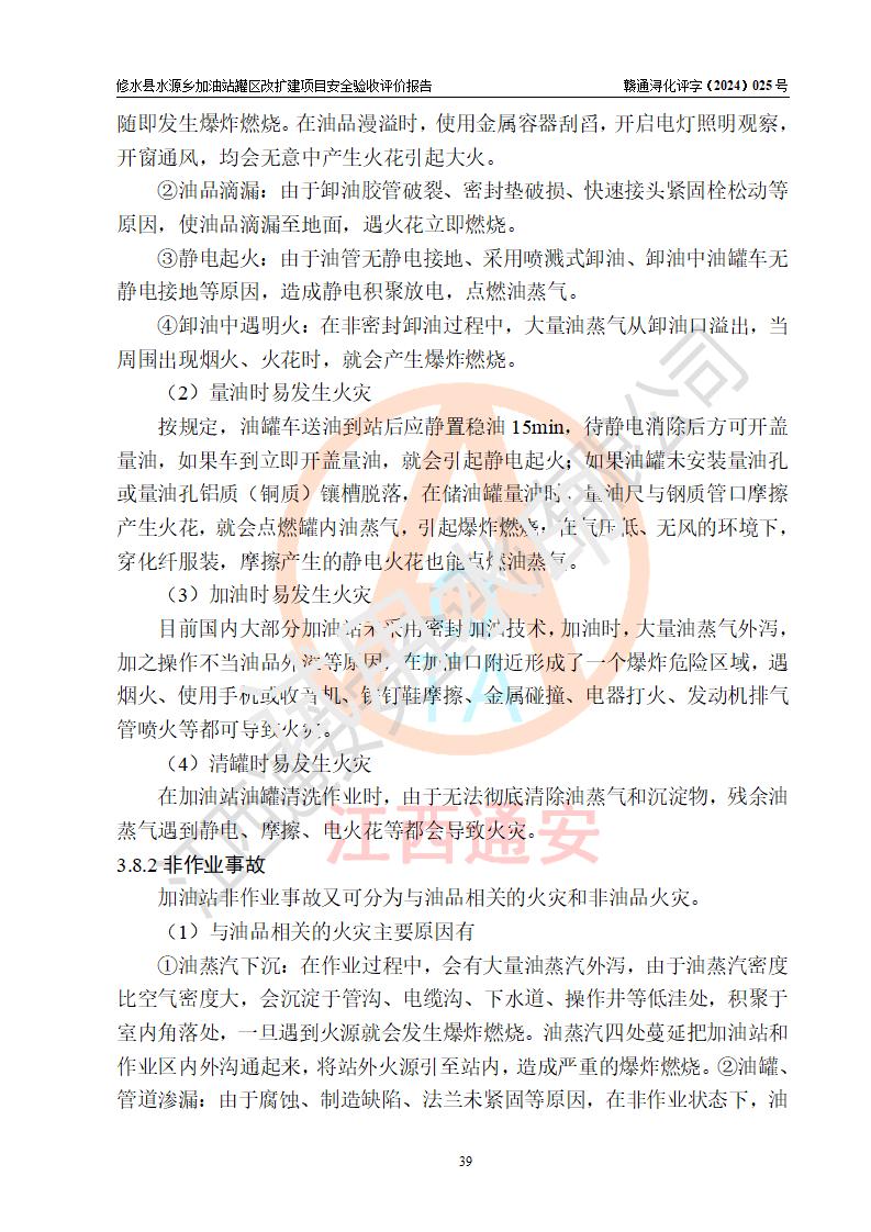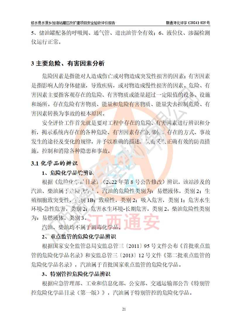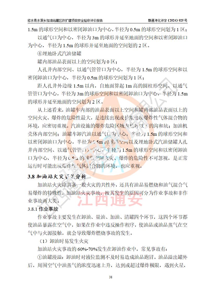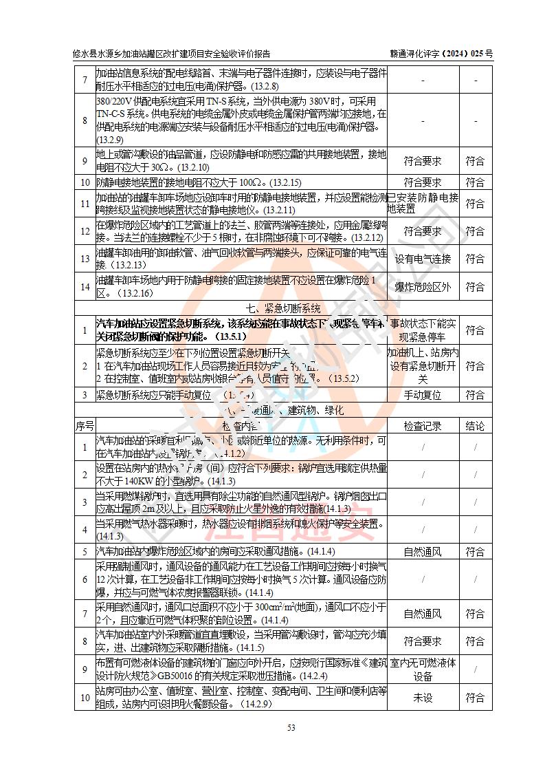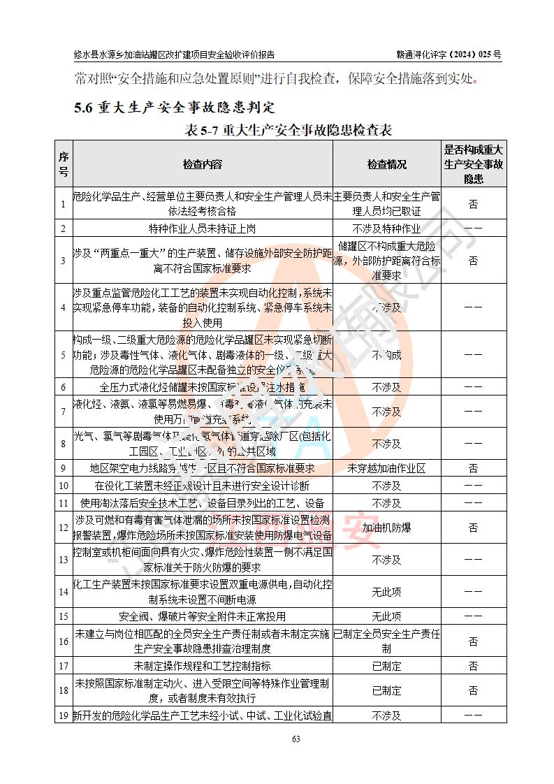 評(píng)價(jià)結(jié)論 | 修水縣水源鄉(xiāng)加油站罐區(qū)改擴(kuò)建項(xiàng)目涉及的安全條件、安全生產(chǎn)條件、安全生產(chǎn)管理符合《危險(xiǎn)化學(xué)品經(jīng)營(yíng)許可證管理辦法》、《汽車(chē)加油加氣加氫站技術(shù)標(biāo)準(zhǔn)》等**有關(guān)法規(guī)、標(biāo)準(zhǔn)、規(guī)范要求,能滿(mǎn)足成品油零售經(jīng)營(yíng)單位的安全條件,具備項(xiàng)目竣工驗(yàn)收的條件。 | |||
