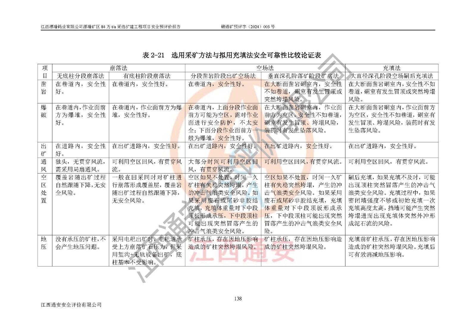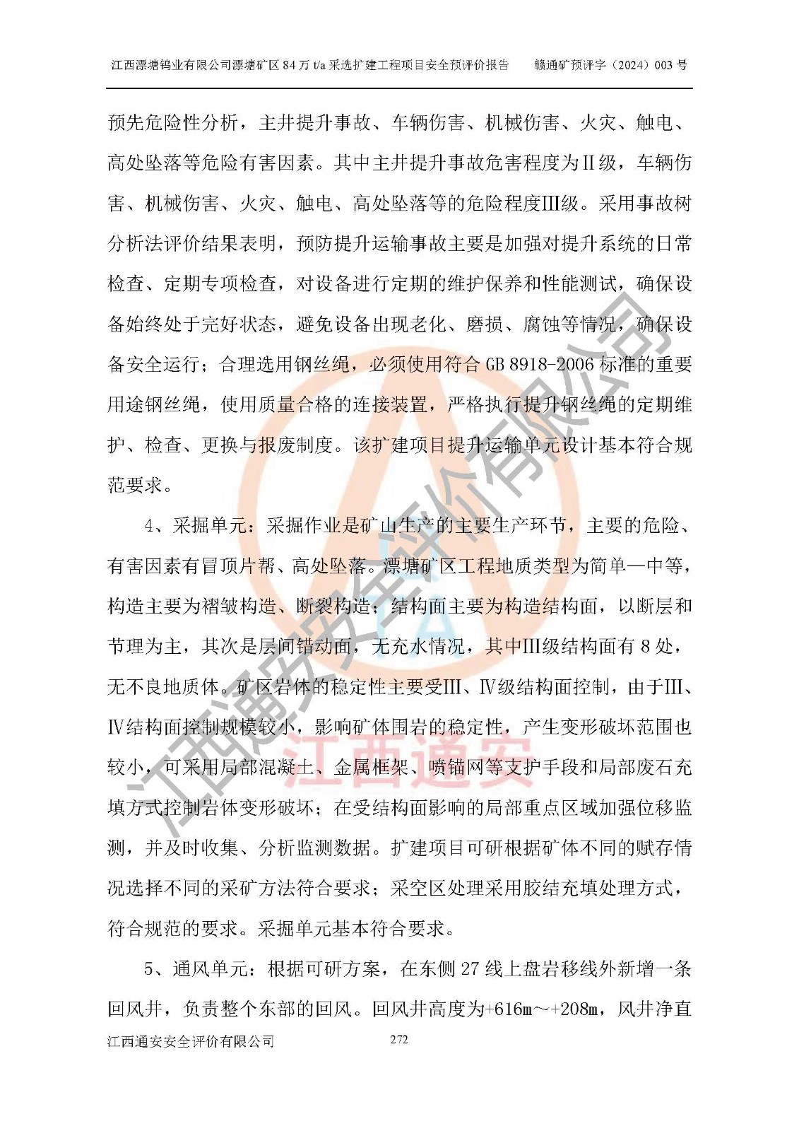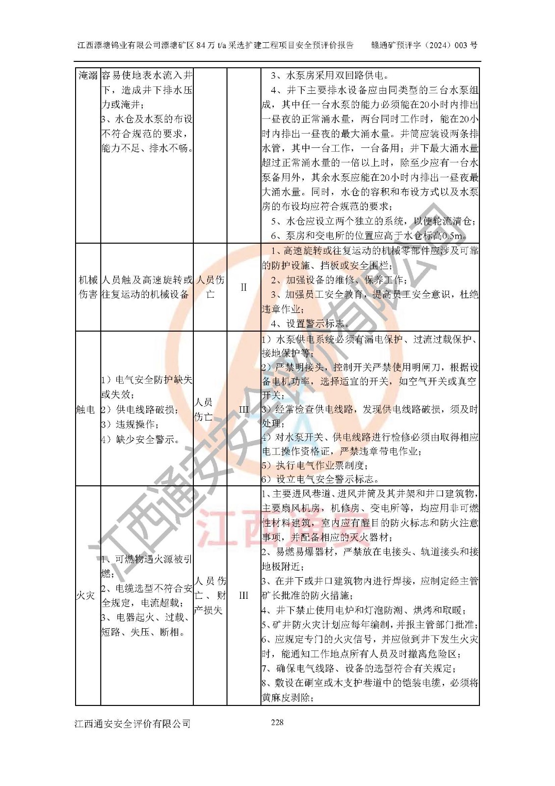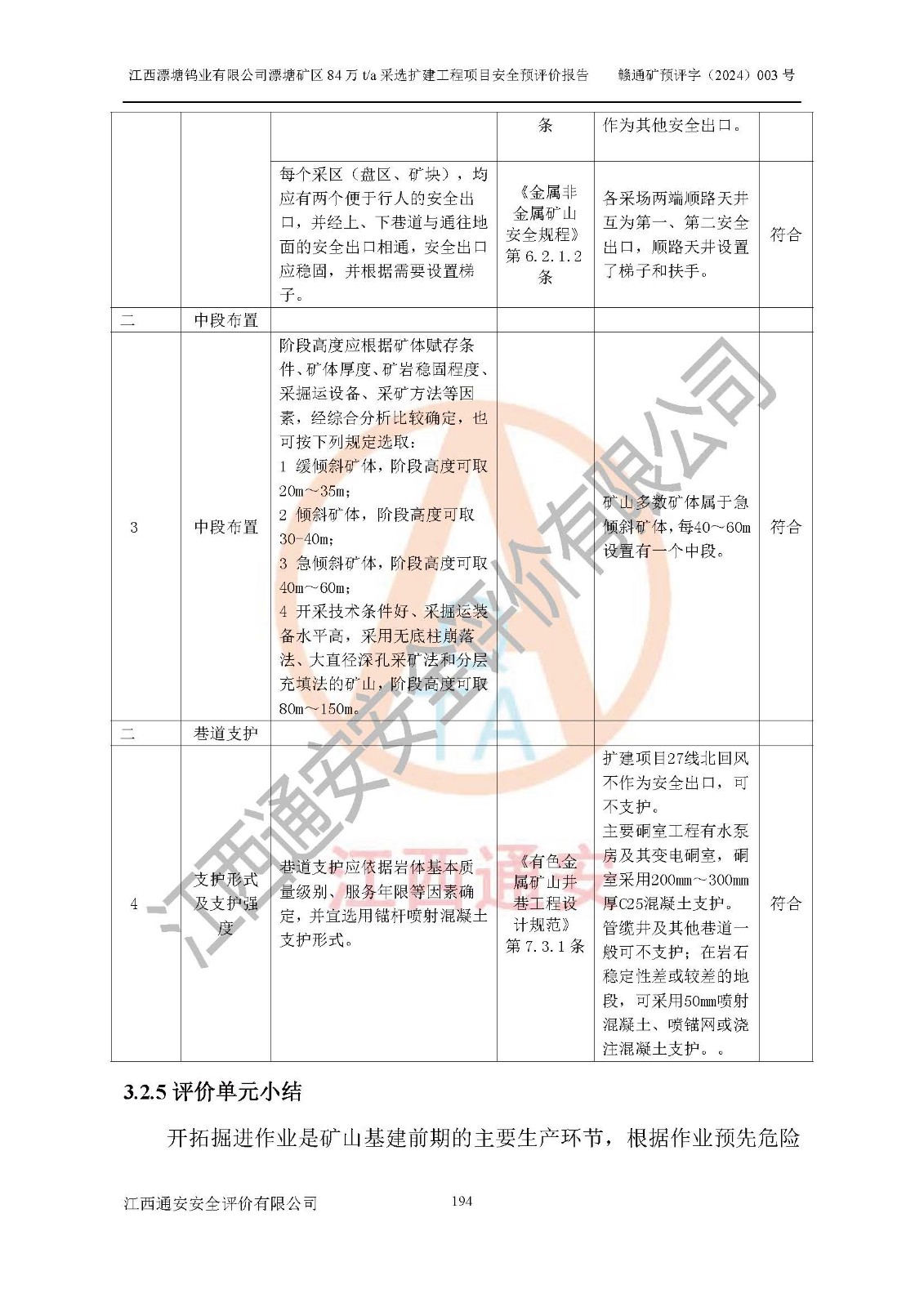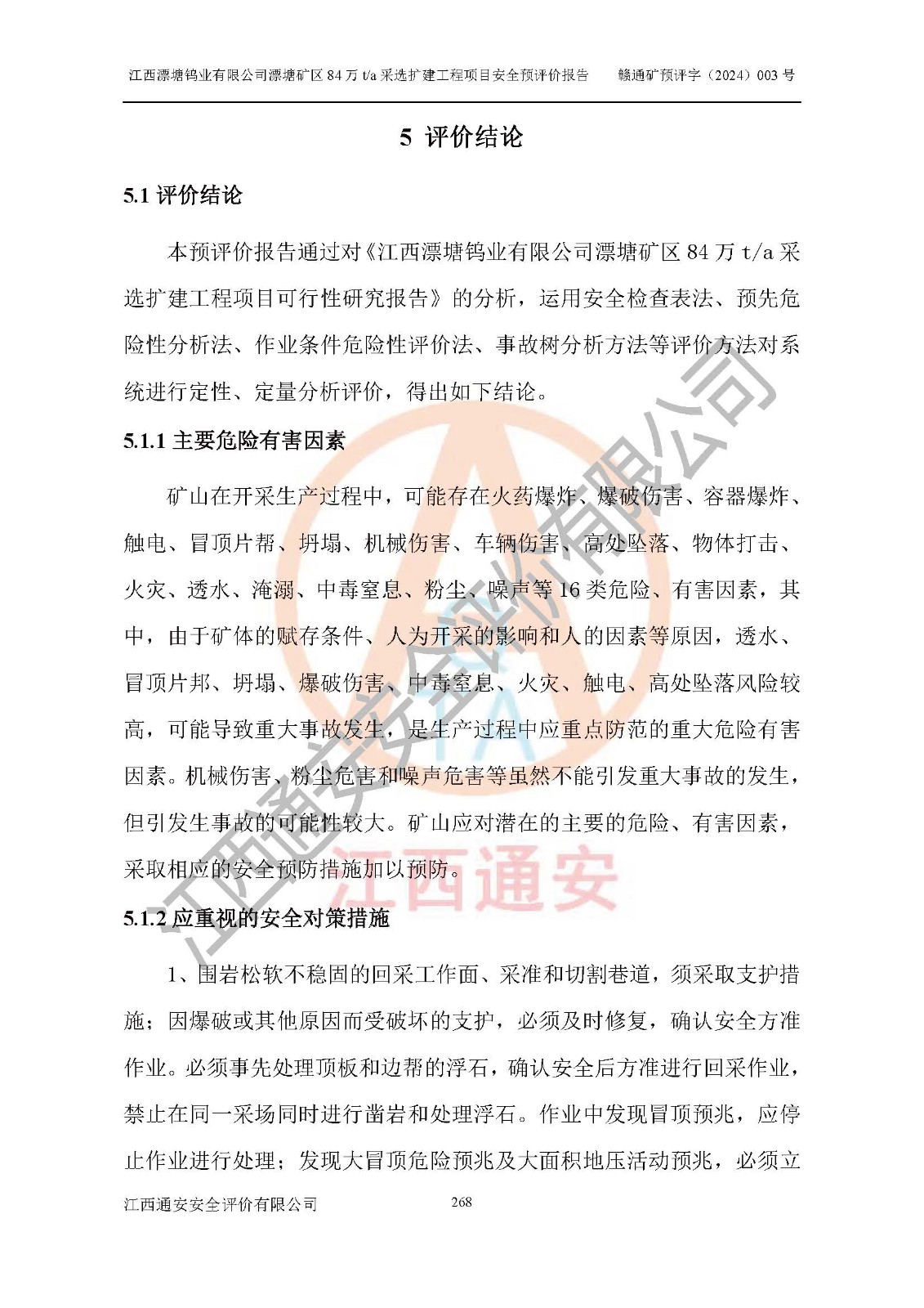 其它 | 江西漂塘鎢業(yè)有限公司漂塘礦區(qū)84萬(wàn)噸/年采選擴(kuò)建工程方案可行、選用的工藝和設(shè)備成熟、系統(tǒng)總體可靠,礦山具有建設(shè)、生產(chǎn)和管理的經(jīng)驗(yàn)和基礎(chǔ),在采納《可研報(bào)告》和本安全預(yù)評(píng)價(jià)報(bào)告提出的安全對(duì)策措施的基礎(chǔ)上,嚴(yán)把工程建設(shè)質(zhì)量關(guān)和現(xiàn)場(chǎng)安全管理,安全設(shè)施做到與主體工程同時(shí)設(shè)計(jì)、同時(shí)施工、同時(shí)投產(chǎn)使用,該擴(kuò)建工程安全風(fēng)險(xiǎn)處在可接受的范圍,符合**有關(guān)安全生產(chǎn)法律、法規(guī)、規(guī)章、標(biāo)準(zhǔn)和規(guī)范的要求。 | ||||