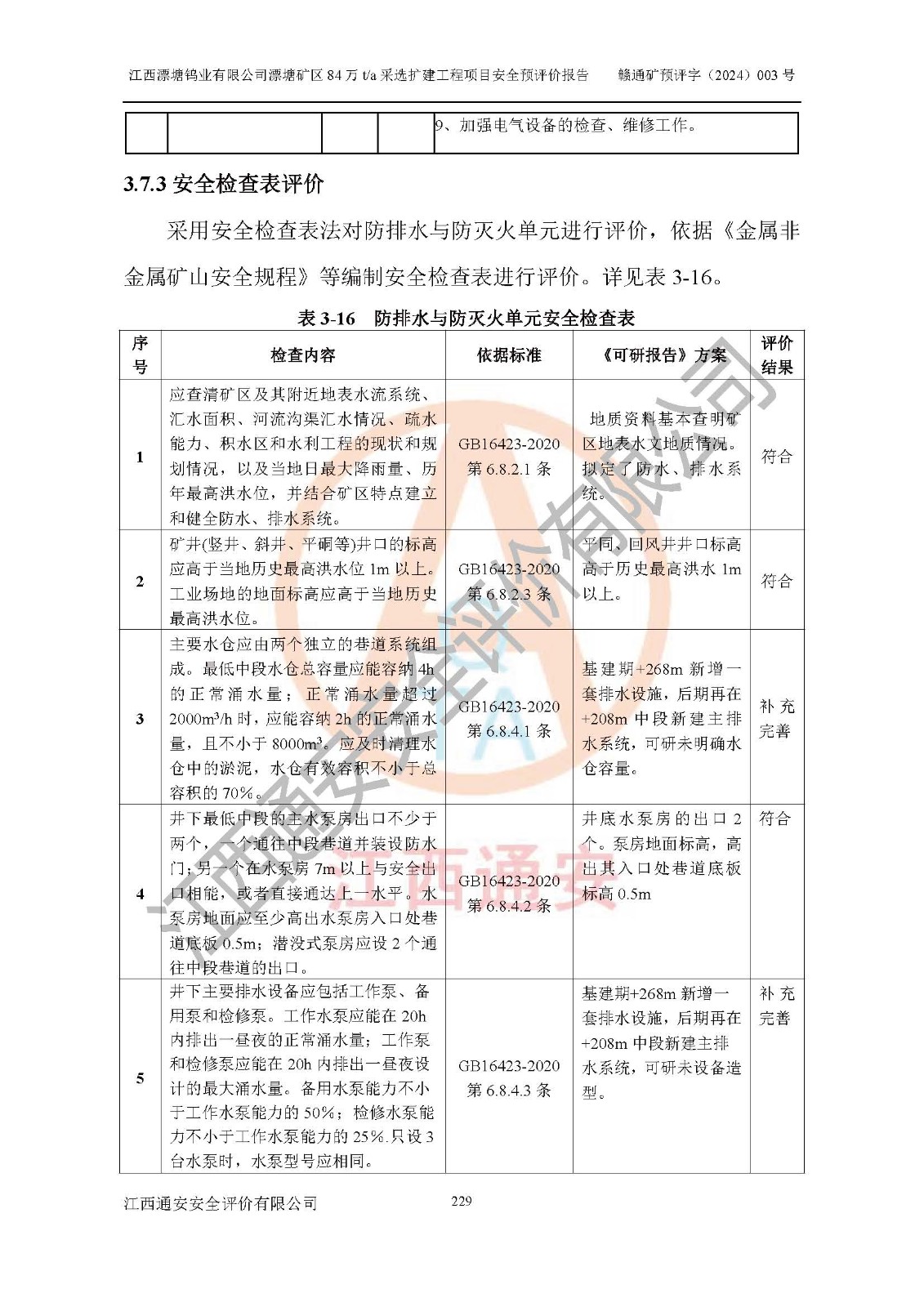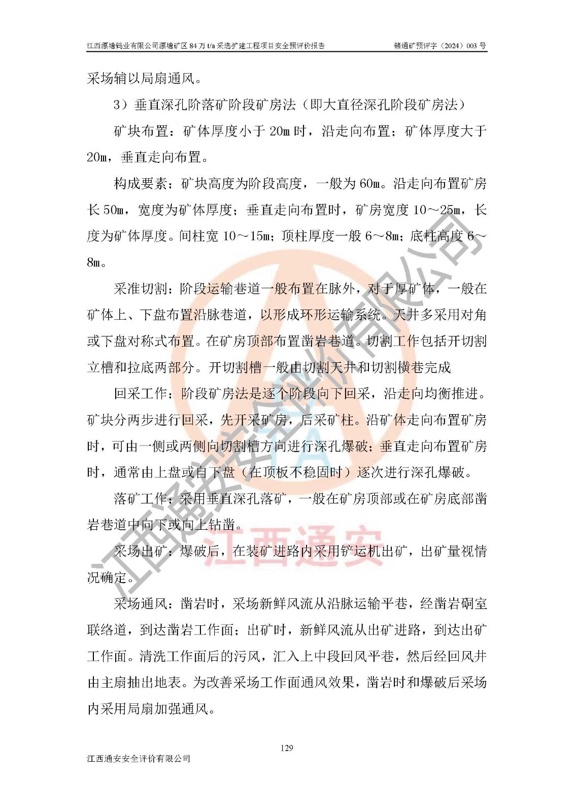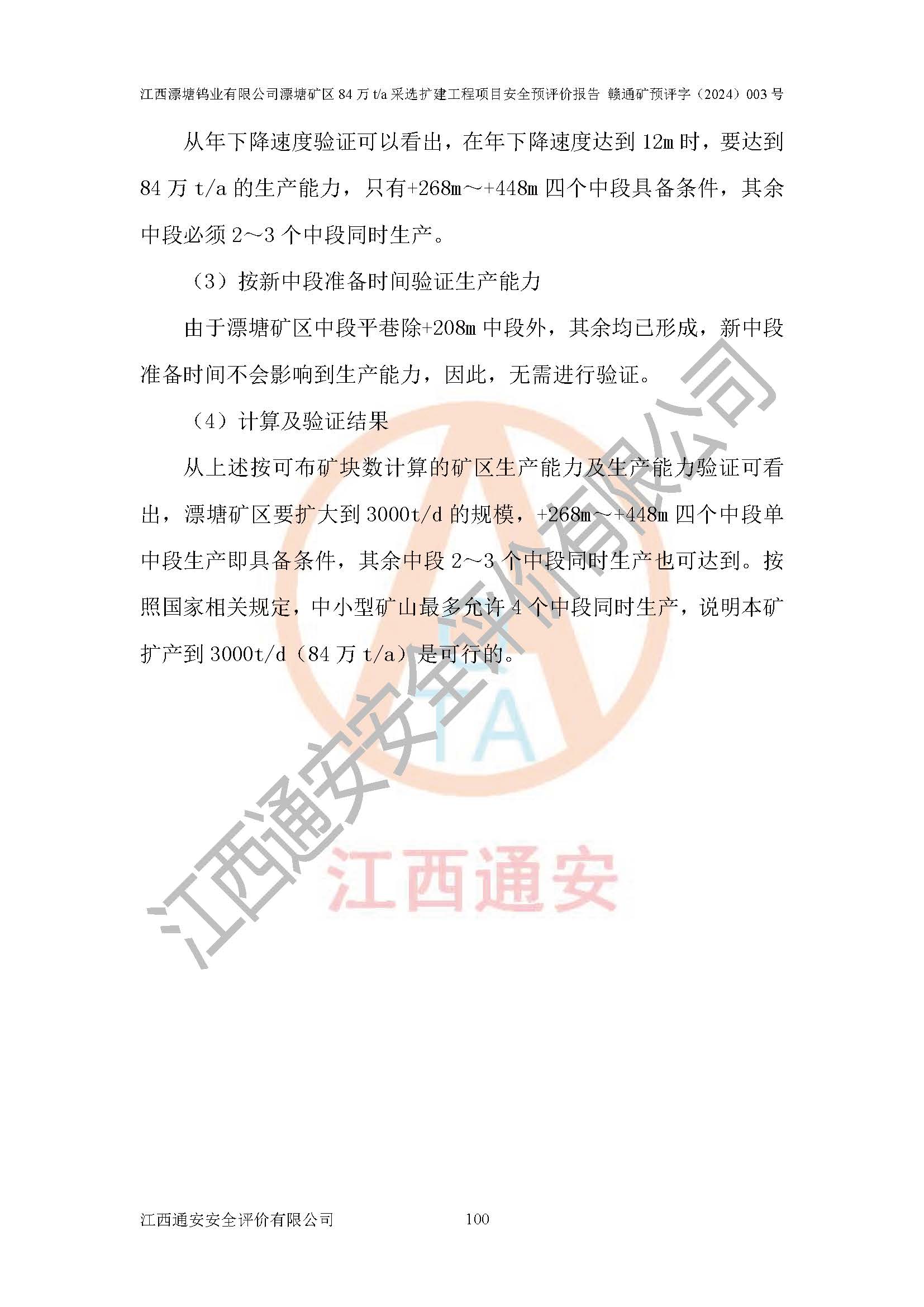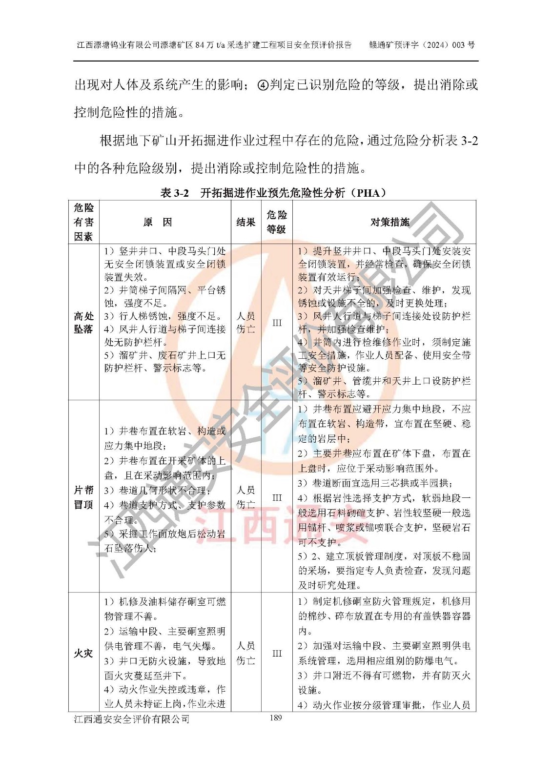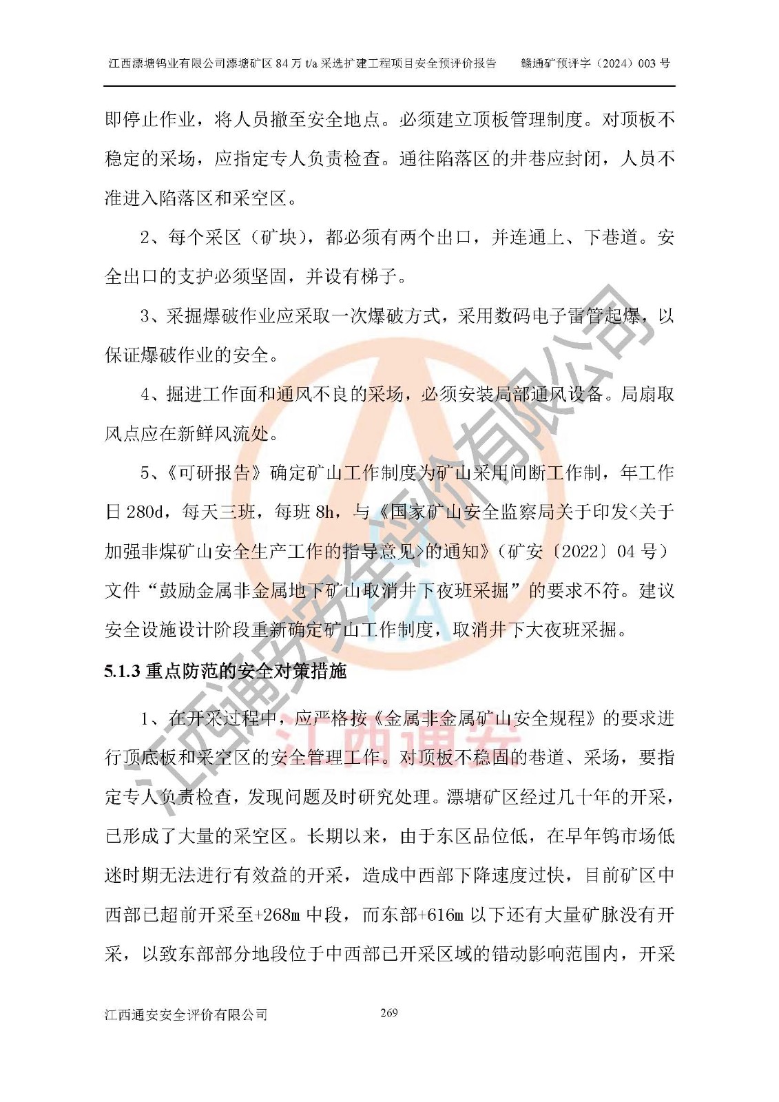其它 | 江西漂塘鎢業(yè)有限公司漂塘礦區(qū)84萬(wàn)噸/年采選擴(kuò)建工程方案可行、選用的工藝和設(shè)備成熟、系統(tǒng)總體可靠,礦山具有建設(shè)、生產(chǎn)和管理的經(jīng)驗(yàn)和基礎(chǔ),在采納《可研報(bào)告》和本安全預(yù)評(píng)價(jià)報(bào)告提出的安全對(duì)策措施的基礎(chǔ)上,嚴(yán)把工程建設(shè)質(zhì)量關(guān)和現(xiàn)場(chǎng)安全管理,安全設(shè)施做到與主體工程同時(shí)設(shè)計(jì)、同時(shí)施工、同時(shí)投產(chǎn)使用,該擴(kuò)建工程安全風(fēng)險(xiǎn)處在可接受的范圍,符合**有關(guān)安全生產(chǎn)法律、法規(guī)、規(guī)章、標(biāo)準(zhǔn)和規(guī)范的要求。 | ||||