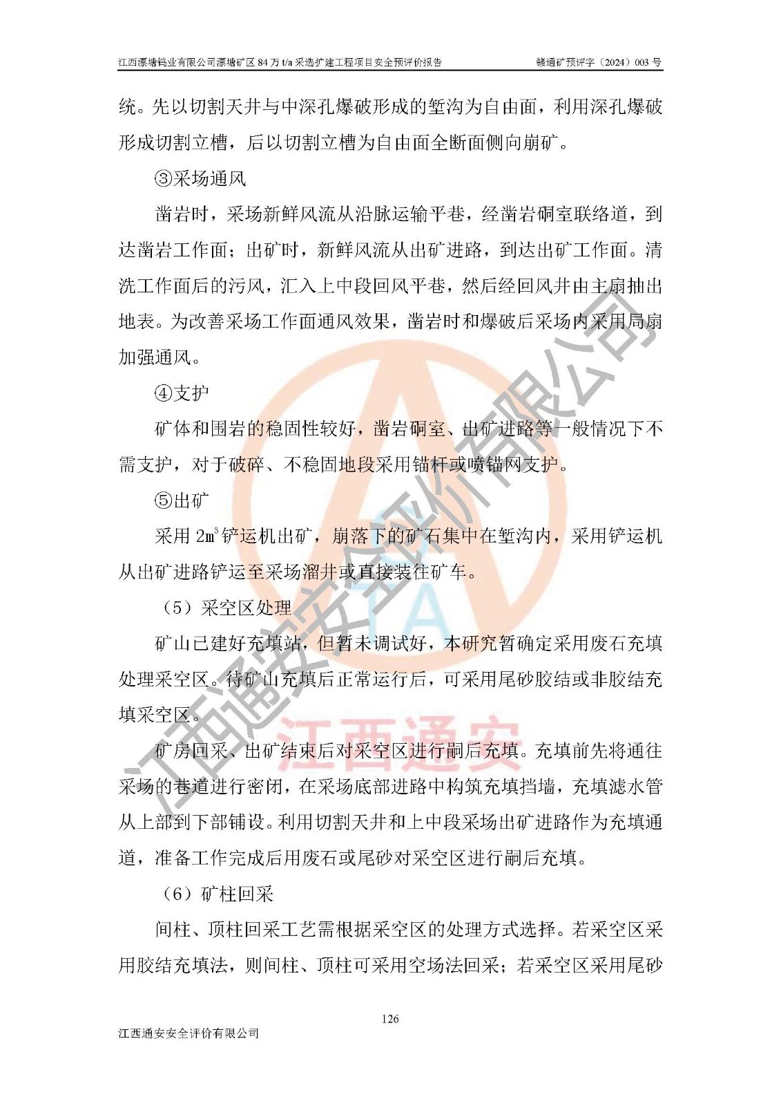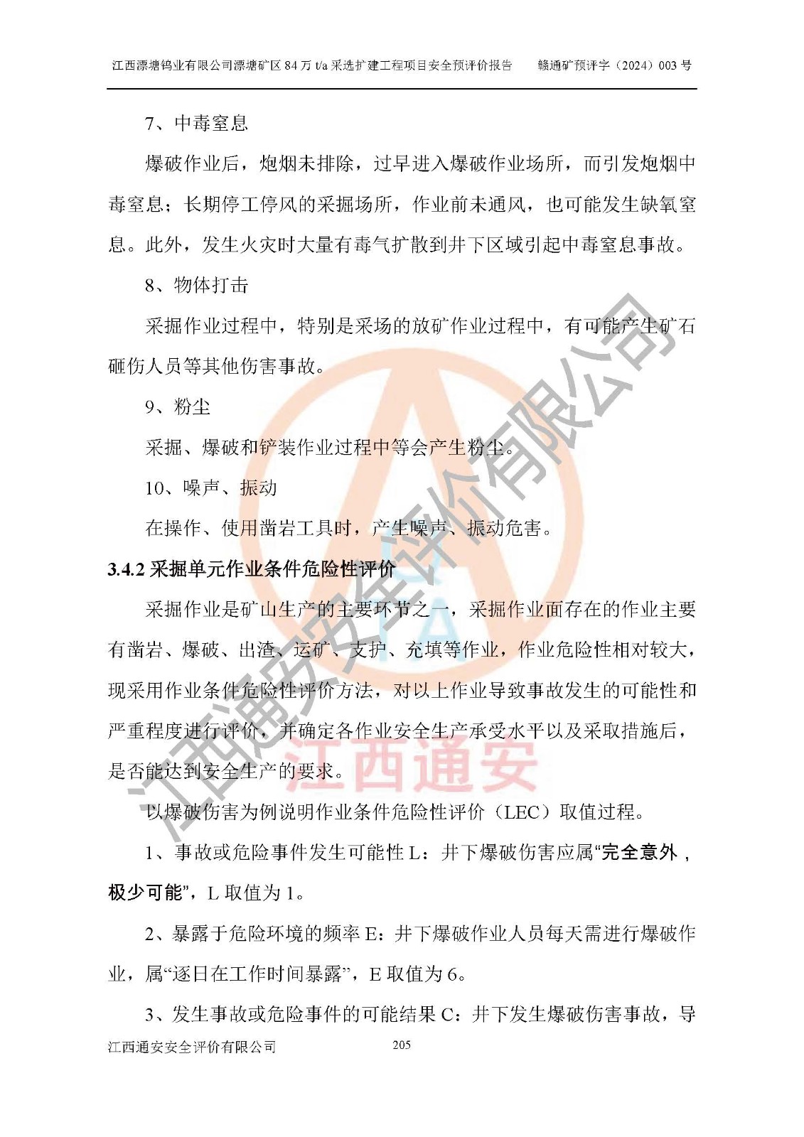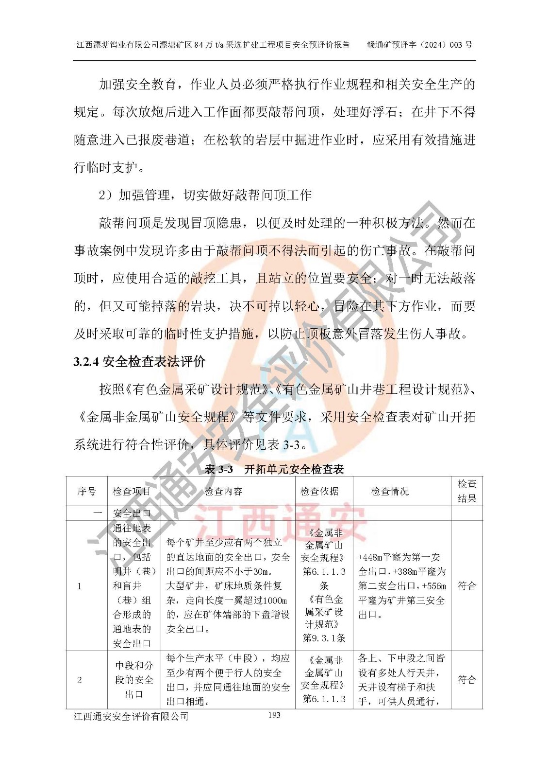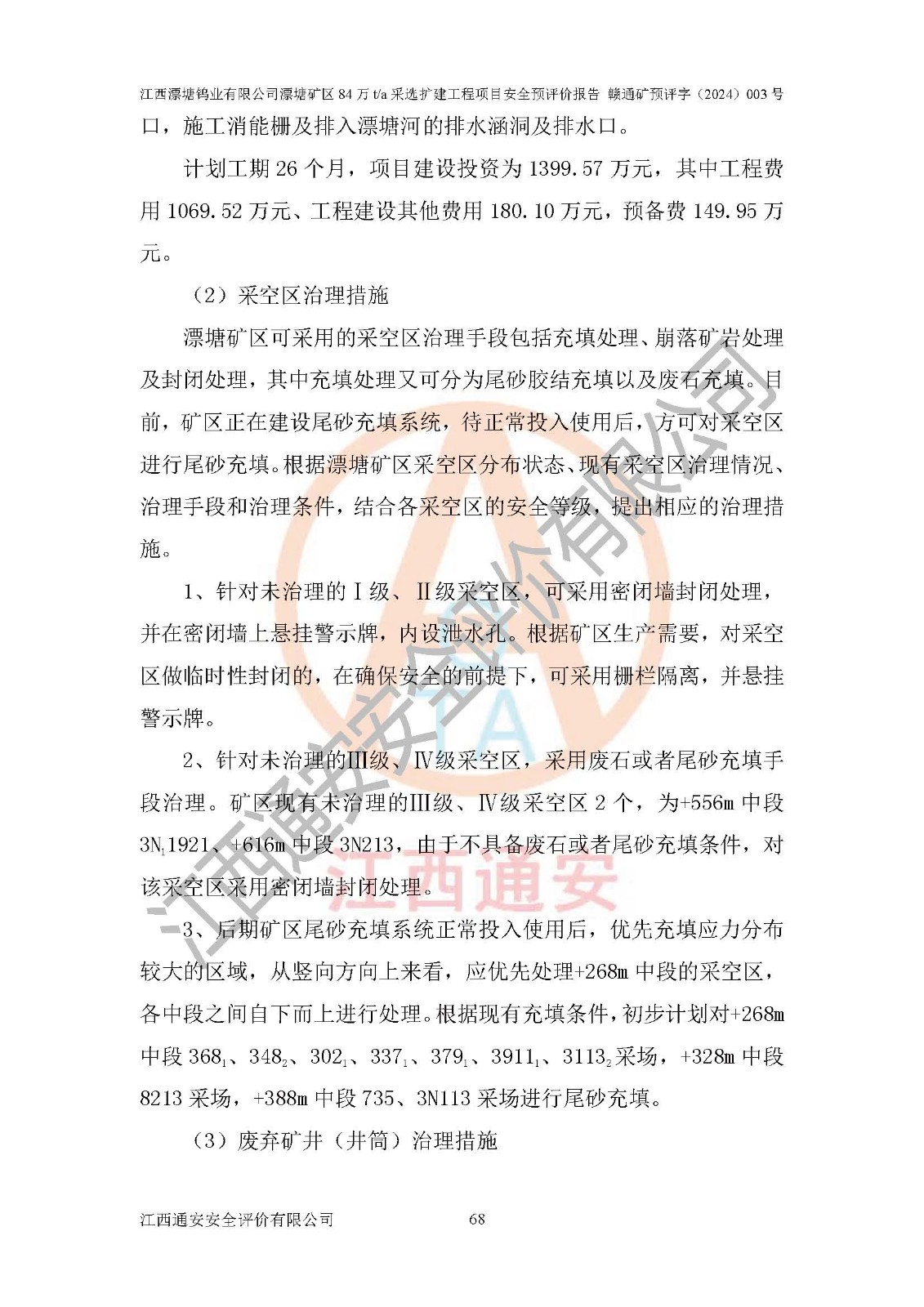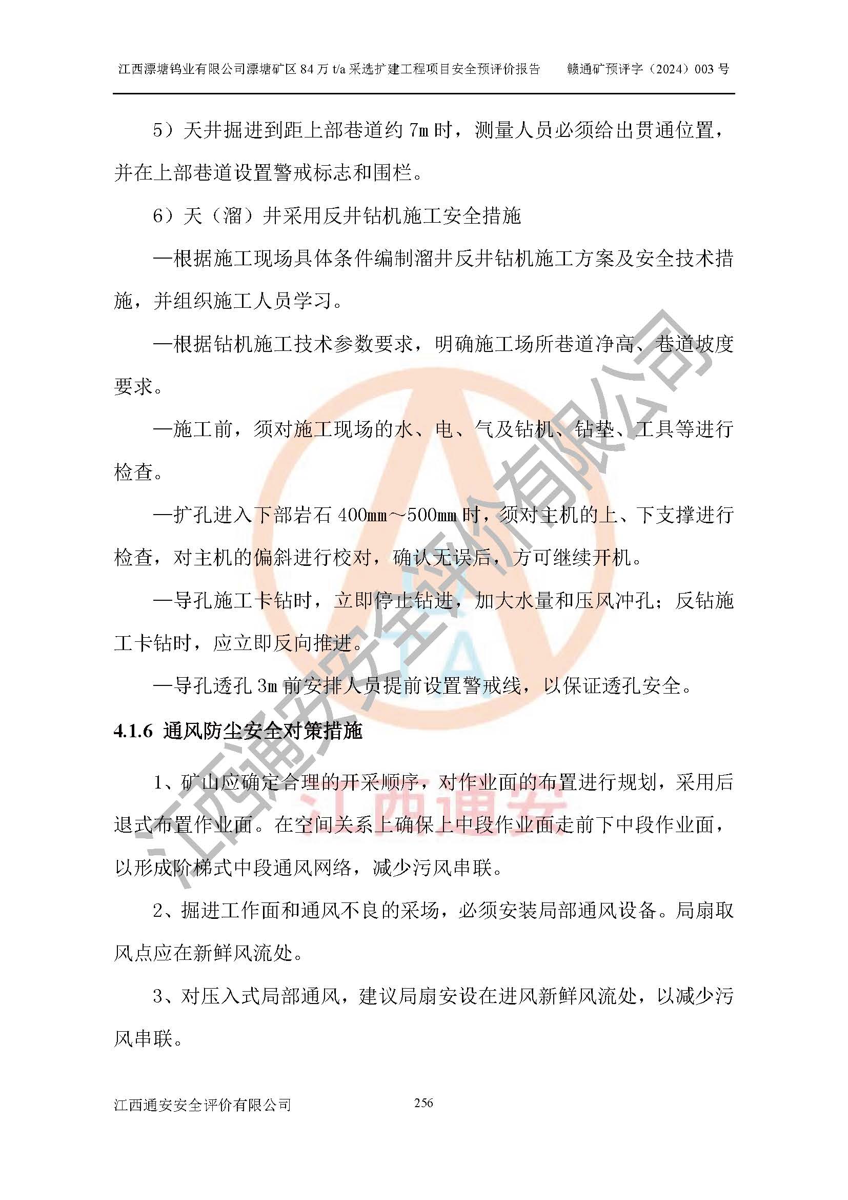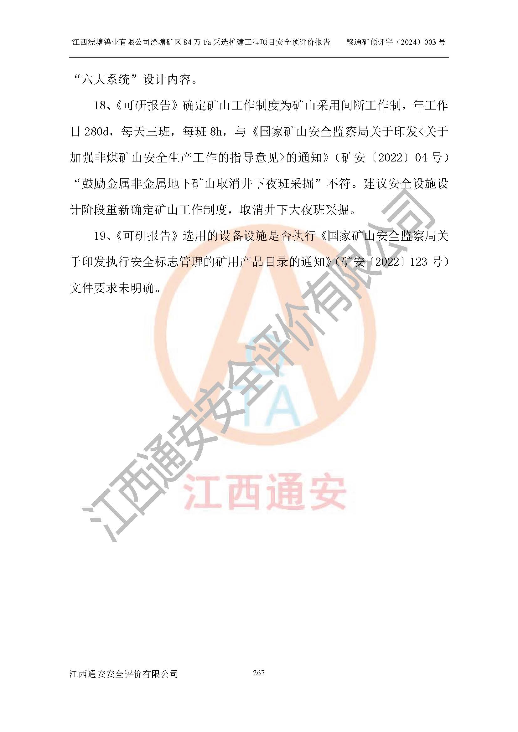 其它 | 江西漂塘鎢業(yè)有限公司漂塘礦區(qū)84萬(wàn)噸/年采選擴(kuò)建工程方案可行、選用的工藝和設(shè)備成熟、系統(tǒng)總體可靠,礦山具有建設(shè)、生產(chǎn)和管理的經(jīng)驗(yàn)和基礎(chǔ),在采納《可研報(bào)告》和本安全預(yù)評(píng)價(jià)報(bào)告提出的安全對(duì)策措施的基礎(chǔ)上,嚴(yán)把工程建設(shè)質(zhì)量關(guān)和現(xiàn)場(chǎng)安全管理,安全設(shè)施做到與主體工程同時(shí)設(shè)計(jì)、同時(shí)施工、同時(shí)投產(chǎn)使用,該擴(kuò)建工程安全風(fēng)險(xiǎn)處在可接受的范圍,符合**有關(guān)安全生產(chǎn)法律、法規(guī)、規(guī)章、標(biāo)準(zhǔn)和規(guī)范的要求。 | ||||