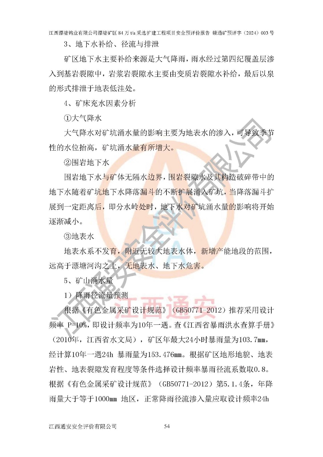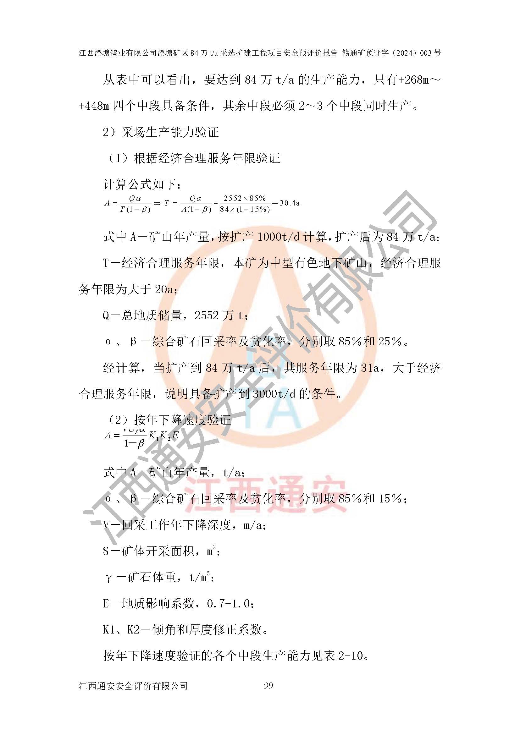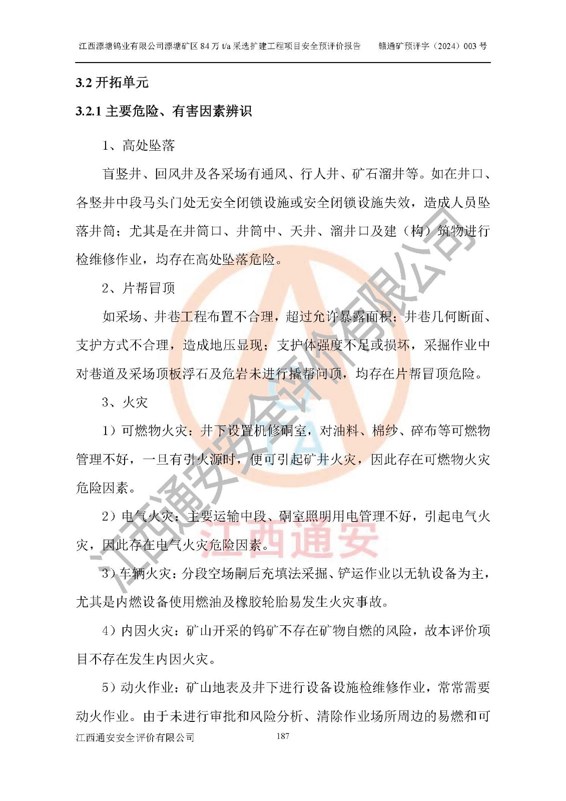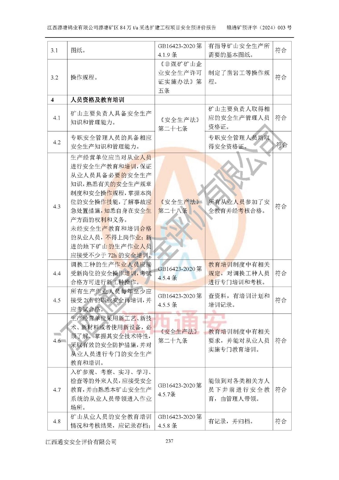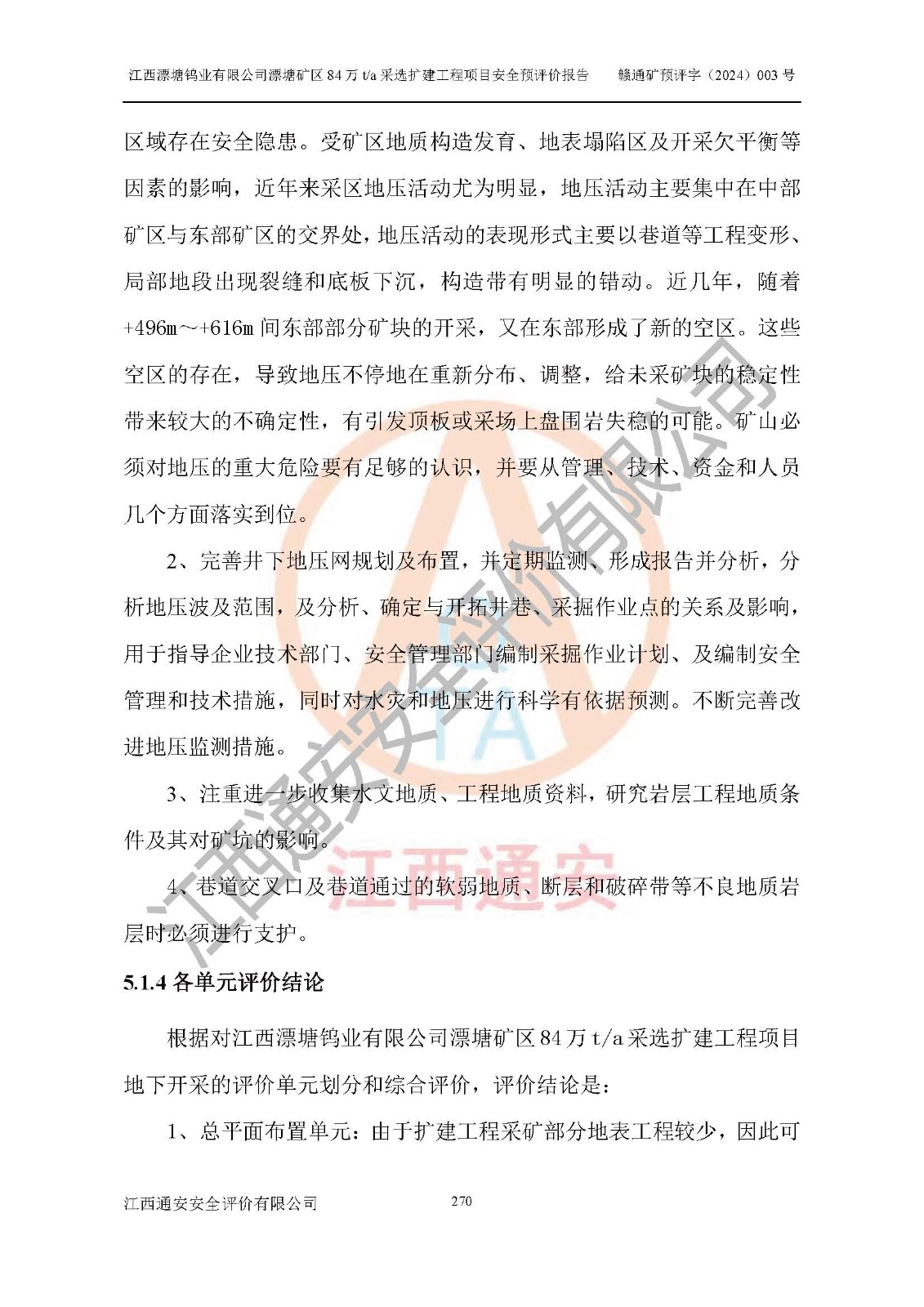 其它 | 江西漂塘鎢業(yè)有限公司漂塘礦區(qū)84萬(wàn)噸/年采選擴(kuò)建工程方案可行、選用的工藝和設(shè)備成熟、系統(tǒng)總體可靠,礦山具有建設(shè)、生產(chǎn)和管理的經(jīng)驗(yàn)和基礎(chǔ),在采納《可研報(bào)告》和本安全預(yù)評(píng)價(jià)報(bào)告提出的安全對(duì)策措施的基礎(chǔ)上,嚴(yán)把工程建設(shè)質(zhì)量關(guān)和現(xiàn)場(chǎng)安全管理,安全設(shè)施做到與主體工程同時(shí)設(shè)計(jì)、同時(shí)施工、同時(shí)投產(chǎn)使用,該擴(kuò)建工程安全風(fēng)險(xiǎn)處在可接受的范圍,符合**有關(guān)安全生產(chǎn)法律、法規(guī)、規(guī)章、標(biāo)準(zhǔn)和規(guī)范的要求。 | ||||
