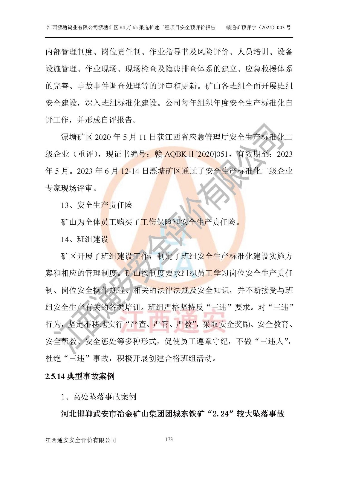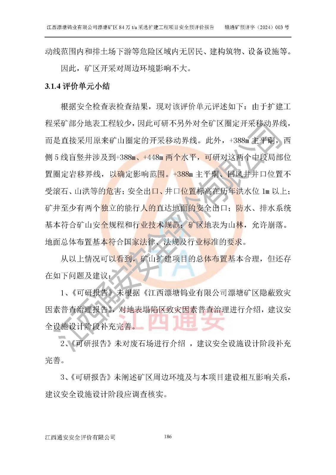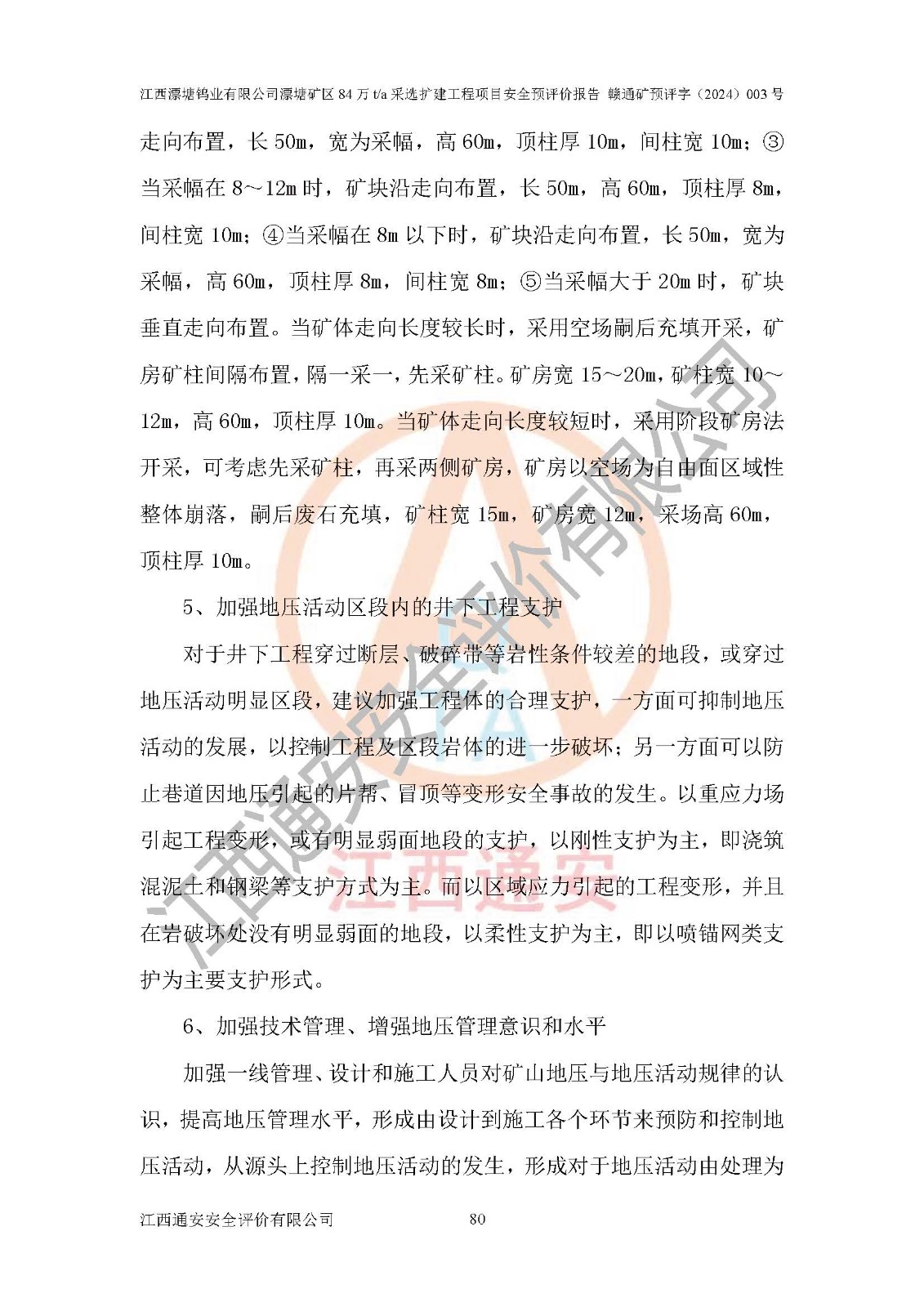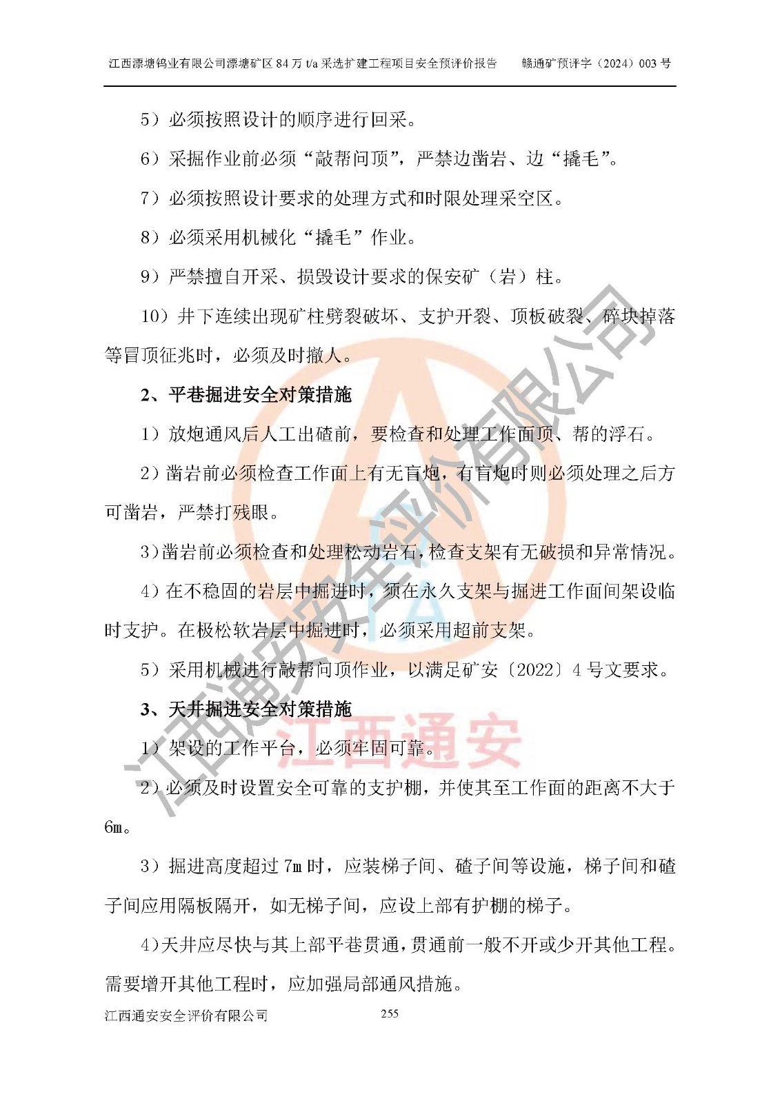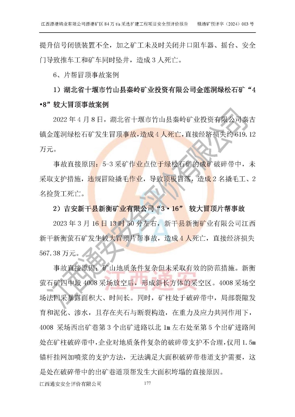 其它 | 江西漂塘鎢業(yè)有限公司漂塘礦區(qū)84萬(wàn)噸/年采選擴(kuò)建工程方案可行、選用的工藝和設(shè)備成熟、系統(tǒng)總體可靠,礦山具有建設(shè)、生產(chǎn)和管理的經(jīng)驗(yàn)和基礎(chǔ),在采納《可研報(bào)告》和本安全預(yù)評(píng)價(jià)報(bào)告提出的安全對(duì)策措施的基礎(chǔ)上,嚴(yán)把工程建設(shè)質(zhì)量關(guān)和現(xiàn)場(chǎng)安全管理,安全設(shè)施做到與主體工程同時(shí)設(shè)計(jì)、同時(shí)施工、同時(shí)投產(chǎn)使用,該擴(kuò)建工程安全風(fēng)險(xiǎn)處在可接受的范圍,符合**有關(guān)安全生產(chǎn)法律、法規(guī)、規(guī)章、標(biāo)準(zhǔn)和規(guī)范的要求。 | ||||