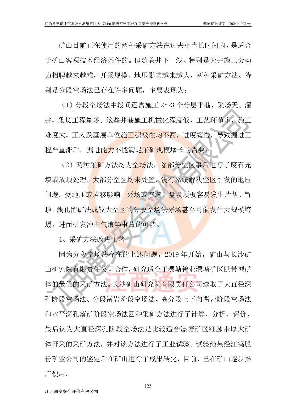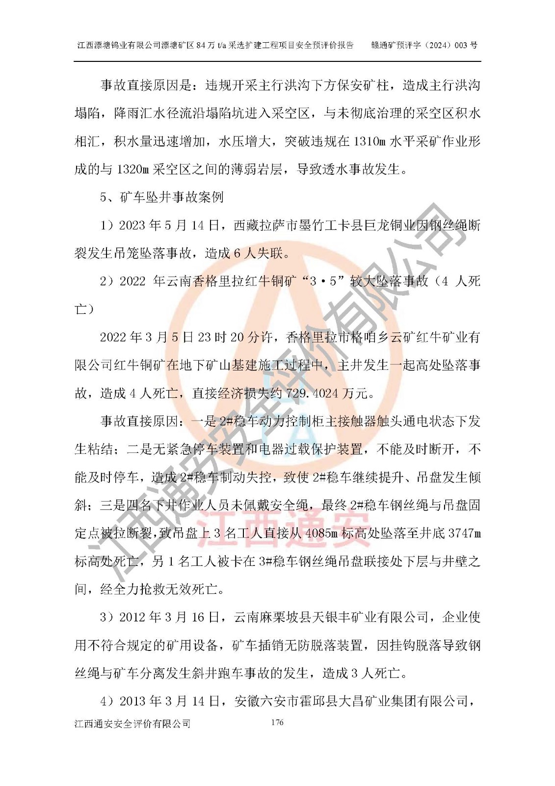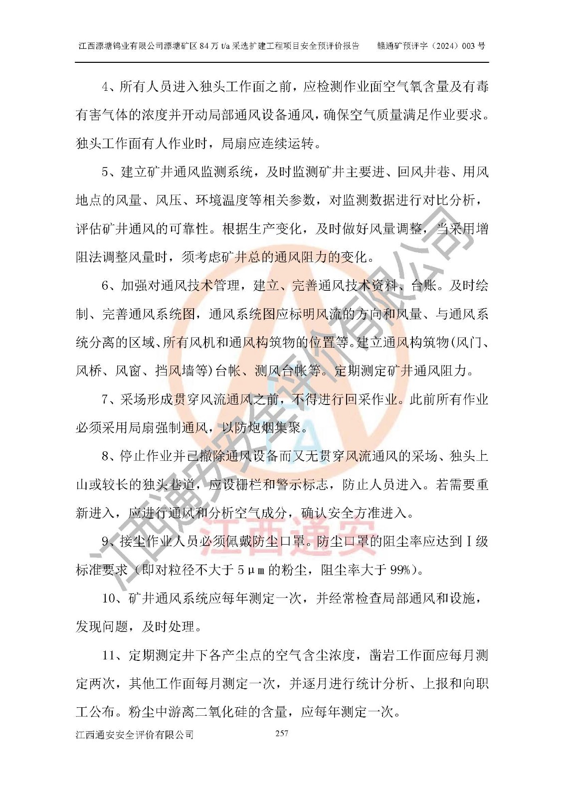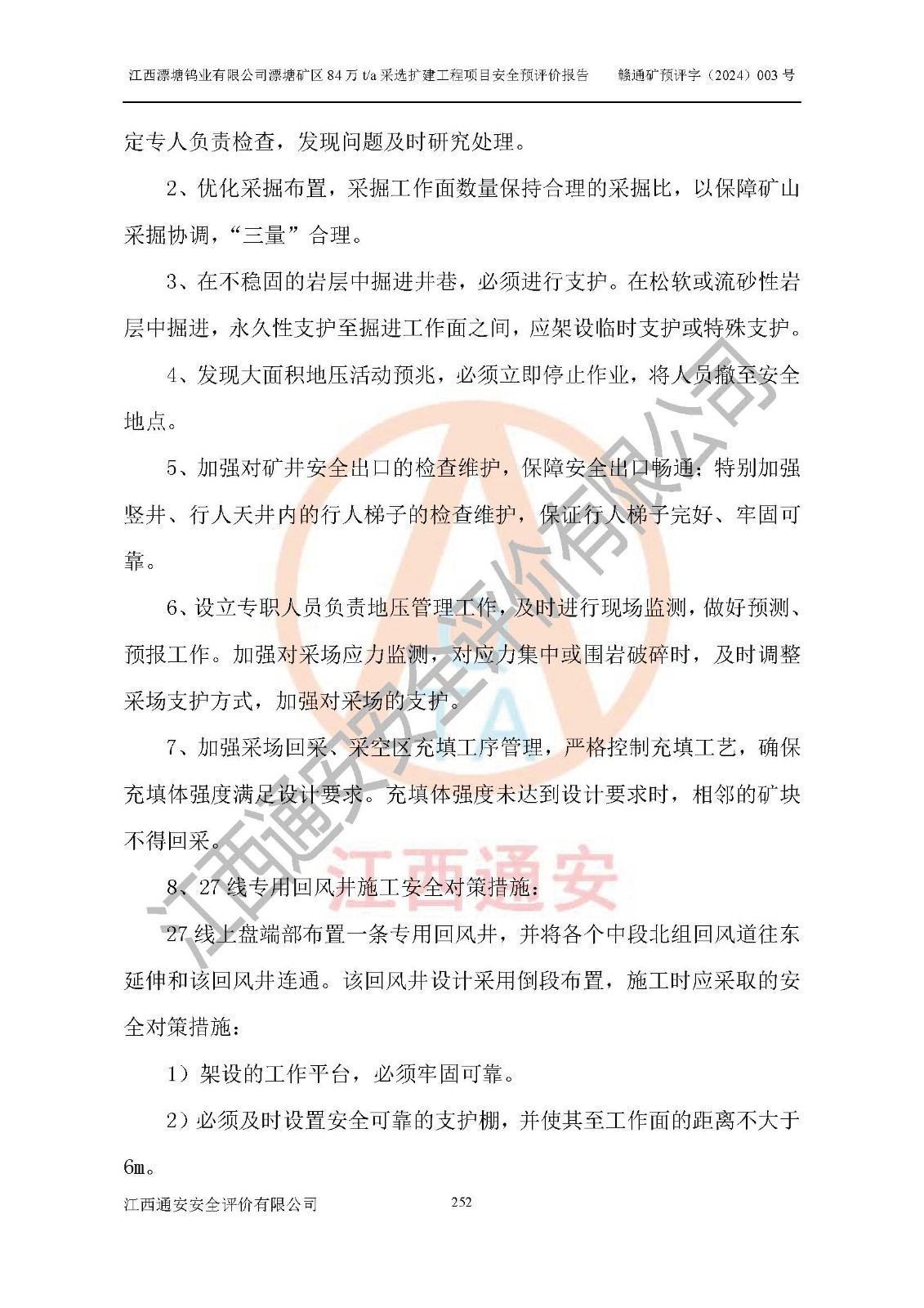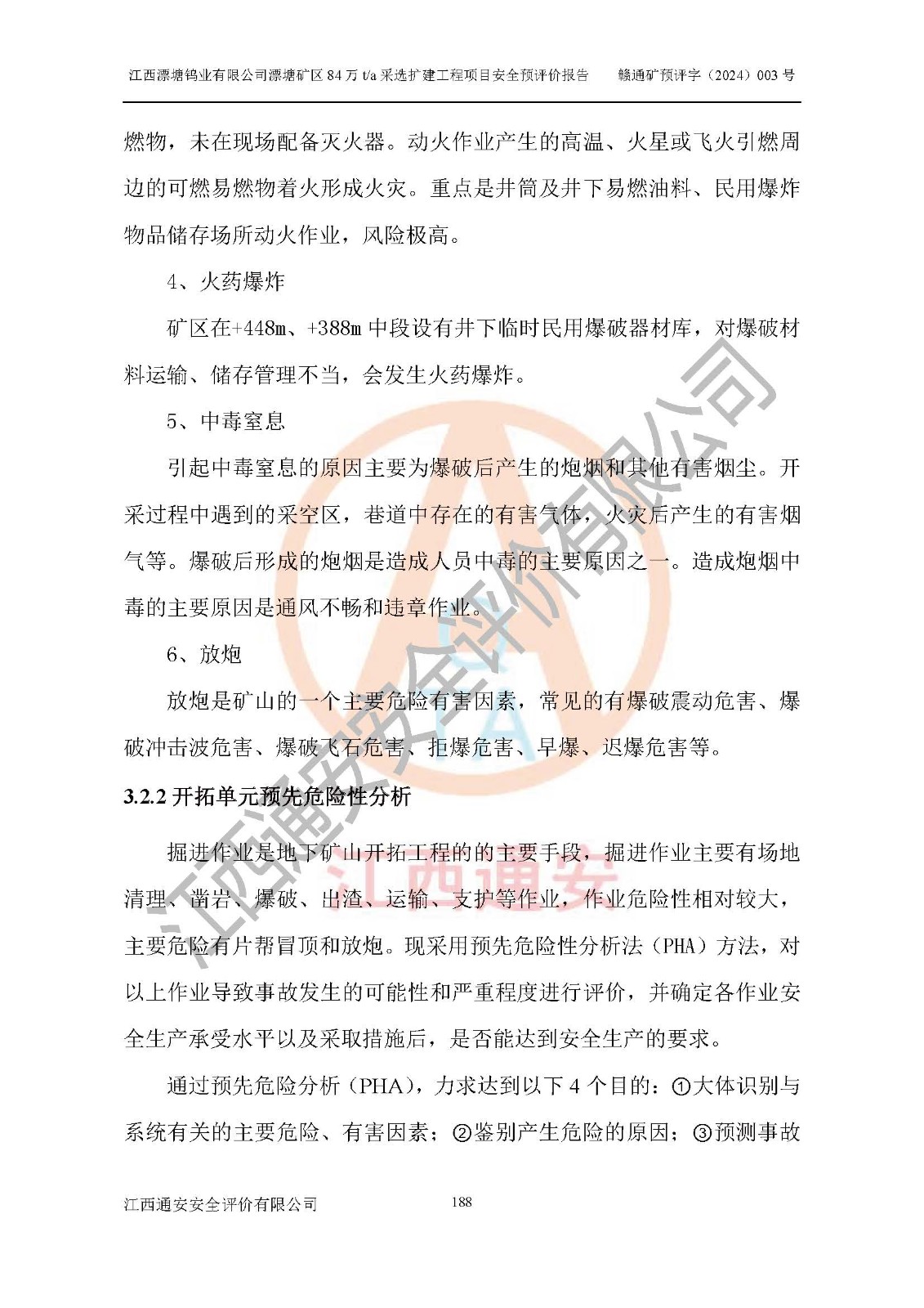 其它 | 江西漂塘鎢業(yè)有限公司漂塘礦區(qū)84萬(wàn)噸/年采選擴(kuò)建工程方案可行、選用的工藝和設(shè)備成熟、系統(tǒng)總體可靠,礦山具有建設(shè)、生產(chǎn)和管理的經(jīng)驗(yàn)和基礎(chǔ),在采納《可研報(bào)告》和本安全預(yù)評(píng)價(jià)報(bào)告提出的安全對(duì)策措施的基礎(chǔ)上,嚴(yán)把工程建設(shè)質(zhì)量關(guān)和現(xiàn)場(chǎng)安全管理,安全設(shè)施做到與主體工程同時(shí)設(shè)計(jì)、同時(shí)施工、同時(shí)投產(chǎn)使用,該擴(kuò)建工程安全風(fēng)險(xiǎn)處在可接受的范圍,符合**有關(guān)安全生產(chǎn)法律、法規(guī)、規(guī)章、標(biāo)準(zhǔn)和規(guī)范的要求。 | ||||
