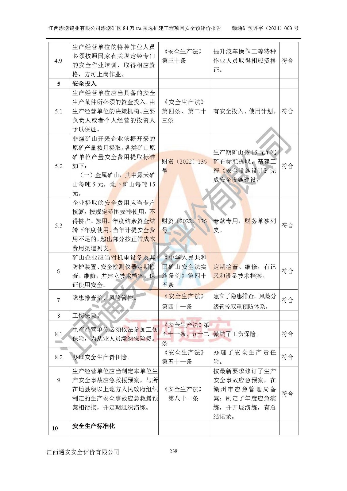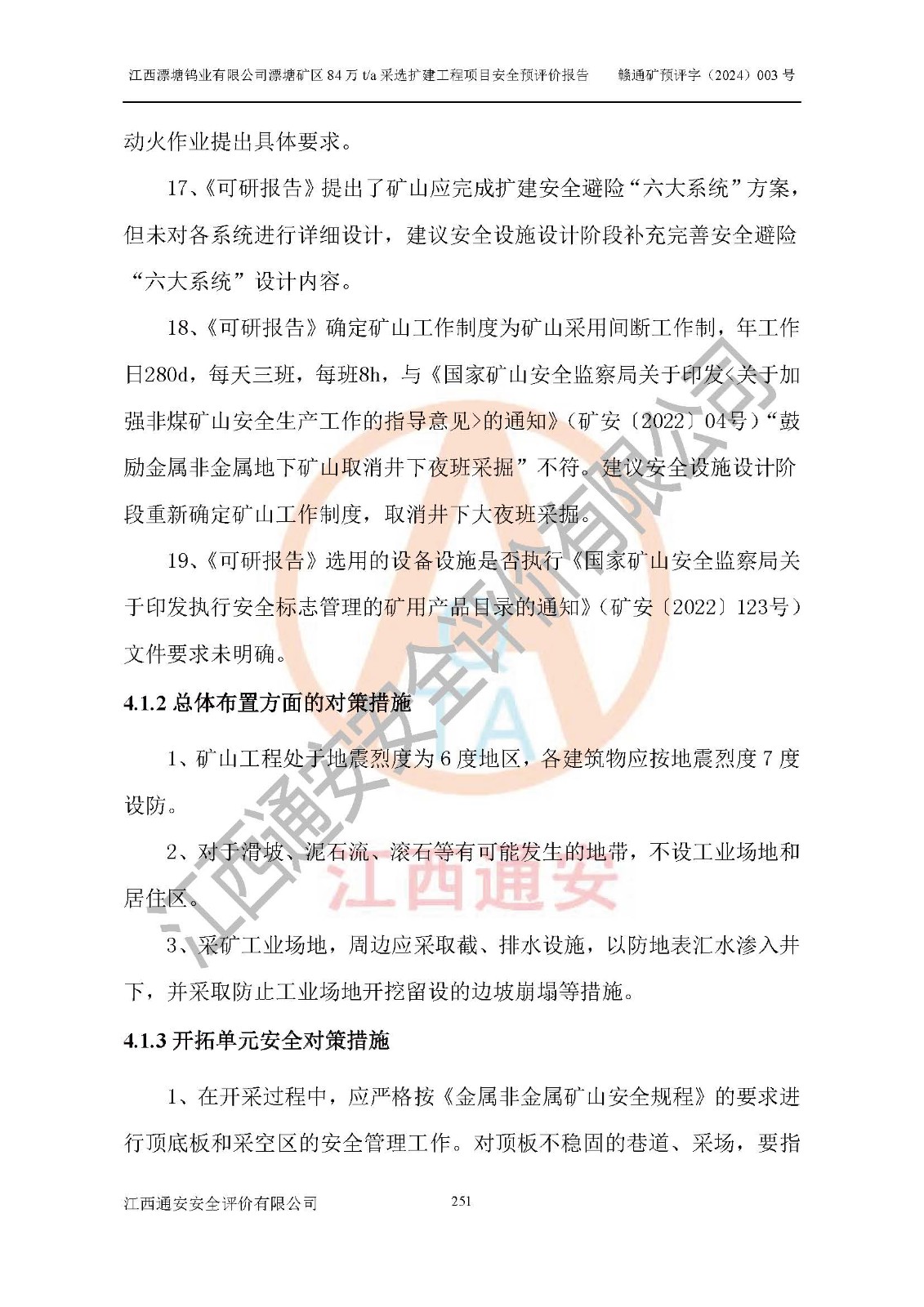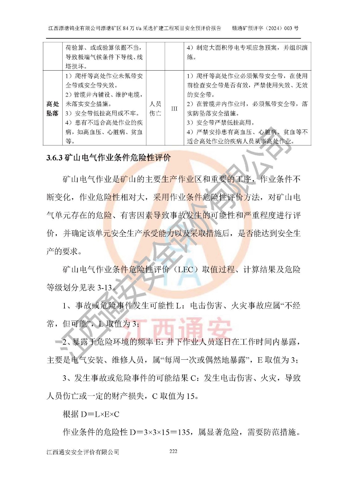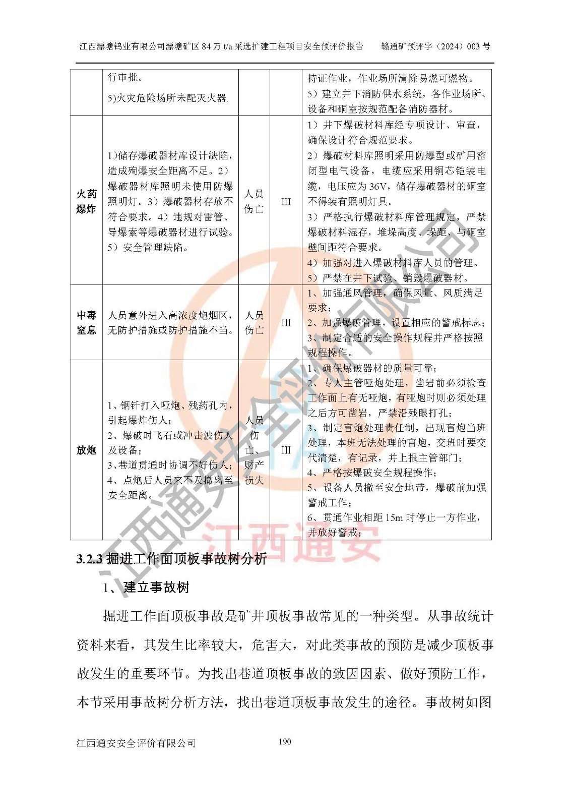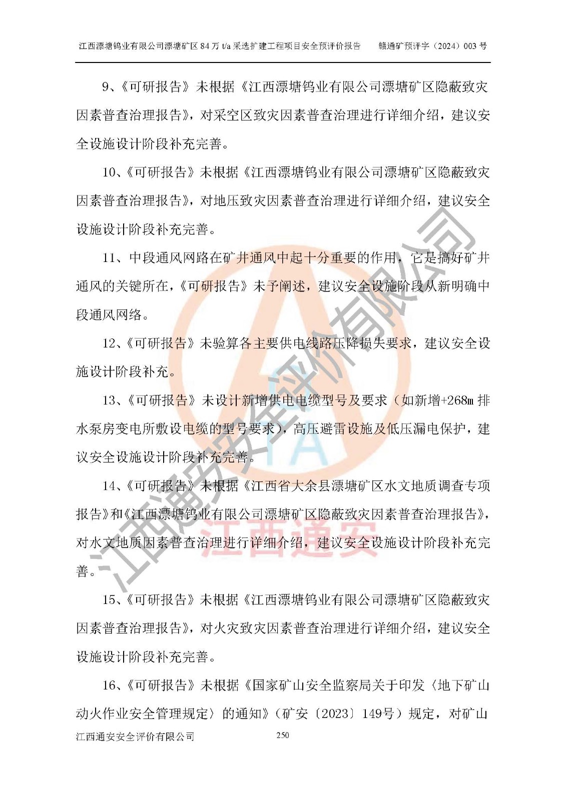 其它 | 江西漂塘鎢業(yè)有限公司漂塘礦區(qū)84萬(wàn)噸/年采選擴(kuò)建工程方案可行、選用的工藝和設(shè)備成熟、系統(tǒng)總體可靠,礦山具有建設(shè)、生產(chǎn)和管理的經(jīng)驗(yàn)和基礎(chǔ),在采納《可研報(bào)告》和本安全預(yù)評(píng)價(jià)報(bào)告提出的安全對(duì)策措施的基礎(chǔ)上,嚴(yán)把工程建設(shè)質(zhì)量關(guān)和現(xiàn)場(chǎng)安全管理,安全設(shè)施做到與主體工程同時(shí)設(shè)計(jì)、同時(shí)施工、同時(shí)投產(chǎn)使用,該擴(kuò)建工程安全風(fēng)險(xiǎn)處在可接受的范圍,符合**有關(guān)安全生產(chǎn)法律、法規(guī)、規(guī)章、標(biāo)準(zhǔn)和規(guī)范的要求。 | ||||