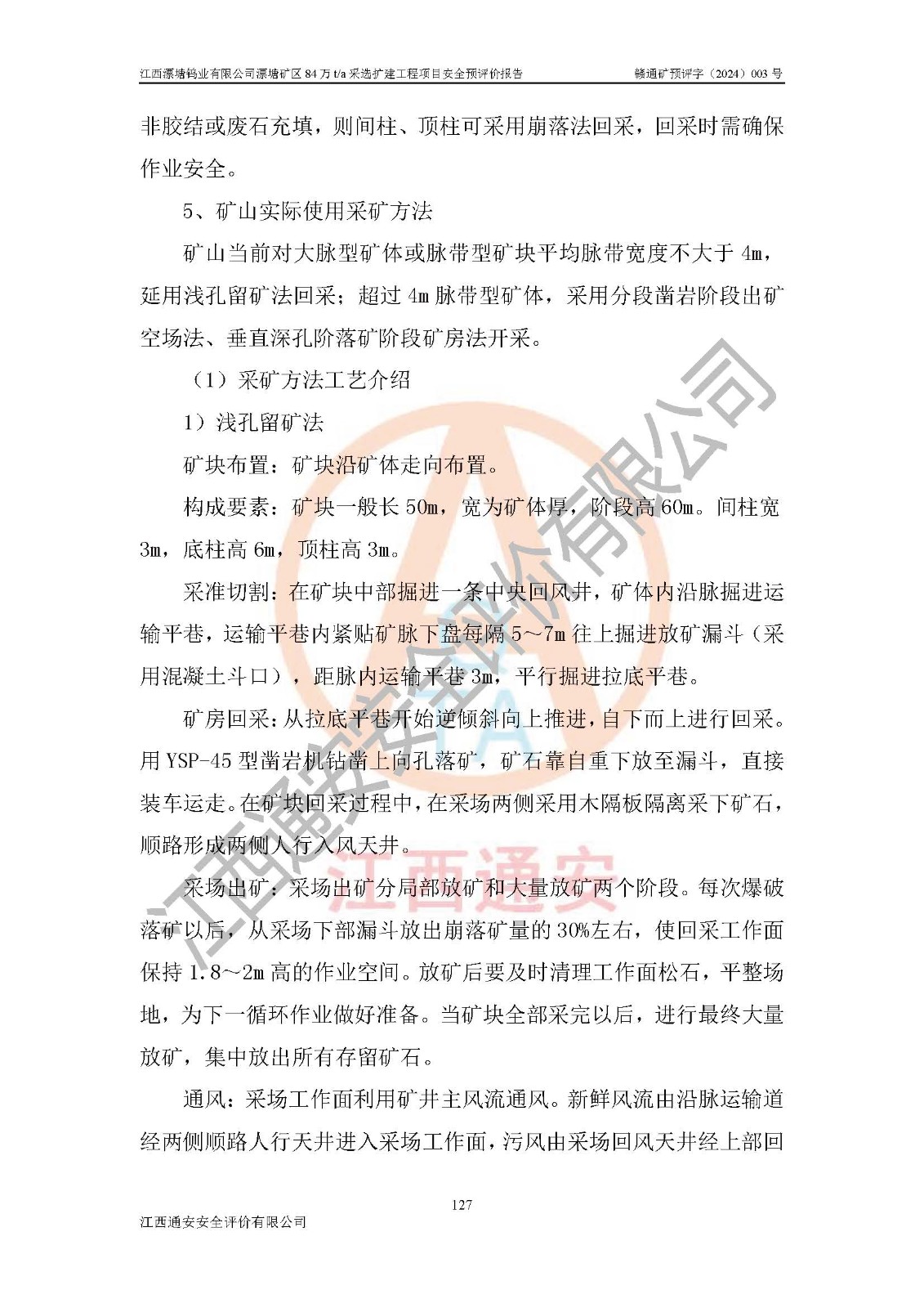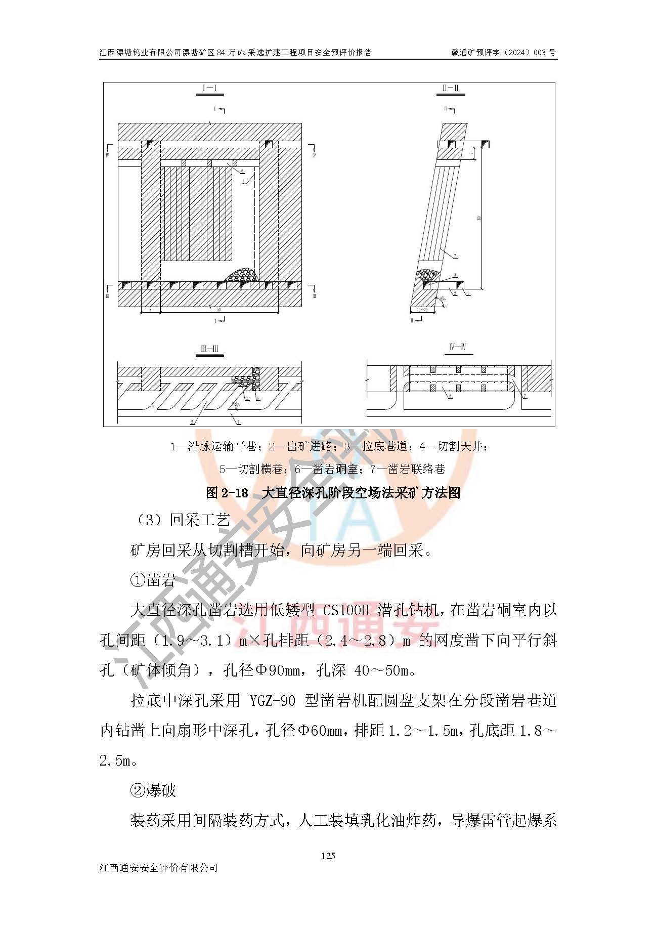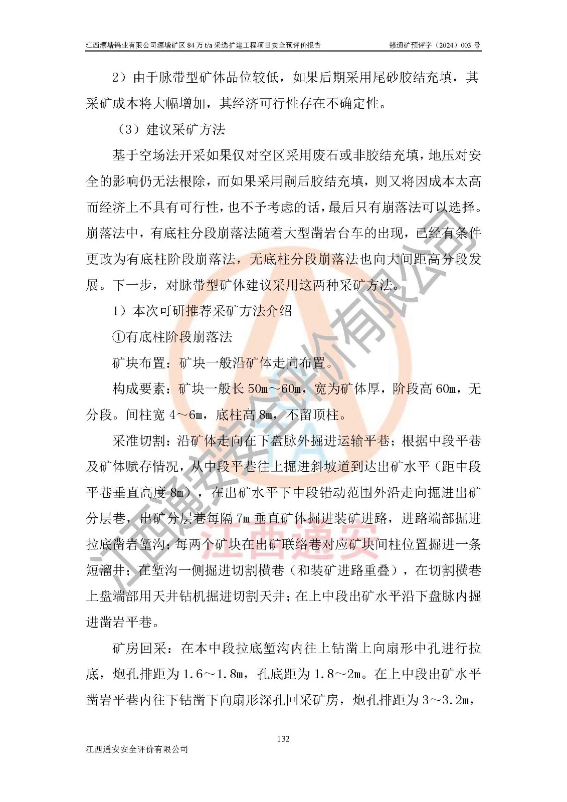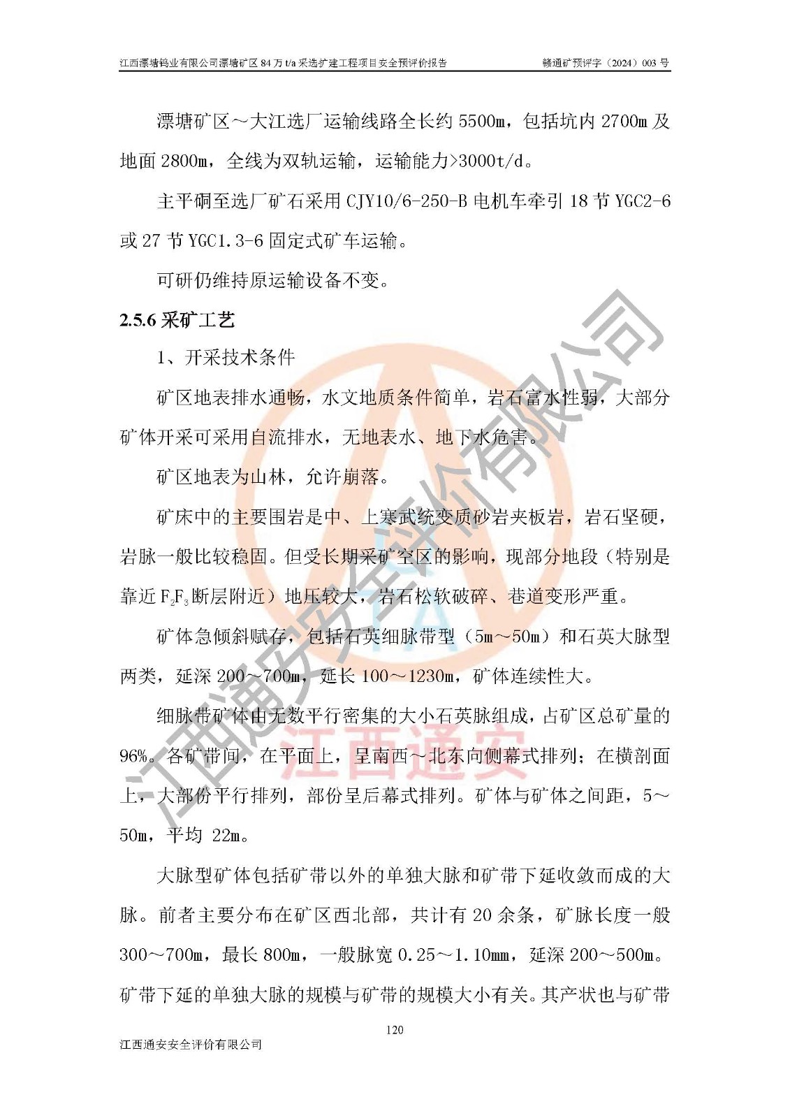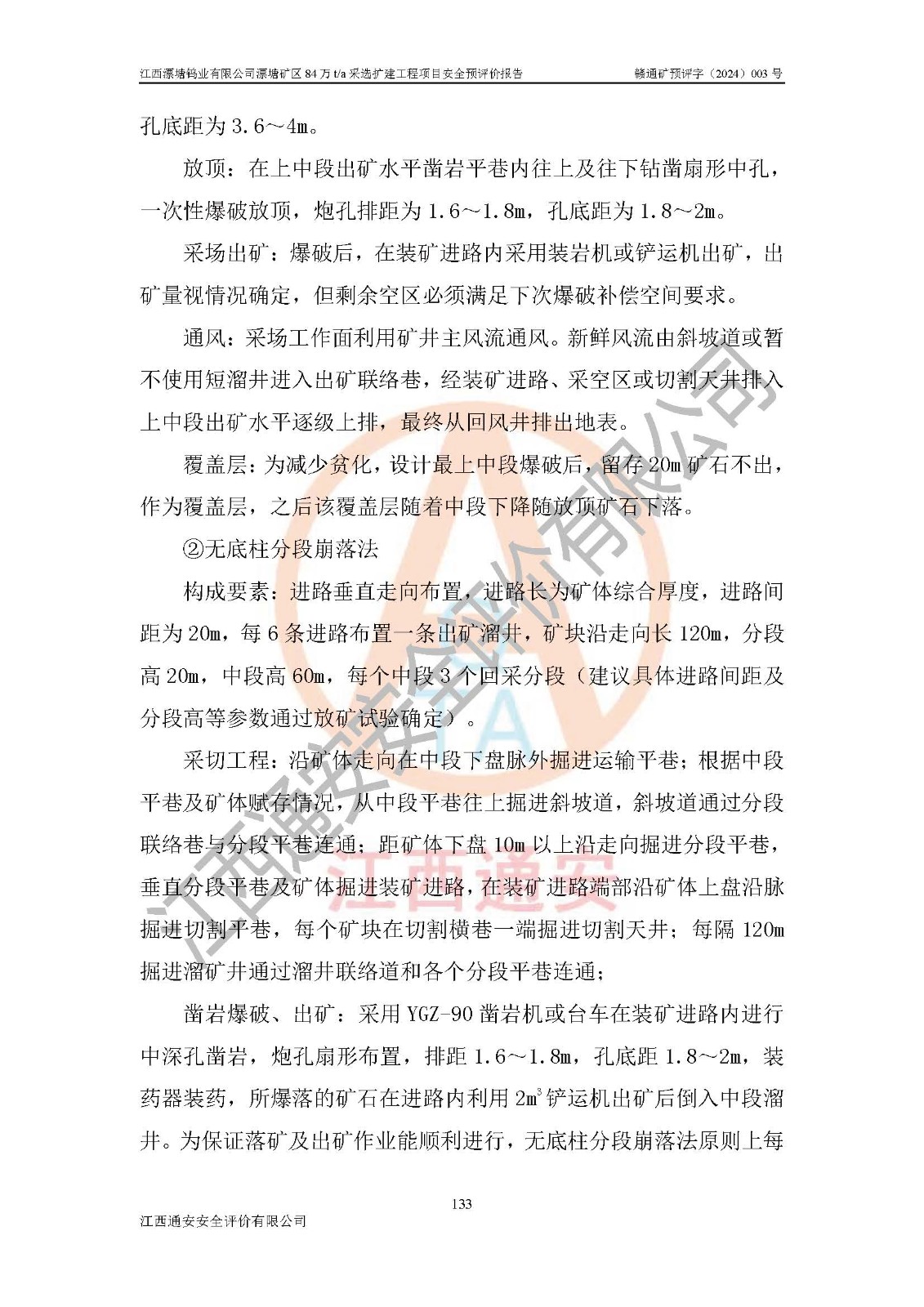 項(xiàng)目簡(jiǎn)介 | 江西漂塘鎢業(yè)有限公司漂塘礦區(qū)目前采用平硐+斜坡道+盲豎井+盲斜井聯(lián)合開(kāi)拓方式,歷史上已形成+736m、+676m、+616m、+556m、+580m、+526m、+496m、+448m、+388m、+328m、+268m、+208m等十二個(gè)中段。主要采用淺孔留礦法、階段礦房法和階段強(qiáng)制崩落法開(kāi)采。礦區(qū)原礦經(jīng)5.5**輕軌運(yùn)至大江選廠。 中鋼集團(tuán)馬鞍山礦山研究院股份有限公司2023年11月編制完成了《江西漂塘鎢業(yè)有限公司漂塘礦區(qū)84萬(wàn)t/a采選擴(kuò)建工程項(xiàng)目可行性研究報(bào)告》(以下簡(jiǎn)稱《可研報(bào)告》),為整體設(shè)計(jì)的前期技術(shù)工作,作為礦山立項(xiàng)、采礦證變更等工作的依據(jù)。江西漂塘鎢業(yè)有限公司已向江西省工業(yè)和信息化廳申請(qǐng)了漂塘礦區(qū)84萬(wàn)噸/年采選擴(kuò)建工程項(xiàng)目核準(zhǔn)備案手續(xù)。 當(dāng)前礦山的各個(gè)系統(tǒng)大部分滿足擴(kuò)建后很長(zhǎng)一段時(shí)間的生產(chǎn)需求,基本可采用利舊工程,但擴(kuò)產(chǎn)基建期或整個(gè)服務(wù)期內(nèi)仍有部分工程需新增。 本項(xiàng)目已經(jīng)符合編制安全預(yù)評(píng)價(jià)的前置條件,根據(jù)《中華人民共和國(guó)安全生產(chǎn)法》、《建設(shè)項(xiàng)目安全設(shè)施“三同時(shí)”監(jiān)督管理辦法》(**安全生產(chǎn)監(jiān)督管理局令第36號(hào))和《金屬非金屬礦山建設(shè)項(xiàng)目安全設(shè)施目錄》(**安全生產(chǎn)監(jiān)督管理總局令第75號(hào))的規(guī)定,江西漂塘鎢業(yè)有限公司2024年2月委托我公司(江西通安安全評(píng)價(jià)有限公司)對(duì)其漂塘礦區(qū)84萬(wàn)噸/年采選擴(kuò)建工程項(xiàng)目進(jìn)行安全預(yù)評(píng)價(jià)。 | ||||