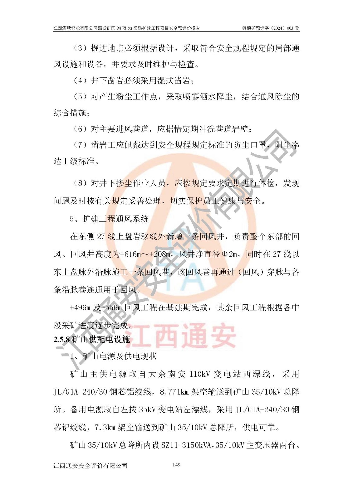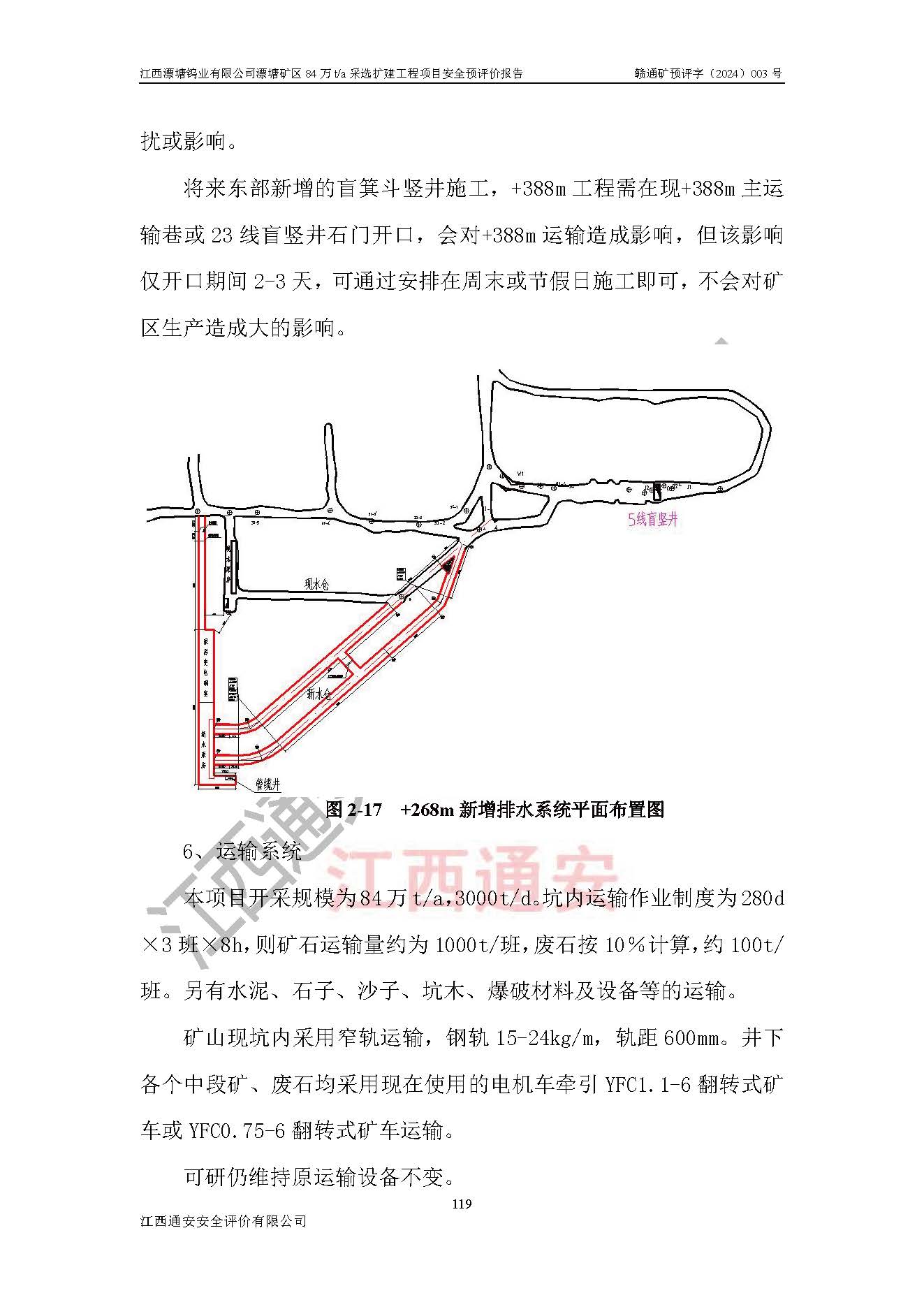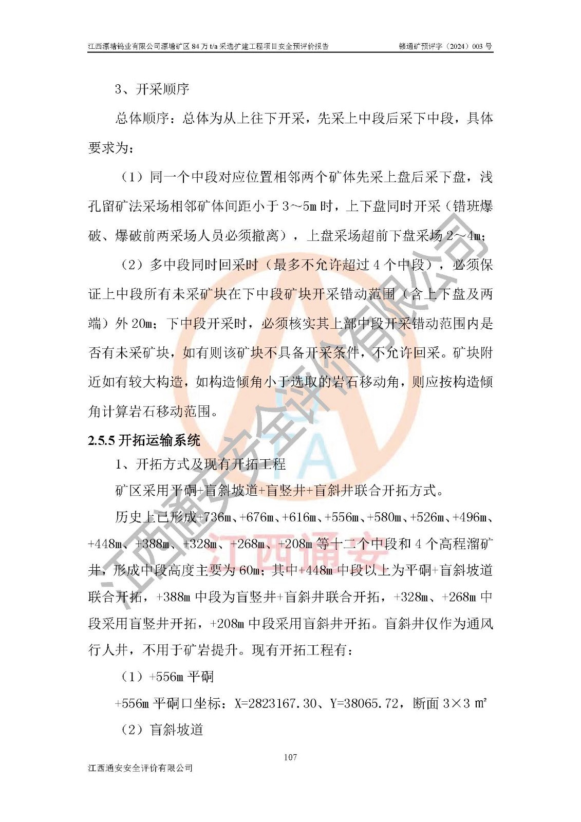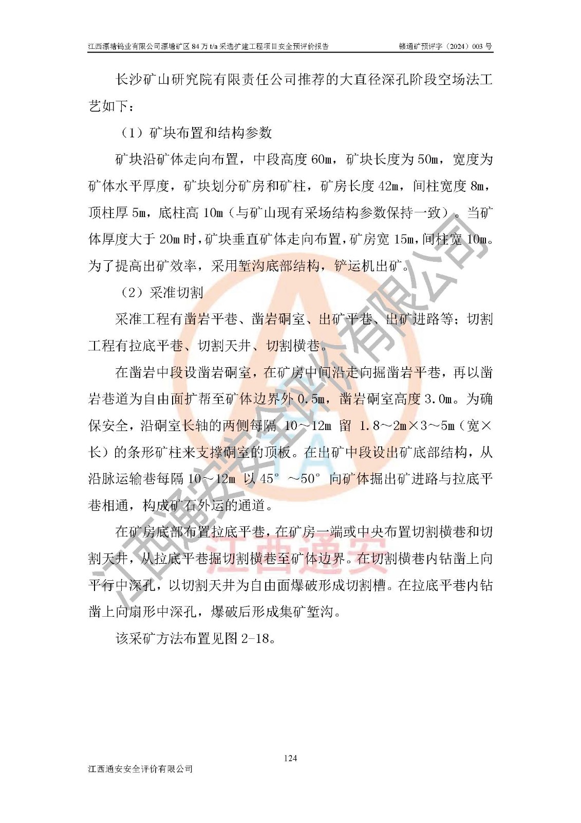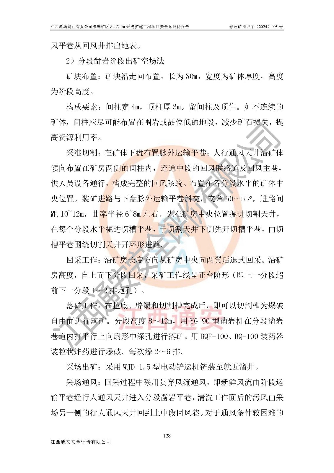 項(xiàng)目簡(jiǎn)介 | 江西漂塘鎢業(yè)有限公司漂塘礦區(qū)目前采用平硐+斜坡道+盲豎井+盲斜井聯(lián)合開(kāi)拓方式,歷史上已形成+736m、+676m、+616m、+556m、+580m、+526m、+496m、+448m、+388m、+328m、+268m、+208m等十二個(gè)中段。主要采用淺孔留礦法、階段礦房法和階段強(qiáng)制崩落法開(kāi)采。礦區(qū)原礦經(jīng)5.5**輕軌運(yùn)至大江選廠。 中鋼集團(tuán)馬鞍山礦山研究院股份有限公司2023年11月編制完成了《江西漂塘鎢業(yè)有限公司漂塘礦區(qū)84萬(wàn)t/a采選擴(kuò)建工程項(xiàng)目可行性研究報(bào)告》(以下簡(jiǎn)稱《可研報(bào)告》),為整體設(shè)計(jì)的前期技術(shù)工作,作為礦山立項(xiàng)、采礦證變更等工作的依據(jù)。江西漂塘鎢業(yè)有限公司已向江西省工業(yè)和信息化廳申請(qǐng)了漂塘礦區(qū)84萬(wàn)噸/年采選擴(kuò)建工程項(xiàng)目核準(zhǔn)備案手續(xù)。 當(dāng)前礦山的各個(gè)系統(tǒng)大部分滿足擴(kuò)建后很長(zhǎng)一段時(shí)間的生產(chǎn)需求,基本可采用利舊工程,但擴(kuò)產(chǎn)基建期或整個(gè)服務(wù)期內(nèi)仍有部分工程需新增。 本項(xiàng)目已經(jīng)符合編制安全預(yù)評(píng)價(jià)的前置條件,根據(jù)《中華人民共和國(guó)安全生產(chǎn)法》、《建設(shè)項(xiàng)目安全設(shè)施“三同時(shí)”監(jiān)督管理辦法》(**安全生產(chǎn)監(jiān)督管理局令第36號(hào))和《金屬非金屬礦山建設(shè)項(xiàng)目安全設(shè)施目錄》(**安全生產(chǎn)監(jiān)督管理總局令第75號(hào))的規(guī)定,江西漂塘鎢業(yè)有限公司2024年2月委托我公司(江西通安安全評(píng)價(jià)有限公司)對(duì)其漂塘礦區(qū)84萬(wàn)噸/年采選擴(kuò)建工程項(xiàng)目進(jìn)行安全預(yù)評(píng)價(jià)。 | ||||