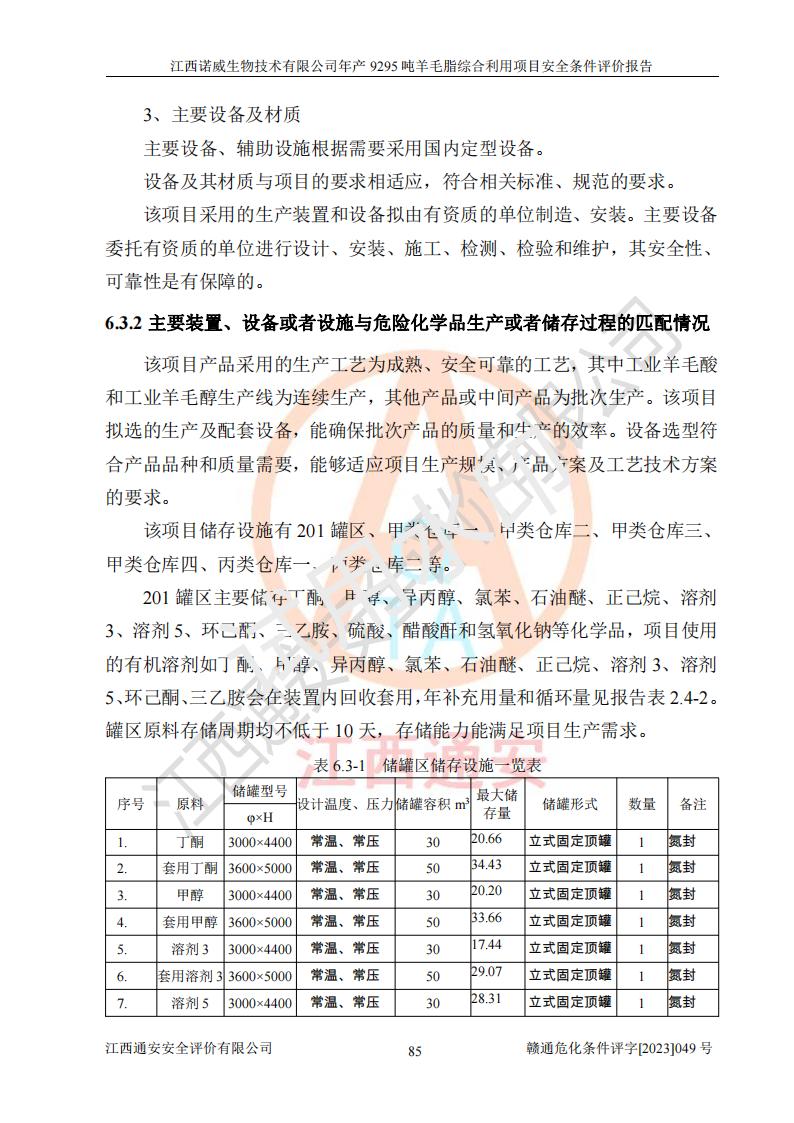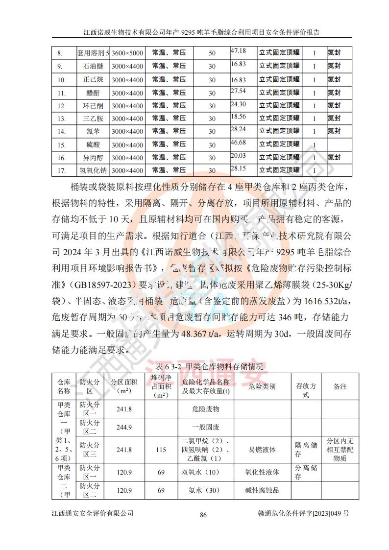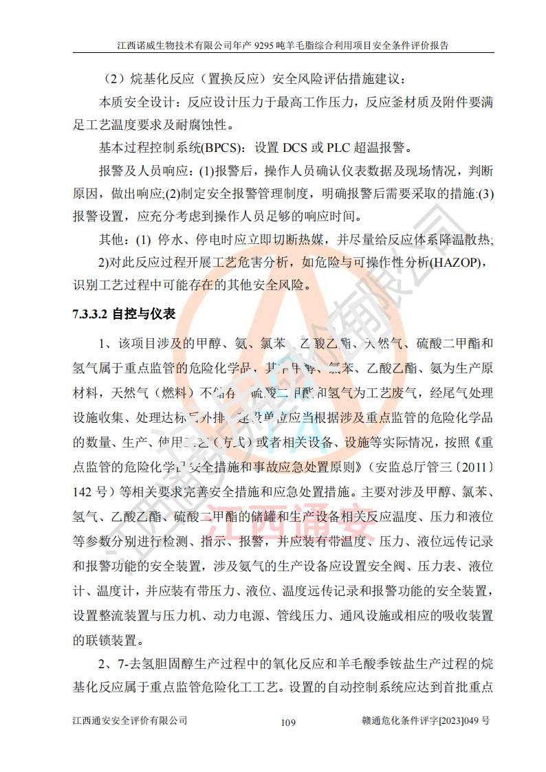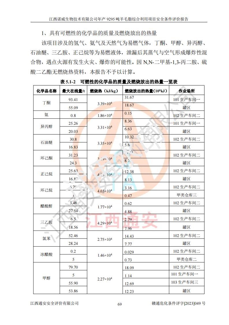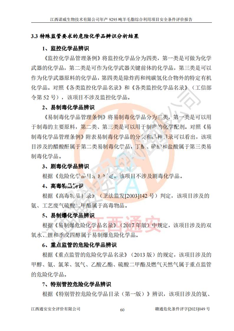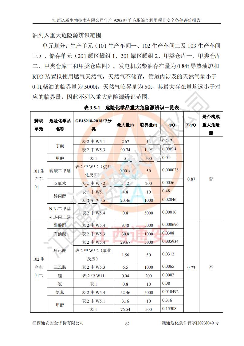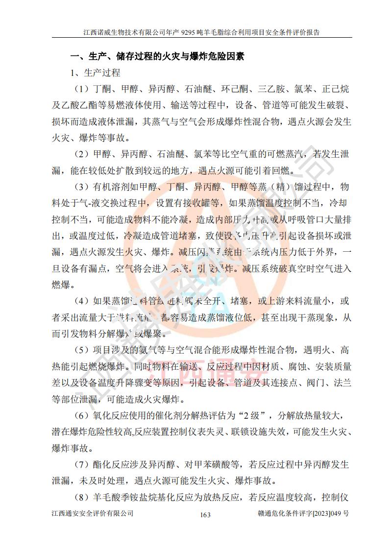 項目簡介 | 江西諾威生物技術(shù)有限公司(以下簡稱“諾威生物公司”)成立于2021年3月24日,法定**人為葉朝政,注冊資本壹億元整,經(jīng)營范圍為生物化工產(chǎn)品技術(shù)研發(fā)、化工產(chǎn)品生產(chǎn)、技術(shù)服務、技術(shù)開發(fā)、技術(shù)咨詢、技術(shù)交流、技術(shù)**、技術(shù)推廣,化工產(chǎn)品銷售等。 江西諾威生物技術(shù)有限公司擬投資70000萬元建設年產(chǎn)9295噸羊毛脂綜合利用項目,擬建地點位于江西省新干鹽化工業(yè)城四至范圍內(nèi),該工業(yè)園屬于江西省認定合格的化工園區(qū),項目占地面積79179.39m2 ,于2021年5月27日取得了新干縣發(fā)展和改革委員會的《江西省工業(yè)企業(yè)投資項目備案通知書》(項目統(tǒng)一代碼為:2105-360824-04-01-109062)。根據(jù)《國民經(jīng)濟行業(yè)分類標準》(GB/T4754-2017),項目所屬行業(yè)類別為C26化學原料和化學品制造業(yè)和C27醫(yī)藥制造業(yè),屬于精細化工。該項目生產(chǎn)過程涉及的原輔材料為粗酯、氫氧化鈉、丁酮、硫酸、甲醇、N,N-二甲基-1,3-丙二胺、1,3-丁二醇、磷酸、次磷酸、硫酸二乙酯、異丙醇、對甲苯磺酸、35%雙氧水、GML&地蠟、季戊四醇、六偏磷酸鈉、醋酸酐、石油醚、碳酸氫鈉、環(huán)己酮、三乙胺、鋰、氨、氯苯、正己烷、氫氧化鉀、冰醋酸、活性炭、膽固醇、鹽酸、對甲苯磺酰肼、乙酸乙酯、氯化鈉、淀粉、白糖、色拉油、明膠、二氧化硅、氧化鋁、光觸媒、硅藻土、氫化鈉、環(huán)己烷、氯化鋅、四氫呋喃、二氯甲烷、溶劑3、溶劑5、催化劑101#、催化劑102#、10%次氯酸鈉溶液、壓縮空氣、氮氣、發(fā)電機用柴油、燃料天然氣,中間產(chǎn)物有氨基鋰,產(chǎn)品為羊毛酸季銨鹽、羊毛酸異丙酯、羊毛酸季戊四醇酯、工業(yè)羊毛脂、D-AG、羊毛甾醇、無水羊毛脂、高酸酯、羊毛油、羊毛蠟、7-去氫膽固醇1/2/3、工業(yè)羊毛醇、羊毛酸、膽固醇1/2/3、VD2結(jié)晶、VD3油、VD3粉、VD3結(jié)晶,副產(chǎn)品為20%氨水、硫酸鈉、碳酸鋰,尾氣主要為酸性氣體、粉塵、VOCS、氫氣、氨氣及硫酸二甲酯等。其中氫氧化鈉、丁酮、硫酸、甲醇、N,N-二甲基-1,3-丙二胺、磷酸、次磷酸、硫酸二乙酯、異丙醇、35%雙氧水、醋酸酐、石油醚、環(huán)己酮、三乙胺、鋰、氨、氯苯、正己烷、環(huán)己烷、氫氧化鉀、冰醋酸、氫化鈉、氨基鋰、乙酸乙酯、二氯甲烷、20%氨水、四氫呋喃、溶劑3、氯化鋅、鹽酸、氮氣、天然氣、制冷劑R22、發(fā)電機用柴油、氫氣、硫酸二甲酯、10%次氯酸鈉溶液屬于危險化學品。經(jīng)辨識,該項目涉及甲醇、氨、氯苯、氫氣、乙酸乙酯、硫酸二甲酯及燃氣天然氣屬于重點監(jiān)管的危險化學品,氧化反應和烷基化反應屬于重點監(jiān)管的危險化工工藝,生產(chǎn)、儲存單元不構(gòu)成重大危險源。根據(jù)《危險化學品生產(chǎn)企業(yè)安全生產(chǎn)許可證實施辦法》,該項目副產(chǎn)品20%氨水屬于危險化學品,且生產(chǎn)過程中涉及溶劑回收,因此需要辦理危險化學品安全生產(chǎn)許可證。 | ||||