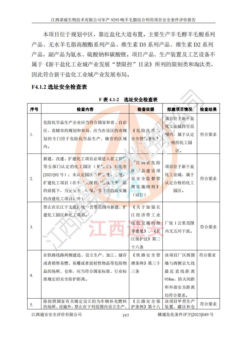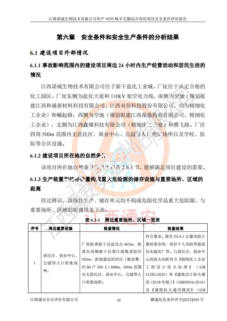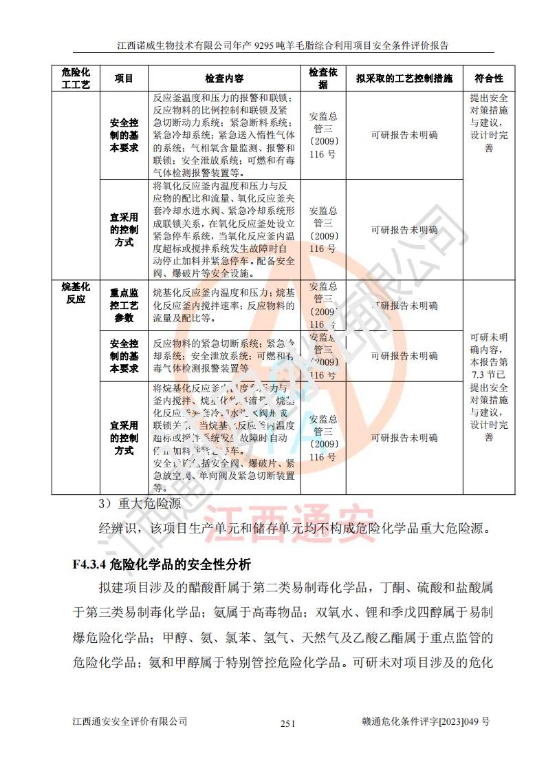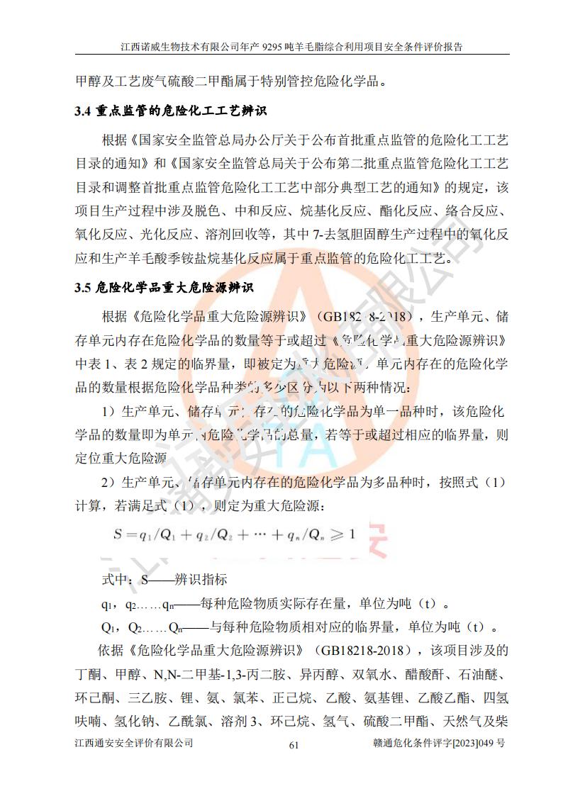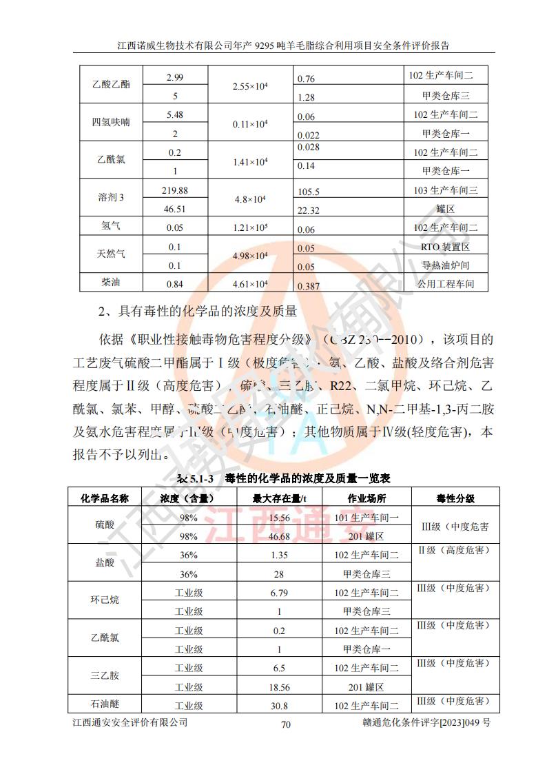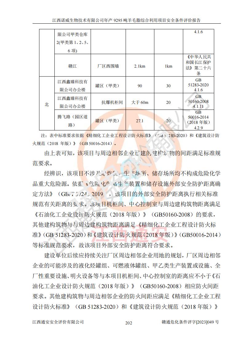 項目簡介 | 江西諾威生物技術(shù)有限公司(以下簡稱“諾威生物公司”)成立于2021年3月24日,法定**人為葉朝政,注冊資本壹億元整,經(jīng)營范圍為生物化工產(chǎn)品技術(shù)研發(fā)、化工產(chǎn)品生產(chǎn)、技術(shù)服務、技術(shù)開發(fā)、技術(shù)咨詢、技術(shù)交流、技術(shù)**、技術(shù)推廣,化工產(chǎn)品銷售等。 江西諾威生物技術(shù)有限公司擬投資70000萬元建設年產(chǎn)9295噸羊毛脂綜合利用項目,擬建地點位于江西省新干鹽化工業(yè)城四至范圍內(nèi),該工業(yè)園屬于江西省認定合格的化工園區(qū),項目占地面積79179.39m2 ,于2021年5月27日取得了新干縣發(fā)展和改革委員會的《江西省工業(yè)企業(yè)投資項目備案通知書》(項目統(tǒng)一代碼為:2105-360824-04-01-109062)。根據(jù)《國民經(jīng)濟行業(yè)分類標準》(GB/T4754-2017),項目所屬行業(yè)類別為C26化學原料和化學品制造業(yè)和C27醫(yī)藥制造業(yè),屬于精細化工。該項目生產(chǎn)過程涉及的原輔材料為粗酯、氫氧化鈉、丁酮、硫酸、甲醇、N,N-二甲基-1,3-丙二胺、1,3-丁二醇、磷酸、次磷酸、硫酸二乙酯、異丙醇、對甲苯磺酸、35%雙氧水、GML&地蠟、季戊四醇、六偏磷酸鈉、醋酸酐、石油醚、碳酸氫鈉、環(huán)己酮、三乙胺、鋰、氨、氯苯、正己烷、氫氧化鉀、冰醋酸、活性炭、膽固醇、鹽酸、對甲苯磺酰肼、乙酸乙酯、氯化鈉、淀粉、白糖、色拉油、明膠、二氧化硅、氧化鋁、光觸媒、硅藻土、氫化鈉、環(huán)己烷、氯化鋅、四氫呋喃、二氯甲烷、溶劑3、溶劑5、催化劑101#、催化劑102#、10%次氯酸鈉溶液、壓縮空氣、氮氣、發(fā)電機用柴油、燃料天然氣,中間產(chǎn)物有氨基鋰,產(chǎn)品為羊毛酸季銨鹽、羊毛酸異丙酯、羊毛酸季戊四醇酯、工業(yè)羊毛脂、D-AG、羊毛甾醇、無水羊毛脂、高酸酯、羊毛油、羊毛蠟、7-去氫膽固醇1/2/3、工業(yè)羊毛醇、羊毛酸、膽固醇1/2/3、VD2結(jié)晶、VD3油、VD3粉、VD3結(jié)晶,副產(chǎn)品為20%氨水、硫酸鈉、碳酸鋰,尾氣主要為酸性氣體、粉塵、VOCS、氫氣、氨氣及硫酸二甲酯等。其中氫氧化鈉、丁酮、硫酸、甲醇、N,N-二甲基-1,3-丙二胺、磷酸、次磷酸、硫酸二乙酯、異丙醇、35%雙氧水、醋酸酐、石油醚、環(huán)己酮、三乙胺、鋰、氨、氯苯、正己烷、環(huán)己烷、氫氧化鉀、冰醋酸、氫化鈉、氨基鋰、乙酸乙酯、二氯甲烷、20%氨水、四氫呋喃、溶劑3、氯化鋅、鹽酸、氮氣、天然氣、制冷劑R22、發(fā)電機用柴油、氫氣、硫酸二甲酯、10%次氯酸鈉溶液屬于危險化學品。經(jīng)辨識,該項目涉及甲醇、氨、氯苯、氫氣、乙酸乙酯、硫酸二甲酯及燃氣天然氣屬于重點監(jiān)管的危險化學品,氧化反應和烷基化反應屬于重點監(jiān)管的危險化工工藝,生產(chǎn)、儲存單元不構(gòu)成重大危險源。根據(jù)《危險化學品生產(chǎn)企業(yè)安全生產(chǎn)許可證實施辦法》,該項目副產(chǎn)品20%氨水屬于危險化學品,且生產(chǎn)過程中涉及溶劑回收,因此需要辦理危險化學品安全生產(chǎn)許可證。 | ||||