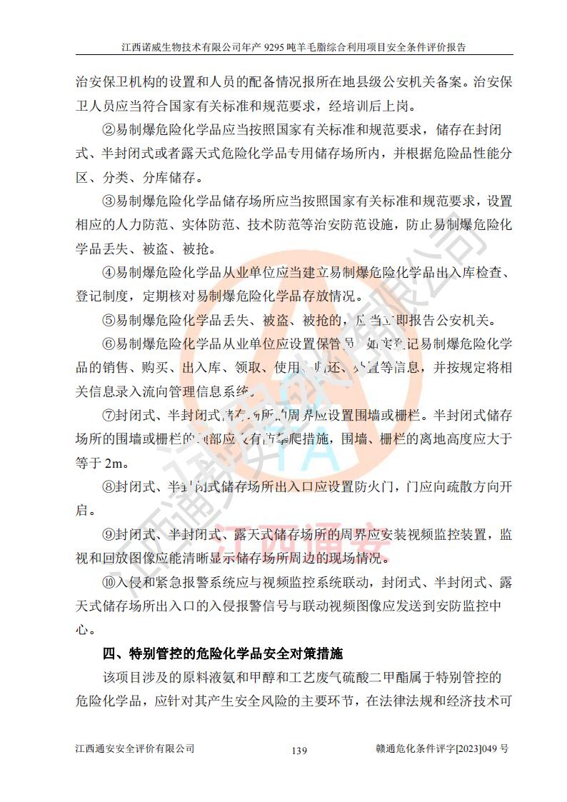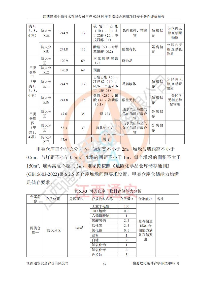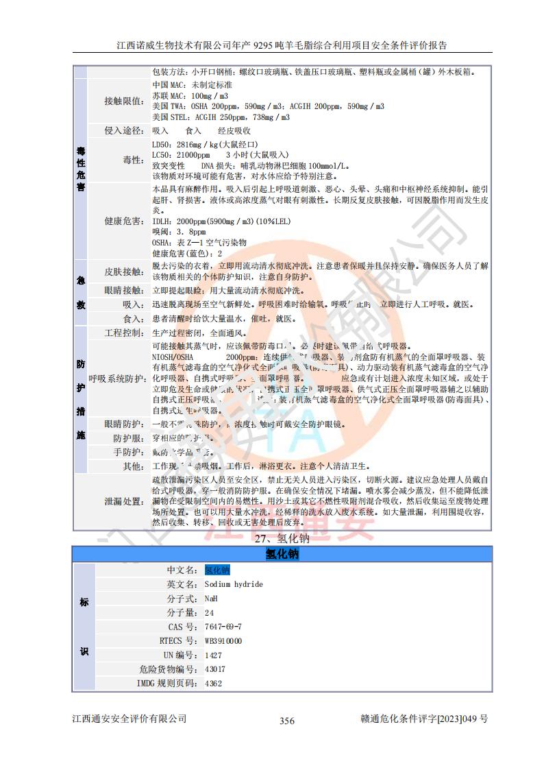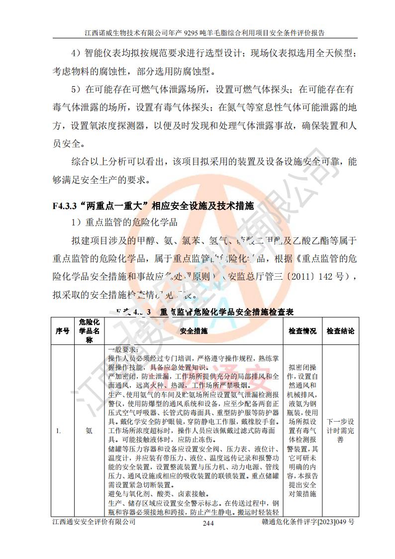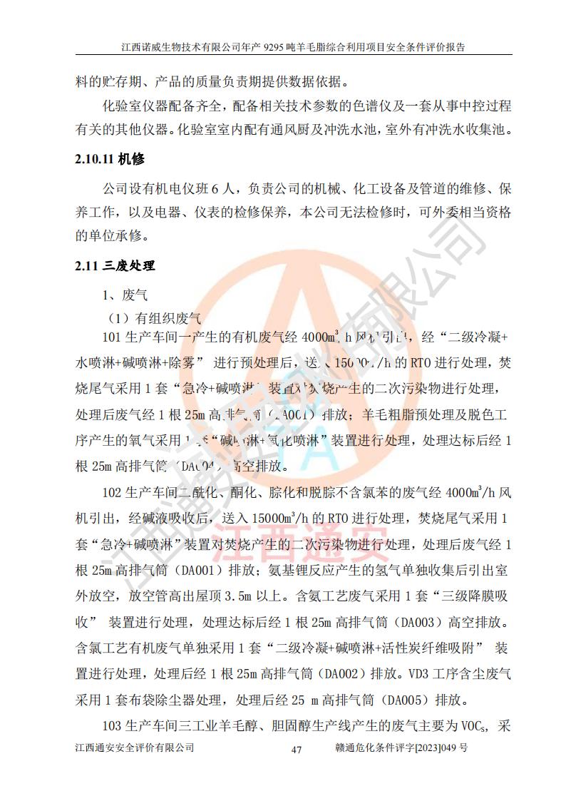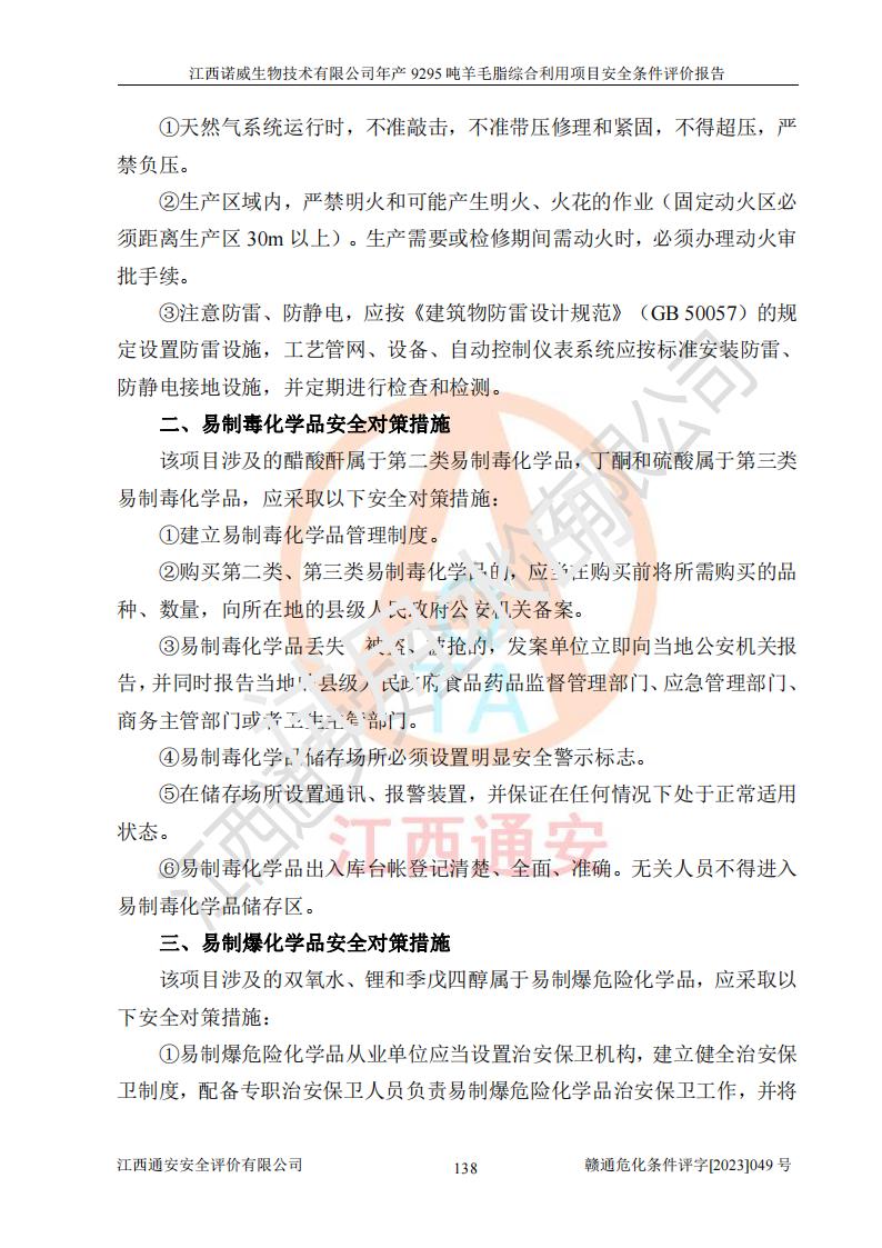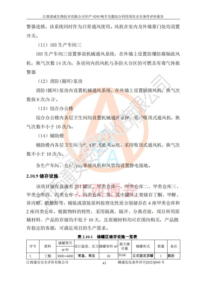 項目簡介 | 江西諾威生物技術(shù)有限公司(以下簡稱“諾威生物公司”)成立于2021年3月24日,法定**人為葉朝政,注冊資本壹億元整,經(jīng)營范圍為生物化工產(chǎn)品技術(shù)研發(fā)、化工產(chǎn)品生產(chǎn)、技術(shù)服務、技術(shù)開發(fā)、技術(shù)咨詢、技術(shù)交流、技術(shù)**、技術(shù)推廣,化工產(chǎn)品銷售等。 江西諾威生物技術(shù)有限公司擬投資70000萬元建設年產(chǎn)9295噸羊毛脂綜合利用項目,擬建地點位于江西省新干鹽化工業(yè)城四至范圍內(nèi),該工業(yè)園屬于江西省認定合格的化工園區(qū),項目占地面積79179.39m2 ,于2021年5月27日取得了新干縣發(fā)展和改革委員會的《江西省工業(yè)企業(yè)投資項目備案通知書》(項目統(tǒng)一代碼為:2105-360824-04-01-109062)。根據(jù)《國民經(jīng)濟行業(yè)分類標準》(GB/T4754-2017),項目所屬行業(yè)類別為C26化學原料和化學品制造業(yè)和C27醫(yī)藥制造業(yè),屬于精細化工。該項目生產(chǎn)過程涉及的原輔材料為粗酯、氫氧化鈉、丁酮、硫酸、甲醇、N,N-二甲基-1,3-丙二胺、1,3-丁二醇、磷酸、次磷酸、硫酸二乙酯、異丙醇、對甲苯磺酸、35%雙氧水、GML&地蠟、季戊四醇、六偏磷酸鈉、醋酸酐、石油醚、碳酸氫鈉、環(huán)己酮、三乙胺、鋰、氨、氯苯、正己烷、氫氧化鉀、冰醋酸、活性炭、膽固醇、鹽酸、對甲苯磺酰肼、乙酸乙酯、氯化鈉、淀粉、白糖、色拉油、明膠、二氧化硅、氧化鋁、光觸媒、硅藻土、氫化鈉、環(huán)己烷、氯化鋅、四氫呋喃、二氯甲烷、溶劑3、溶劑5、催化劑101#、催化劑102#、10%次氯酸鈉溶液、壓縮空氣、氮氣、發(fā)電機用柴油、燃料天然氣,中間產(chǎn)物有氨基鋰,產(chǎn)品為羊毛酸季銨鹽、羊毛酸異丙酯、羊毛酸季戊四醇酯、工業(yè)羊毛脂、D-AG、羊毛甾醇、無水羊毛脂、高酸酯、羊毛油、羊毛蠟、7-去氫膽固醇1/2/3、工業(yè)羊毛醇、羊毛酸、膽固醇1/2/3、VD2結(jié)晶、VD3油、VD3粉、VD3結(jié)晶,副產(chǎn)品為20%氨水、硫酸鈉、碳酸鋰,尾氣主要為酸性氣體、粉塵、VOCS、氫氣、氨氣及硫酸二甲酯等。其中氫氧化鈉、丁酮、硫酸、甲醇、N,N-二甲基-1,3-丙二胺、磷酸、次磷酸、硫酸二乙酯、異丙醇、35%雙氧水、醋酸酐、石油醚、環(huán)己酮、三乙胺、鋰、氨、氯苯、正己烷、環(huán)己烷、氫氧化鉀、冰醋酸、氫化鈉、氨基鋰、乙酸乙酯、二氯甲烷、20%氨水、四氫呋喃、溶劑3、氯化鋅、鹽酸、氮氣、天然氣、制冷劑R22、發(fā)電機用柴油、氫氣、硫酸二甲酯、10%次氯酸鈉溶液屬于危險化學品。經(jīng)辨識,該項目涉及甲醇、氨、氯苯、氫氣、乙酸乙酯、硫酸二甲酯及燃氣天然氣屬于重點監(jiān)管的危險化學品,氧化反應和烷基化反應屬于重點監(jiān)管的危險化工工藝,生產(chǎn)、儲存單元不構(gòu)成重大危險源。根據(jù)《危險化學品生產(chǎn)企業(yè)安全生產(chǎn)許可證實施辦法》,該項目副產(chǎn)品20%氨水屬于危險化學品,且生產(chǎn)過程中涉及溶劑回收,因此需要辦理危險化學品安全生產(chǎn)許可證。 | ||||