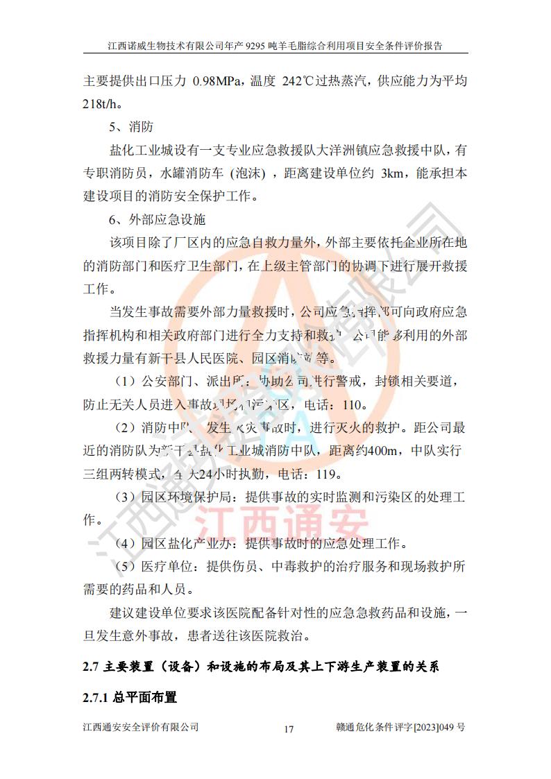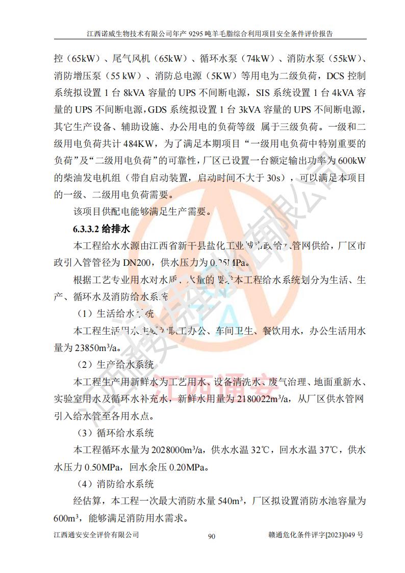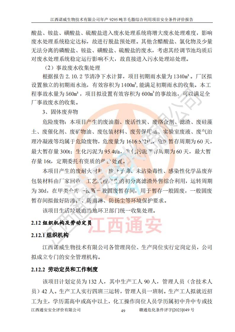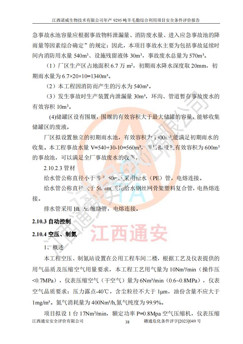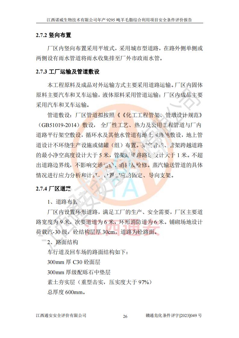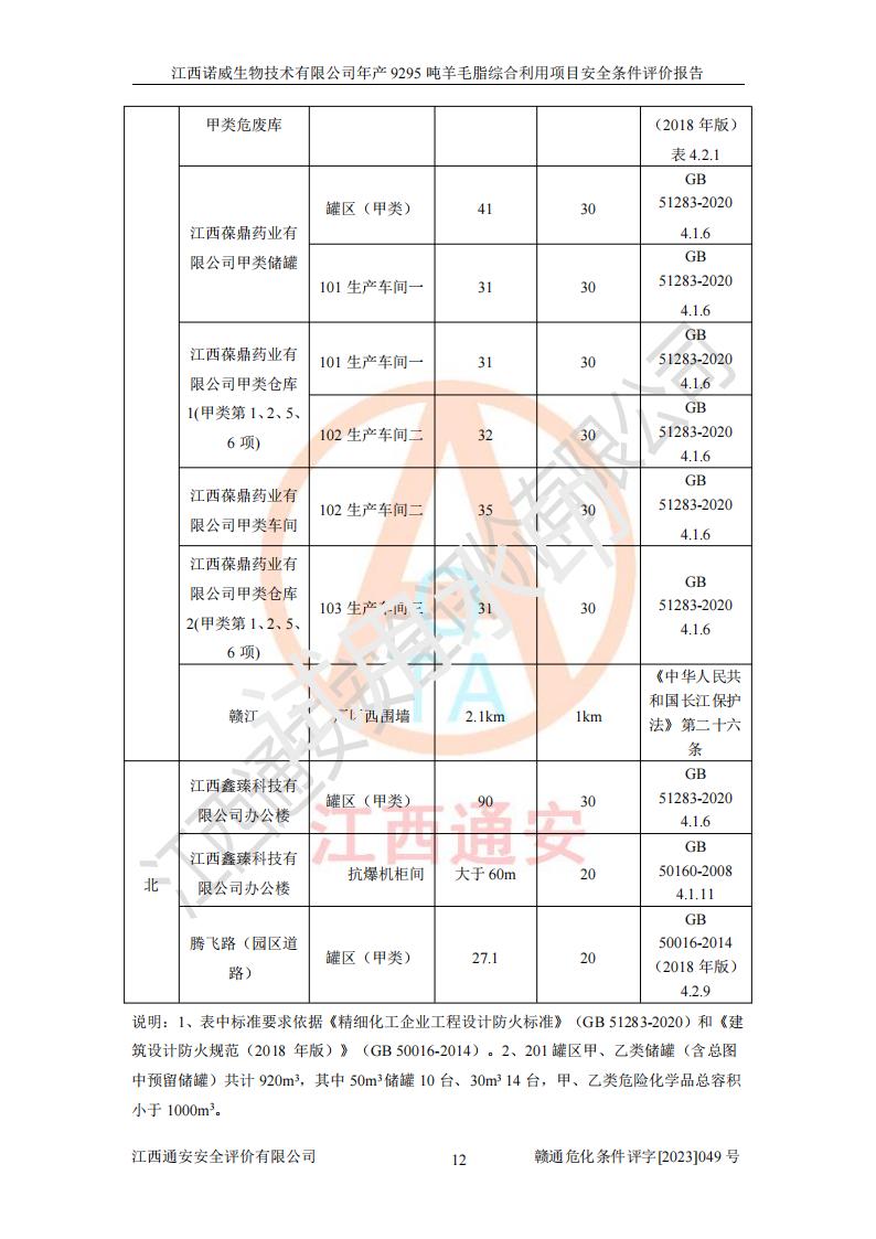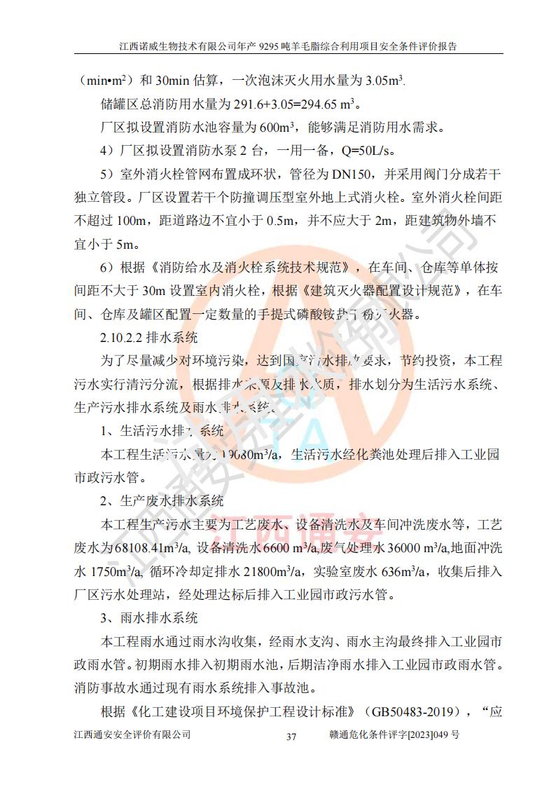 項目簡介 | 江西諾威生物技術(shù)有限公司(以下簡稱“諾威生物公司”)成立于2021年3月24日,法定**人為葉朝政,注冊資本壹億元整,經(jīng)營范圍為生物化工產(chǎn)品技術(shù)研發(fā)、化工產(chǎn)品生產(chǎn)、技術(shù)服務、技術(shù)開發(fā)、技術(shù)咨詢、技術(shù)交流、技術(shù)**、技術(shù)推廣,化工產(chǎn)品銷售等。 江西諾威生物技術(shù)有限公司擬投資70000萬元建設年產(chǎn)9295噸羊毛脂綜合利用項目,擬建地點位于江西省新干鹽化工業(yè)城四至范圍內(nèi),該工業(yè)園屬于江西省認定合格的化工園區(qū),項目占地面積79179.39m2 ,于2021年5月27日取得了新干縣發(fā)展和改革委員會的《江西省工業(yè)企業(yè)投資項目備案通知書》(項目統(tǒng)一代碼為:2105-360824-04-01-109062)。根據(jù)《國民經(jīng)濟行業(yè)分類標準》(GB/T4754-2017),項目所屬行業(yè)類別為C26化學原料和化學品制造業(yè)和C27醫(yī)藥制造業(yè),屬于精細化工。該項目生產(chǎn)過程涉及的原輔材料為粗酯、氫氧化鈉、丁酮、硫酸、甲醇、N,N-二甲基-1,3-丙二胺、1,3-丁二醇、磷酸、次磷酸、硫酸二乙酯、異丙醇、對甲苯磺酸、35%雙氧水、GML&地蠟、季戊四醇、六偏磷酸鈉、醋酸酐、石油醚、碳酸氫鈉、環(huán)己酮、三乙胺、鋰、氨、氯苯、正己烷、氫氧化鉀、冰醋酸、活性炭、膽固醇、鹽酸、對甲苯磺酰肼、乙酸乙酯、氯化鈉、淀粉、白糖、色拉油、明膠、二氧化硅、氧化鋁、光觸媒、硅藻土、氫化鈉、環(huán)己烷、氯化鋅、四氫呋喃、二氯甲烷、溶劑3、溶劑5、催化劑101#、催化劑102#、10%次氯酸鈉溶液、壓縮空氣、氮氣、發(fā)電機用柴油、燃料天然氣,中間產(chǎn)物有氨基鋰,產(chǎn)品為羊毛酸季銨鹽、羊毛酸異丙酯、羊毛酸季戊四醇酯、工業(yè)羊毛脂、D-AG、羊毛甾醇、無水羊毛脂、高酸酯、羊毛油、羊毛蠟、7-去氫膽固醇1/2/3、工業(yè)羊毛醇、羊毛酸、膽固醇1/2/3、VD2結(jié)晶、VD3油、VD3粉、VD3結(jié)晶,副產(chǎn)品為20%氨水、硫酸鈉、碳酸鋰,尾氣主要為酸性氣體、粉塵、VOCS、氫氣、氨氣及硫酸二甲酯等。其中氫氧化鈉、丁酮、硫酸、甲醇、N,N-二甲基-1,3-丙二胺、磷酸、次磷酸、硫酸二乙酯、異丙醇、35%雙氧水、醋酸酐、石油醚、環(huán)己酮、三乙胺、鋰、氨、氯苯、正己烷、環(huán)己烷、氫氧化鉀、冰醋酸、氫化鈉、氨基鋰、乙酸乙酯、二氯甲烷、20%氨水、四氫呋喃、溶劑3、氯化鋅、鹽酸、氮氣、天然氣、制冷劑R22、發(fā)電機用柴油、氫氣、硫酸二甲酯、10%次氯酸鈉溶液屬于危險化學品。經(jīng)辨識,該項目涉及甲醇、氨、氯苯、氫氣、乙酸乙酯、硫酸二甲酯及燃氣天然氣屬于重點監(jiān)管的危險化學品,氧化反應和烷基化反應屬于重點監(jiān)管的危險化工工藝,生產(chǎn)、儲存單元不構(gòu)成重大危險源。根據(jù)《危險化學品生產(chǎn)企業(yè)安全生產(chǎn)許可證實施辦法》,該項目副產(chǎn)品20%氨水屬于危險化學品,且生產(chǎn)過程中涉及溶劑回收,因此需要辦理危險化學品安全生產(chǎn)許可證。 | ||||