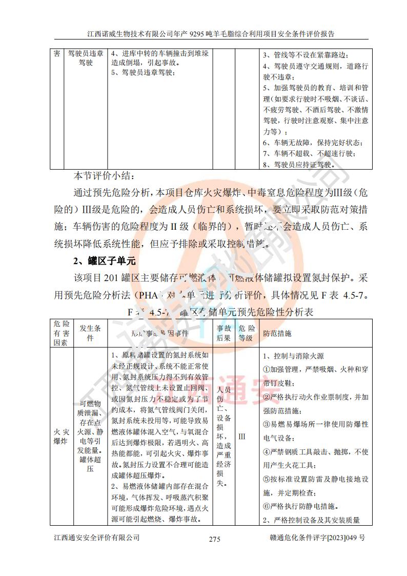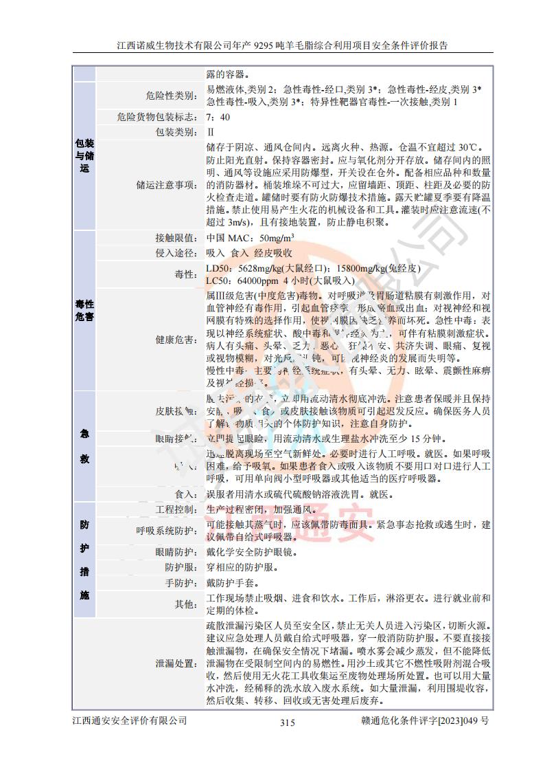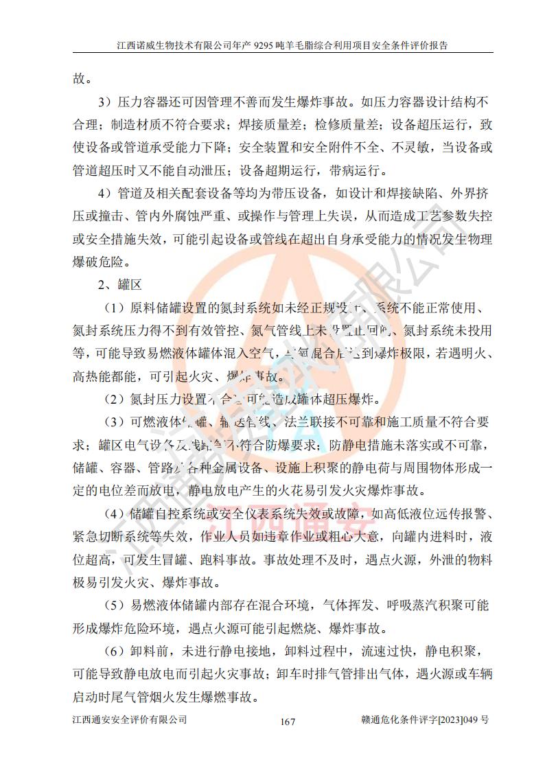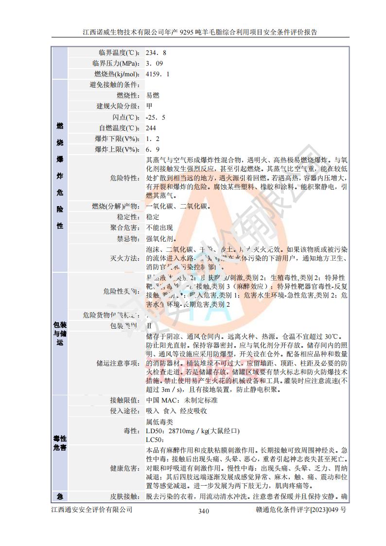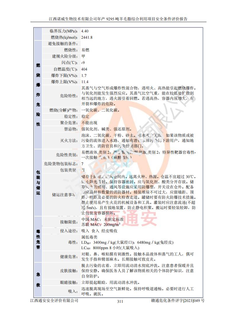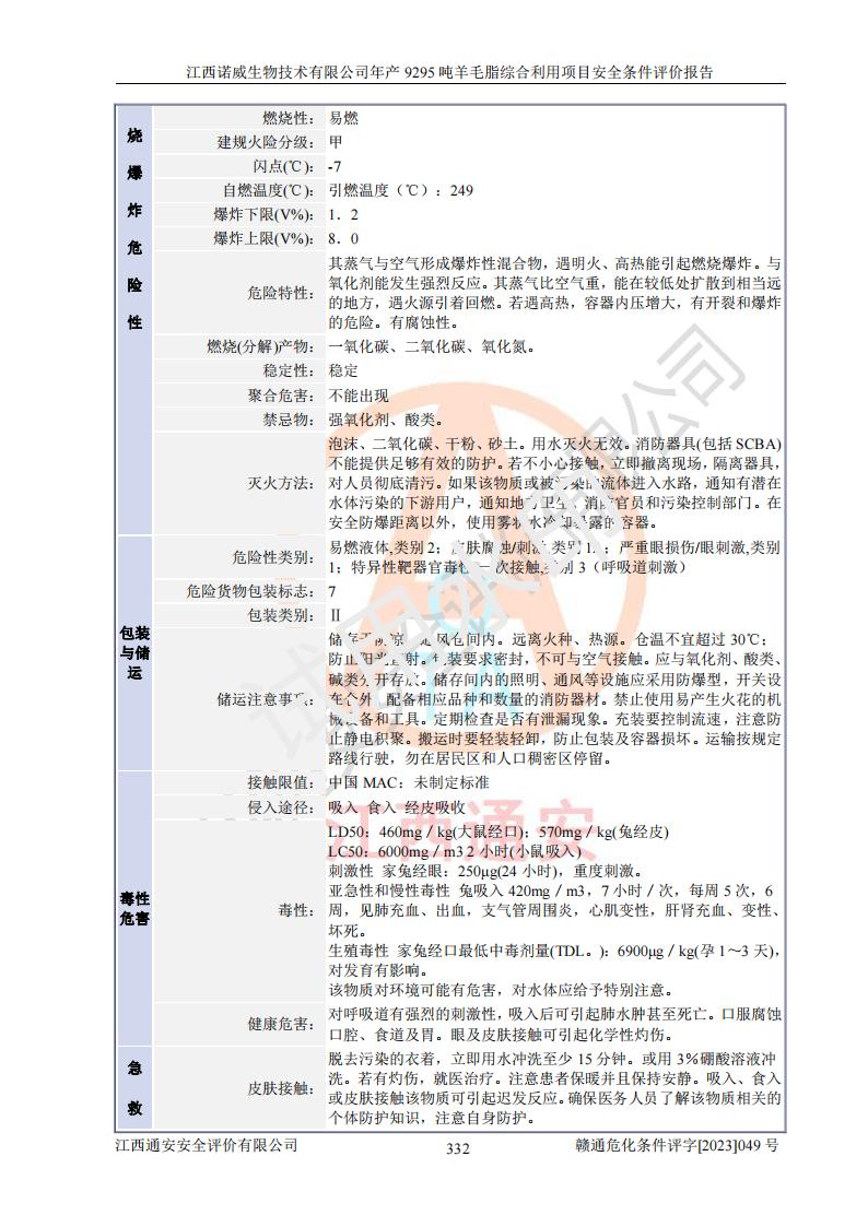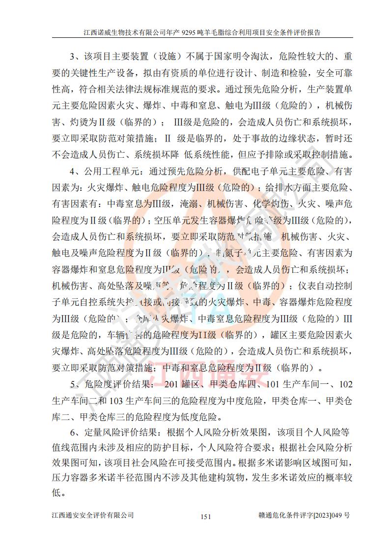 其它 | 一、主要危險、有害因素評價結(jié)果 通過對江西諾威生物技術(shù)有限公司年產(chǎn)9295噸羊毛脂綜合利用項目的危險、有害因素分析及定性、定量分析,結(jié)果為: 1、主要危險、有害因素 該項目在建成后的運行過程中存在火災與爆炸、中毒與窒息、觸電、機械傷害、高處墜落、物體打擊、**傷害、起重傷害、灼燙、淹溺、其他傷害等危險因素和化學因素、粉塵、物理因素等有害因素。 2、危險化學品辨識結(jié)果 該項目涉及的各種物質(zhì)中,氫氧化鈉、丁酮、硫酸、甲醇、N,N-二甲基-1,3-丙二胺、磷酸、次磷酸、硫酸二乙酯、異丙醇、35%雙氧水、醋酸酐、石油醚、環(huán)己酮、三乙胺、鋰、氨、氯苯、正己烷、環(huán)己烷、氫氧化鉀、冰醋酸、氫化鈉、氨基鋰、乙酸乙酯、二氯甲烷、20%氨水、四氫呋喃、溶劑3、氯化鋅、鹽酸、天然氣、制冷劑R22、發(fā)電機用柴油、氮氣、氫氣、硫酸二甲酯、10%次氯酸鈉溶液屬于危險化學品。甲醇、氨、氯苯、氫氣、硫酸二甲酯、乙酸乙酯及燃氣天然氣屬于重點監(jiān)管的危險化學品,醋酸酐、丁酮、鹽酸和硫酸屬于易制毒化學品,氨和工藝廢氣硫酸二甲酯屬于高毒物品,雙氧水、鋰和季戊四醇屬于易制爆危險化學品,氨、甲醇和工藝廢氣硫酸二甲酯屬于特別管控危險化學品,不涉及監(jiān)控化學品和劇毒化學品。 3、重點監(jiān)管的危險化工工藝辨識結(jié)果 該項目涉及的氧化反應和烷基化反應屬于重點監(jiān)管的危險化工工藝。 4、重大危險源辨識結(jié)果 該項目各生產(chǎn)、儲存單位均不構(gòu)成危險化學品重大危險源。 二、重點防范的重大危險、有害因素 通過對該項目存在的危險、有害因素進行分析辨識,在生產(chǎn)過程中重點防范的重大危險、有害因素主要為火災與爆炸、中毒與窒息。 1、該項目涉及重點監(jiān)管的危險化工工藝(氧化反應、烷基化反應)和重點監(jiān)管的危險化學品(甲醇、氨、氯苯、乙酸乙酯、天然氣、氫氣和硫酸二甲酯),公司應在全面開展過程危險分析(如危險與可操作性分析)基礎上,通過風險分析確定安全儀表功能,設計符合要求的安全儀表系統(tǒng),包括安全聯(lián)鎖系統(tǒng)、緊急停車系統(tǒng)和可燃/有毒氣體檢測報警系統(tǒng)等。 2、根據(jù)《石油化工可燃氣體和有毒氣體檢測報警設計標準》GB/T 50493-2019要求,在可能發(fā)生可燃、有毒氣體泄漏的場所設置相應的固定式氣體探測器,對可燃、有毒氣體的釋放源進行檢測,并將報警信號遠傳至有人值守的控制室。 3、爆炸危險場所的電氣設施,**符合防爆要求,防止電氣火花引發(fā)火災爆炸事故。 該項目存在的危險、有害因素如果采取了本報告提出的安全對策措施,加強安全管理工作,做好日常安全管理、安全檢查,嚴格執(zhí)行安全規(guī)程,杜*違“三違”等不良作風,加強設備的安全設施的檢測檢驗工作,保障應急設施、設備的完好等工作,則其存在的危險有害因素就可能相對減少,即使發(fā)生事故,也會將事故損失降低到*低。 五主要單元評價結(jié)果 在對該項目危險、有害因素辨識分析的基礎上,運用安全檢查表、預先危險性分析、危險度評價、定量風險評價等評價方法對該項目進行了分析評價,評價結(jié)果如下: 1、項目選址位于江西省新干鹽化工業(yè)城四至范圍內(nèi),該工業(yè)園屬于認定合格的化工園區(qū),符合當?shù)匾?guī)劃,與周邊環(huán)境的距離符合有關(guān)標準、規(guī)范的要求。 2、總圖布置分區(qū)明確,建(構(gòu))筑物的防火間距符合規(guī)范要求。可研報告未明確的安全設施,本報告提出安全對策措施,設計時完善。 3、該項目主要裝置(設施)不屬于**明令淘汰,危險性較大的、重要的關(guān)鍵性生產(chǎn)設備,擬由有資質(zhì)的單位進行設計、制造和檢驗,安全可靠性高,符合相關(guān)法律法規(guī)標準規(guī)范的要求。通過預先危險分析,生產(chǎn)裝置單元主要危險因素火災、爆炸、中毒和窒息、觸電為Ⅲ級(危險的),機械傷害、灼燙為Ⅱ級(臨界的); Ⅲ級是危險的,會造成人員傷亡和系統(tǒng)損壞,要立即采取防范對策措施;Ⅱ 級是臨界的,處于事故的邊緣狀態(tài),暫時還不會造成人員傷亡、系統(tǒng)損壞降 低系統(tǒng)性能,但應予排除或采取控制措施。 4、公用工程單元:通過預先危險分析,供配電子單元主要危險、有害因素為:火災爆炸、觸電危險程度為Ⅲ級(危險的);給排水方面主要危險、有害因素有:中毒窒息為Ⅲ級,淹溺、機械傷害、化學灼傷、火災、噪聲危險程度為Ⅱ級(臨界的);空壓單元發(fā)生容器爆炸危險等級為Ⅲ級(危險的),會造成人員傷亡和系統(tǒng)損壞,要立即采取防范對策措施。機械傷害、火災、觸電及噪聲危險程度為Ⅱ級(臨界的);制氮子單元主要危險、有害因素為容器爆炸和窒息危險程度為Ⅲ級(危險的),會造成人員傷亡和系統(tǒng)損壞;機械傷害、高處墜落及噪聲等,危險程度為Ⅱ級(臨界的);儀表自動控制子單元自控系統(tǒng)失控直接或間接導致的火災爆炸、中毒、容器爆炸危險程度為Ⅲ級(危險的);倉庫火災爆炸、中毒窒息危險程度為Ⅲ級(危險的)Ⅲ級是危險的,**傷害的危險程度為II級(臨界的),罐區(qū)主要危險因素火災爆炸、高處墜落危險程度為Ⅲ級(危險的),會造成人員傷亡和系統(tǒng)損壞,要立即采取防