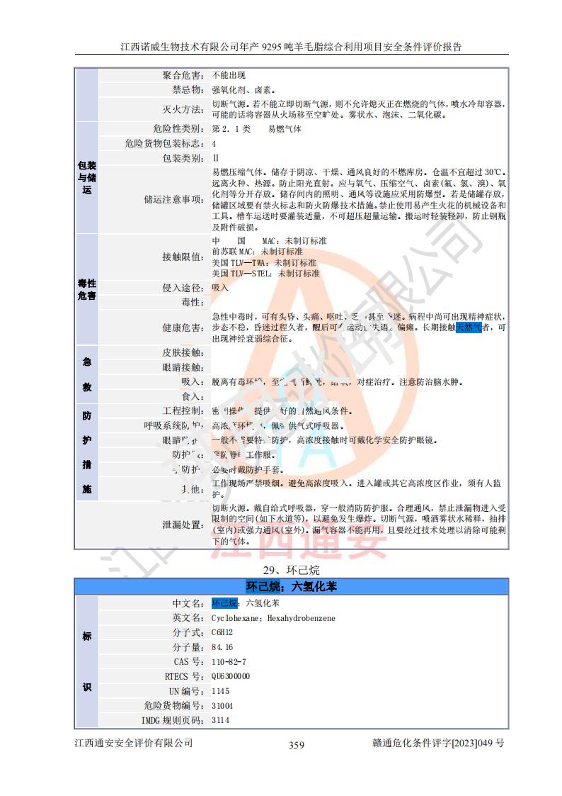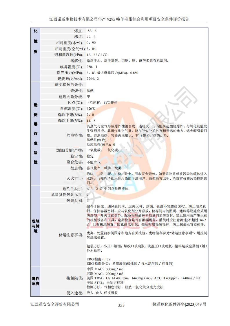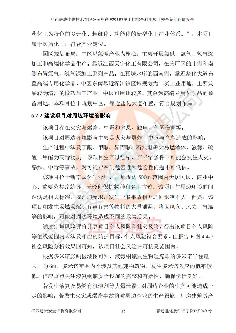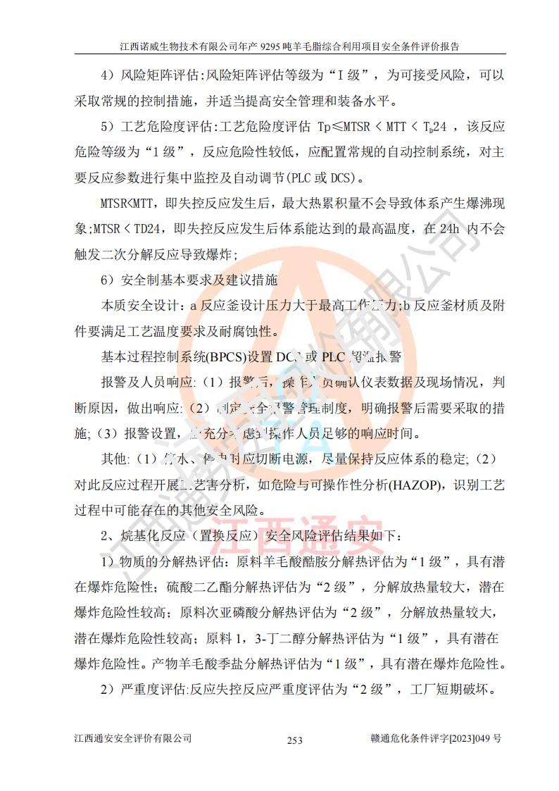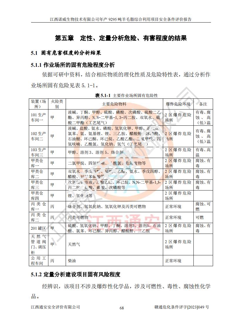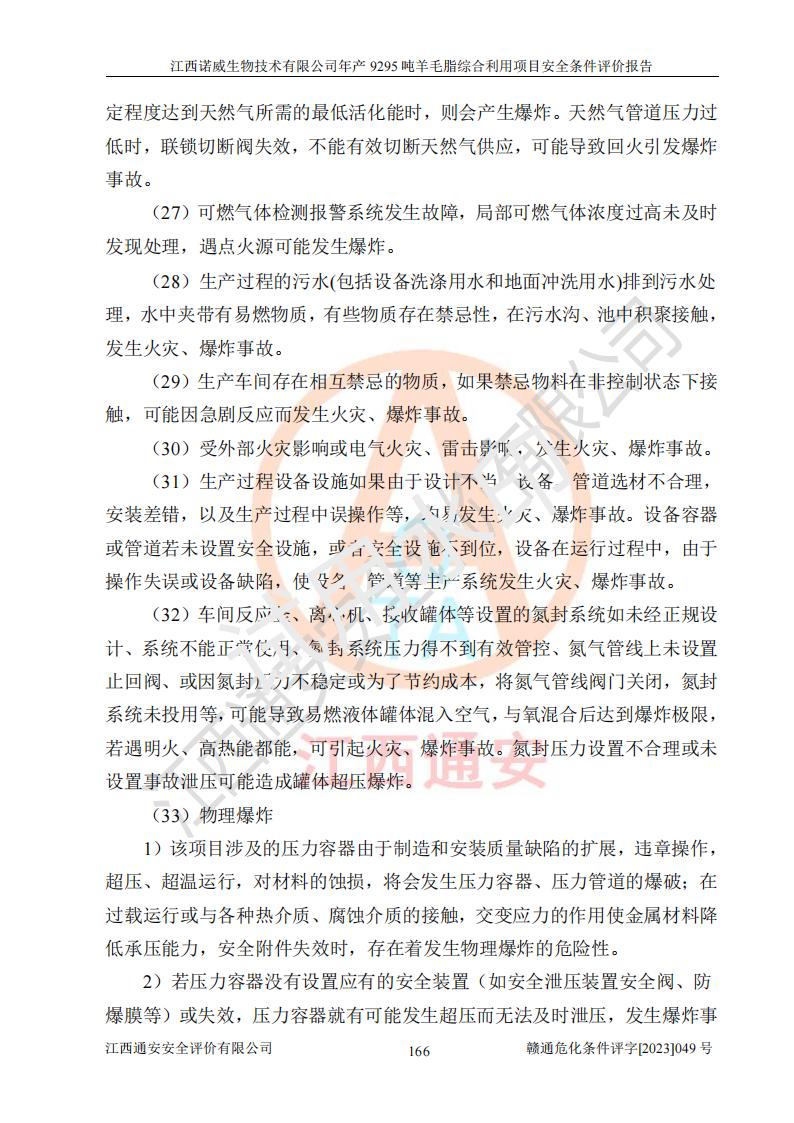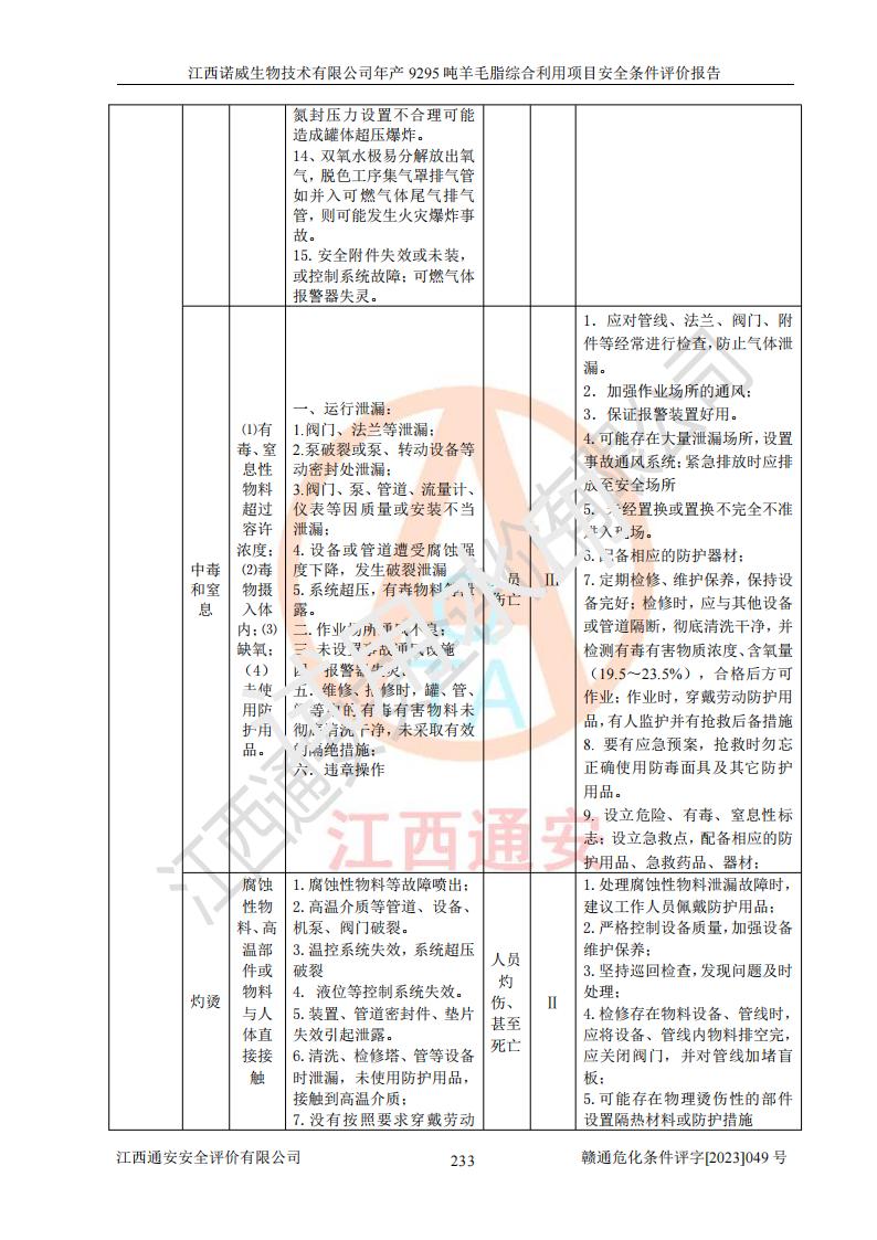 其它 | 一、主要危險、有害因素評價結(jié)果 通過對江西諾威生物技術(shù)有限公司年產(chǎn)9295噸羊毛脂綜合利用項目的危險、有害因素分析及定性、定量分析,結(jié)果為: 1、主要危險、有害因素 該項目在建成后的運行過程中存在火災與爆炸、中毒與窒息、觸電、機械傷害、高處墜落、物體打擊、**傷害、起重傷害、灼燙、淹溺、其他傷害等危險因素和化學因素、粉塵、物理因素等有害因素。 2、危險化學品辨識結(jié)果 該項目涉及的各種物質(zhì)中,氫氧化鈉、丁酮、硫酸、甲醇、N,N-二甲基-1,3-丙二胺、磷酸、次磷酸、硫酸二乙酯、異丙醇、35%雙氧水、醋酸酐、石油醚、環(huán)己酮、三乙胺、鋰、氨、氯苯、正己烷、環(huán)己烷、氫氧化鉀、冰醋酸、氫化鈉、氨基鋰、乙酸乙酯、二氯甲烷、20%氨水、四氫呋喃、溶劑3、氯化鋅、鹽酸、天然氣、制冷劑R22、發(fā)電機用柴油、氮氣、氫氣、硫酸二甲酯、10%次氯酸鈉溶液屬于危險化學品。甲醇、氨、氯苯、氫氣、硫酸二甲酯、乙酸乙酯及燃氣天然氣屬于重點監(jiān)管的危險化學品,醋酸酐、丁酮、鹽酸和硫酸屬于易制毒化學品,氨和工藝廢氣硫酸二甲酯屬于高毒物品,雙氧水、鋰和季戊四醇屬于易制爆危險化學品,氨、甲醇和工藝廢氣硫酸二甲酯屬于特別管控危險化學品,不涉及監(jiān)控化學品和劇毒化學品。 3、重點監(jiān)管的危險化工工藝辨識結(jié)果 該項目涉及的氧化反應和烷基化反應屬于重點監(jiān)管的危險化工工藝。 4、重大危險源辨識結(jié)果 該項目各生產(chǎn)、儲存單位均不構(gòu)成危險化學品重大危險源。 二、重點防范的重大危險、有害因素 通過對該項目存在的危險、有害因素進行分析辨識,在生產(chǎn)過程中重點防范的重大危險、有害因素主要為火災與爆炸、中毒與窒息。 1、該項目涉及重點監(jiān)管的危險化工工藝(氧化反應、烷基化反應)和重點監(jiān)管的危險化學品(甲醇、氨、氯苯、乙酸乙酯、天然氣、氫氣和硫酸二甲酯),公司應在全面開展過程危險分析(如危險與可操作性分析)基礎上,通過風險分析確定安全儀表功能,設計符合要求的安全儀表系統(tǒng),包括安全聯(lián)鎖系統(tǒng)、緊急停車系統(tǒng)和可燃/有毒氣體檢測報警系統(tǒng)等。 2、根據(jù)《石油化工可燃氣體和有毒氣體檢測報警設計標準》GB/T 50493-2019要求,在可能發(fā)生可燃、有毒氣體泄漏的場所設置相應的固定式氣體探測器,對可燃、有毒氣體的釋放源進行檢測,并將報警信號遠傳至有人值守的控制室。 3、爆炸危險場所的電氣設施,**符合防爆要求,防止電氣火花引發(fā)火災爆炸事故。 該項目存在的危險、有害因素如果采取了本報告提出的安全對策措施,加強安全管理工作,做好日常安全管理、安全檢查,嚴格執(zhí)行安全規(guī)程,杜*違“三違”等不良作風,加強設備的安全設施的檢測檢驗工作,保障應急設施、設備的完好等工作,則其存在的危險有害因素就可能相對減少,即使發(fā)生事故,也會將事故損失降低到*低。 五主要單元評價結(jié)果 在對該項目危險、有害因素辨識分析的基礎上,運用安全檢查表、預先危險性分析、危險度評價、定量風險評價等評價方法對該項目進行了分析評價,評價結(jié)果如下: 1、項目選址位于江西省新干鹽化工業(yè)城四至范圍內(nèi),該工業(yè)園屬于認定合格的化工園區(qū),符合當?shù)匾?guī)劃,與周邊環(huán)境的距離符合有關(guān)標準、規(guī)范的要求。 2、總圖布置分區(qū)明確,建(構(gòu))筑物的防火間距符合規(guī)范要求。可研報告未明確的安全設施,本報告提出安全對策措施,設計時完善。 3、該項目主要裝置(設施)不屬于**明令淘汰,危險性較大的、重要的關(guān)鍵性生產(chǎn)設備,擬由有資質(zhì)的單位進行設計、制造和檢驗,安全可靠性高,符合相關(guān)法律法規(guī)標準規(guī)范的要求。通過預先危險分析,生產(chǎn)裝置單元主要危險因素火災、爆炸、中毒和窒息、觸電為Ⅲ級(危險的),機械傷害、灼燙為Ⅱ級(臨界的); Ⅲ級是危險的,會造成人員傷亡和系統(tǒng)損壞,要立即采取防范對策措施;Ⅱ 級是臨界的,處于事故的邊緣狀態(tài),暫時還不會造成人員傷亡、系統(tǒng)損壞降 低系統(tǒng)性能,但應予排除或采取控制措施。 4、公用工程單元:通過預先危險分析,供配電子單元主要危險、有害因素為:火災爆炸、觸電危險程度為Ⅲ級(危險的);給排水方面主要危險、有害因素有:中毒窒息為Ⅲ級,淹溺、機械傷害、化學灼傷、火災、噪聲危險程度為Ⅱ級(臨界的);空壓單元發(fā)生容器爆炸危險等級為Ⅲ級(危險的),會造成人員傷亡和系統(tǒng)損壞,要立即采取防范對策措施。機械傷害、火災、觸電及噪聲危險程度為Ⅱ級(臨界的);制氮子單元主要危險、有害因素為容器爆炸和窒息危險程度為Ⅲ級(危險的),會造成人員傷亡和系統(tǒng)損壞;機械傷害、高處墜落及噪聲等,危險程度為Ⅱ級(臨界的);儀表自動控制子單元自控系統(tǒng)失控直接或間接導致的火災爆炸、中毒、容器爆炸危險程度為Ⅲ級(危險的);倉庫火災爆炸、中毒窒息危險程度為Ⅲ級(危險的)Ⅲ級是危險的,**傷害的危險程度為II級(臨界的),罐區(qū)主要危險因素火災爆炸、高處墜落危險程度為Ⅲ級(危險的),會造成人員傷亡和系統(tǒng)損壞,要立即采取防
