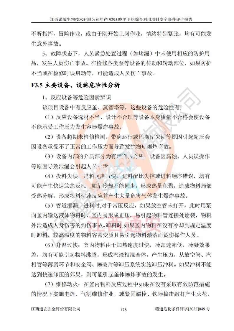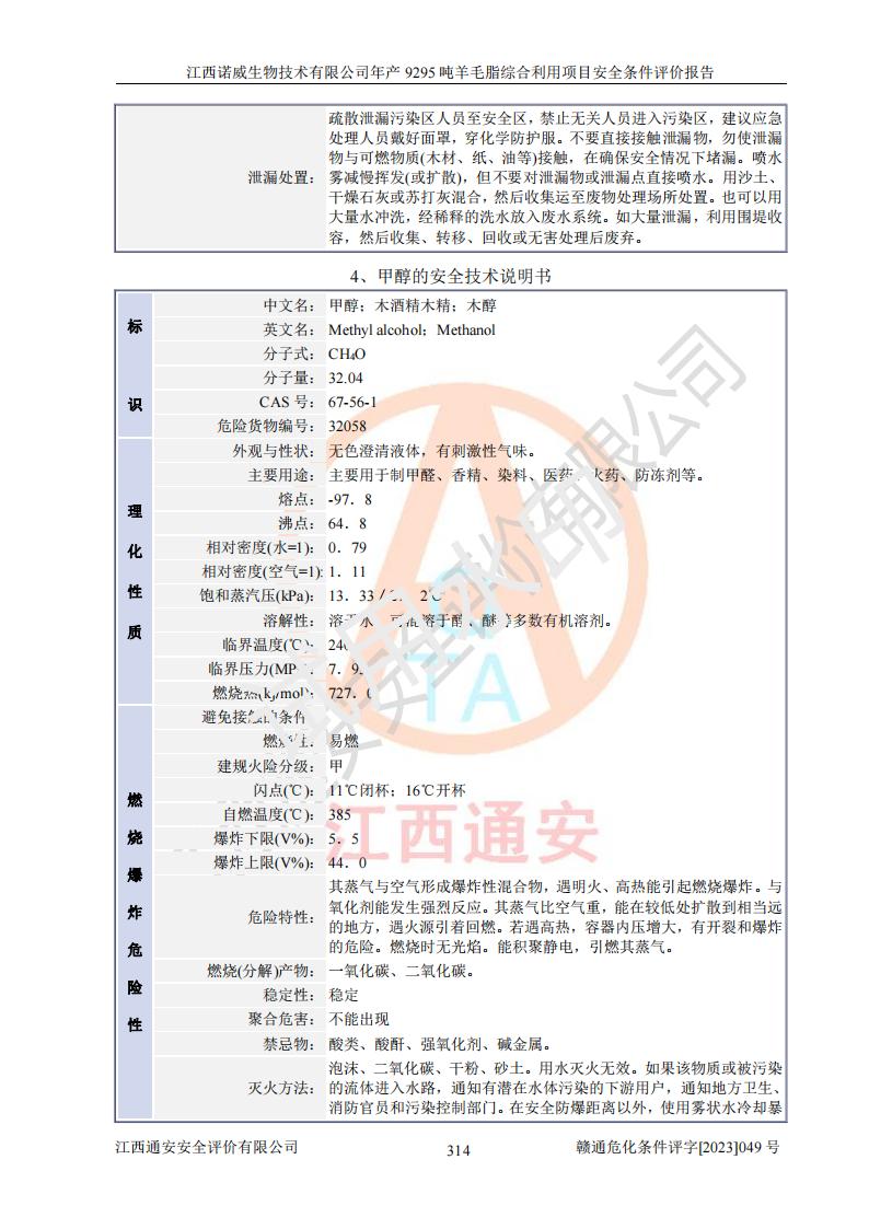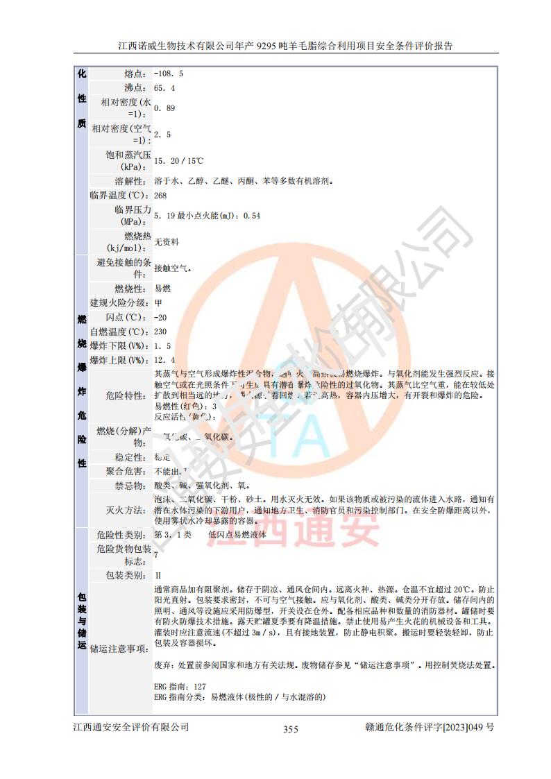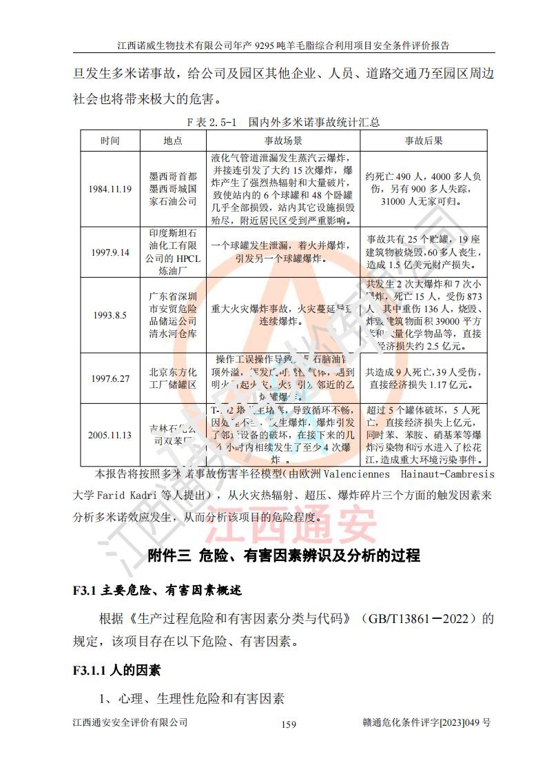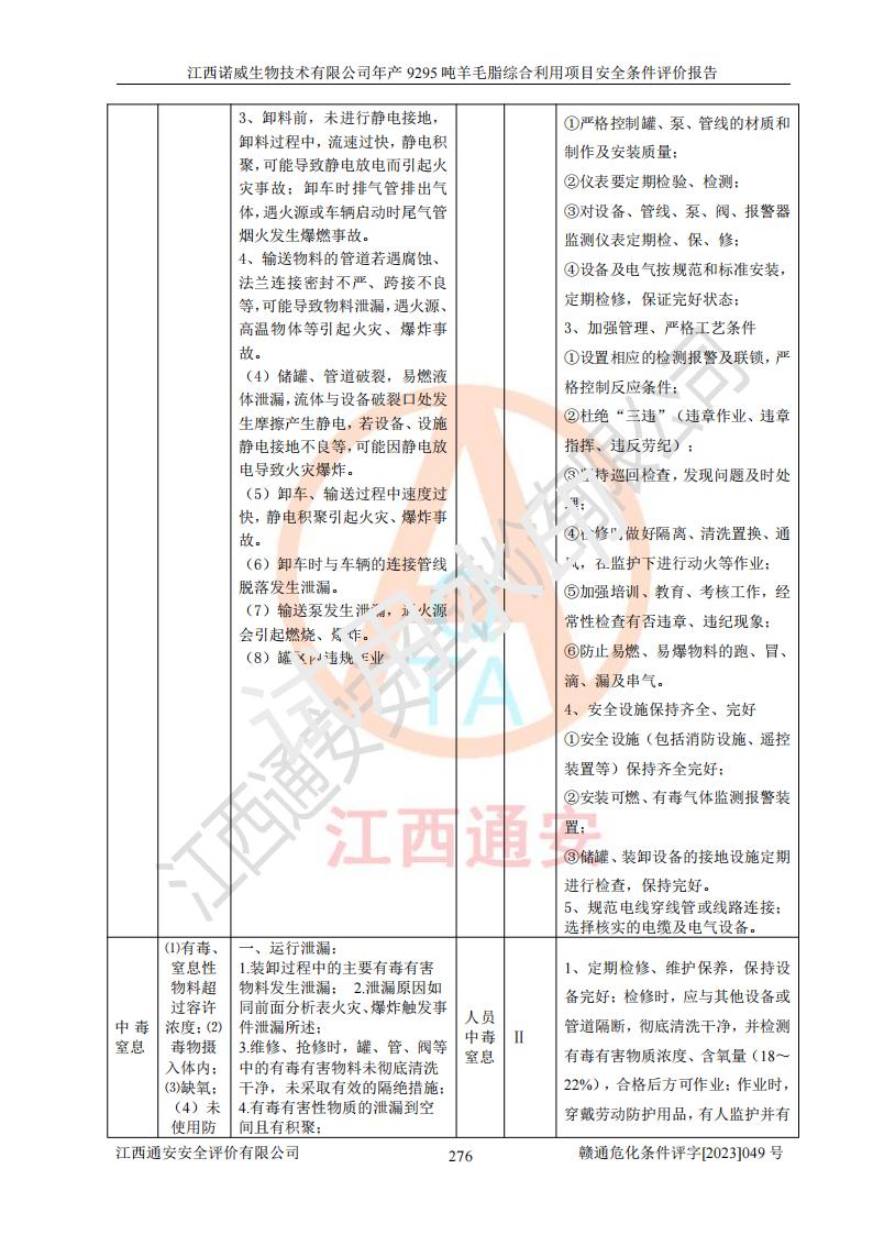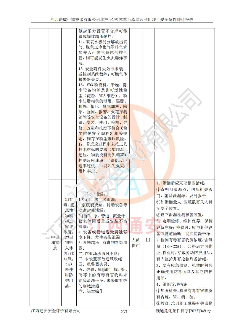 其它 | 一、主要危險、有害因素評價結(jié)果 通過對江西諾威生物技術(shù)有限公司年產(chǎn)9295噸羊毛脂綜合利用項目的危險、有害因素分析及定性、定量分析,結(jié)果為: 1、主要危險、有害因素 該項目在建成后的運行過程中存在火災與爆炸、中毒與窒息、觸電、機械傷害、高處墜落、物體打擊、**傷害、起重傷害、灼燙、淹溺、其他傷害等危險因素和化學因素、粉塵、物理因素等有害因素。 2、危險化學品辨識結(jié)果 該項目涉及的各種物質(zhì)中,氫氧化鈉、丁酮、硫酸、甲醇、N,N-二甲基-1,3-丙二胺、磷酸、次磷酸、硫酸二乙酯、異丙醇、35%雙氧水、醋酸酐、石油醚、環(huán)己酮、三乙胺、鋰、氨、氯苯、正己烷、環(huán)己烷、氫氧化鉀、冰醋酸、氫化鈉、氨基鋰、乙酸乙酯、二氯甲烷、20%氨水、四氫呋喃、溶劑3、氯化鋅、鹽酸、天然氣、制冷劑R22、發(fā)電機用柴油、氮氣、氫氣、硫酸二甲酯、10%次氯酸鈉溶液屬于危險化學品。甲醇、氨、氯苯、氫氣、硫酸二甲酯、乙酸乙酯及燃氣天然氣屬于重點監(jiān)管的危險化學品,醋酸酐、丁酮、鹽酸和硫酸屬于易制毒化學品,氨和工藝廢氣硫酸二甲酯屬于高毒物品,雙氧水、鋰和季戊四醇屬于易制爆危險化學品,氨、甲醇和工藝廢氣硫酸二甲酯屬于特別管控危險化學品,不涉及監(jiān)控化學品和劇毒化學品。 3、重點監(jiān)管的危險化工工藝辨識結(jié)果 該項目涉及的氧化反應和烷基化反應屬于重點監(jiān)管的危險化工工藝。 4、重大危險源辨識結(jié)果 該項目各生產(chǎn)、儲存單位均不構(gòu)成危險化學品重大危險源。 二、重點防范的重大危險、有害因素 通過對該項目存在的危險、有害因素進行分析辨識,在生產(chǎn)過程中重點防范的重大危險、有害因素主要為火災與爆炸、中毒與窒息。 1、該項目涉及重點監(jiān)管的危險化工工藝(氧化反應、烷基化反應)和重點監(jiān)管的危險化學品(甲醇、氨、氯苯、乙酸乙酯、天然氣、氫氣和硫酸二甲酯),公司應在全面開展過程危險分析(如危險與可操作性分析)基礎上,通過風險分析確定安全儀表功能,設計符合要求的安全儀表系統(tǒng),包括安全聯(lián)鎖系統(tǒng)、緊急停車系統(tǒng)和可燃/有毒氣體檢測報警系統(tǒng)等。 2、根據(jù)《石油化工可燃氣體和有毒氣體檢測報警設計標準》GB/T 50493-2019要求,在可能發(fā)生可燃、有毒氣體泄漏的場所設置相應的固定式氣體探測器,對可燃、有毒氣體的釋放源進行檢測,并將報警信號遠傳至有人值守的控制室。 3、爆炸危險場所的電氣設施,**符合防爆要求,防止電氣火花引發(fā)火災爆炸事故。 該項目存在的危險、有害因素如果采取了本報告提出的安全對策措施,加強安全管理工作,做好日常安全管理、安全檢查,嚴格執(zhí)行安全規(guī)程,杜*違“三違”等不良作風,加強設備的安全設施的檢測檢驗工作,保障應急設施、設備的完好等工作,則其存在的危險有害因素就可能相對減少,即使發(fā)生事故,也會將事故損失降低到*低。 五主要單元評價結(jié)果 在對該項目危險、有害因素辨識分析的基礎上,運用安全檢查表、預先危險性分析、危險度評價、定量風險評價等評價方法對該項目進行了分析評價,評價結(jié)果如下: 1、項目選址位于江西省新干鹽化工業(yè)城四至范圍內(nèi),該工業(yè)園屬于認定合格的化工園區(qū),符合當?shù)匾?guī)劃,與周邊環(huán)境的距離符合有關(guān)標準、規(guī)范的要求。 2、總圖布置分區(qū)明確,建(構(gòu))筑物的防火間距符合規(guī)范要求。可研報告未明確的安全設施,本報告提出安全對策措施,設計時完善。 3、該項目主要裝置(設施)不屬于**明令淘汰,危險性較大的、重要的關(guān)鍵性生產(chǎn)設備,擬由有資質(zhì)的單位進行設計、制造和檢驗,安全可靠性高,符合相關(guān)法律法規(guī)標準規(guī)范的要求。通過預先危險分析,生產(chǎn)裝置單元主要危險因素火災、爆炸、中毒和窒息、觸電為Ⅲ級(危險的),機械傷害、灼燙為Ⅱ級(臨界的); Ⅲ級是危險的,會造成人員傷亡和系統(tǒng)損壞,要立即采取防范對策措施;Ⅱ 級是臨界的,處于事故的邊緣狀態(tài),暫時還不會造成人員傷亡、系統(tǒng)損壞降 低系統(tǒng)性能,但應予排除或采取控制措施。 4、公用工程單元:通過預先危險分析,供配電子單元主要危險、有害因素為:火災爆炸、觸電危險程度為Ⅲ級(危險的);給排水方面主要危險、有害因素有:中毒窒息為Ⅲ級,淹溺、機械傷害、化學灼傷、火災、噪聲危險程度為Ⅱ級(臨界的);空壓單元發(fā)生容器爆炸危險等級為Ⅲ級(危險的),會造成人員傷亡和系統(tǒng)損壞,要立即采取防范對策措施。機械傷害、火災、觸電及噪聲危險程度為Ⅱ級(臨界的);制氮子單元主要危險、有害因素為容器爆炸和窒息危險程度為Ⅲ級(危險的),會造成人員傷亡和系統(tǒng)損壞;機械傷害、高處墜落及噪聲等,危險程度為Ⅱ級(臨界的);儀表自動控制子單元自控系統(tǒng)失控直接或間接導致的火災爆炸、中毒、容器爆炸危險程度為Ⅲ級(危險的);倉庫火災爆炸、中毒窒息危險程度為Ⅲ級(危險的)Ⅲ級是危險的,**傷害的危險程度為II級(臨界的),罐區(qū)主要危險因素火災爆炸、高處墜落危險程度為Ⅲ級(危險的),會造成人員傷亡和系統(tǒng)損壞,要立即采取防