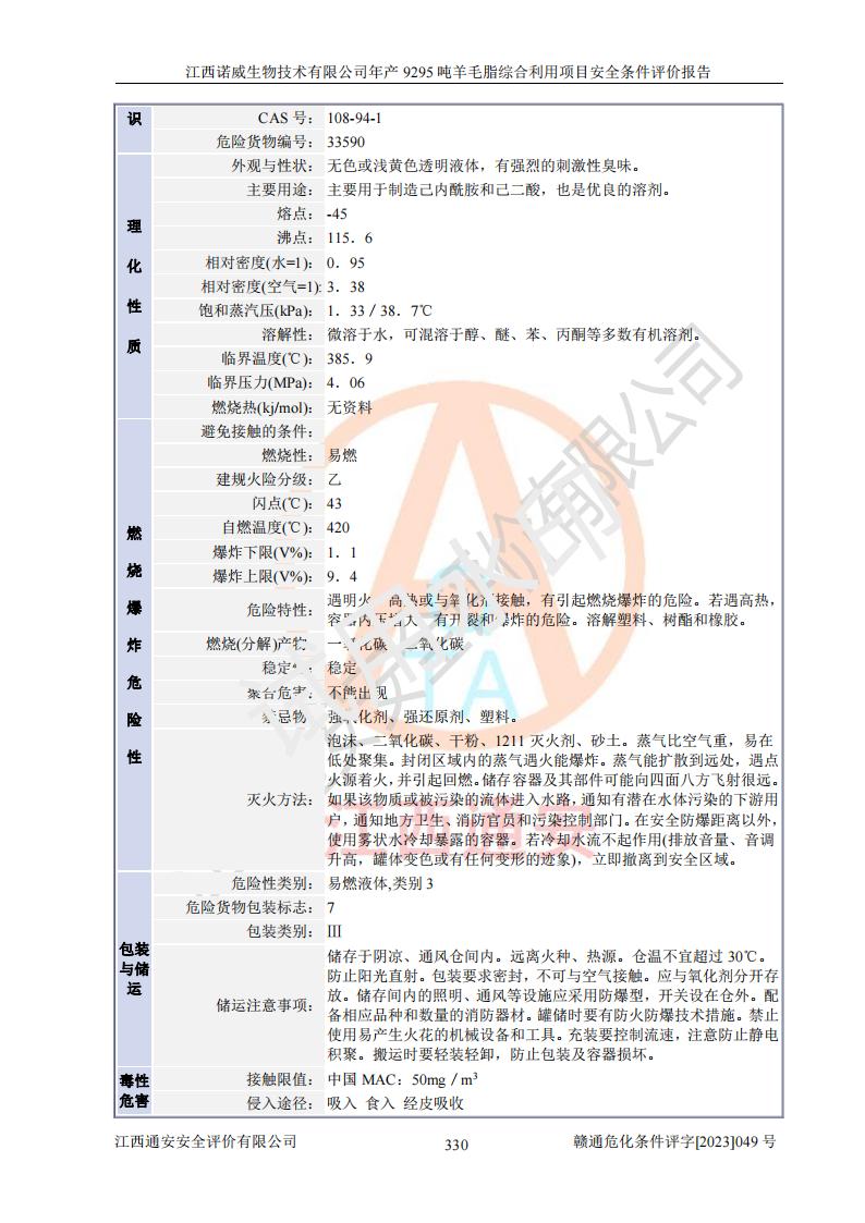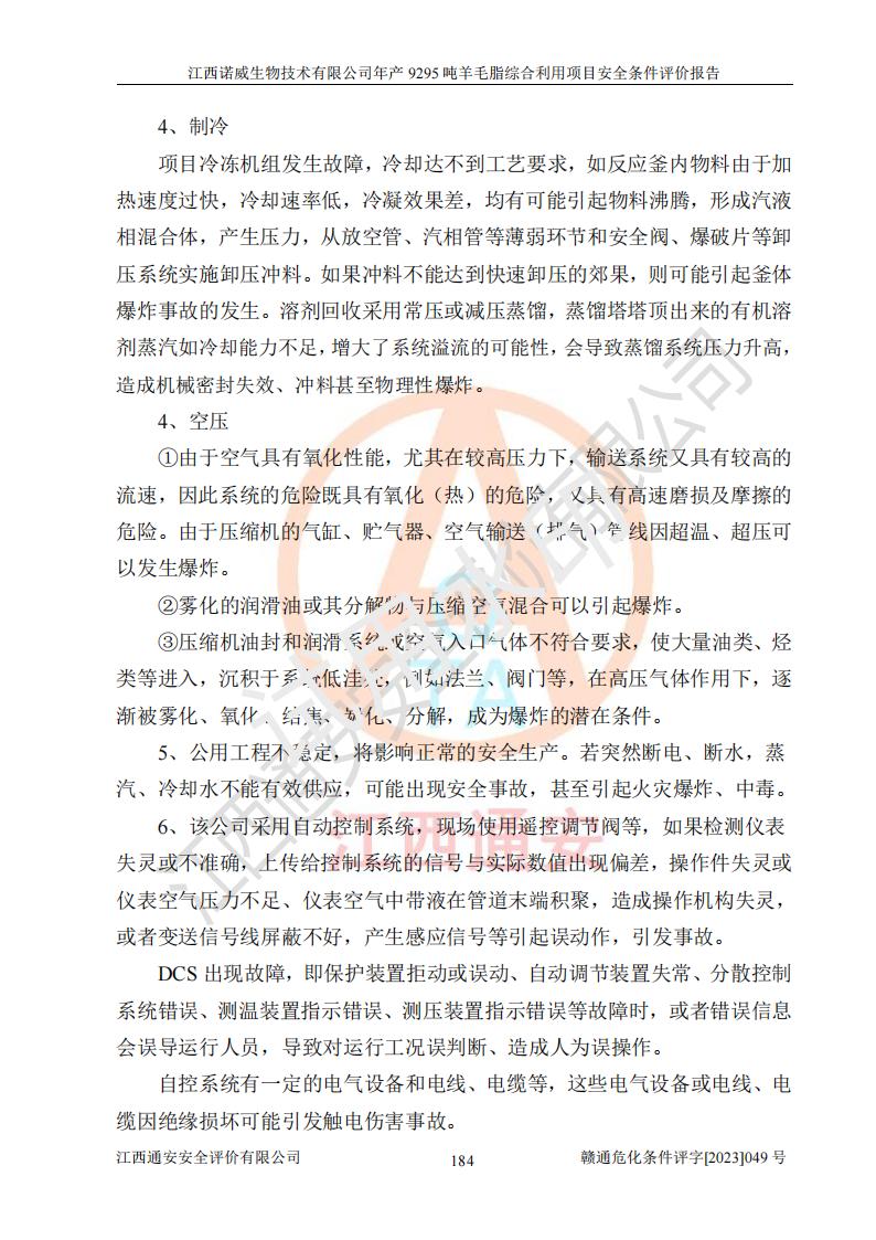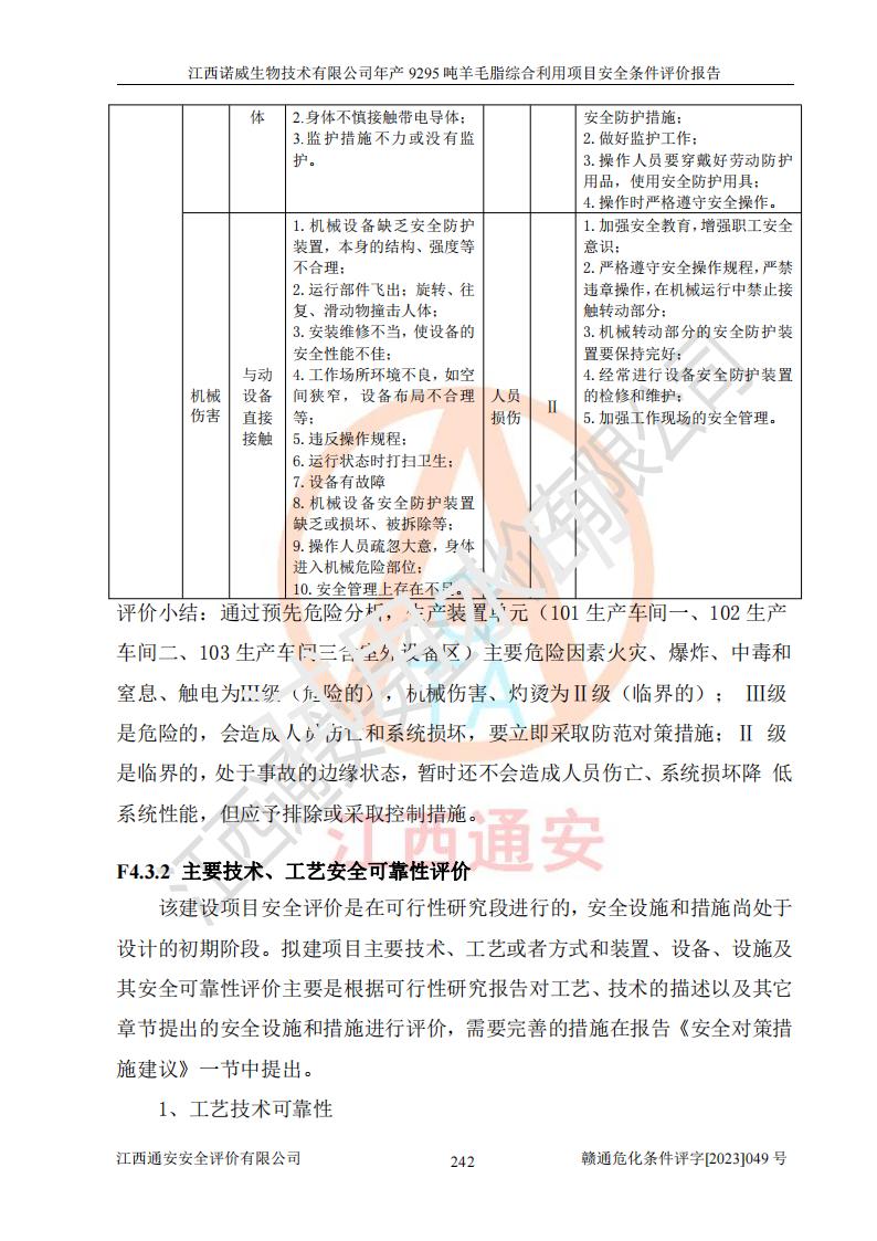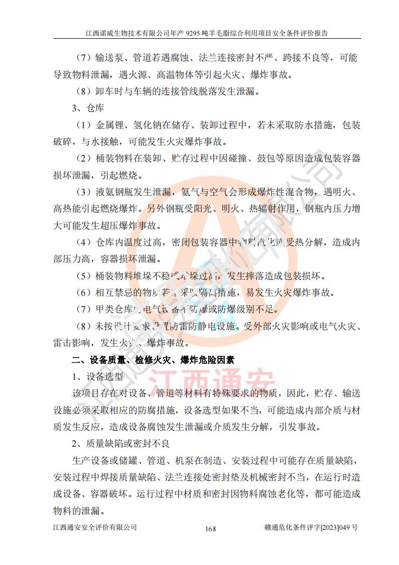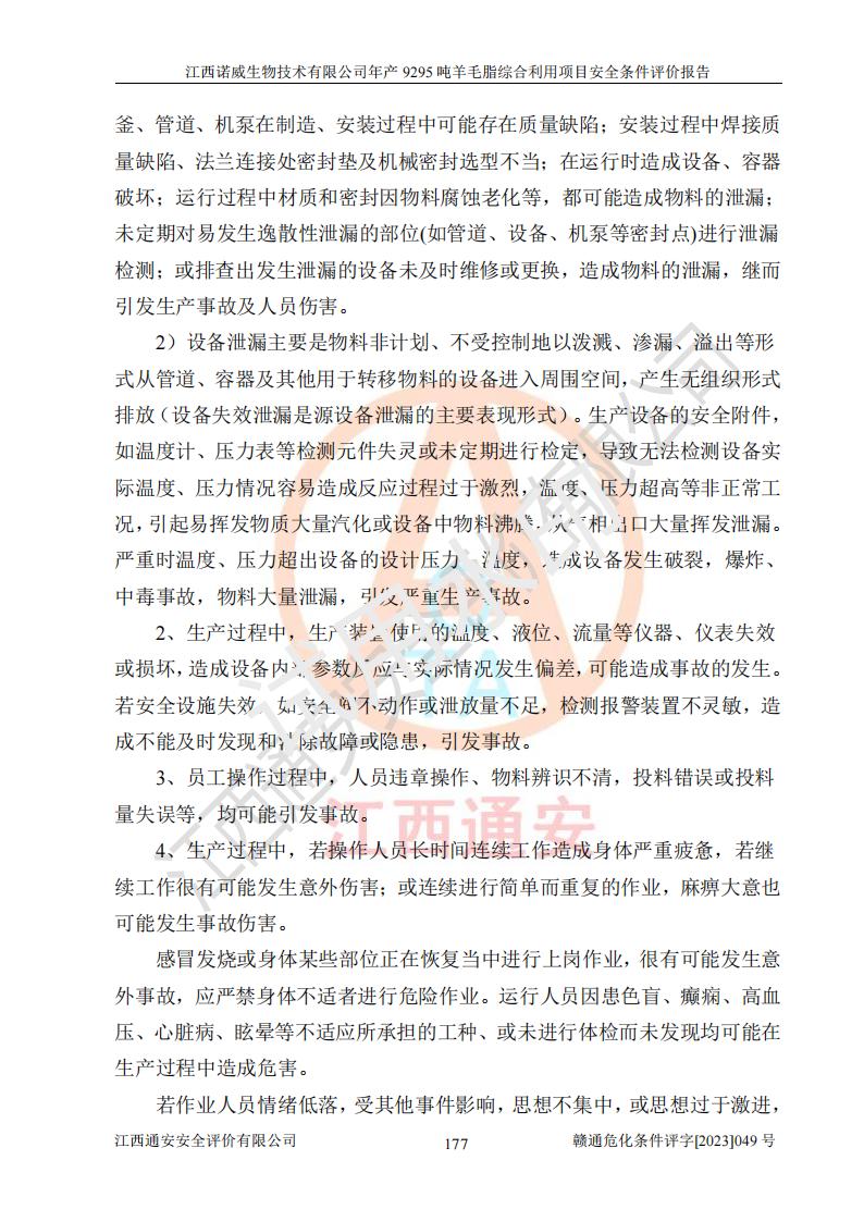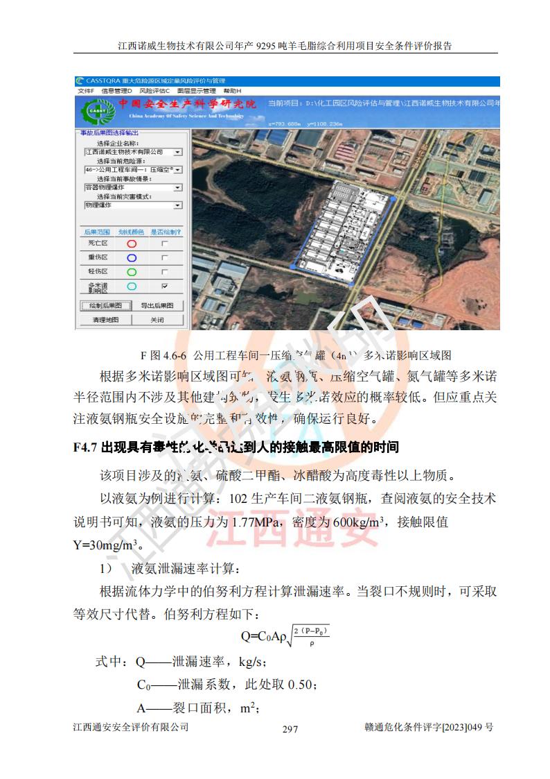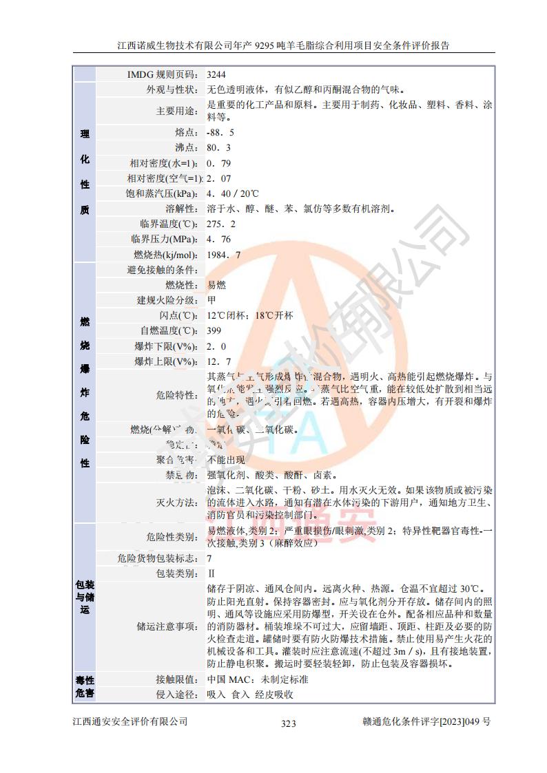 其它 | 一、主要危險、有害因素評價結(jié)果 通過對江西諾威生物技術(shù)有限公司年產(chǎn)9295噸羊毛脂綜合利用項目的危險、有害因素分析及定性、定量分析,結(jié)果為: 1、主要危險、有害因素 該項目在建成后的運行過程中存在火災與爆炸、中毒與窒息、觸電、機械傷害、高處墜落、物體打擊、**傷害、起重傷害、灼燙、淹溺、其他傷害等危險因素和化學因素、粉塵、物理因素等有害因素。 2、危險化學品辨識結(jié)果 該項目涉及的各種物質(zhì)中,氫氧化鈉、丁酮、硫酸、甲醇、N,N-二甲基-1,3-丙二胺、磷酸、次磷酸、硫酸二乙酯、異丙醇、35%雙氧水、醋酸酐、石油醚、環(huán)己酮、三乙胺、鋰、氨、氯苯、正己烷、環(huán)己烷、氫氧化鉀、冰醋酸、氫化鈉、氨基鋰、乙酸乙酯、二氯甲烷、20%氨水、四氫呋喃、溶劑3、氯化鋅、鹽酸、天然氣、制冷劑R22、發(fā)電機用柴油、氮氣、氫氣、硫酸二甲酯、10%次氯酸鈉溶液屬于危險化學品。甲醇、氨、氯苯、氫氣、硫酸二甲酯、乙酸乙酯及燃氣天然氣屬于重點監(jiān)管的危險化學品,醋酸酐、丁酮、鹽酸和硫酸屬于易制毒化學品,氨和工藝廢氣硫酸二甲酯屬于高毒物品,雙氧水、鋰和季戊四醇屬于易制爆危險化學品,氨、甲醇和工藝廢氣硫酸二甲酯屬于特別管控危險化學品,不涉及監(jiān)控化學品和劇毒化學品。 3、重點監(jiān)管的危險化工工藝辨識結(jié)果 該項目涉及的氧化反應和烷基化反應屬于重點監(jiān)管的危險化工工藝。 4、重大危險源辨識結(jié)果 該項目各生產(chǎn)、儲存單位均不構(gòu)成危險化學品重大危險源。 二、重點防范的重大危險、有害因素 通過對該項目存在的危險、有害因素進行分析辨識,在生產(chǎn)過程中重點防范的重大危險、有害因素主要為火災與爆炸、中毒與窒息。 1、該項目涉及重點監(jiān)管的危險化工工藝(氧化反應、烷基化反應)和重點監(jiān)管的危險化學品(甲醇、氨、氯苯、乙酸乙酯、天然氣、氫氣和硫酸二甲酯),公司應在全面開展過程危險分析(如危險與可操作性分析)基礎上,通過風險分析確定安全儀表功能,設計符合要求的安全儀表系統(tǒng),包括安全聯(lián)鎖系統(tǒng)、緊急停車系統(tǒng)和可燃/有毒氣體檢測報警系統(tǒng)等。 2、根據(jù)《石油化工可燃氣體和有毒氣體檢測報警設計標準》GB/T 50493-2019要求,在可能發(fā)生可燃、有毒氣體泄漏的場所設置相應的固定式氣體探測器,對可燃、有毒氣體的釋放源進行檢測,并將報警信號遠傳至有人值守的控制室。 3、爆炸危險場所的電氣設施,**符合防爆要求,防止電氣火花引發(fā)火災爆炸事故。 該項目存在的危險、有害因素如果采取了本報告提出的安全對策措施,加強安全管理工作,做好日常安全管理、安全檢查,嚴格執(zhí)行安全規(guī)程,杜*違“三違”等不良作風,加強設備的安全設施的檢測檢驗工作,保障應急設施、設備的完好等工作,則其存在的危險有害因素就可能相對減少,即使發(fā)生事故,也會將事故損失降低到*低。 五主要單元評價結(jié)果 在對該項目危險、有害因素辨識分析的基礎上,運用安全檢查表、預先危險性分析、危險度評價、定量風險評價等評價方法對該項目進行了分析評價,評價結(jié)果如下: 1、項目選址位于江西省新干鹽化工業(yè)城四至范圍內(nèi),該工業(yè)園屬于認定合格的化工園區(qū),符合當?shù)匾?guī)劃,與周邊環(huán)境的距離符合有關(guān)標準、規(guī)范的要求。 2、總圖布置分區(qū)明確,建(構(gòu))筑物的防火間距符合規(guī)范要求。可研報告未明確的安全設施,本報告提出安全對策措施,設計時完善。 3、該項目主要裝置(設施)不屬于**明令淘汰,危險性較大的、重要的關(guān)鍵性生產(chǎn)設備,擬由有資質(zhì)的單位進行設計、制造和檢驗,安全可靠性高,符合相關(guān)法律法規(guī)標準規(guī)范的要求。通過預先危險分析,生產(chǎn)裝置單元主要危險因素火災、爆炸、中毒和窒息、觸電為Ⅲ級(危險的),機械傷害、灼燙為Ⅱ級(臨界的); Ⅲ級是危險的,會造成人員傷亡和系統(tǒng)損壞,要立即采取防范對策措施;Ⅱ 級是臨界的,處于事故的邊緣狀態(tài),暫時還不會造成人員傷亡、系統(tǒng)損壞降 低系統(tǒng)性能,但應予排除或采取控制措施。 4、公用工程單元:通過預先危險分析,供配電子單元主要危險、有害因素為:火災爆炸、觸電危險程度為Ⅲ級(危險的);給排水方面主要危險、有害因素有:中毒窒息為Ⅲ級,淹溺、機械傷害、化學灼傷、火災、噪聲危險程度為Ⅱ級(臨界的);空壓單元發(fā)生容器爆炸危險等級為Ⅲ級(危險的),會造成人員傷亡和系統(tǒng)損壞,要立即采取防范對策措施。機械傷害、火災、觸電及噪聲危險程度為Ⅱ級(臨界的);制氮子單元主要危險、有害因素為容器爆炸和窒息危險程度為Ⅲ級(危險的),會造成人員傷亡和系統(tǒng)損壞;機械傷害、高處墜落及噪聲等,危險程度為Ⅱ級(臨界的);儀表自動控制子單元自控系統(tǒng)失控直接或間接導致的火災爆炸、中毒、容器爆炸危險程度為Ⅲ級(危險的);倉庫火災爆炸、中毒窒息危險程度為Ⅲ級(危險的)Ⅲ級是危險的,**傷害的危險程度為II級(臨界的),罐區(qū)主要危險因素火災爆炸、高處墜落危險程度為Ⅲ級(危險的),會造成人員傷亡和系統(tǒng)損壞,要立即采取防
