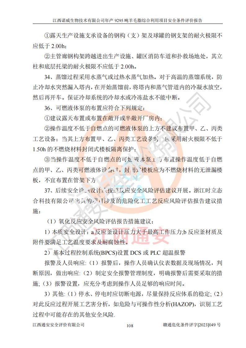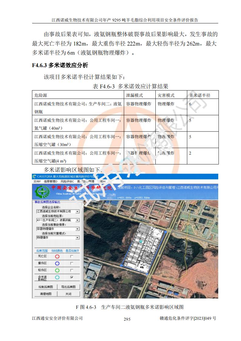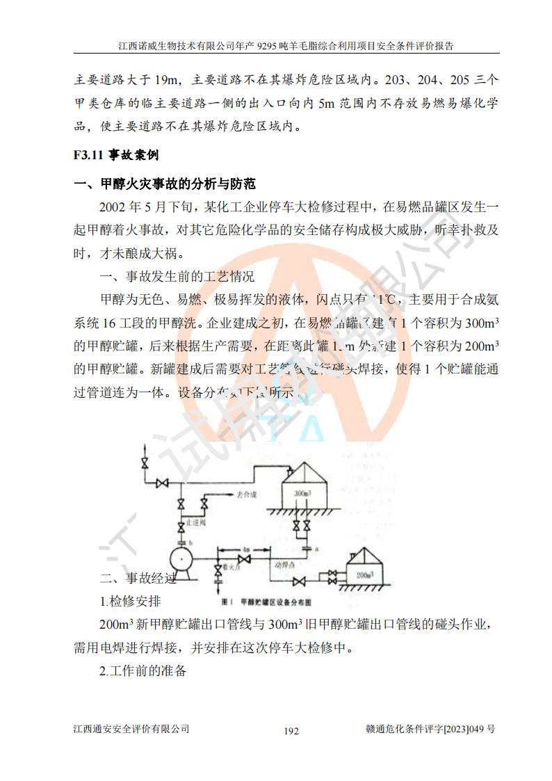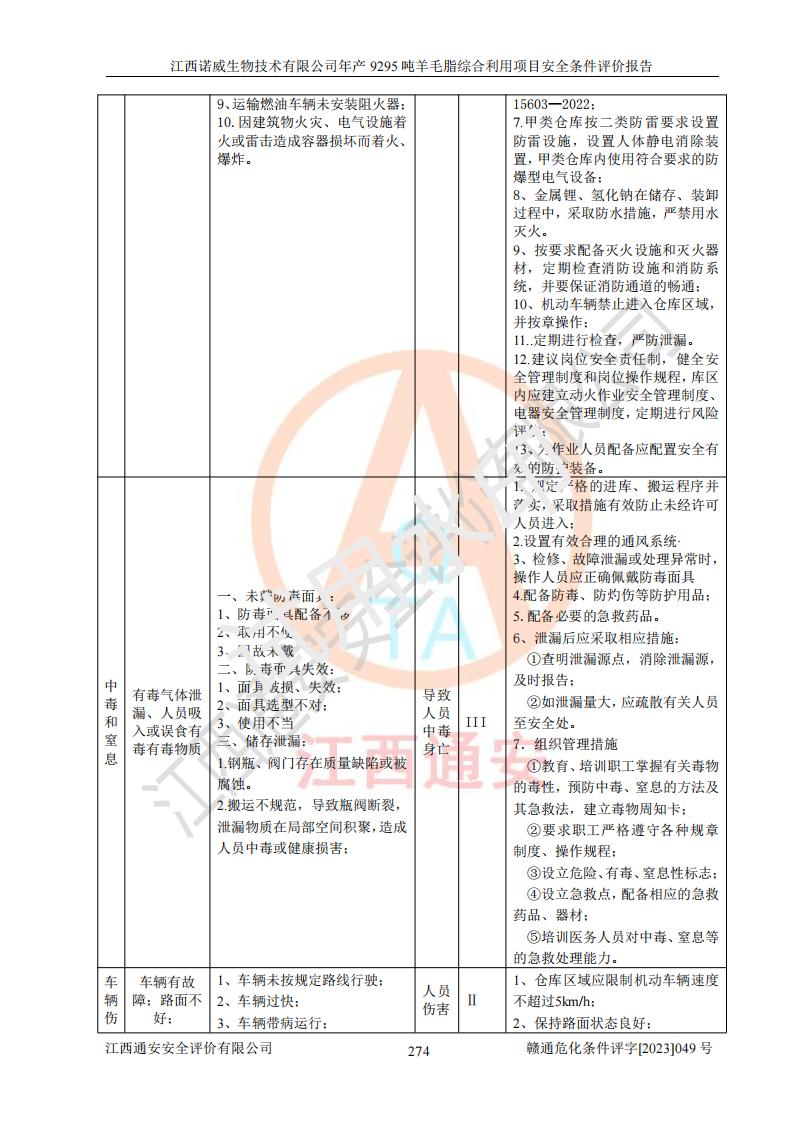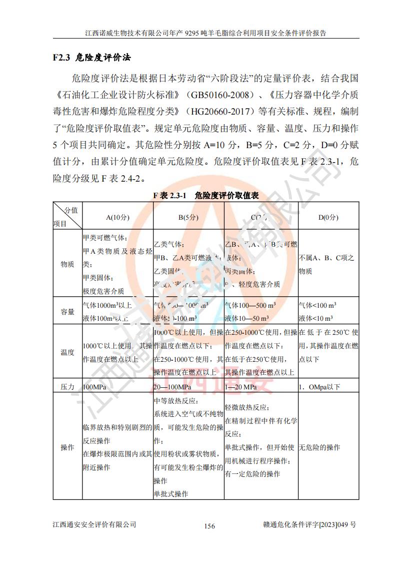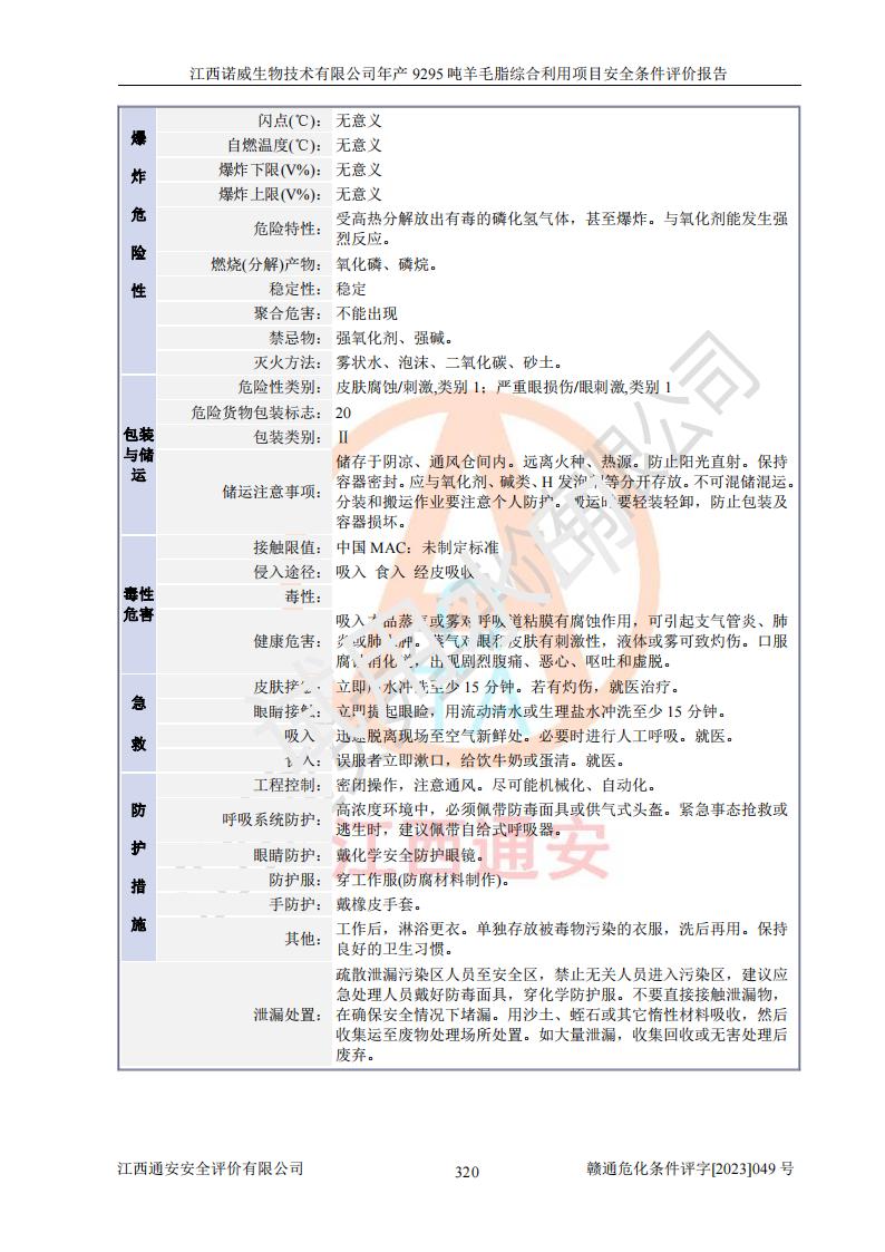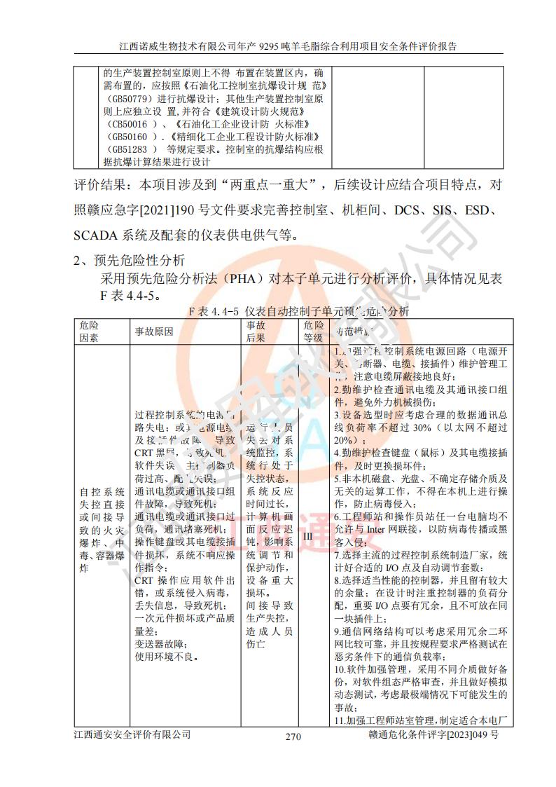 其它 | 一、主要危險、有害因素評價結(jié)果 通過對江西諾威生物技術(shù)有限公司年產(chǎn)9295噸羊毛脂綜合利用項目的危險、有害因素分析及定性、定量分析,結(jié)果為: 1、主要危險、有害因素 該項目在建成后的運行過程中存在火災與爆炸、中毒與窒息、觸電、機械傷害、高處墜落、物體打擊、**傷害、起重傷害、灼燙、淹溺、其他傷害等危險因素和化學因素、粉塵、物理因素等有害因素。 2、危險化學品辨識結(jié)果 該項目涉及的各種物質(zhì)中,氫氧化鈉、丁酮、硫酸、甲醇、N,N-二甲基-1,3-丙二胺、磷酸、次磷酸、硫酸二乙酯、異丙醇、35%雙氧水、醋酸酐、石油醚、環(huán)己酮、三乙胺、鋰、氨、氯苯、正己烷、環(huán)己烷、氫氧化鉀、冰醋酸、氫化鈉、氨基鋰、乙酸乙酯、二氯甲烷、20%氨水、四氫呋喃、溶劑3、氯化鋅、鹽酸、天然氣、制冷劑R22、發(fā)電機用柴油、氮氣、氫氣、硫酸二甲酯、10%次氯酸鈉溶液屬于危險化學品。甲醇、氨、氯苯、氫氣、硫酸二甲酯、乙酸乙酯及燃氣天然氣屬于重點監(jiān)管的危險化學品,醋酸酐、丁酮、鹽酸和硫酸屬于易制毒化學品,氨和工藝廢氣硫酸二甲酯屬于高毒物品,雙氧水、鋰和季戊四醇屬于易制爆危險化學品,氨、甲醇和工藝廢氣硫酸二甲酯屬于特別管控危險化學品,不涉及監(jiān)控化學品和劇毒化學品。 3、重點監(jiān)管的危險化工工藝辨識結(jié)果 該項目涉及的氧化反應和烷基化反應屬于重點監(jiān)管的危險化工工藝。 4、重大危險源辨識結(jié)果 該項目各生產(chǎn)、儲存單位均不構(gòu)成危險化學品重大危險源。 二、重點防范的重大危險、有害因素 通過對該項目存在的危險、有害因素進行分析辨識,在生產(chǎn)過程中重點防范的重大危險、有害因素主要為火災與爆炸、中毒與窒息。 1、該項目涉及重點監(jiān)管的危險化工工藝(氧化反應、烷基化反應)和重點監(jiān)管的危險化學品(甲醇、氨、氯苯、乙酸乙酯、天然氣、氫氣和硫酸二甲酯),公司應在全面開展過程危險分析(如危險與可操作性分析)基礎上,通過風險分析確定安全儀表功能,設計符合要求的安全儀表系統(tǒng),包括安全聯(lián)鎖系統(tǒng)、緊急停車系統(tǒng)和可燃/有毒氣體檢測報警系統(tǒng)等。 2、根據(jù)《石油化工可燃氣體和有毒氣體檢測報警設計標準》GB/T 50493-2019要求,在可能發(fā)生可燃、有毒氣體泄漏的場所設置相應的固定式氣體探測器,對可燃、有毒氣體的釋放源進行檢測,并將報警信號遠傳至有人值守的控制室。 3、爆炸危險場所的電氣設施,**符合防爆要求,防止電氣火花引發(fā)火災爆炸事故。 該項目存在的危險、有害因素如果采取了本報告提出的安全對策措施,加強安全管理工作,做好日常安全管理、安全檢查,嚴格執(zhí)行安全規(guī)程,杜*違“三違”等不良作風,加強設備的安全設施的檢測檢驗工作,保障應急設施、設備的完好等工作,則其存在的危險有害因素就可能相對減少,即使發(fā)生事故,也會將事故損失降低到*低。 五主要單元評價結(jié)果 在對該項目危險、有害因素辨識分析的基礎上,運用安全檢查表、預先危險性分析、危險度評價、定量風險評價等評價方法對該項目進行了分析評價,評價結(jié)果如下: 1、項目選址位于江西省新干鹽化工業(yè)城四至范圍內(nèi),該工業(yè)園屬于認定合格的化工園區(qū),符合當?shù)匾?guī)劃,與周邊環(huán)境的距離符合有關(guān)標準、規(guī)范的要求。 2、總圖布置分區(qū)明確,建(構(gòu))筑物的防火間距符合規(guī)范要求。可研報告未明確的安全設施,本報告提出安全對策措施,設計時完善。 3、該項目主要裝置(設施)不屬于**明令淘汰,危險性較大的、重要的關(guān)鍵性生產(chǎn)設備,擬由有資質(zhì)的單位進行設計、制造和檢驗,安全可靠性高,符合相關(guān)法律法規(guī)標準規(guī)范的要求。通過預先危險分析,生產(chǎn)裝置單元主要危險因素火災、爆炸、中毒和窒息、觸電為Ⅲ級(危險的),機械傷害、灼燙為Ⅱ級(臨界的); Ⅲ級是危險的,會造成人員傷亡和系統(tǒng)損壞,要立即采取防范對策措施;Ⅱ 級是臨界的,處于事故的邊緣狀態(tài),暫時還不會造成人員傷亡、系統(tǒng)損壞降 低系統(tǒng)性能,但應予排除或采取控制措施。 4、公用工程單元:通過預先危險分析,供配電子單元主要危險、有害因素為:火災爆炸、觸電危險程度為Ⅲ級(危險的);給排水方面主要危險、有害因素有:中毒窒息為Ⅲ級,淹溺、機械傷害、化學灼傷、火災、噪聲危險程度為Ⅱ級(臨界的);空壓單元發(fā)生容器爆炸危險等級為Ⅲ級(危險的),會造成人員傷亡和系統(tǒng)損壞,要立即采取防范對策措施。機械傷害、火災、觸電及噪聲危險程度為Ⅱ級(臨界的);制氮子單元主要危險、有害因素為容器爆炸和窒息危險程度為Ⅲ級(危險的),會造成人員傷亡和系統(tǒng)損壞;機械傷害、高處墜落及噪聲等,危險程度為Ⅱ級(臨界的);儀表自動控制子單元自控系統(tǒng)失控直接或間接導致的火災爆炸、中毒、容器爆炸危險程度為Ⅲ級(危險的);倉庫火災爆炸、中毒窒息危險程度為Ⅲ級(危險的)Ⅲ級是危險的,**傷害的危險程度為II級(臨界的),罐區(qū)主要危險因素火災爆炸、高處墜落危險程度為Ⅲ級(危險的),會造成人員傷亡和系統(tǒng)損壞,要立即采取防