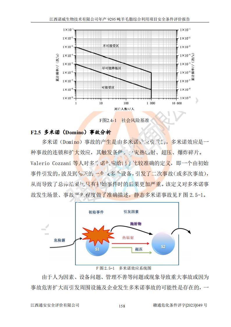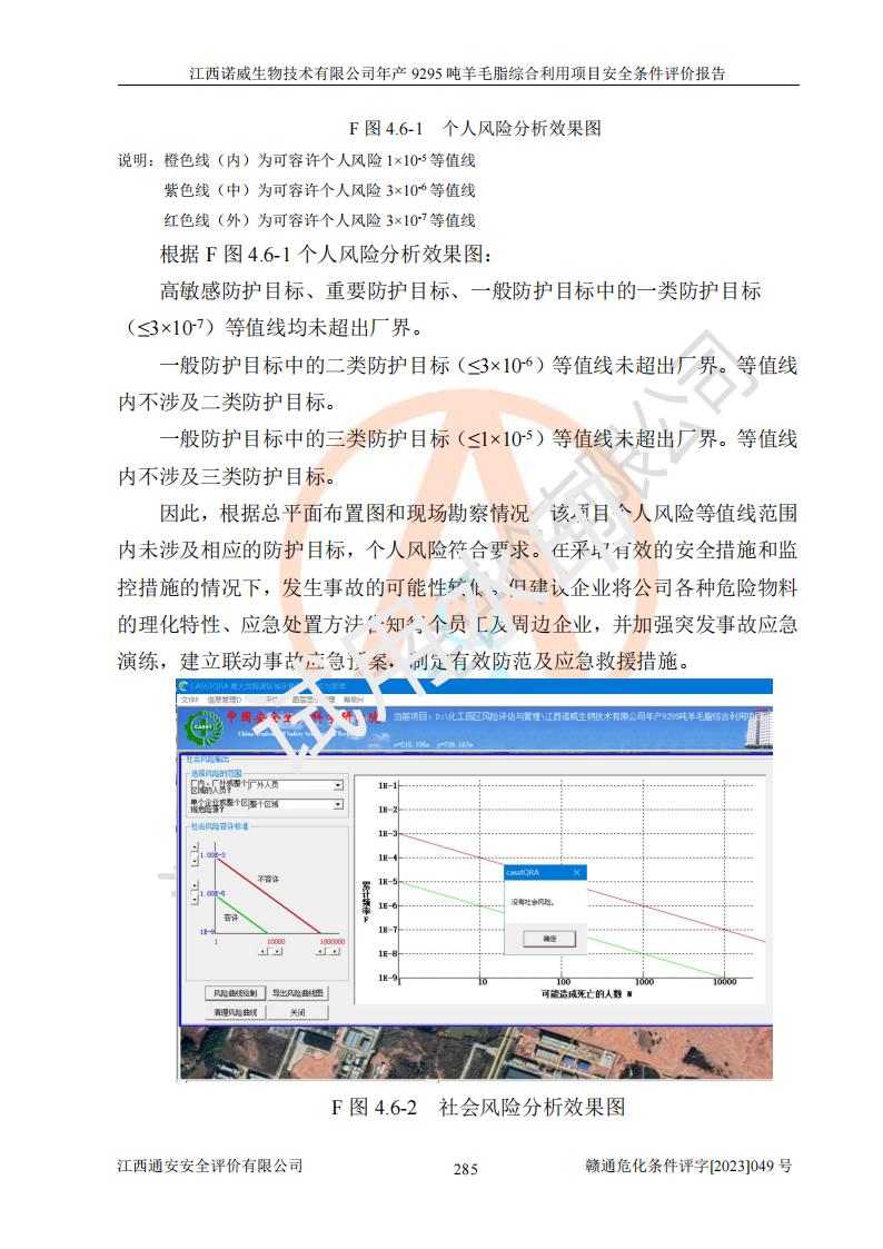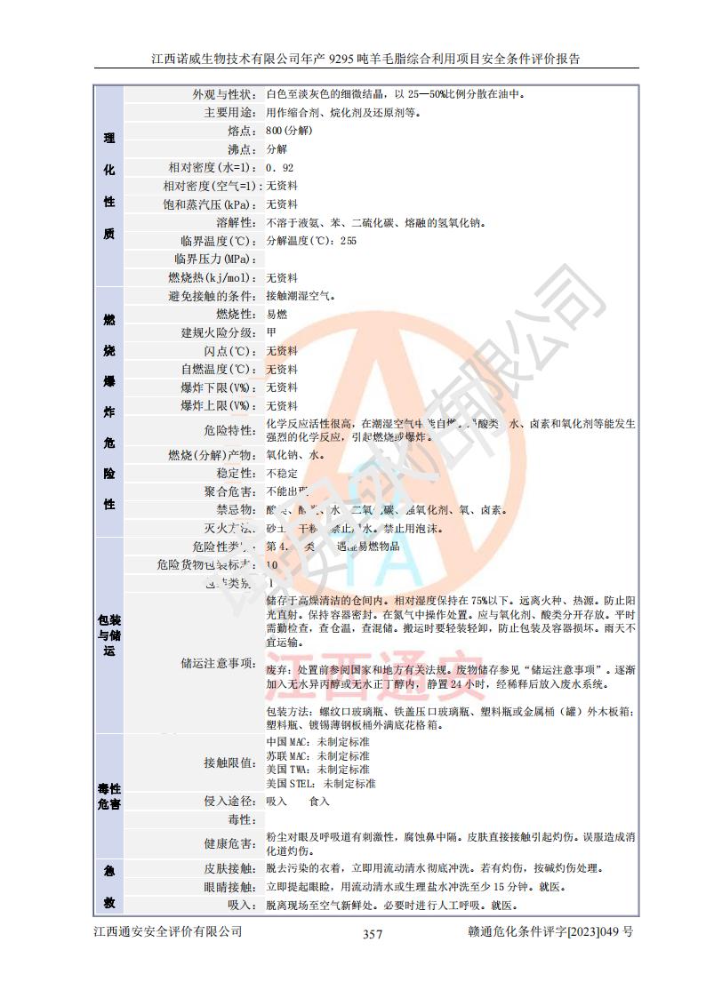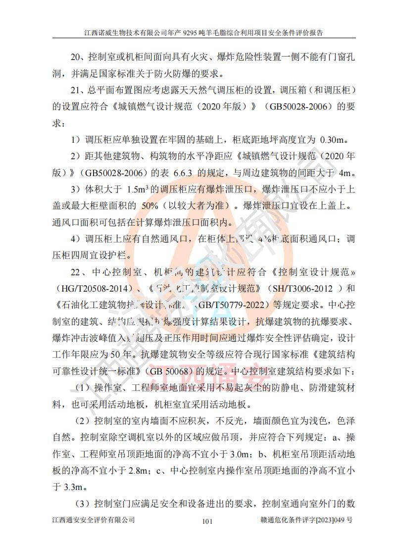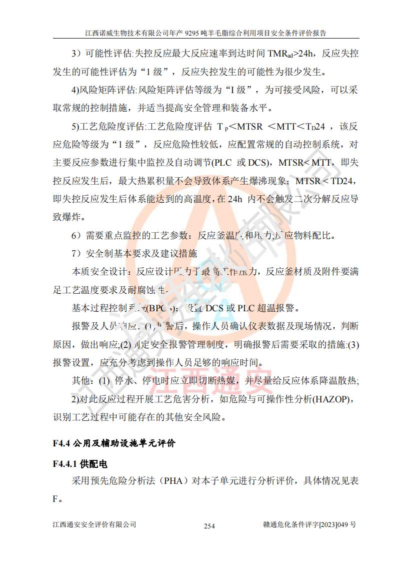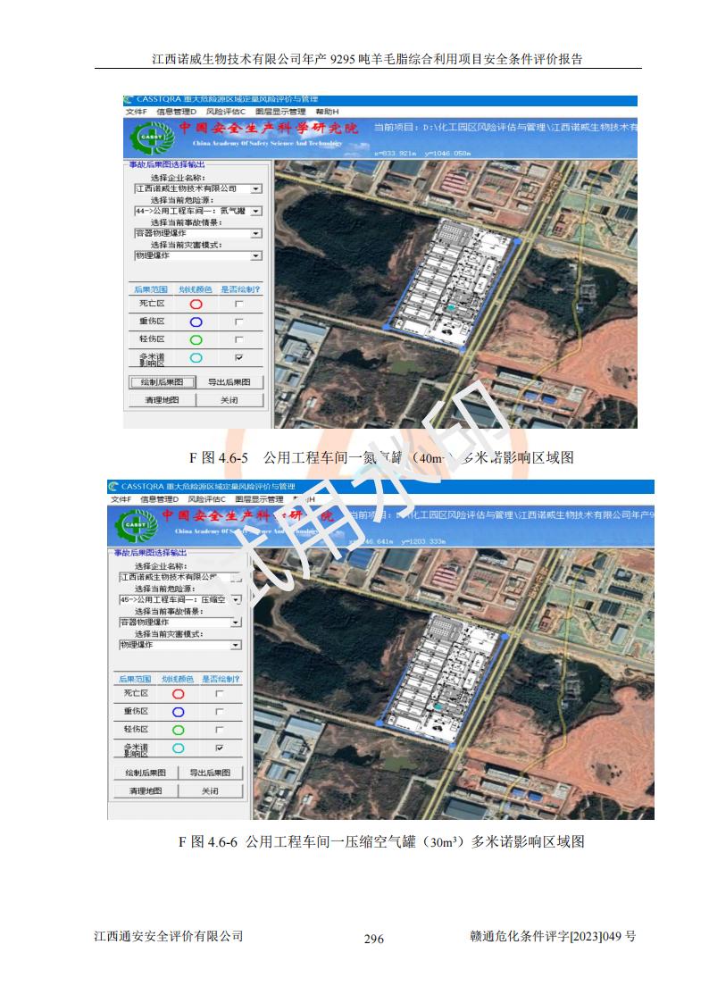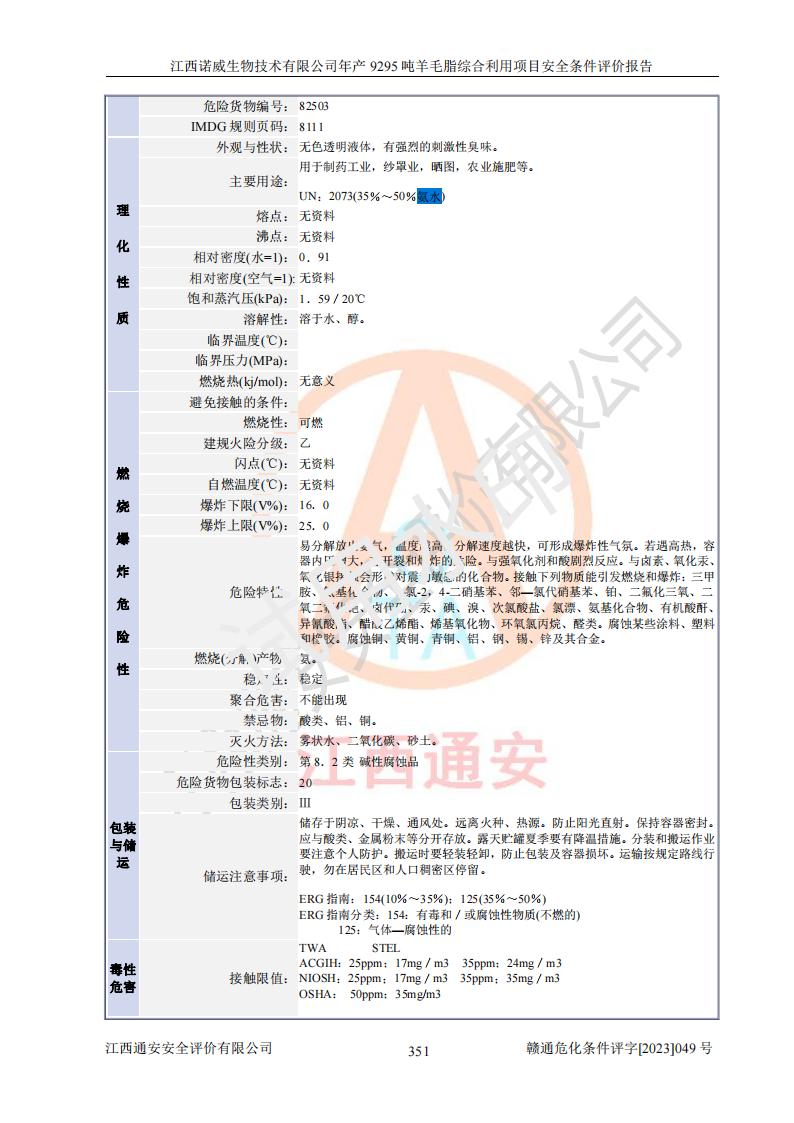 其它 | 一、主要危險、有害因素評價結(jié)果 通過對江西諾威生物技術(shù)有限公司年產(chǎn)9295噸羊毛脂綜合利用項目的危險、有害因素分析及定性、定量分析,結(jié)果為: 1、主要危險、有害因素 該項目在建成后的運行過程中存在火災與爆炸、中毒與窒息、觸電、機械傷害、高處墜落、物體打擊、**傷害、起重傷害、灼燙、淹溺、其他傷害等危險因素和化學因素、粉塵、物理因素等有害因素。 2、危險化學品辨識結(jié)果 該項目涉及的各種物質(zhì)中,氫氧化鈉、丁酮、硫酸、甲醇、N,N-二甲基-1,3-丙二胺、磷酸、次磷酸、硫酸二乙酯、異丙醇、35%雙氧水、醋酸酐、石油醚、環(huán)己酮、三乙胺、鋰、氨、氯苯、正己烷、環(huán)己烷、氫氧化鉀、冰醋酸、氫化鈉、氨基鋰、乙酸乙酯、二氯甲烷、20%氨水、四氫呋喃、溶劑3、氯化鋅、鹽酸、天然氣、制冷劑R22、發(fā)電機用柴油、氮氣、氫氣、硫酸二甲酯、10%次氯酸鈉溶液屬于危險化學品。甲醇、氨、氯苯、氫氣、硫酸二甲酯、乙酸乙酯及燃氣天然氣屬于重點監(jiān)管的危險化學品,醋酸酐、丁酮、鹽酸和硫酸屬于易制毒化學品,氨和工藝廢氣硫酸二甲酯屬于高毒物品,雙氧水、鋰和季戊四醇屬于易制爆危險化學品,氨、甲醇和工藝廢氣硫酸二甲酯屬于特別管控危險化學品,不涉及監(jiān)控化學品和劇毒化學品。 3、重點監(jiān)管的危險化工工藝辨識結(jié)果 該項目涉及的氧化反應和烷基化反應屬于重點監(jiān)管的危險化工工藝。 4、重大危險源辨識結(jié)果 該項目各生產(chǎn)、儲存單位均不構(gòu)成危險化學品重大危險源。 二、重點防范的重大危險、有害因素 通過對該項目存在的危險、有害因素進行分析辨識,在生產(chǎn)過程中重點防范的重大危險、有害因素主要為火災與爆炸、中毒與窒息。 1、該項目涉及重點監(jiān)管的危險化工工藝(氧化反應、烷基化反應)和重點監(jiān)管的危險化學品(甲醇、氨、氯苯、乙酸乙酯、天然氣、氫氣和硫酸二甲酯),公司應在全面開展過程危險分析(如危險與可操作性分析)基礎上,通過風險分析確定安全儀表功能,設計符合要求的安全儀表系統(tǒng),包括安全聯(lián)鎖系統(tǒng)、緊急停車系統(tǒng)和可燃/有毒氣體檢測報警系統(tǒng)等。 2、根據(jù)《石油化工可燃氣體和有毒氣體檢測報警設計標準》GB/T 50493-2019要求,在可能發(fā)生可燃、有毒氣體泄漏的場所設置相應的固定式氣體探測器,對可燃、有毒氣體的釋放源進行檢測,并將報警信號遠傳至有人值守的控制室。 3、爆炸危險場所的電氣設施,**符合防爆要求,防止電氣火花引發(fā)火災爆炸事故。 該項目存在的危險、有害因素如果采取了本報告提出的安全對策措施,加強安全管理工作,做好日常安全管理、安全檢查,嚴格執(zhí)行安全規(guī)程,杜*違“三違”等不良作風,加強設備的安全設施的檢測檢驗工作,保障應急設施、設備的完好等工作,則其存在的危險有害因素就可能相對減少,即使發(fā)生事故,也會將事故損失降低到*低。 五主要單元評價結(jié)果 在對該項目危險、有害因素辨識分析的基礎上,運用安全檢查表、預先危險性分析、危險度評價、定量風險評價等評價方法對該項目進行了分析評價,評價結(jié)果如下: 1、項目選址位于江西省新干鹽化工業(yè)城四至范圍內(nèi),該工業(yè)園屬于認定合格的化工園區(qū),符合當?shù)匾?guī)劃,與周邊環(huán)境的距離符合有關(guān)標準、規(guī)范的要求。 2、總圖布置分區(qū)明確,建(構(gòu))筑物的防火間距符合規(guī)范要求。可研報告未明確的安全設施,本報告提出安全對策措施,設計時完善。 3、該項目主要裝置(設施)不屬于**明令淘汰,危險性較大的、重要的關(guān)鍵性生產(chǎn)設備,擬由有資質(zhì)的單位進行設計、制造和檢驗,安全可靠性高,符合相關(guān)法律法規(guī)標準規(guī)范的要求。通過預先危險分析,生產(chǎn)裝置單元主要危險因素火災、爆炸、中毒和窒息、觸電為Ⅲ級(危險的),機械傷害、灼燙為Ⅱ級(臨界的); Ⅲ級是危險的,會造成人員傷亡和系統(tǒng)損壞,要立即采取防范對策措施;Ⅱ 級是臨界的,處于事故的邊緣狀態(tài),暫時還不會造成人員傷亡、系統(tǒng)損壞降 低系統(tǒng)性能,但應予排除或采取控制措施。 4、公用工程單元:通過預先危險分析,供配電子單元主要危險、有害因素為:火災爆炸、觸電危險程度為Ⅲ級(危險的);給排水方面主要危險、有害因素有:中毒窒息為Ⅲ級,淹溺、機械傷害、化學灼傷、火災、噪聲危險程度為Ⅱ級(臨界的);空壓單元發(fā)生容器爆炸危險等級為Ⅲ級(危險的),會造成人員傷亡和系統(tǒng)損壞,要立即采取防范對策措施。機械傷害、火災、觸電及噪聲危險程度為Ⅱ級(臨界的);制氮子單元主要危險、有害因素為容器爆炸和窒息危險程度為Ⅲ級(危險的),會造成人員傷亡和系統(tǒng)損壞;機械傷害、高處墜落及噪聲等,危險程度為Ⅱ級(臨界的);儀表自動控制子單元自控系統(tǒng)失控直接或間接導致的火災爆炸、中毒、容器爆炸危險程度為Ⅲ級(危險的);倉庫火災爆炸、中毒窒息危險程度為Ⅲ級(危險的)Ⅲ級是危險的,**傷害的危險程度為II級(臨界的),罐區(qū)主要危險因素火災爆炸、高處墜落危險程度為Ⅲ級(危險的),會造成人員傷亡和系統(tǒng)損壞,要立即采取防