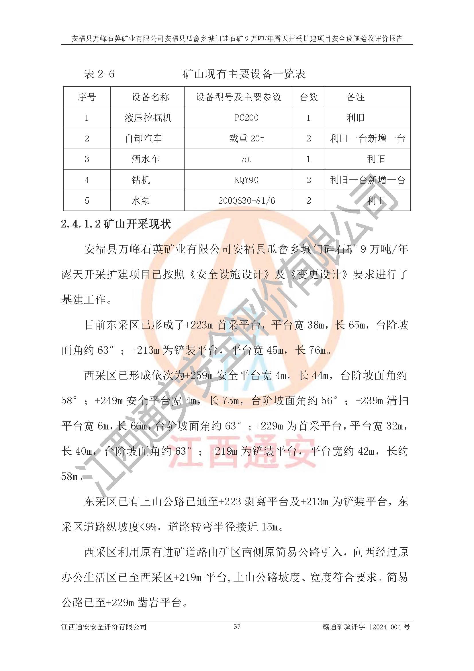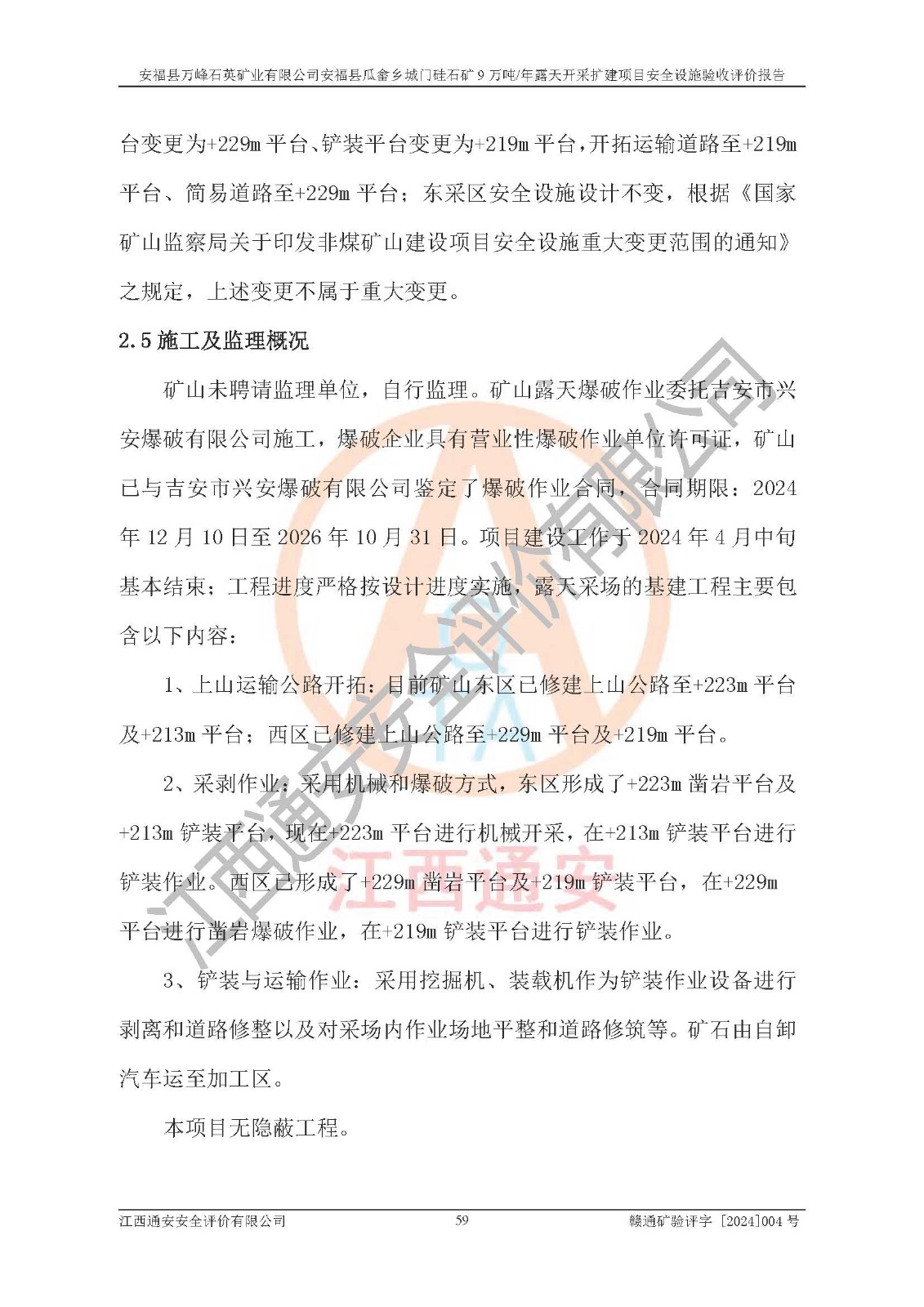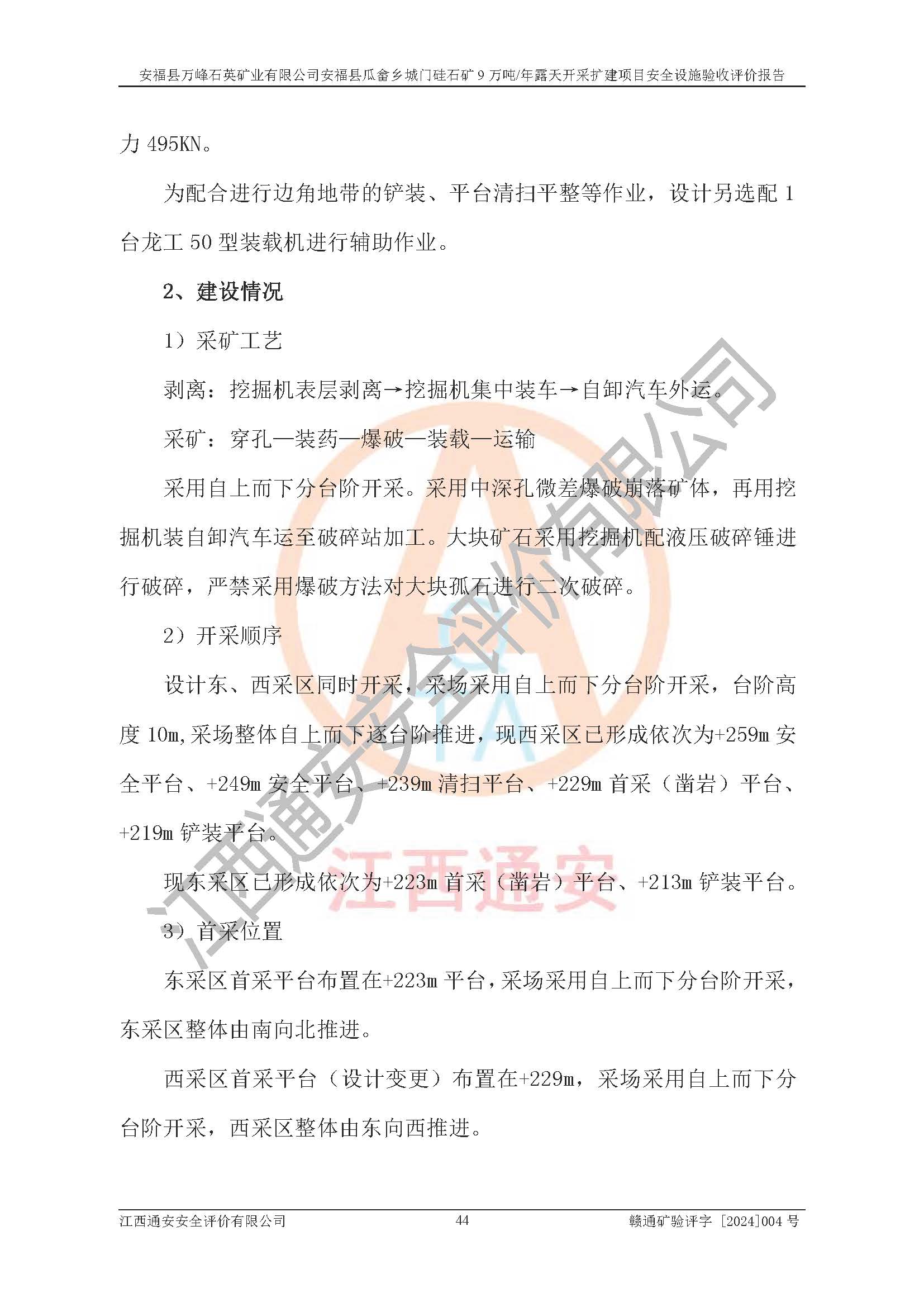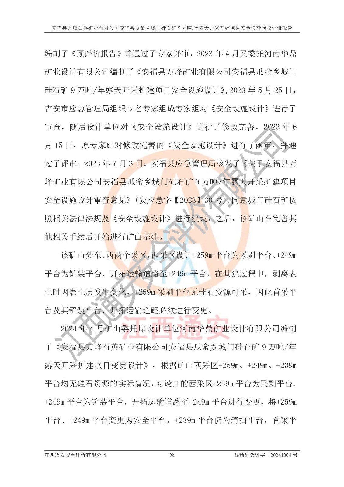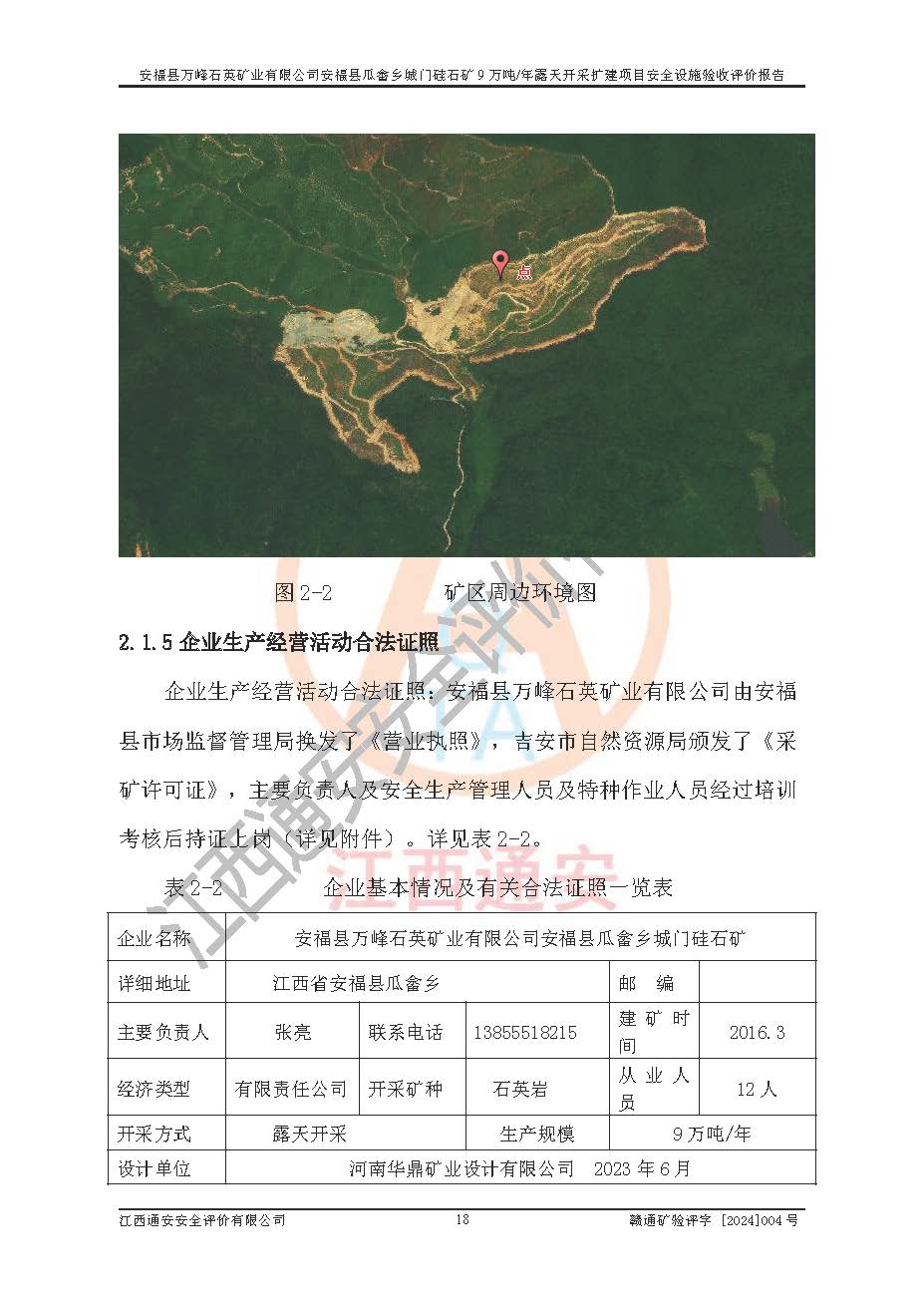 安??h萬(wàn)峰石英礦業(yè)有限公司安??h瓜畬鄉(xiāng)城門(mén)硅石礦礦區(qū)位于安??h城70°方向約15km處,行政區(qū)劃屬安福縣瓜畬鄉(xiāng)管轄。礦區(qū)位置地理坐標(biāo):東經(jīng)114°44′12"~114°44′29",北緯27°28′53"~27°28′57",礦區(qū)中心地理坐標(biāo):東經(jīng)114°44′20",北緯27°28′55"。礦區(qū)有約15km簡(jiǎn)易公路經(jīng)瓜畬鄉(xiāng)**所在地,與安?!掠喙废嘟?,交通方便。 安??h瓜畬鄉(xiāng)城門(mén)硅石礦于2016年3月8日取得采礦許可證,證號(hào)C3608002009027220004917,生產(chǎn)規(guī)模1萬(wàn)噸/年,礦區(qū)面積:0.0646km2。 因礦山生產(chǎn)規(guī)模滿足不了市場(chǎng)要求,加上礦區(qū)有些地征用比較困難,企業(yè)向吉安市自然資源局申請(qǐng)擴(kuò)大生產(chǎn)規(guī)模,并將礦區(qū)范圍進(jìn)行了縮小。 2019年6月8日取得了吉安市自然資源局換發(fā)的采礦許可證,證號(hào)C3608002009027220004917,生產(chǎn)規(guī)模9萬(wàn)噸/年,礦區(qū)面積為0.029km2。**期自2019年6月8日至2027年6月8日。由于新的采礦證擴(kuò)大了生產(chǎn)規(guī)模,且改變了礦區(qū)范圍,該項(xiàng)目屬于擴(kuò)建項(xiàng)目。 吉安市富林礦山技術(shù)服務(wù)有限公司于2019年9月編制了《安??h瓜畬鄉(xiāng)城門(mén)玻璃用石英巖礦資源儲(chǔ)量核實(shí)報(bào)告》,吉安市富林礦山技術(shù)服務(wù)有限公司于2020年4月編制了《安??h瓜畬鄉(xiāng)城門(mén)玻璃用石英巖礦礦產(chǎn)資源開(kāi)發(fā)利用、地質(zhì)環(huán)境恢復(fù)治理與土地復(fù)墾方案》,貴州匯和安全評(píng)價(jià)有限公司于2023年4月編制了《安??h萬(wàn)峰石英礦業(yè)有限公司安??h瓜畬鄉(xiāng)城門(mén)硅石礦9萬(wàn)噸/年露天開(kāi)采擴(kuò)建項(xiàng)目安全預(yù)評(píng)價(jià)報(bào)告》,河南華鼎礦業(yè)設(shè)計(jì)有限公司于2023年6月編制了《安??h萬(wàn)峰石英礦業(yè)有限公司安??h瓜畬鄉(xiāng)城門(mén)硅石礦9萬(wàn)噸/年露天開(kāi)采擴(kuò)建項(xiàng)目初步設(shè)計(jì)》和《安??h萬(wàn)峰石英礦業(yè)有限公司安福縣瓜畬鄉(xiāng)城門(mén)硅石礦9萬(wàn)噸/年露天開(kāi)采擴(kuò)建項(xiàng)目安全設(shè)施設(shè)計(jì)》;2023年7月3日安??h應(yīng)急管理局下發(fā)了《關(guān)于安福縣萬(wàn)峰石英礦業(yè)有限公司安??h瓜畬鄉(xiāng)城門(mén)硅石礦9萬(wàn)噸/年露天開(kāi)采擴(kuò)建項(xiàng)目安全設(shè)施設(shè)計(jì)審查意見(jiàn)》(安應(yīng)急字〔2023〕30號(hào))。 2023年7月安??h萬(wàn)峰石英礦業(yè)有限公司根據(jù)《中華人民共和國(guó)安全生產(chǎn)法》、《安全生產(chǎn)許可證條例》等有關(guān)法律、法規(guī)、部門(mén)規(guī)章的規(guī)定,嚴(yán)格按照《安全設(shè)施設(shè)計(jì)》進(jìn)行基建,該礦山分東、西兩個(gè)采區(qū),西采區(qū)設(shè)計(jì)+259m平臺(tái)為采剝平臺(tái)、+249m平臺(tái)為鏟裝平臺(tái),開(kāi)拓運(yùn)輸?shù)缆分?249m平臺(tái),在基建過(guò)程中,剝離表土?xí)r因表土層發(fā)生變化,+259m采剝平臺(tái)無(wú)硅石資源可采,因此首采平臺(tái)及其鏟裝平臺(tái)、開(kāi)拓運(yùn)輸?shù)缆?*進(jìn)行變更。 2024年4月礦山委托原設(shè)計(jì)單位河南華鼎礦業(yè)設(shè)計(jì)有限公司編制了《安??h萬(wàn)峰石英礦業(yè)有限公司安??h瓜畬鄉(xiāng)城門(mén)硅石礦9萬(wàn)噸/年露天開(kāi)采擴(kuò)建項(xiàng)目變更設(shè)計(jì)》,根據(jù)礦山西采區(qū)+259m、+249m、+239m平臺(tái)均無(wú)硅石資源的實(shí)際情況,對(duì)設(shè)計(jì)的西采區(qū)+259m平臺(tái)為采剝平臺(tái)、+249m平臺(tái)為鏟裝平臺(tái),開(kāi)拓運(yùn)輸?shù)缆分?249m平臺(tái)進(jìn)行變更,將+259m平臺(tái)、+249m平臺(tái)變更為安全平臺(tái),+239m平臺(tái)仍為清掃平臺(tái),首采平臺(tái)變更為+229m平臺(tái)、鏟裝平臺(tái)變更為+219m平臺(tái),開(kāi)拓運(yùn)輸?shù)缆分?219m平臺(tái)、簡(jiǎn)易道路至+229m平臺(tái);東采區(qū)安全設(shè)施設(shè)計(jì)不變,根據(jù)《**礦山監(jiān)察局關(guān)于印發(fā)非煤礦山建設(shè)項(xiàng)目安全設(shè)施重大變更范圍的通知》之規(guī)定,上述變更不屬于重大變更。 安??h萬(wàn)峰石英礦業(yè)有限公司安??h瓜畬鄉(xiāng)城門(mén)硅石礦9萬(wàn)噸/年露天開(kāi)采擴(kuò)建項(xiàng)目基建已完成,本次安全設(shè)施驗(yàn)收評(píng)價(jià)未涉及凹陷露天開(kāi)采。 |