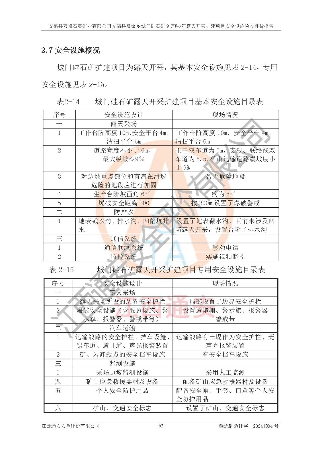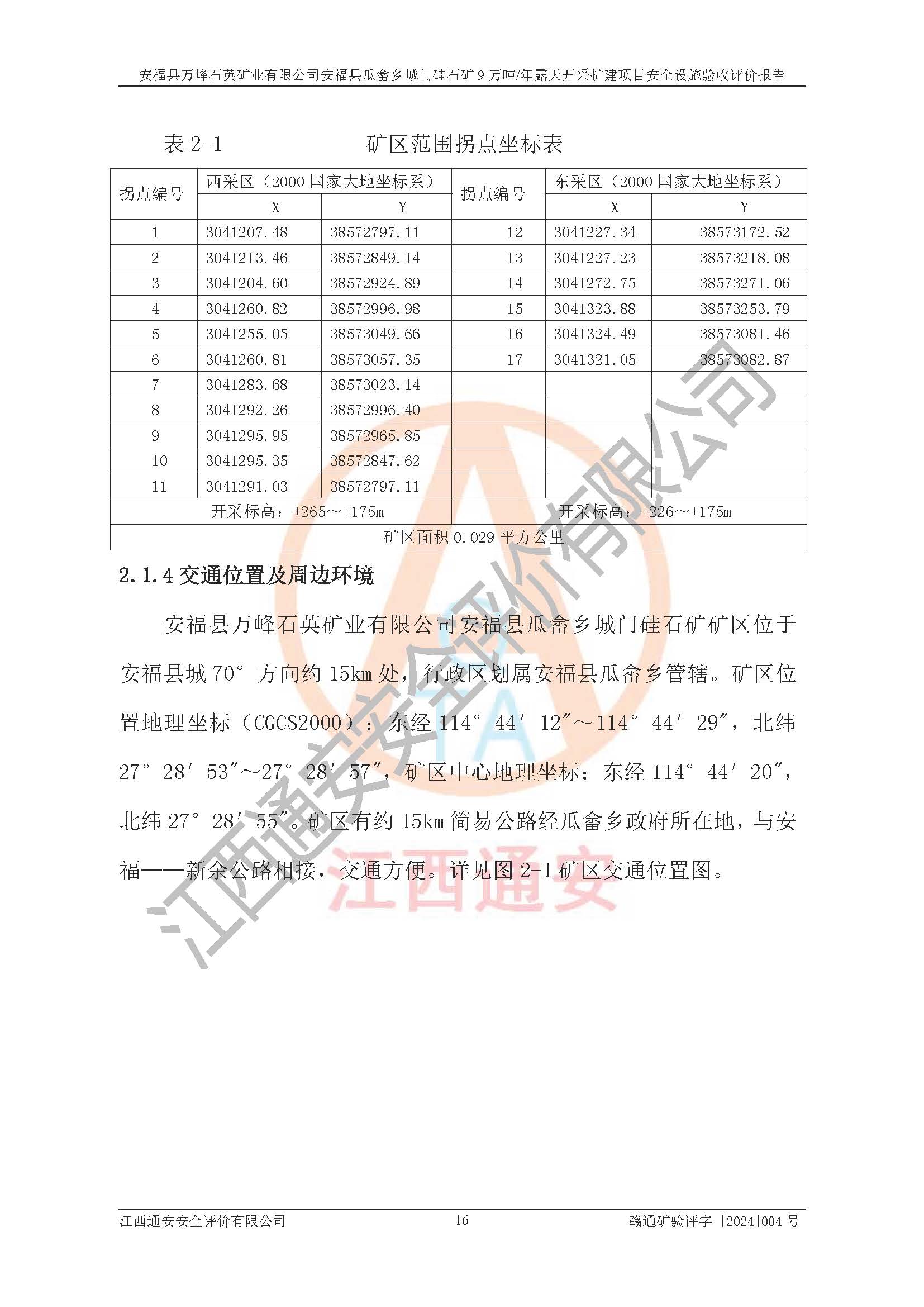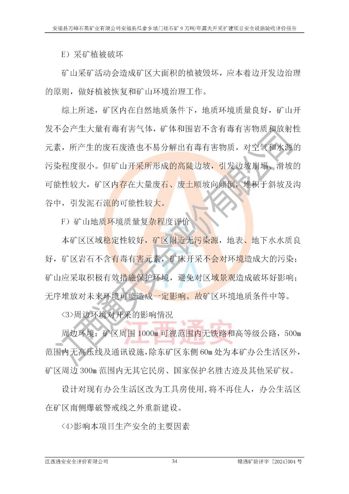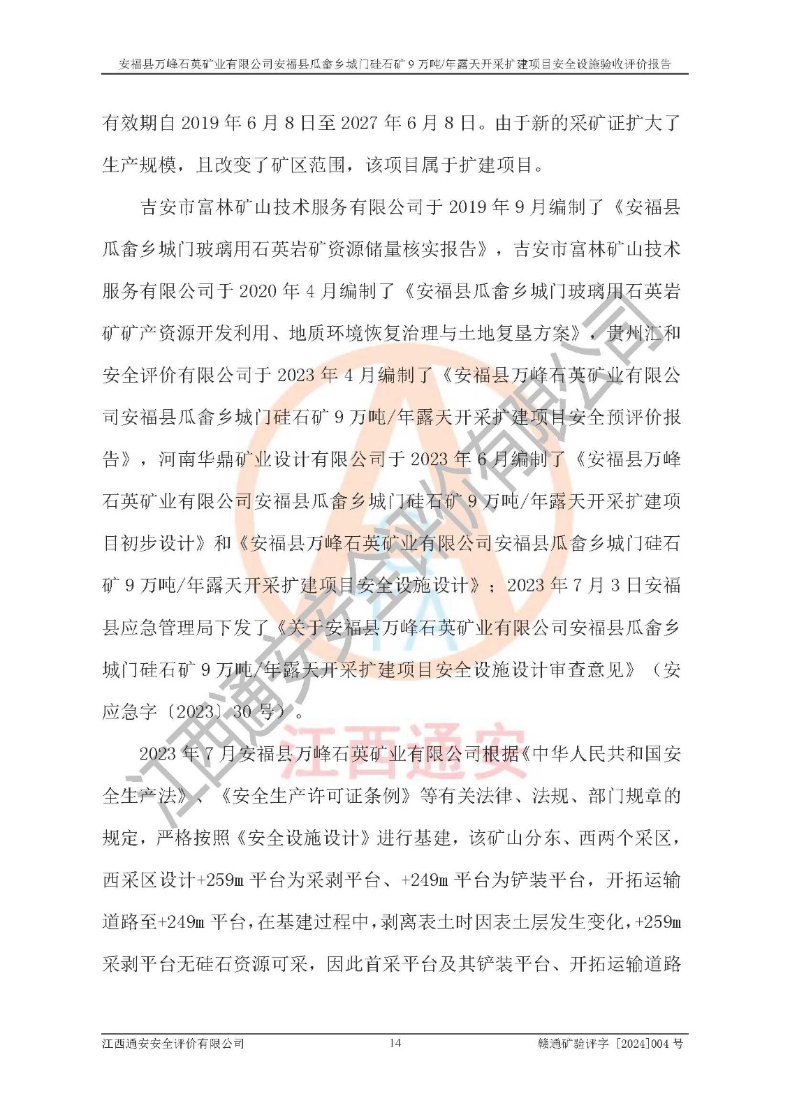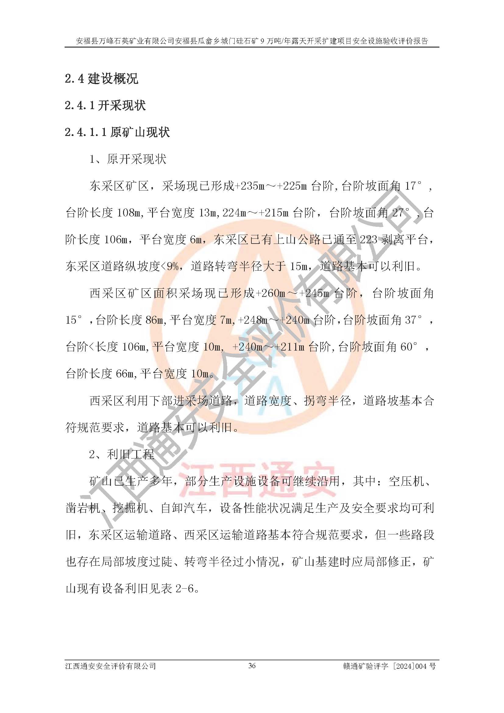 安??h萬(wàn)峰石英礦業(yè)有限公司安??h瓜畬鄉(xiāng)城門(mén)硅石礦礦區(qū)位于安??h城70°方向約15km處,行政區(qū)劃屬安福縣瓜畬鄉(xiāng)管轄。礦區(qū)位置地理坐標(biāo):東經(jīng)114°44′12"~114°44′29",北緯27°28′53"~27°28′57",礦區(qū)中心地理坐標(biāo):東經(jīng)114°44′20",北緯27°28′55"。礦區(qū)有約15km簡(jiǎn)易公路經(jīng)瓜畬鄉(xiāng)**所在地,與安?!掠喙废嘟?,交通方便。 安??h瓜畬鄉(xiāng)城門(mén)硅石礦于2016年3月8日取得采礦許可證,證號(hào)C3608002009027220004917,生產(chǎn)規(guī)模1萬(wàn)噸/年,礦區(qū)面積:0.0646km2。 因礦山生產(chǎn)規(guī)模滿足不了市場(chǎng)要求,加上礦區(qū)有些地征用比較困難,企業(yè)向吉安市自然資源局申請(qǐng)擴(kuò)大生產(chǎn)規(guī)模,并將礦區(qū)范圍進(jìn)行了縮小。 2019年6月8日取得了吉安市自然資源局換發(fā)的采礦許可證,證號(hào)C3608002009027220004917,生產(chǎn)規(guī)模9萬(wàn)噸/年,礦區(qū)面積為0.029km2。**期自2019年6月8日至2027年6月8日。由于新的采礦證擴(kuò)大了生產(chǎn)規(guī)模,且改變了礦區(qū)范圍,該項(xiàng)目屬于擴(kuò)建項(xiàng)目。 吉安市富林礦山技術(shù)服務(wù)有限公司于2019年9月編制了《安??h瓜畬鄉(xiāng)城門(mén)玻璃用石英巖礦資源儲(chǔ)量核實(shí)報(bào)告》,吉安市富林礦山技術(shù)服務(wù)有限公司于2020年4月編制了《安??h瓜畬鄉(xiāng)城門(mén)玻璃用石英巖礦礦產(chǎn)資源開(kāi)發(fā)利用、地質(zhì)環(huán)境恢復(fù)治理與土地復(fù)墾方案》,貴州匯和安全評(píng)價(jià)有限公司于2023年4月編制了《安??h萬(wàn)峰石英礦業(yè)有限公司安??h瓜畬鄉(xiāng)城門(mén)硅石礦9萬(wàn)噸/年露天開(kāi)采擴(kuò)建項(xiàng)目安全預(yù)評(píng)價(jià)報(bào)告》,河南華鼎礦業(yè)設(shè)計(jì)有限公司于2023年6月編制了《安??h萬(wàn)峰石英礦業(yè)有限公司安??h瓜畬鄉(xiāng)城門(mén)硅石礦9萬(wàn)噸/年露天開(kāi)采擴(kuò)建項(xiàng)目初步設(shè)計(jì)》和《安??h萬(wàn)峰石英礦業(yè)有限公司安福縣瓜畬鄉(xiāng)城門(mén)硅石礦9萬(wàn)噸/年露天開(kāi)采擴(kuò)建項(xiàng)目安全設(shè)施設(shè)計(jì)》;2023年7月3日安??h應(yīng)急管理局下發(fā)了《關(guān)于安福縣萬(wàn)峰石英礦業(yè)有限公司安??h瓜畬鄉(xiāng)城門(mén)硅石礦9萬(wàn)噸/年露天開(kāi)采擴(kuò)建項(xiàng)目安全設(shè)施設(shè)計(jì)審查意見(jiàn)》(安應(yīng)急字〔2023〕30號(hào))。 2023年7月安??h萬(wàn)峰石英礦業(yè)有限公司根據(jù)《中華人民共和國(guó)安全生產(chǎn)法》、《安全生產(chǎn)許可證條例》等有關(guān)法律、法規(guī)、部門(mén)規(guī)章的規(guī)定,嚴(yán)格按照《安全設(shè)施設(shè)計(jì)》進(jìn)行基建,該礦山分東、西兩個(gè)采區(qū),西采區(qū)設(shè)計(jì)+259m平臺(tái)為采剝平臺(tái)、+249m平臺(tái)為鏟裝平臺(tái),開(kāi)拓運(yùn)輸?shù)缆分?249m平臺(tái),在基建過(guò)程中,剝離表土?xí)r因表土層發(fā)生變化,+259m采剝平臺(tái)無(wú)硅石資源可采,因此首采平臺(tái)及其鏟裝平臺(tái)、開(kāi)拓運(yùn)輸?shù)缆?*進(jìn)行變更。 2024年4月礦山委托原設(shè)計(jì)單位河南華鼎礦業(yè)設(shè)計(jì)有限公司編制了《安??h萬(wàn)峰石英礦業(yè)有限公司安??h瓜畬鄉(xiāng)城門(mén)硅石礦9萬(wàn)噸/年露天開(kāi)采擴(kuò)建項(xiàng)目變更設(shè)計(jì)》,根據(jù)礦山西采區(qū)+259m、+249m、+239m平臺(tái)均無(wú)硅石資源的實(shí)際情況,對(duì)設(shè)計(jì)的西采區(qū)+259m平臺(tái)為采剝平臺(tái)、+249m平臺(tái)為鏟裝平臺(tái),開(kāi)拓運(yùn)輸?shù)缆分?249m平臺(tái)進(jìn)行變更,將+259m平臺(tái)、+249m平臺(tái)變更為安全平臺(tái),+239m平臺(tái)仍為清掃平臺(tái),首采平臺(tái)變更為+229m平臺(tái)、鏟裝平臺(tái)變更為+219m平臺(tái),開(kāi)拓運(yùn)輸?shù)缆分?219m平臺(tái)、簡(jiǎn)易道路至+229m平臺(tái);東采區(qū)安全設(shè)施設(shè)計(jì)不變,根據(jù)《**礦山監(jiān)察局關(guān)于印發(fā)非煤礦山建設(shè)項(xiàng)目安全設(shè)施重大變更范圍的通知》之規(guī)定,上述變更不屬于重大變更。 安??h萬(wàn)峰石英礦業(yè)有限公司安??h瓜畬鄉(xiāng)城門(mén)硅石礦9萬(wàn)噸/年露天開(kāi)采擴(kuò)建項(xiàng)目基建已完成,本次安全設(shè)施驗(yàn)收評(píng)價(jià)未涉及凹陷露天開(kāi)采。 |