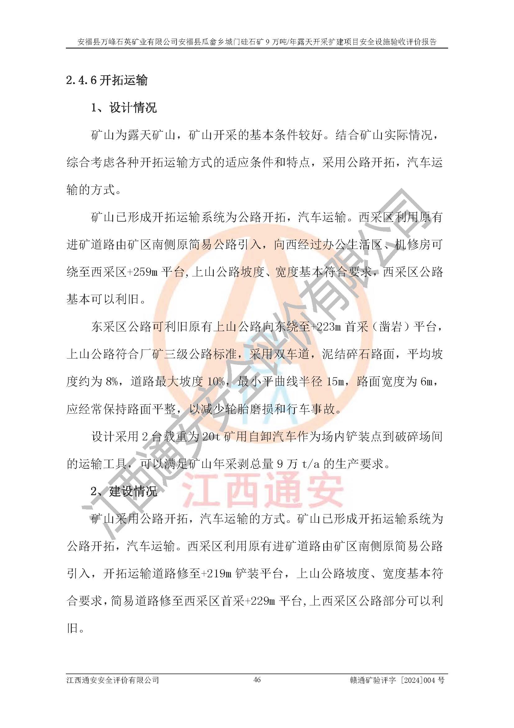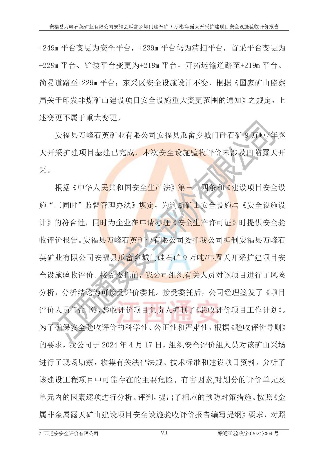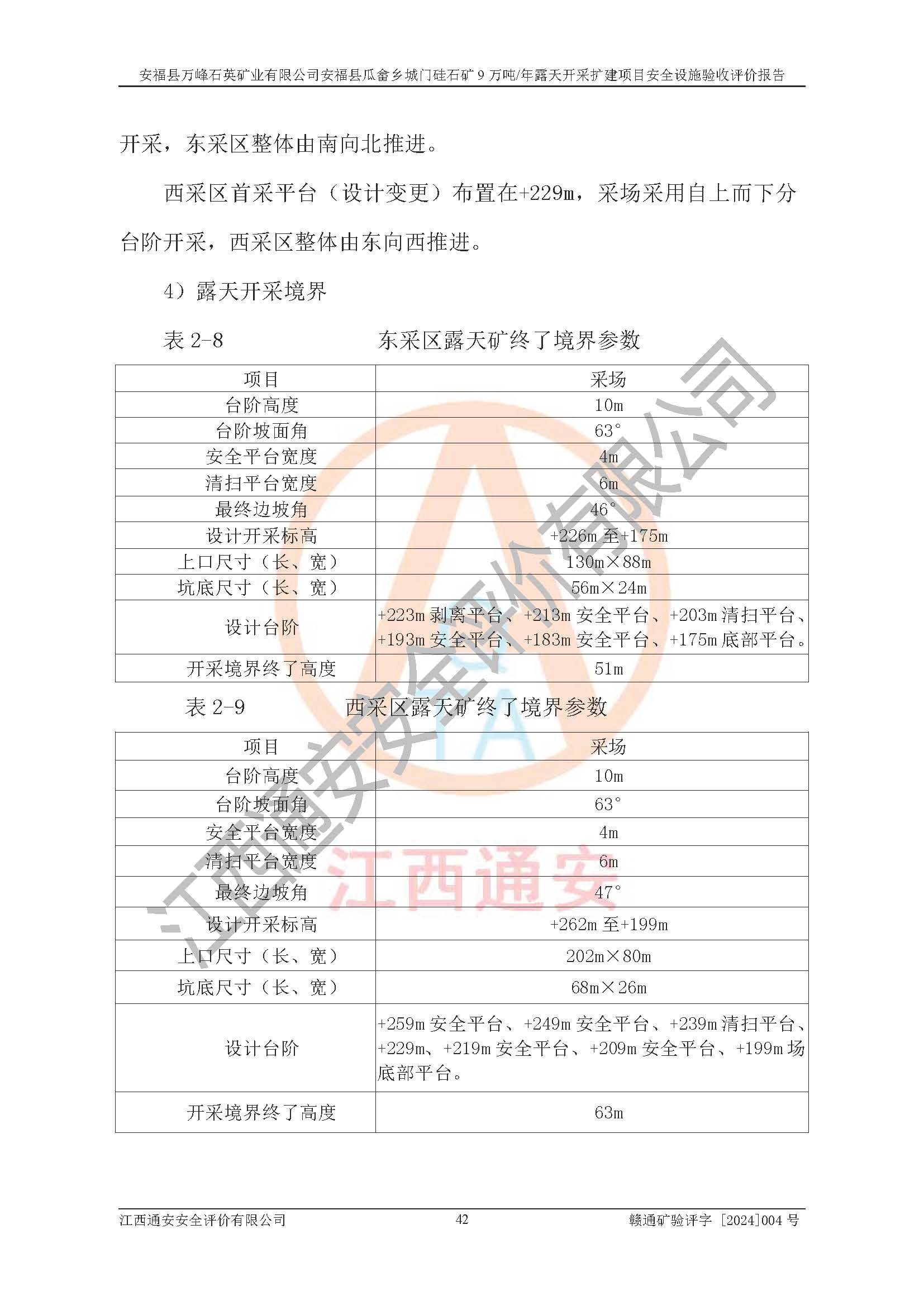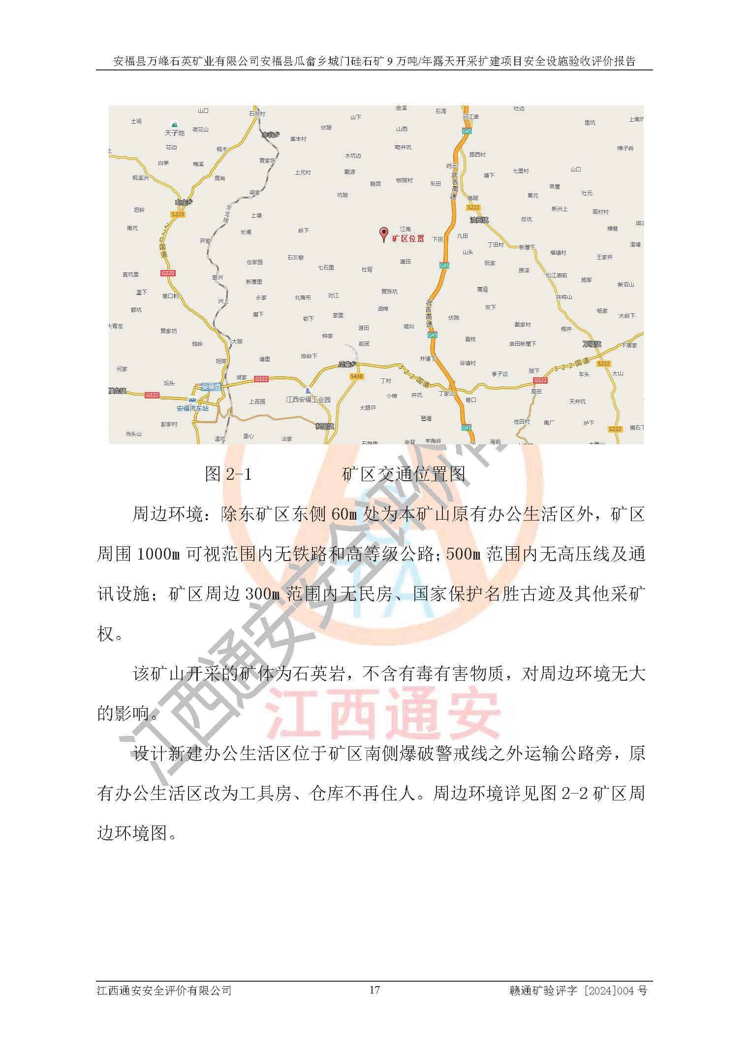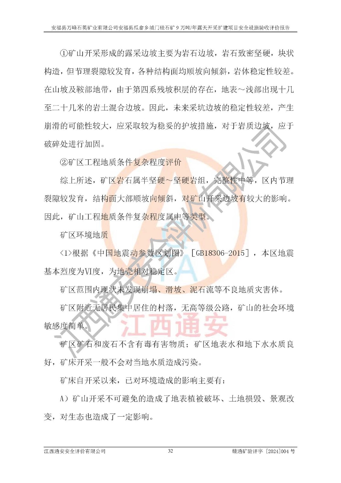 安??h萬(wàn)峰石英礦業(yè)有限公司安??h瓜畬鄉(xiāng)城門(mén)硅石礦礦區(qū)位于安??h城70°方向約15km處,行政區(qū)劃屬安福縣瓜畬鄉(xiāng)管轄。礦區(qū)位置地理坐標(biāo):東經(jīng)114°44′12"~114°44′29",北緯27°28′53"~27°28′57",礦區(qū)中心地理坐標(biāo):東經(jīng)114°44′20",北緯27°28′55"。礦區(qū)有約15km簡(jiǎn)易公路經(jīng)瓜畬鄉(xiāng)**所在地,與安?!掠喙废嘟?,交通方便。 安??h瓜畬鄉(xiāng)城門(mén)硅石礦于2016年3月8日取得采礦許可證,證號(hào)C3608002009027220004917,生產(chǎn)規(guī)模1萬(wàn)噸/年,礦區(qū)面積:0.0646km2。 因礦山生產(chǎn)規(guī)模滿足不了市場(chǎng)要求,加上礦區(qū)有些地征用比較困難,企業(yè)向吉安市自然資源局申請(qǐng)擴(kuò)大生產(chǎn)規(guī)模,并將礦區(qū)范圍進(jìn)行了縮小。 2019年6月8日取得了吉安市自然資源局換發(fā)的采礦許可證,證號(hào)C3608002009027220004917,生產(chǎn)規(guī)模9萬(wàn)噸/年,礦區(qū)面積為0.029km2。**期自2019年6月8日至2027年6月8日。由于新的采礦證擴(kuò)大了生產(chǎn)規(guī)模,且改變了礦區(qū)范圍,該項(xiàng)目屬于擴(kuò)建項(xiàng)目。 吉安市富林礦山技術(shù)服務(wù)有限公司于2019年9月編制了《安??h瓜畬鄉(xiāng)城門(mén)玻璃用石英巖礦資源儲(chǔ)量核實(shí)報(bào)告》,吉安市富林礦山技術(shù)服務(wù)有限公司于2020年4月編制了《安??h瓜畬鄉(xiāng)城門(mén)玻璃用石英巖礦礦產(chǎn)資源開(kāi)發(fā)利用、地質(zhì)環(huán)境恢復(fù)治理與土地復(fù)墾方案》,貴州匯和安全評(píng)價(jià)有限公司于2023年4月編制了《安??h萬(wàn)峰石英礦業(yè)有限公司安??h瓜畬鄉(xiāng)城門(mén)硅石礦9萬(wàn)噸/年露天開(kāi)采擴(kuò)建項(xiàng)目安全預(yù)評(píng)價(jià)報(bào)告》,河南華鼎礦業(yè)設(shè)計(jì)有限公司于2023年6月編制了《安??h萬(wàn)峰石英礦業(yè)有限公司安??h瓜畬鄉(xiāng)城門(mén)硅石礦9萬(wàn)噸/年露天開(kāi)采擴(kuò)建項(xiàng)目初步設(shè)計(jì)》和《安??h萬(wàn)峰石英礦業(yè)有限公司安福縣瓜畬鄉(xiāng)城門(mén)硅石礦9萬(wàn)噸/年露天開(kāi)采擴(kuò)建項(xiàng)目安全設(shè)施設(shè)計(jì)》;2023年7月3日安??h應(yīng)急管理局下發(fā)了《關(guān)于安福縣萬(wàn)峰石英礦業(yè)有限公司安??h瓜畬鄉(xiāng)城門(mén)硅石礦9萬(wàn)噸/年露天開(kāi)采擴(kuò)建項(xiàng)目安全設(shè)施設(shè)計(jì)審查意見(jiàn)》(安應(yīng)急字〔2023〕30號(hào))。 2023年7月安??h萬(wàn)峰石英礦業(yè)有限公司根據(jù)《中華人民共和國(guó)安全生產(chǎn)法》、《安全生產(chǎn)許可證條例》等有關(guān)法律、法規(guī)、部門(mén)規(guī)章的規(guī)定,嚴(yán)格按照《安全設(shè)施設(shè)計(jì)》進(jìn)行基建,該礦山分東、西兩個(gè)采區(qū),西采區(qū)設(shè)計(jì)+259m平臺(tái)為采剝平臺(tái)、+249m平臺(tái)為鏟裝平臺(tái),開(kāi)拓運(yùn)輸?shù)缆分?249m平臺(tái),在基建過(guò)程中,剝離表土?xí)r因表土層發(fā)生變化,+259m采剝平臺(tái)無(wú)硅石資源可采,因此首采平臺(tái)及其鏟裝平臺(tái)、開(kāi)拓運(yùn)輸?shù)缆?*進(jìn)行變更。 2024年4月礦山委托原設(shè)計(jì)單位河南華鼎礦業(yè)設(shè)計(jì)有限公司編制了《安??h萬(wàn)峰石英礦業(yè)有限公司安??h瓜畬鄉(xiāng)城門(mén)硅石礦9萬(wàn)噸/年露天開(kāi)采擴(kuò)建項(xiàng)目變更設(shè)計(jì)》,根據(jù)礦山西采區(qū)+259m、+249m、+239m平臺(tái)均無(wú)硅石資源的實(shí)際情況,對(duì)設(shè)計(jì)的西采區(qū)+259m平臺(tái)為采剝平臺(tái)、+249m平臺(tái)為鏟裝平臺(tái),開(kāi)拓運(yùn)輸?shù)缆分?249m平臺(tái)進(jìn)行變更,將+259m平臺(tái)、+249m平臺(tái)變更為安全平臺(tái),+239m平臺(tái)仍為清掃平臺(tái),首采平臺(tái)變更為+229m平臺(tái)、鏟裝平臺(tái)變更為+219m平臺(tái),開(kāi)拓運(yùn)輸?shù)缆分?219m平臺(tái)、簡(jiǎn)易道路至+229m平臺(tái);東采區(qū)安全設(shè)施設(shè)計(jì)不變,根據(jù)《**礦山監(jiān)察局關(guān)于印發(fā)非煤礦山建設(shè)項(xiàng)目安全設(shè)施重大變更范圍的通知》之規(guī)定,上述變更不屬于重大變更。 安??h萬(wàn)峰石英礦業(yè)有限公司安??h瓜畬鄉(xiāng)城門(mén)硅石礦9萬(wàn)噸/年露天開(kāi)采擴(kuò)建項(xiàng)目基建已完成,本次安全設(shè)施驗(yàn)收評(píng)價(jià)未涉及凹陷露天開(kāi)采。 |